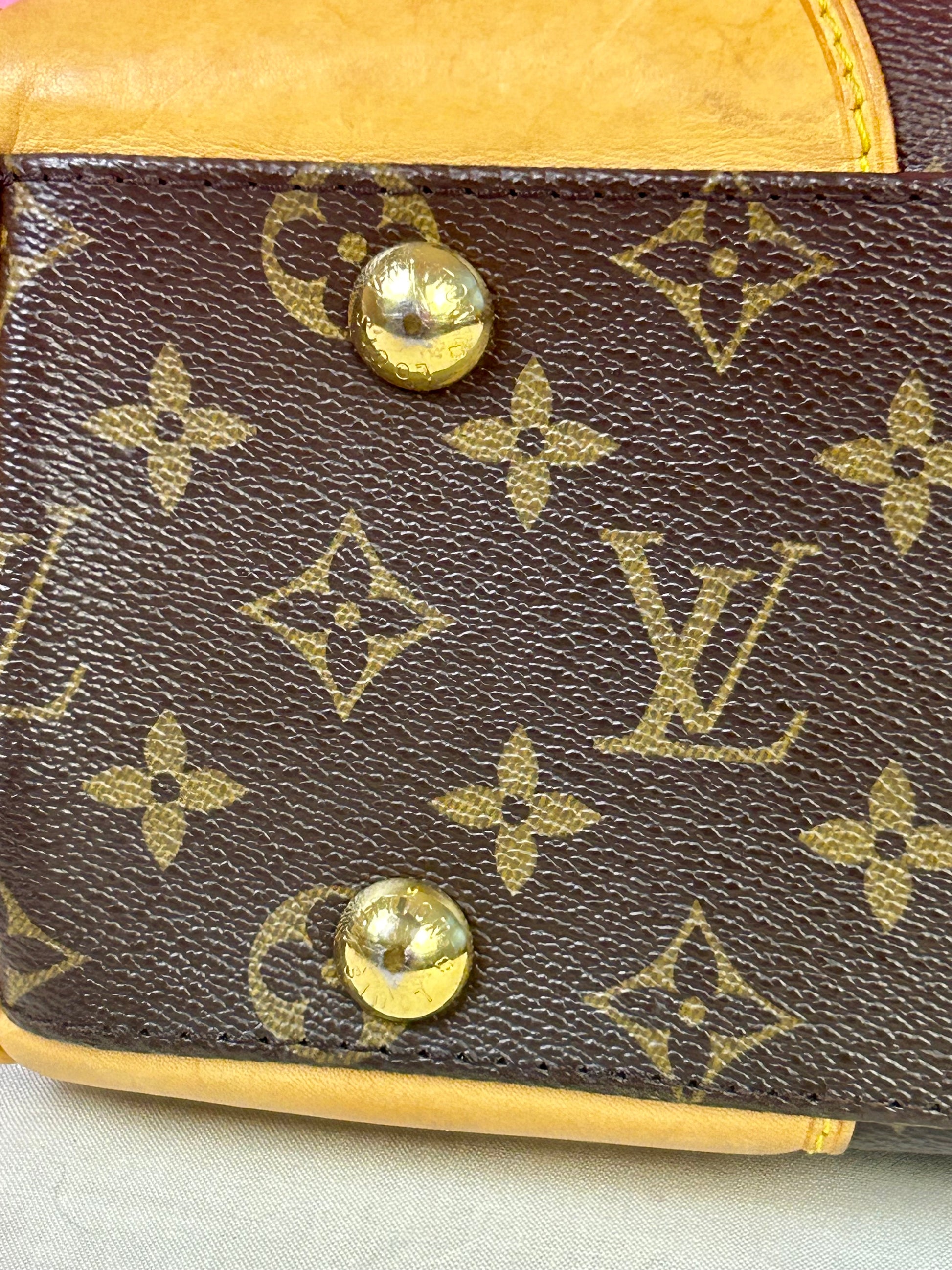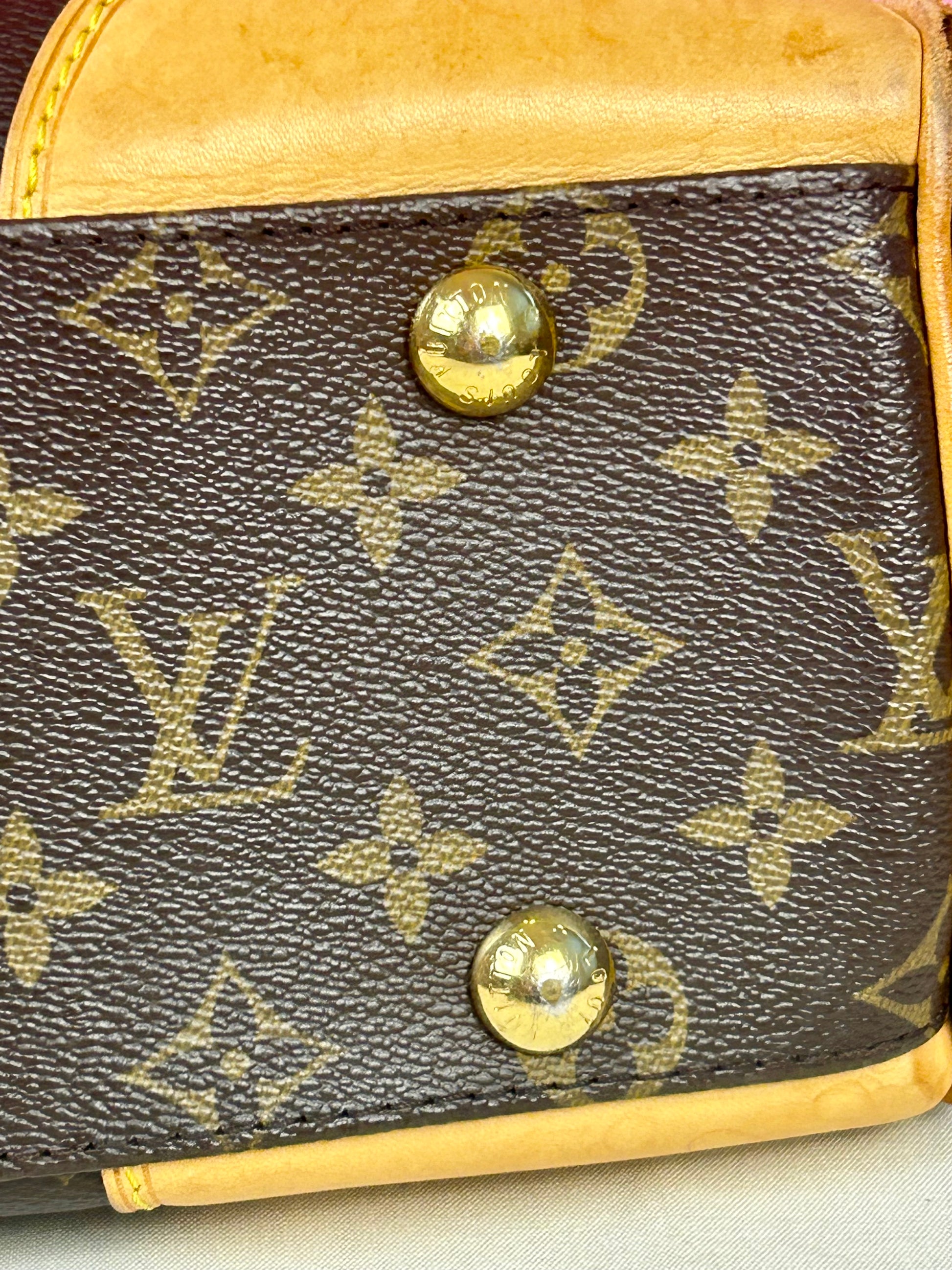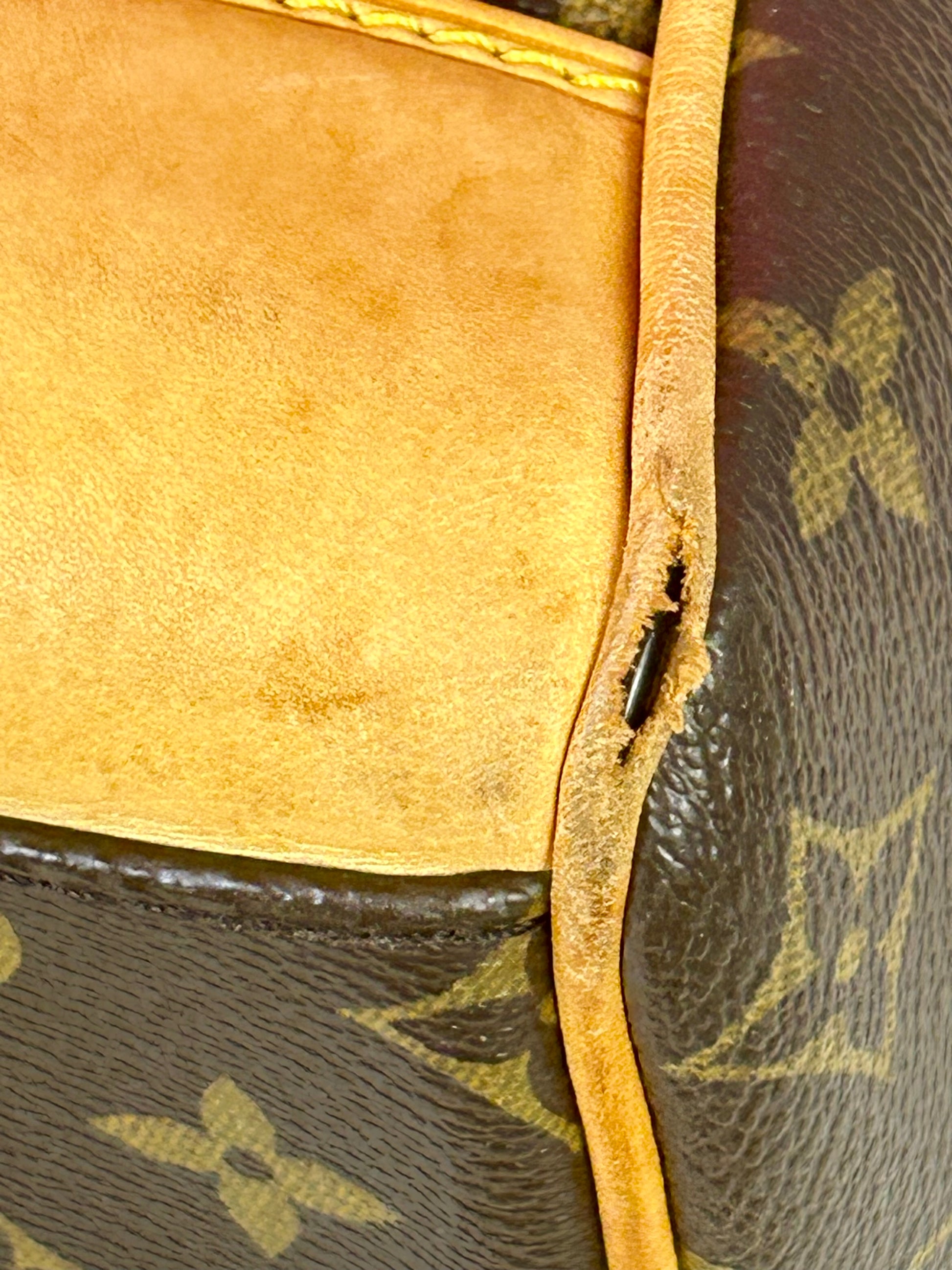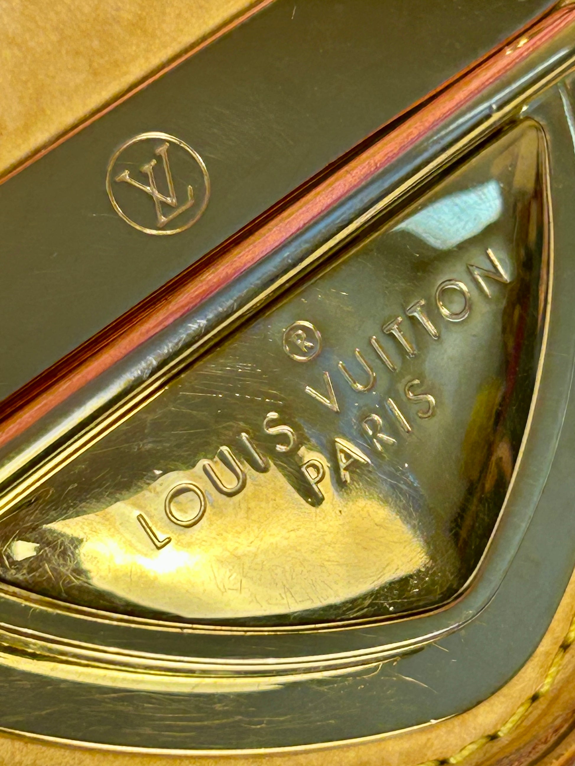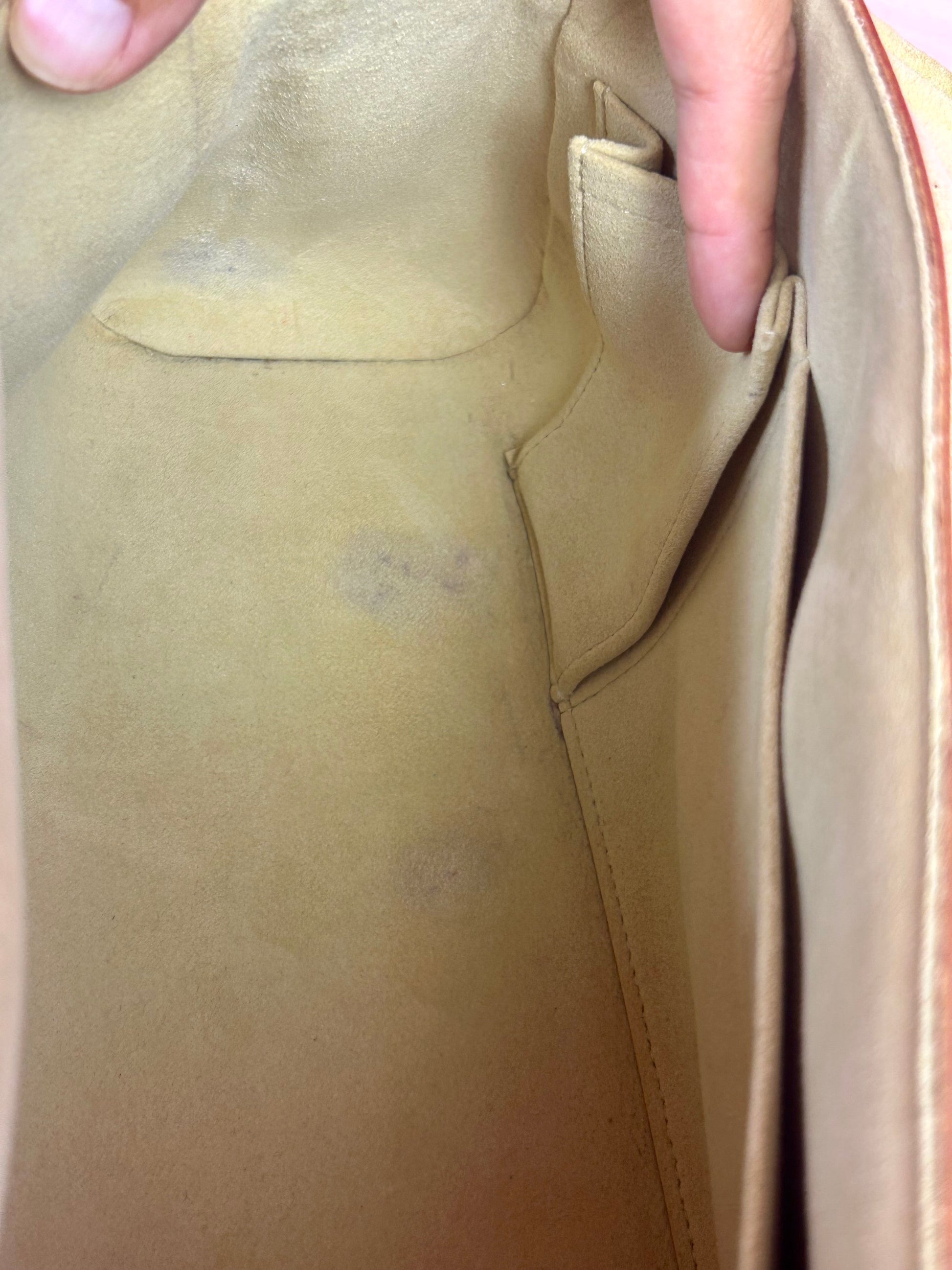 š Description: Canvas is in excellent condition, no cracks. Leather has watermarks throughout, but overall a light patina. Straps and chapes are strong, no cracks. One corner has exposed piping. Buckle clasps works properly, mostly gold, has silvered a little in the middle. Trim has no holes or cracks. Interior has some discoloration spots, inner and exterior pockets are clean.Ā