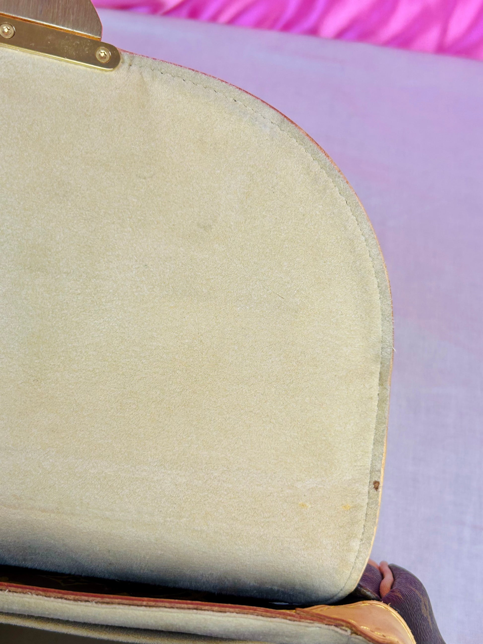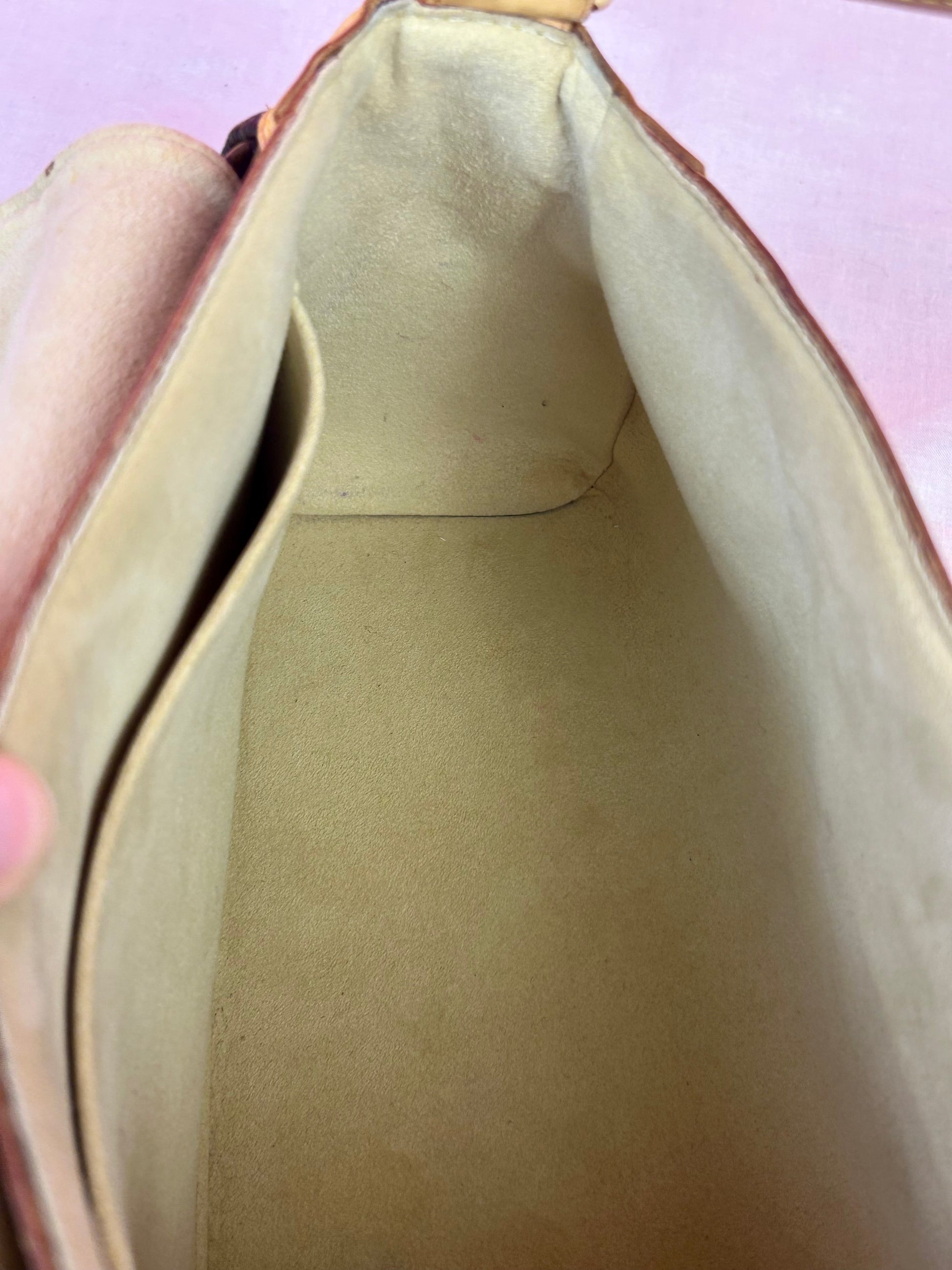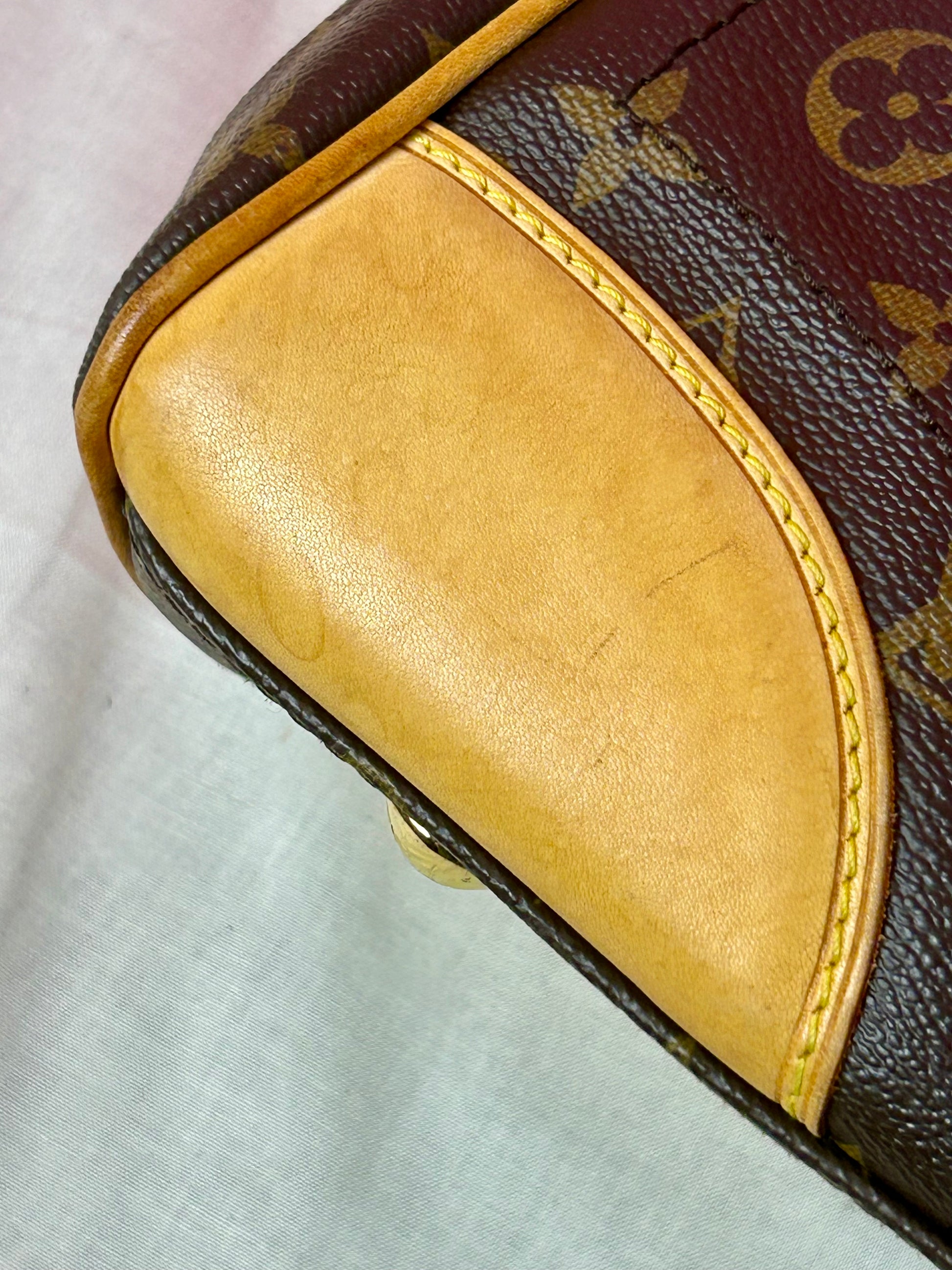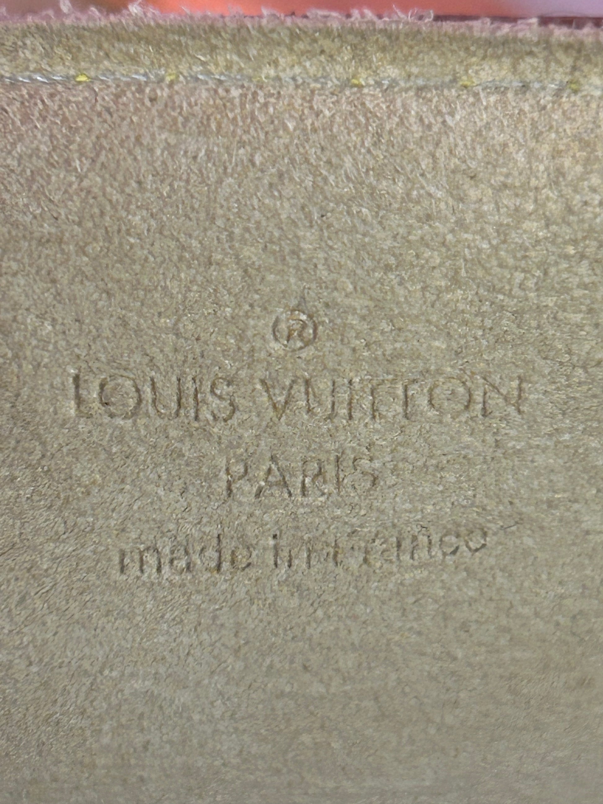 š Description: Canvas is in excellent condition, no cracks. Leather has watermarks throughout, but overall a light patina. Straps and chapes are strong, no cracks. One corner has exposed piping. Buckle clasps works properly, mostly gold, has silvered a little in the middle. Trim has no holes or cracks. Interior has some discoloration spots, inner and exterior pockets are clean.Ā