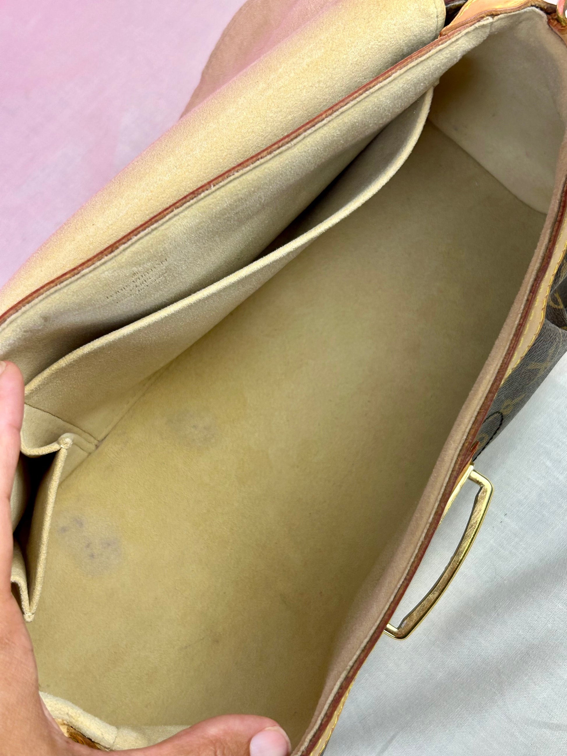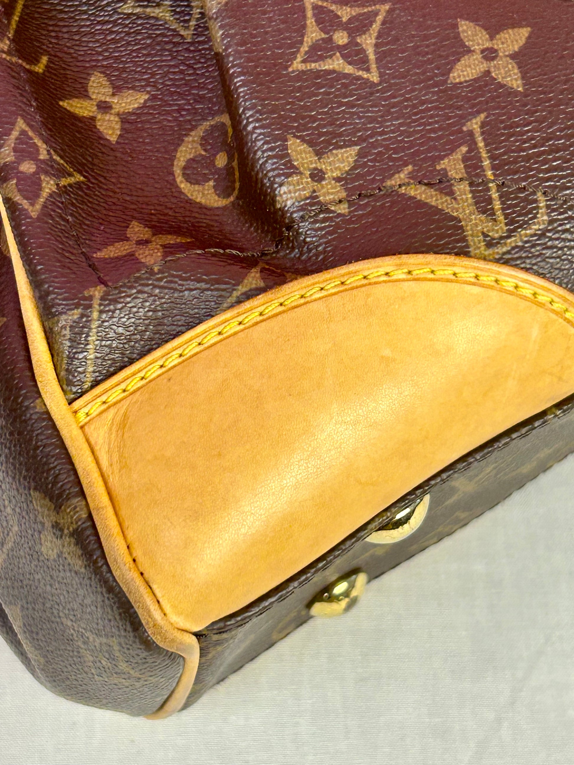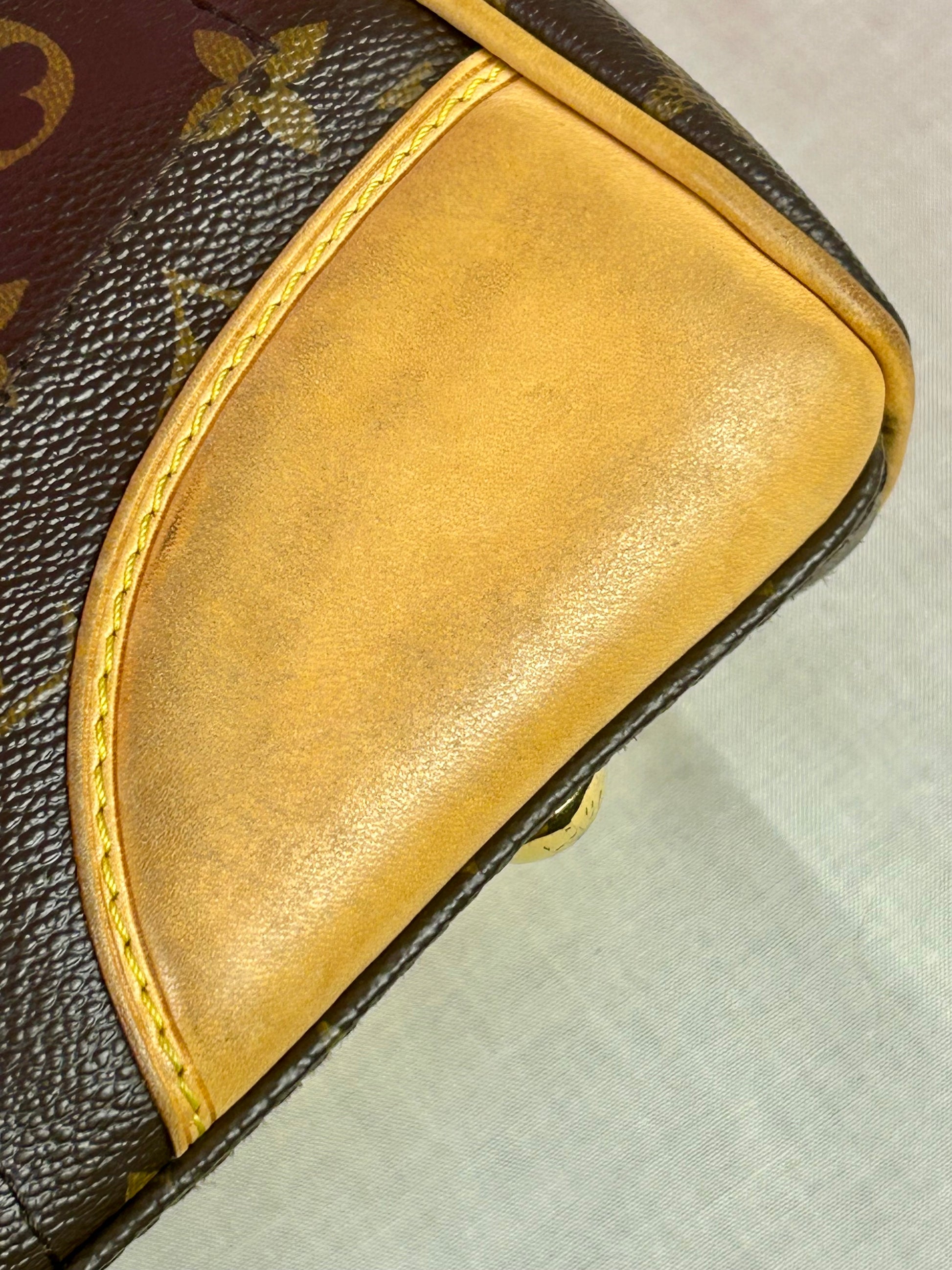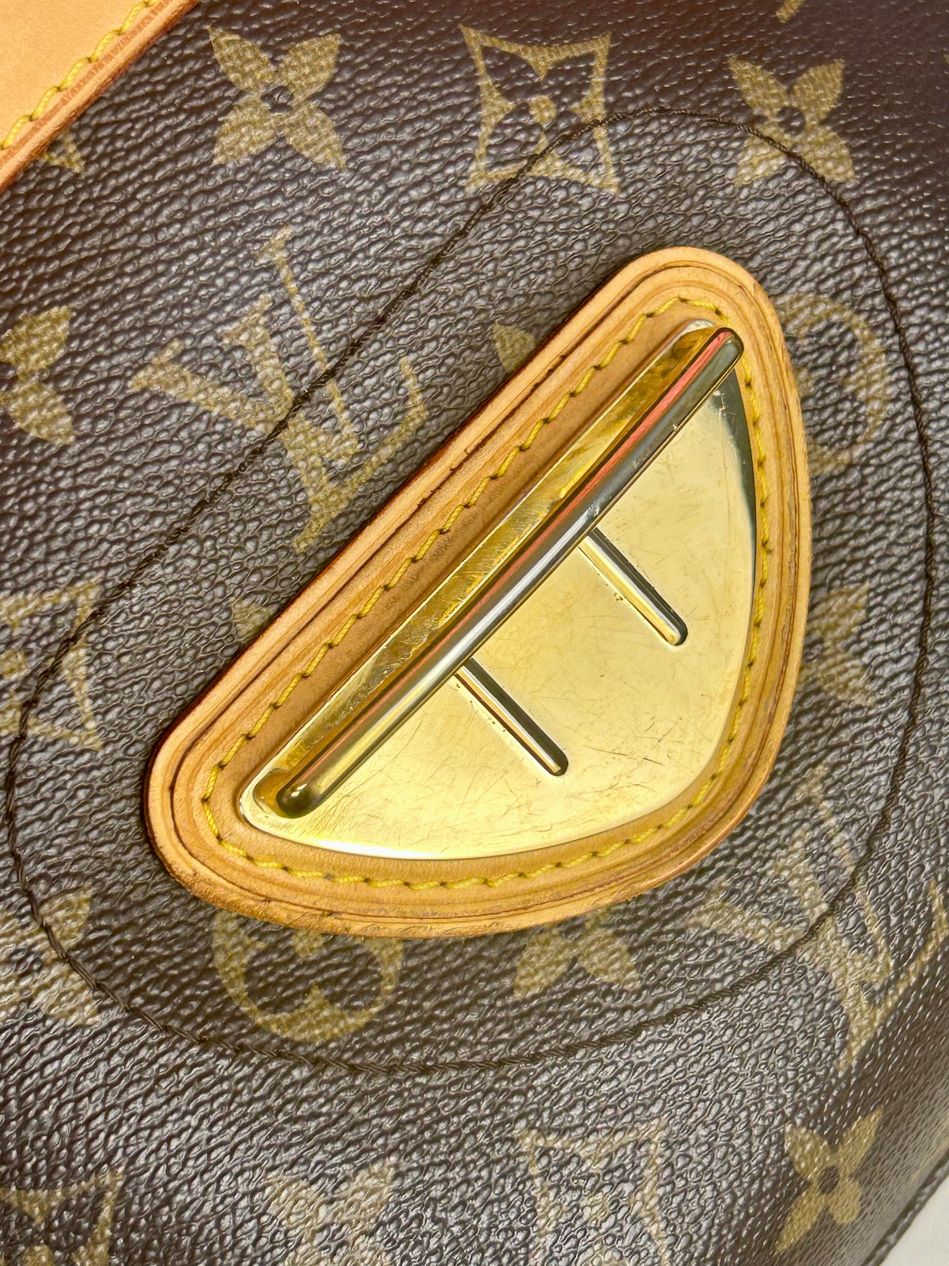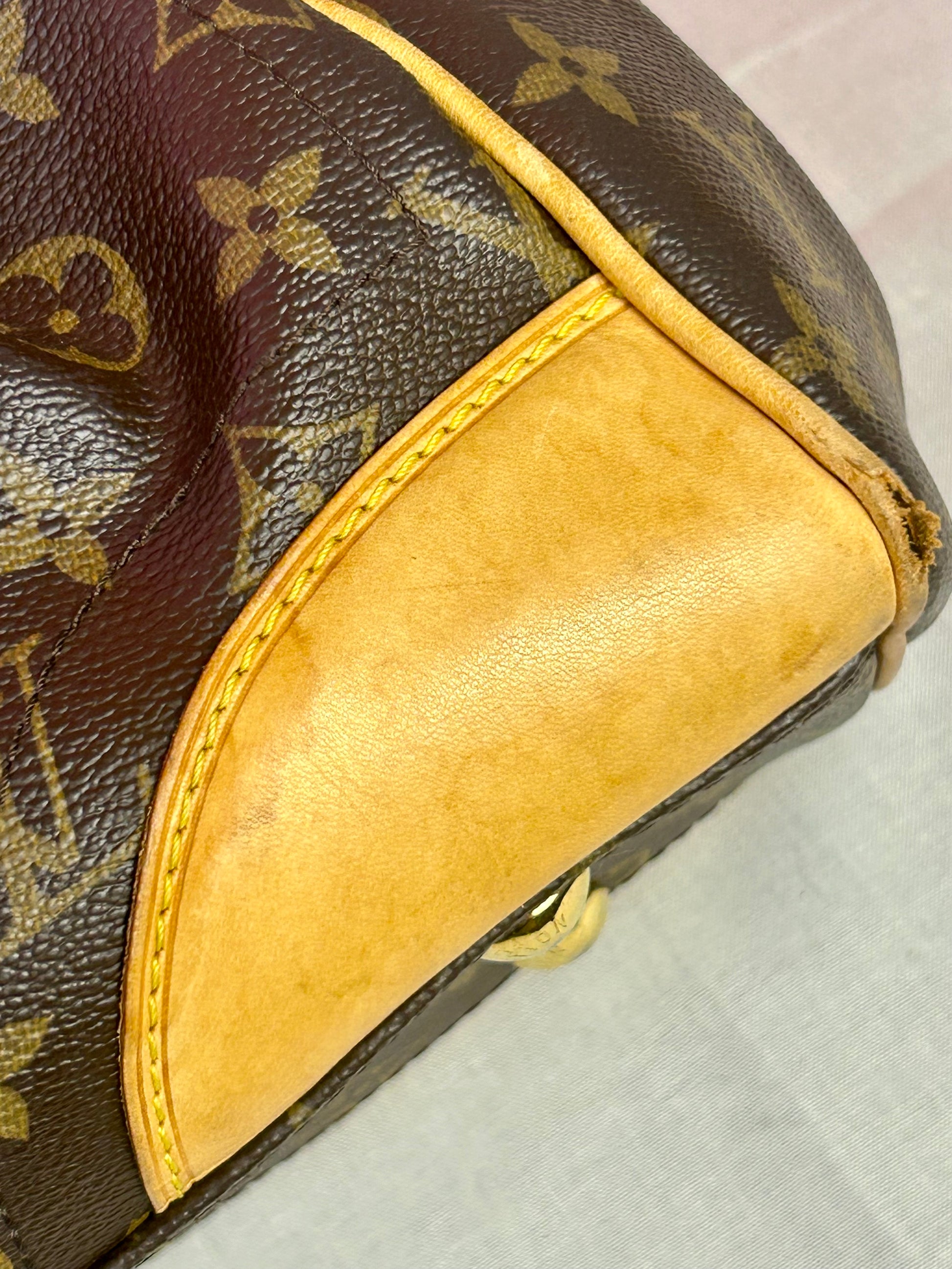 š Description: Canvas is in excellent condition, no cracks. Leather has watermarks throughout, but overall a light patina. Straps and chapes are strong, no cracks. One corner has exposed piping. Buckle clasps works properly, mostly gold, has silvered a little in the middle. Trim has no holes or cracks. Interior has some discoloration spots, inner and exterior pockets are clean.Ā