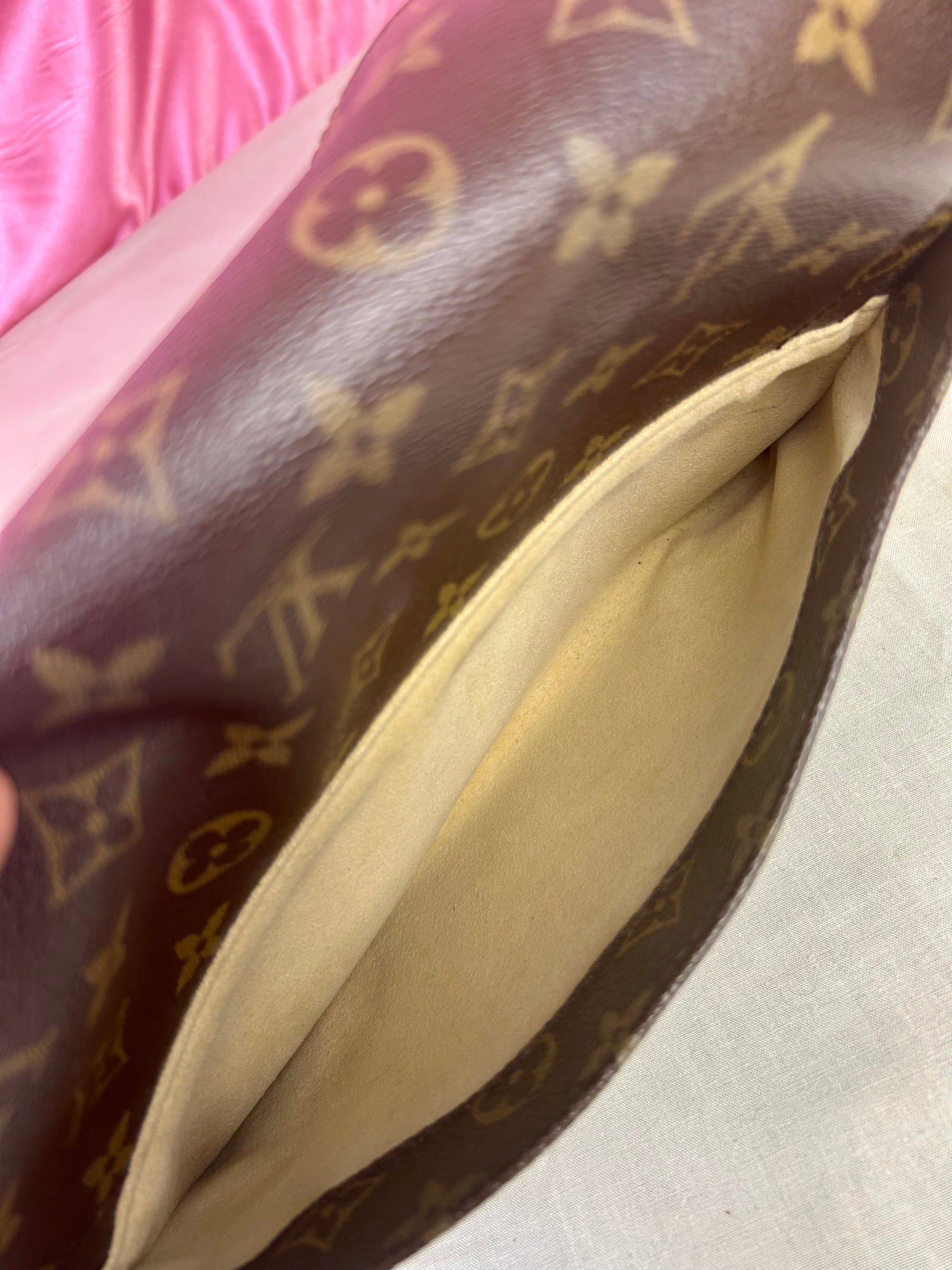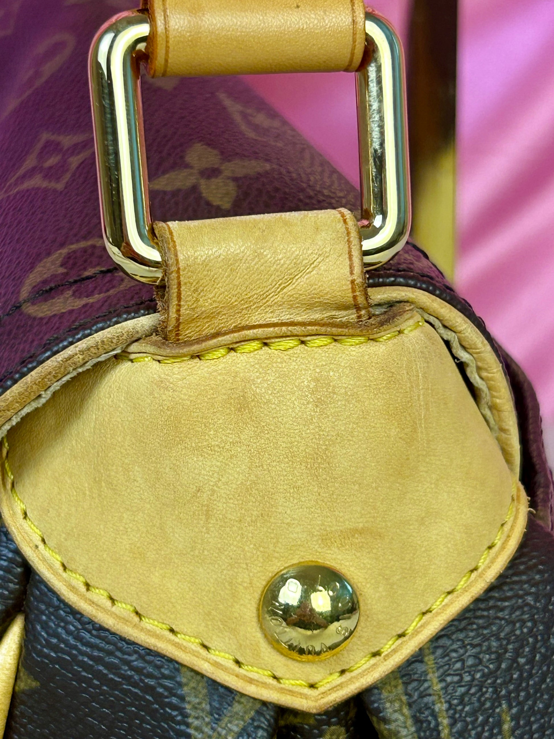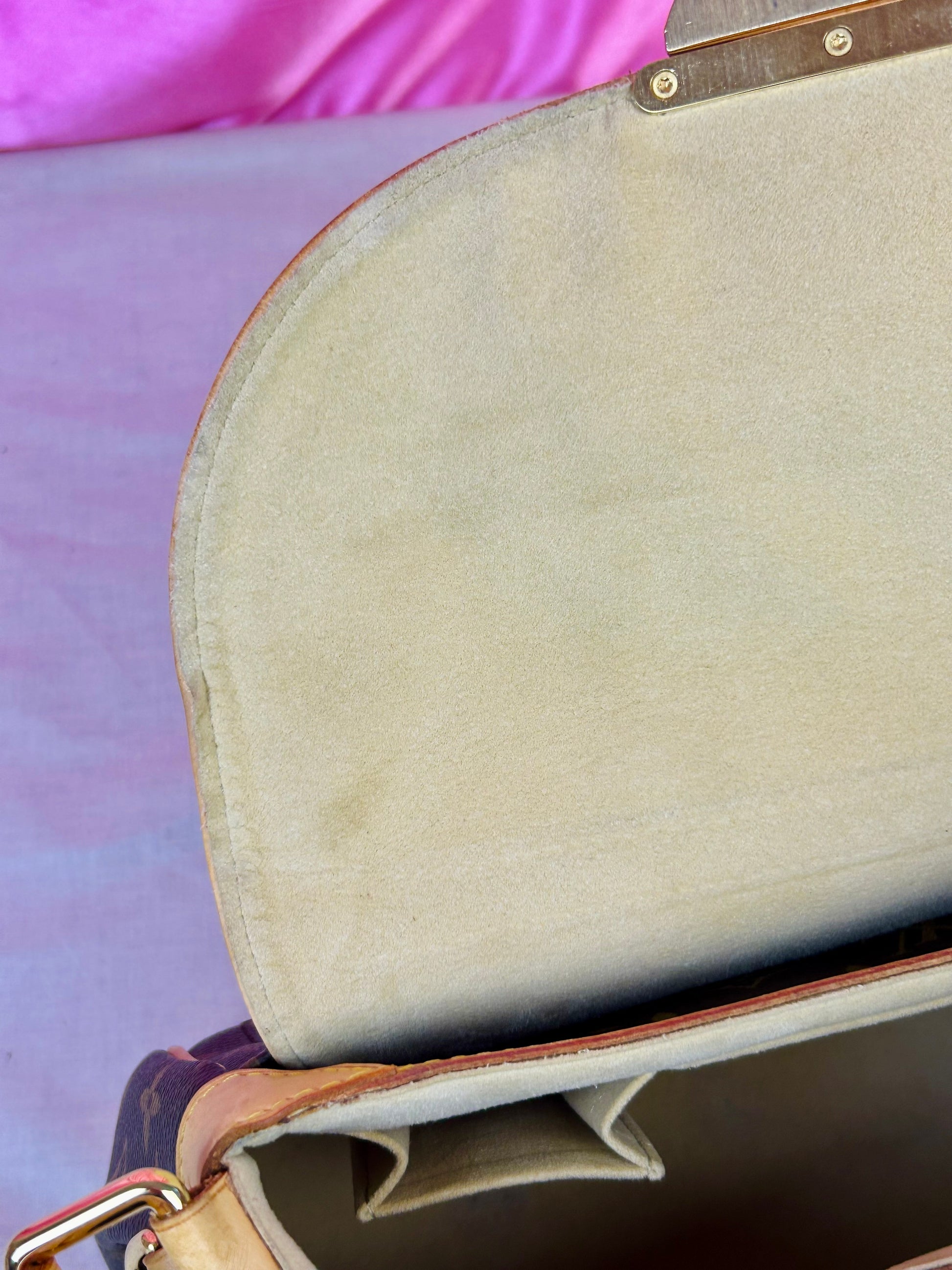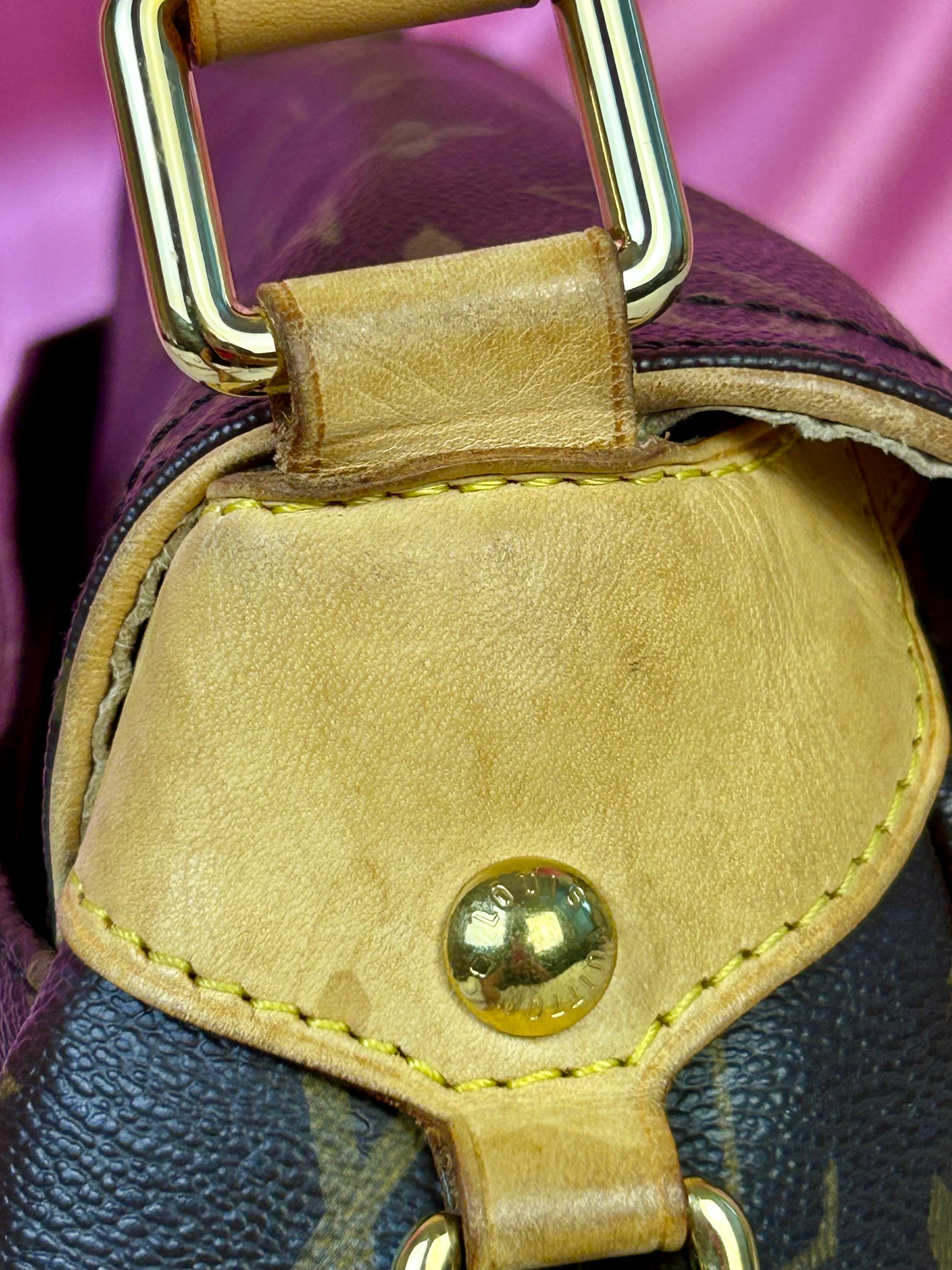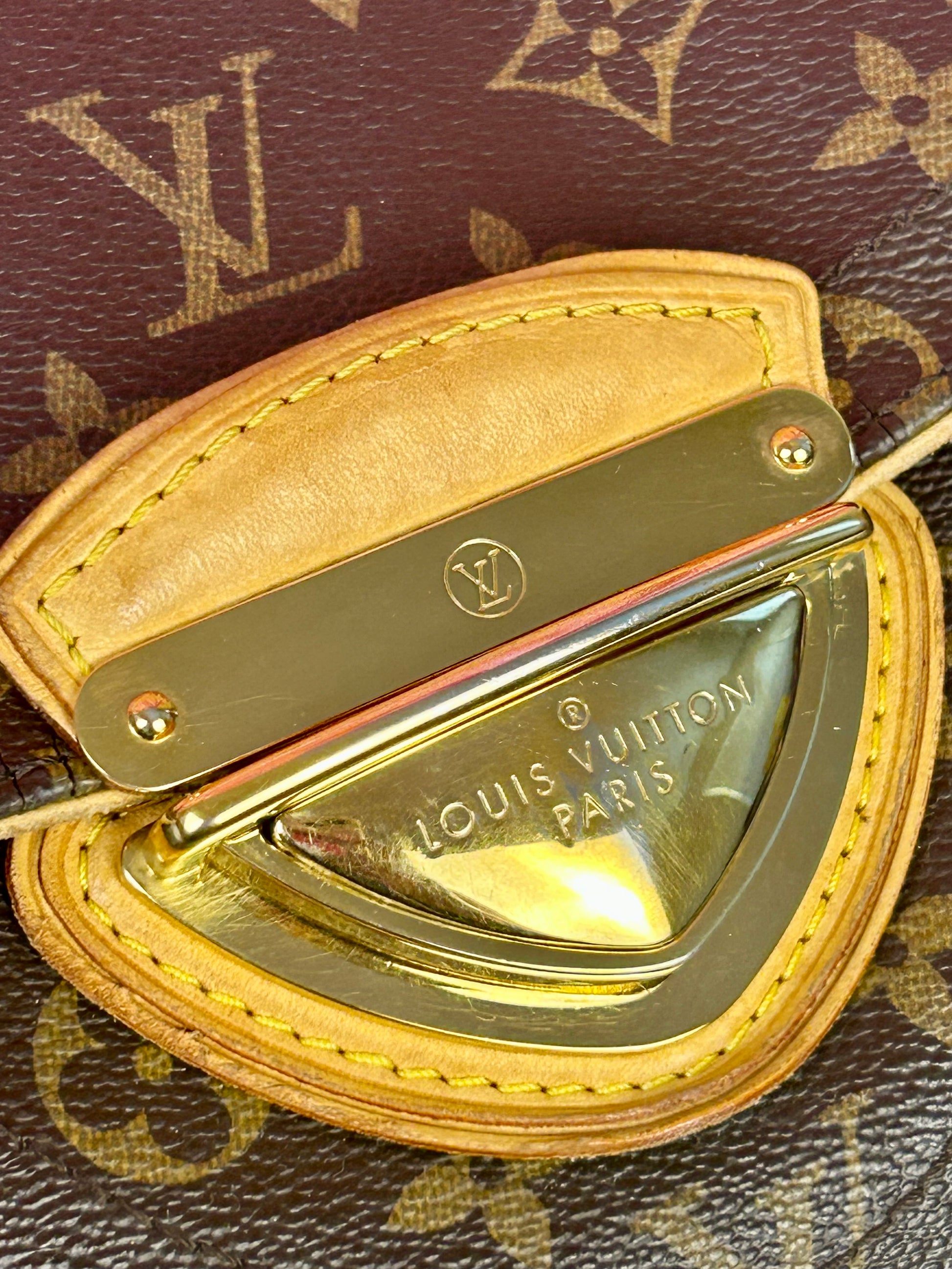š Description: Canvas is in excellent condition, no cracks. Leather has watermarks throughout, but overall a light patina. Straps and chapes are strong, no cracks. One corner has exposed piping. Buckle clasps works properly, mostly gold, has silvered a little in the middle. Trim has no holes or cracks. Interior has some discoloration spots, inner and exterior pockets are clean.Ā