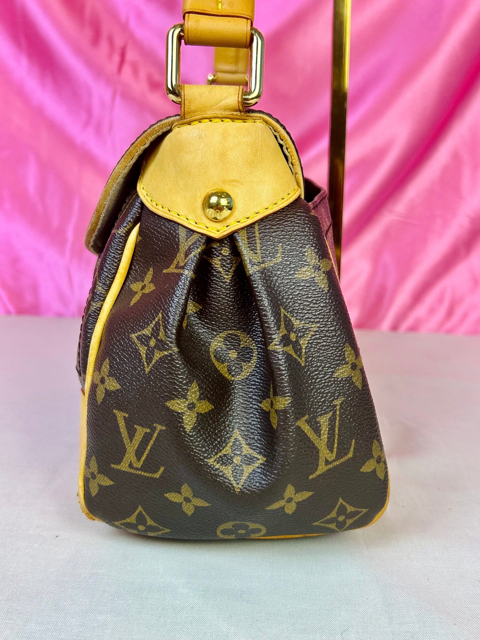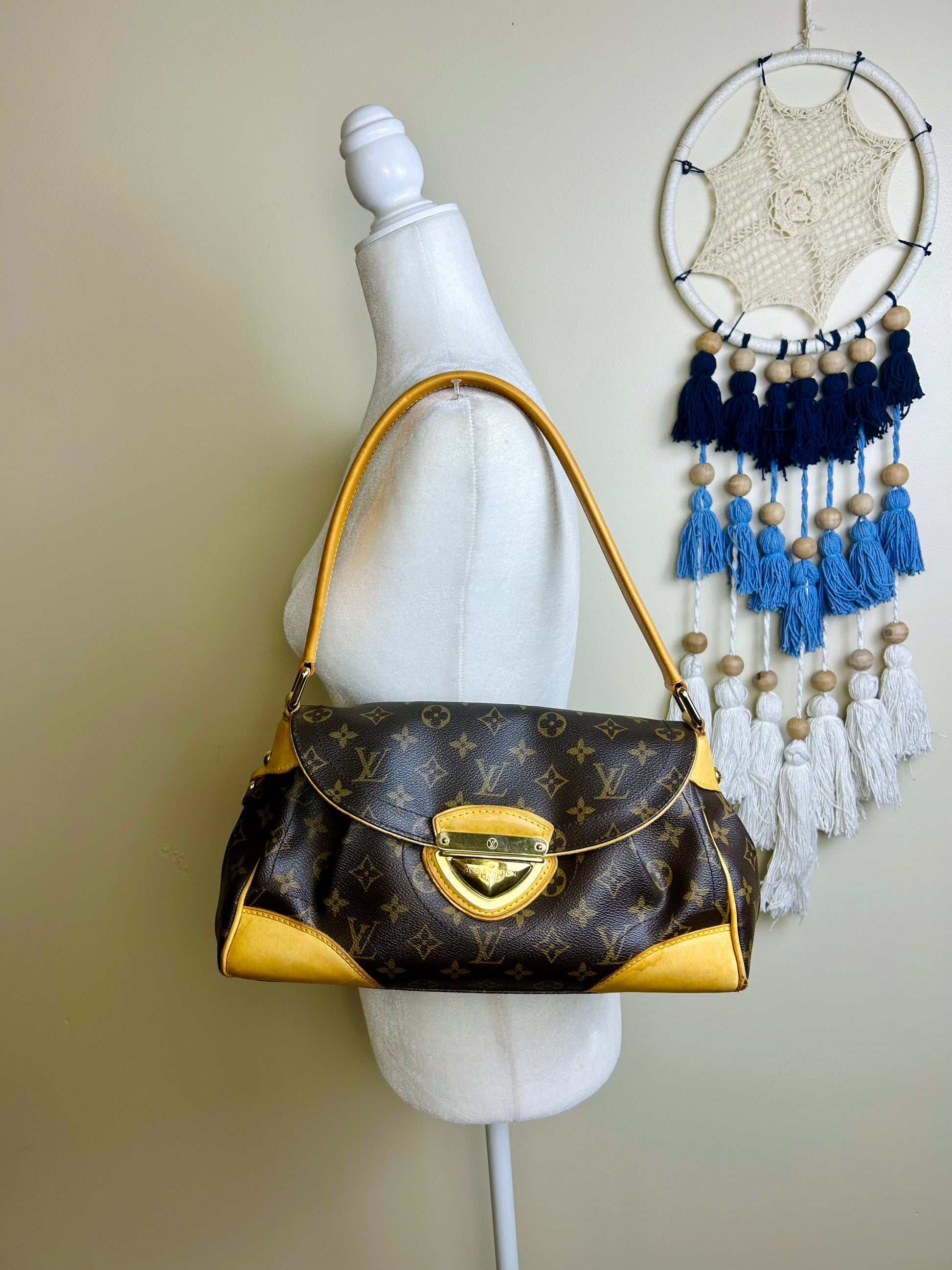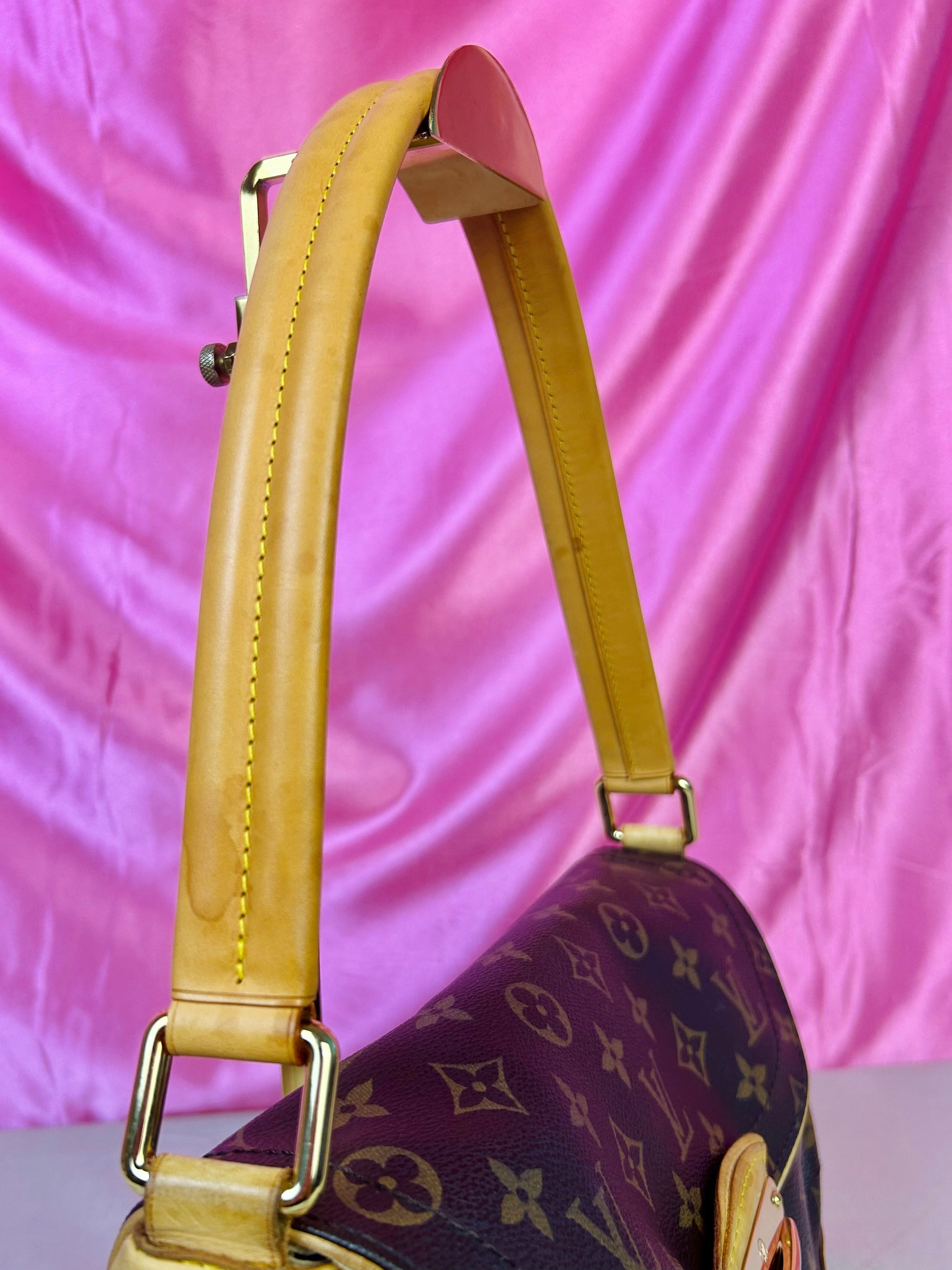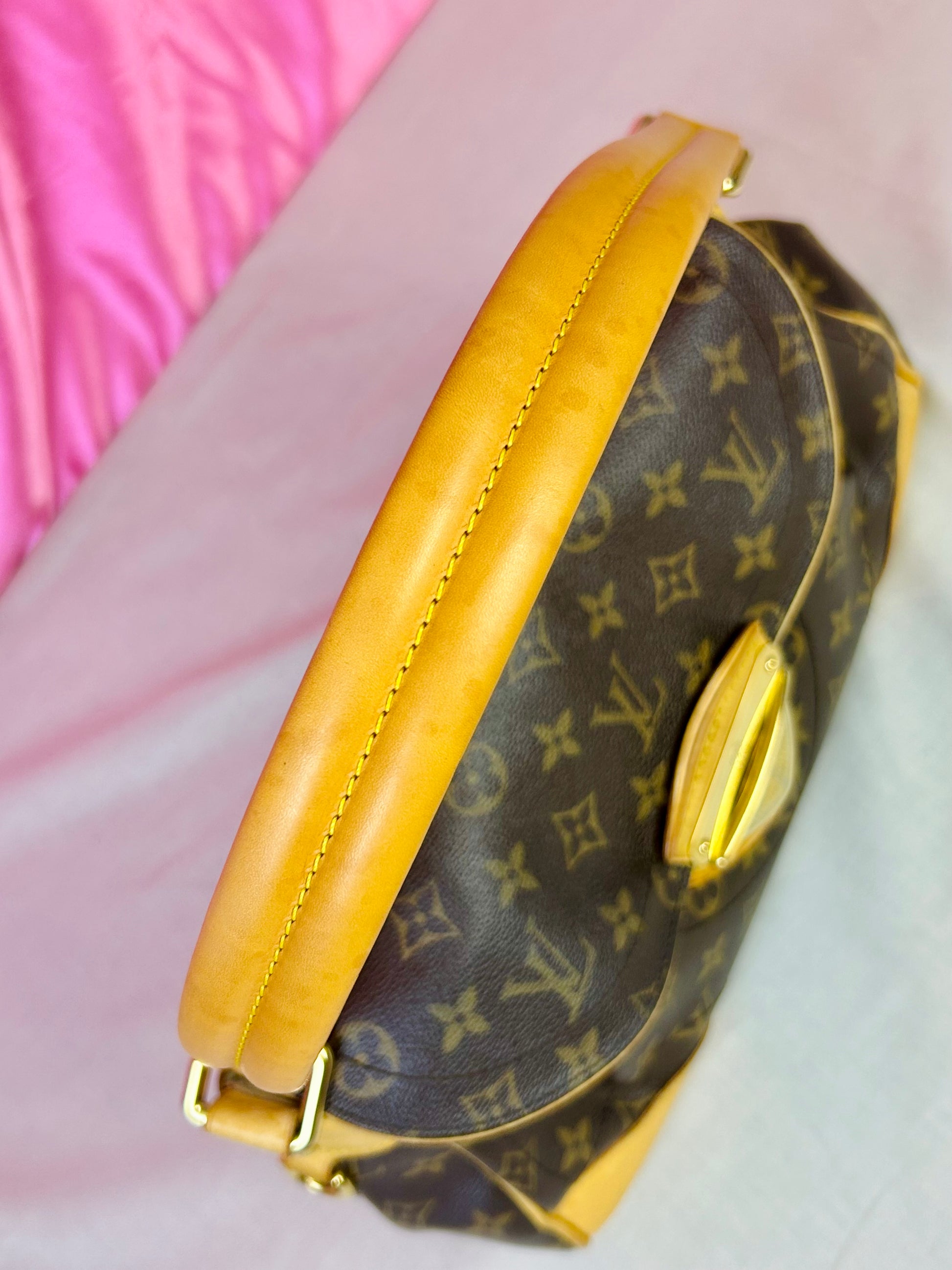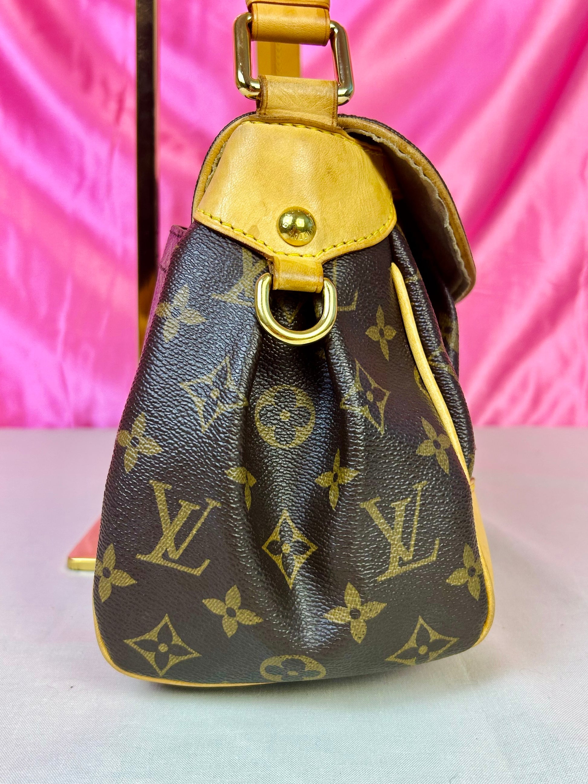 š Description: Canvas is in excellent condition, no cracks. Leather has watermarks throughout, but overall a light patina. Straps and chapes are strong, no cracks. One corner has exposed piping. Buckle clasps works properly, mostly gold, has silvered a little in the middle. Trim has no holes or cracks. Interior has some discoloration spots, inner and exterior pockets are clean.Ā