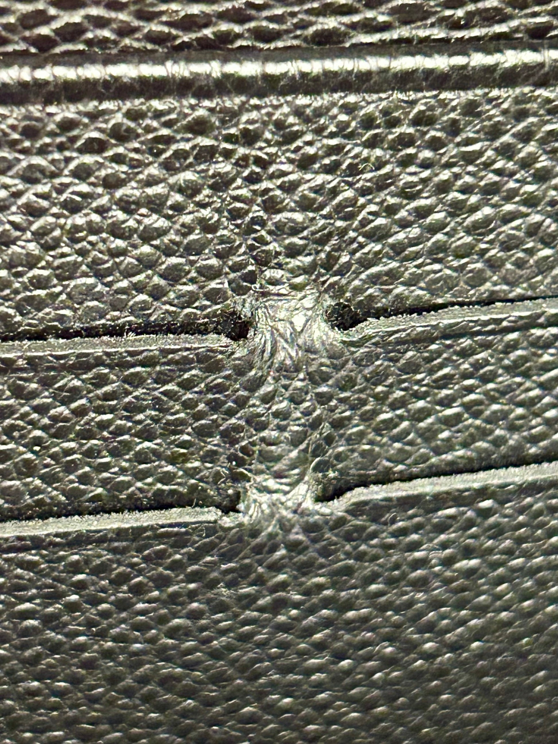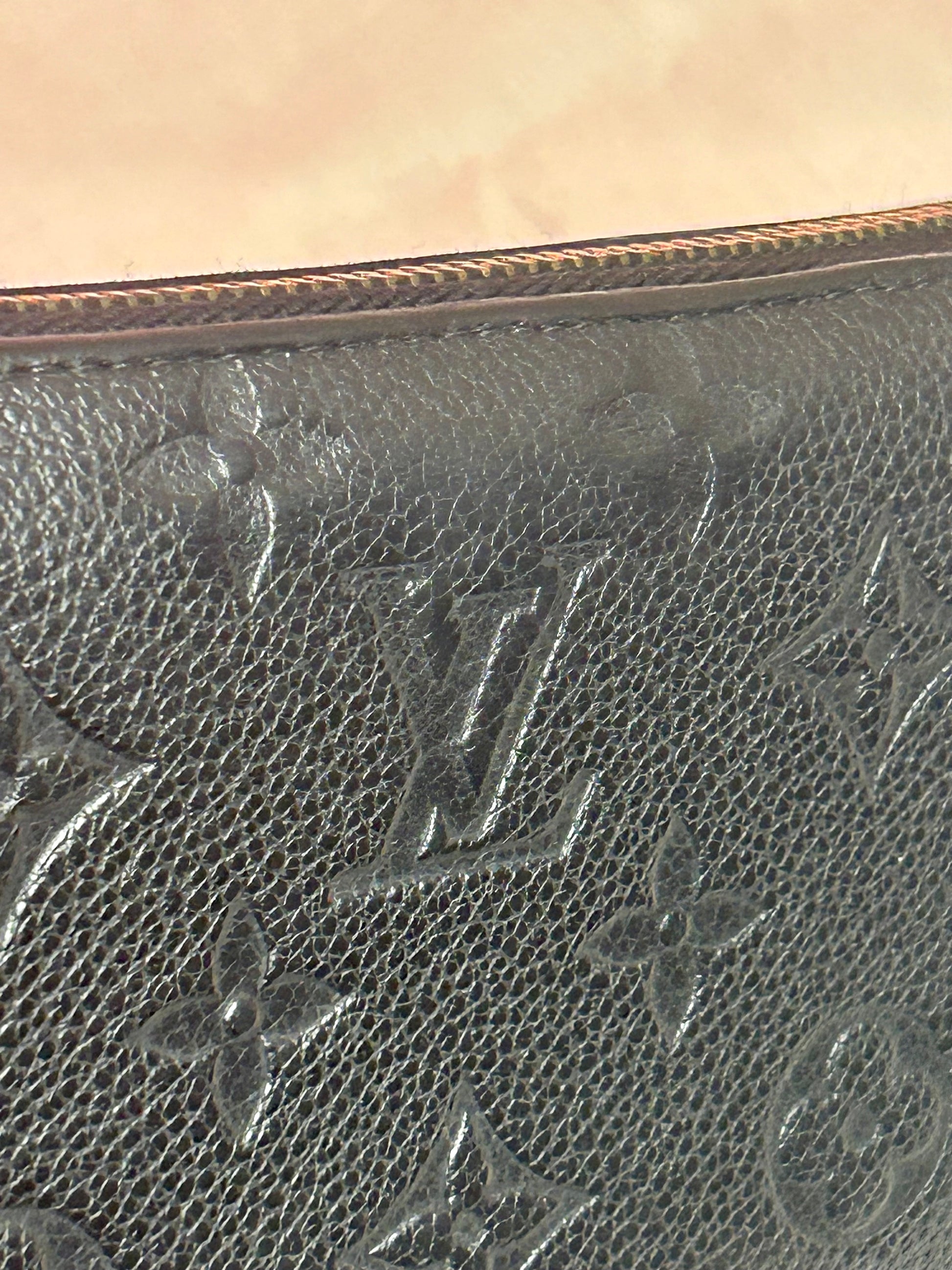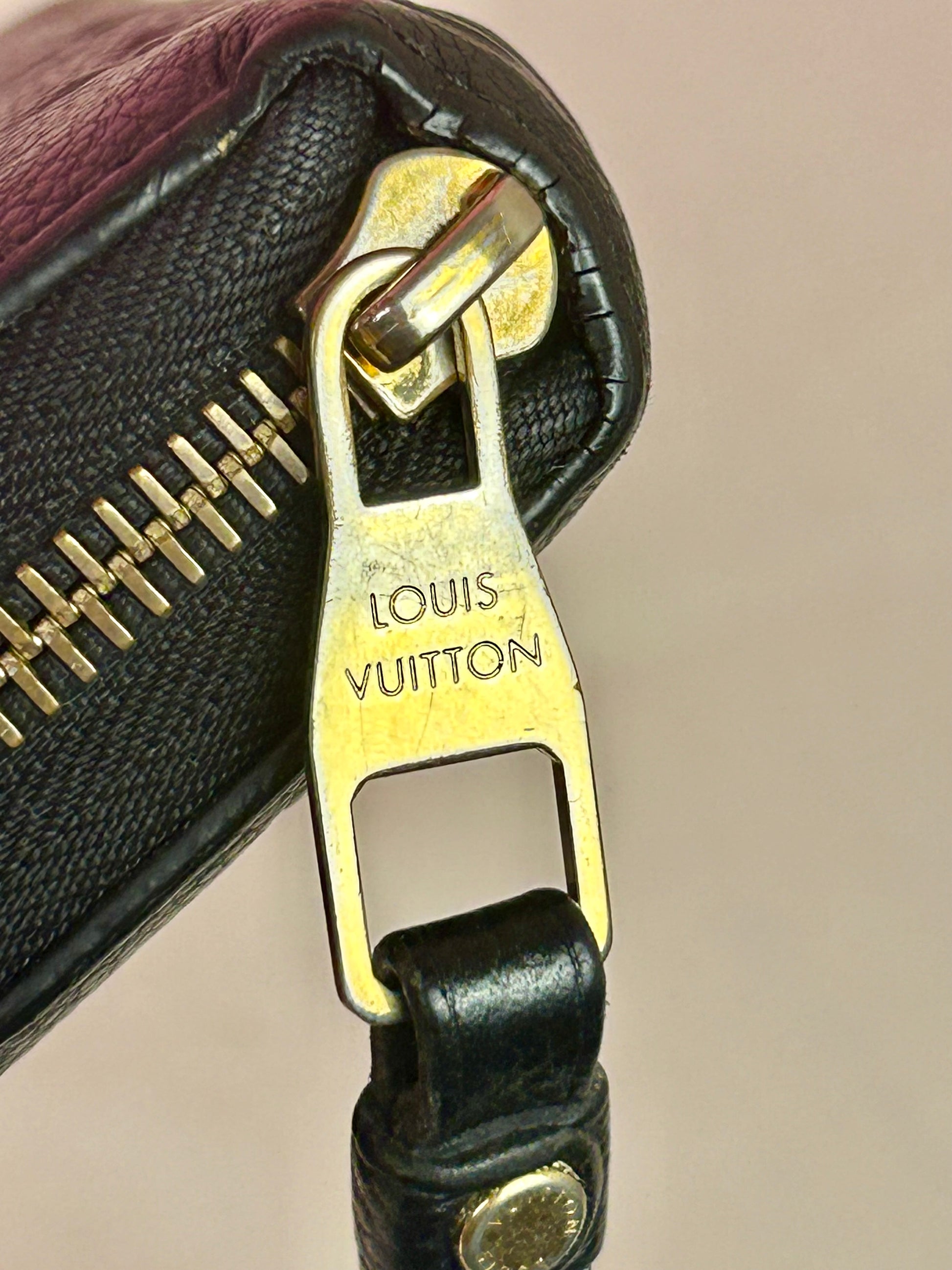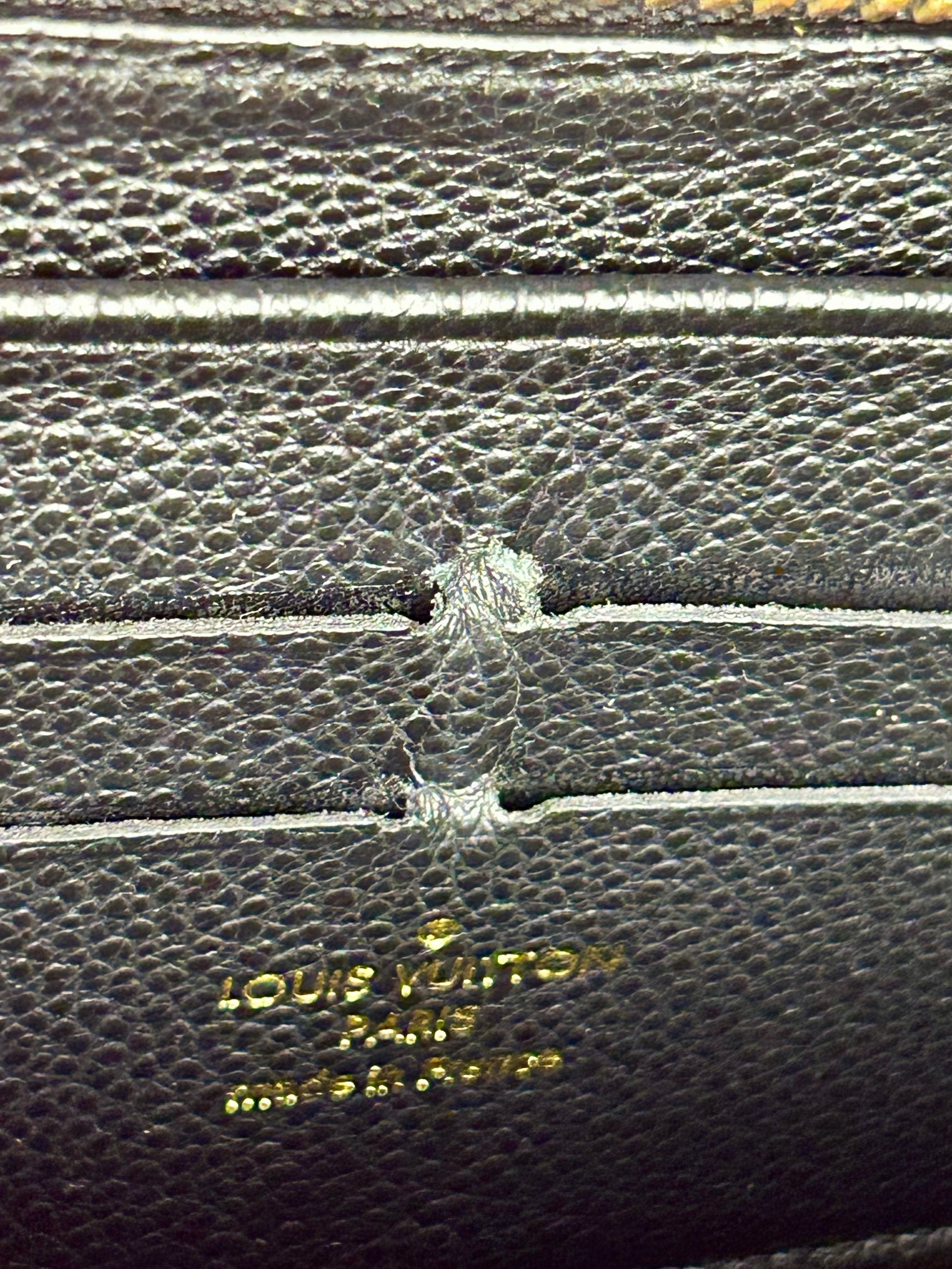 💜 Description: Leather is in beautiful condition—this wallet is stunning! There is rubbing on the top corners of the piping. No tears or cracks on the leather monogram canvas. Main zipper and interior compartment zipper pull and function well. Interior has 2 large slots, three separate compartments, 8 card slots, and zippered coin pouch. One set of card slots as a tear. Interior is clean.
