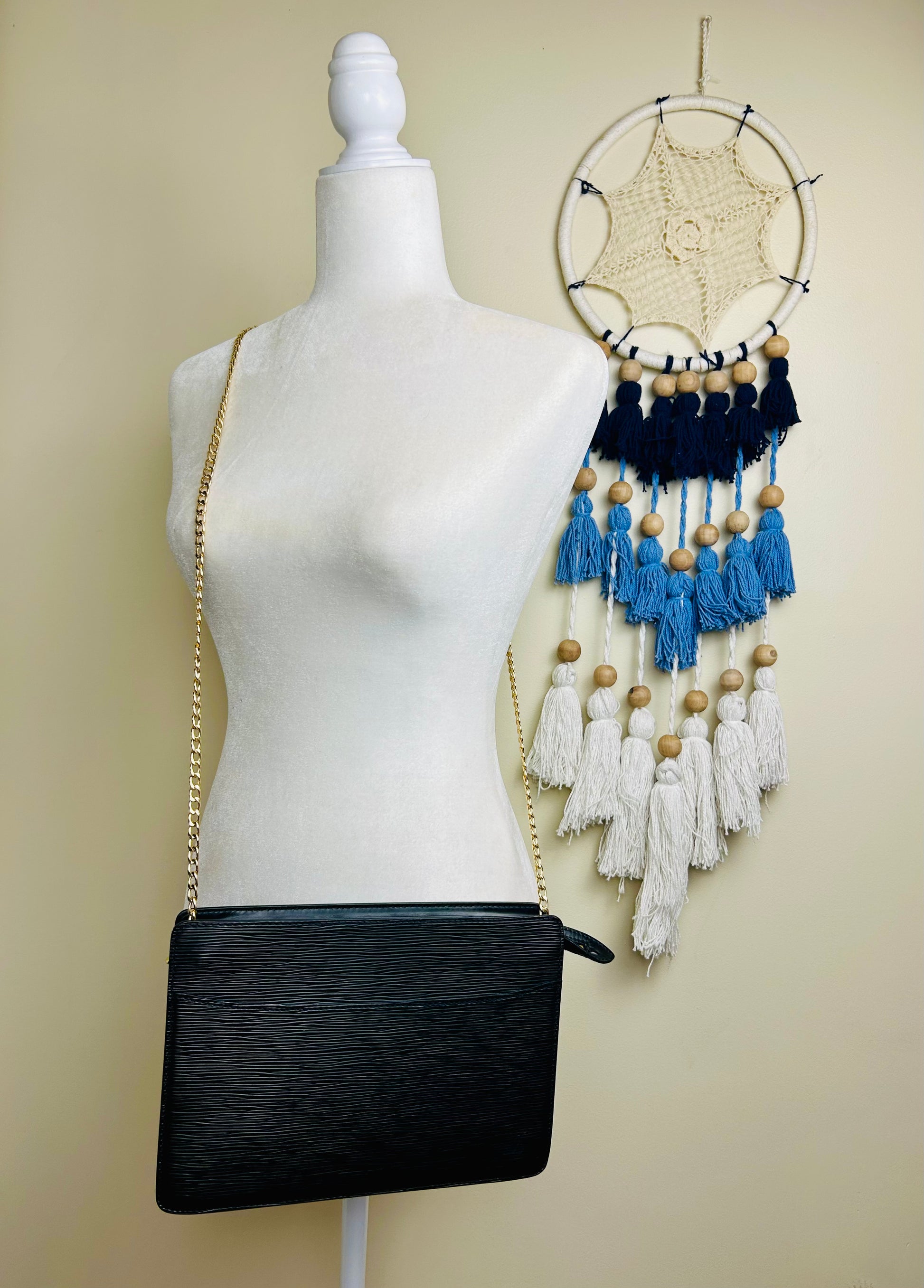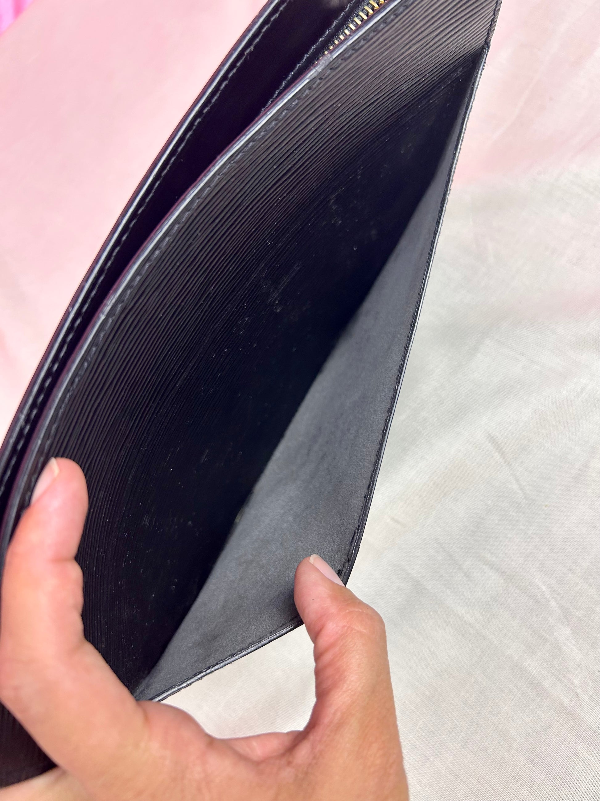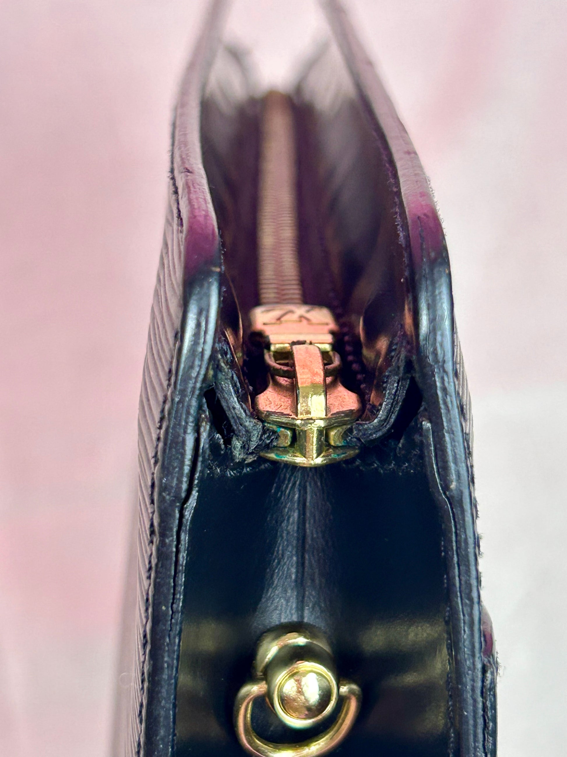 💜 Description: Epi leather is in beautiful condition with light wear on the bottom corners. Originally a clutch, this piece has been converted into a crossbody with D-ring and using a generic gold chain strap. The front pocket is very clean. Interior is clean with minimal signs of use, including the interior pocket. Zipper glides smoothly.