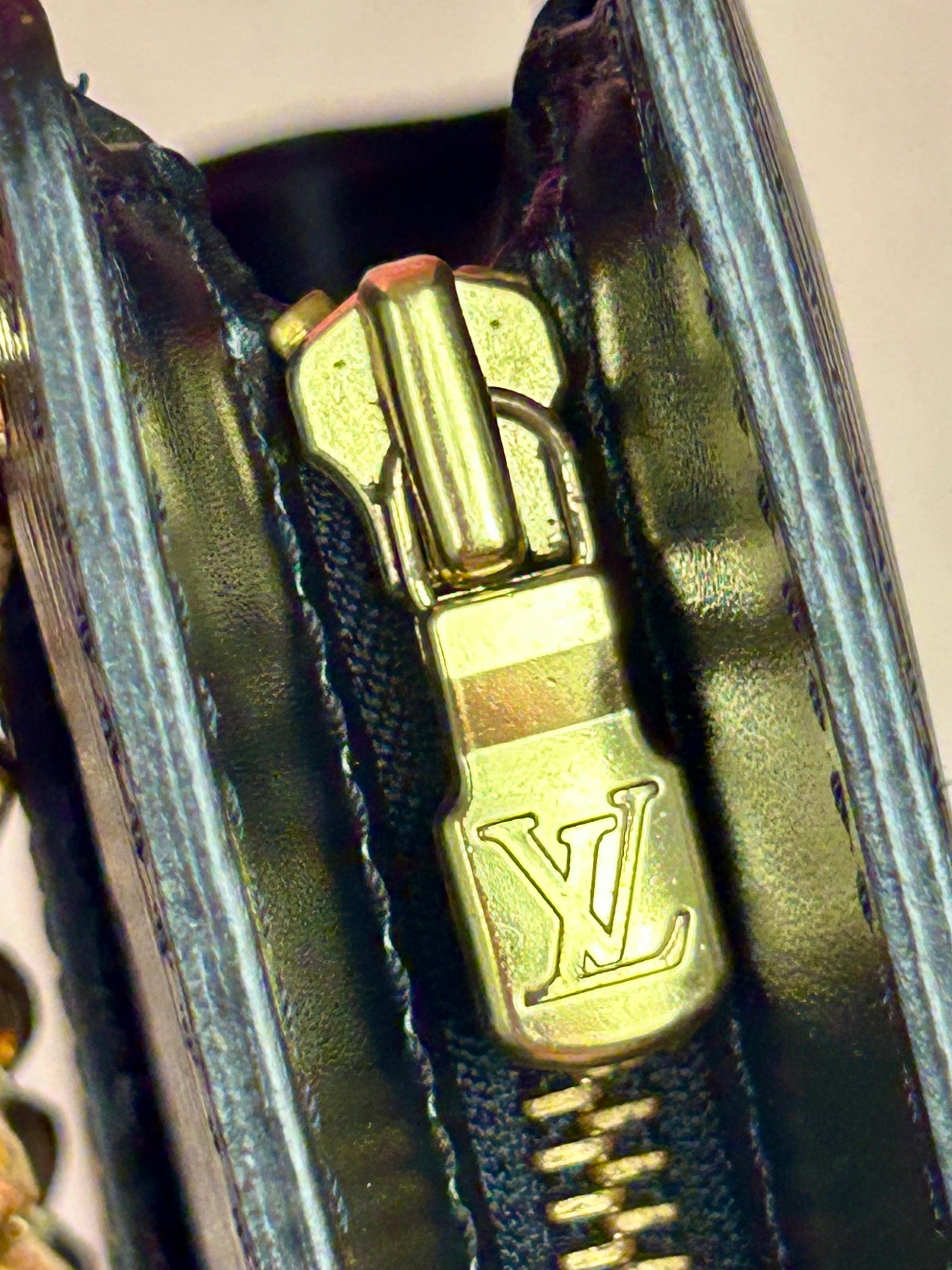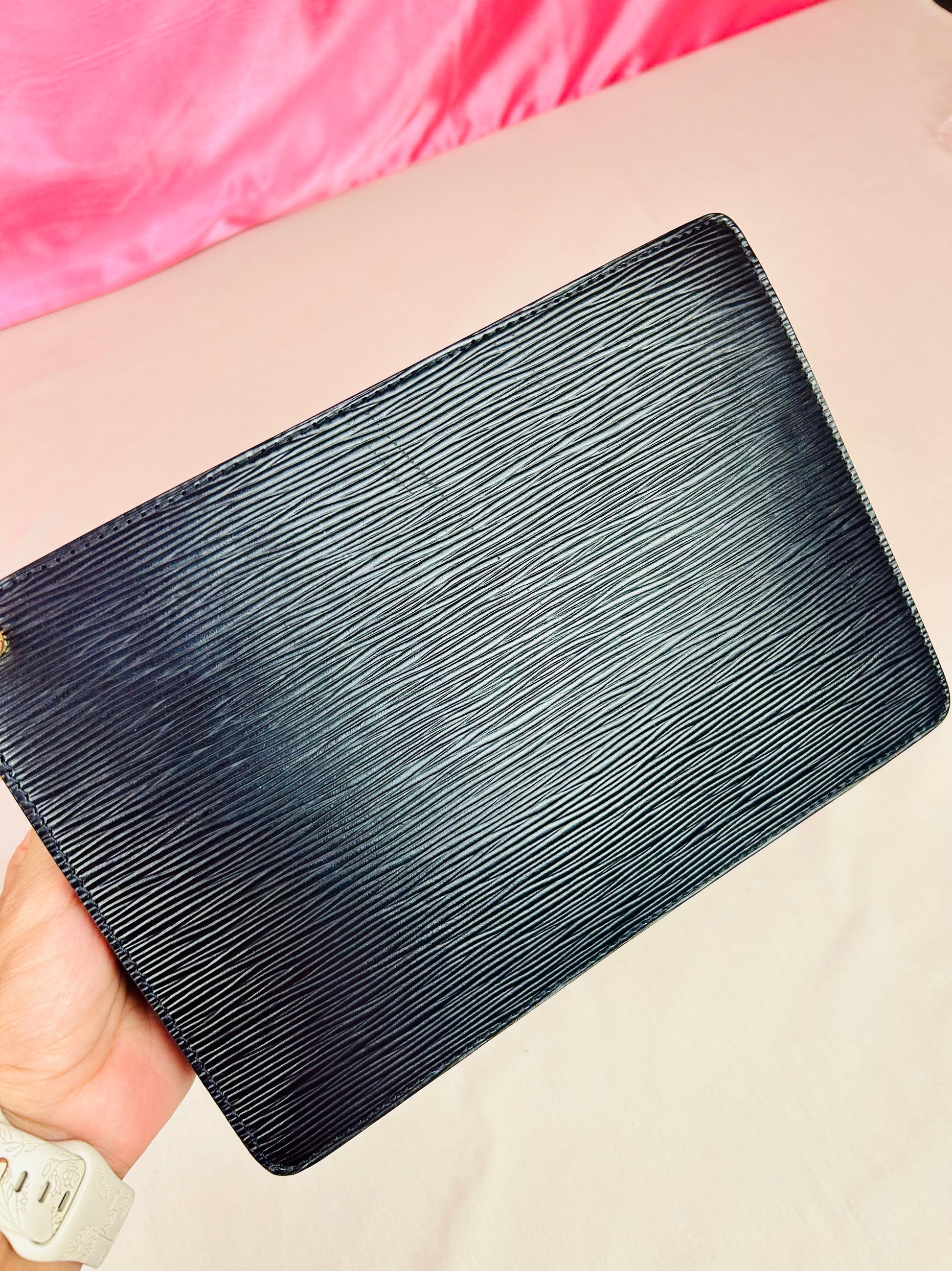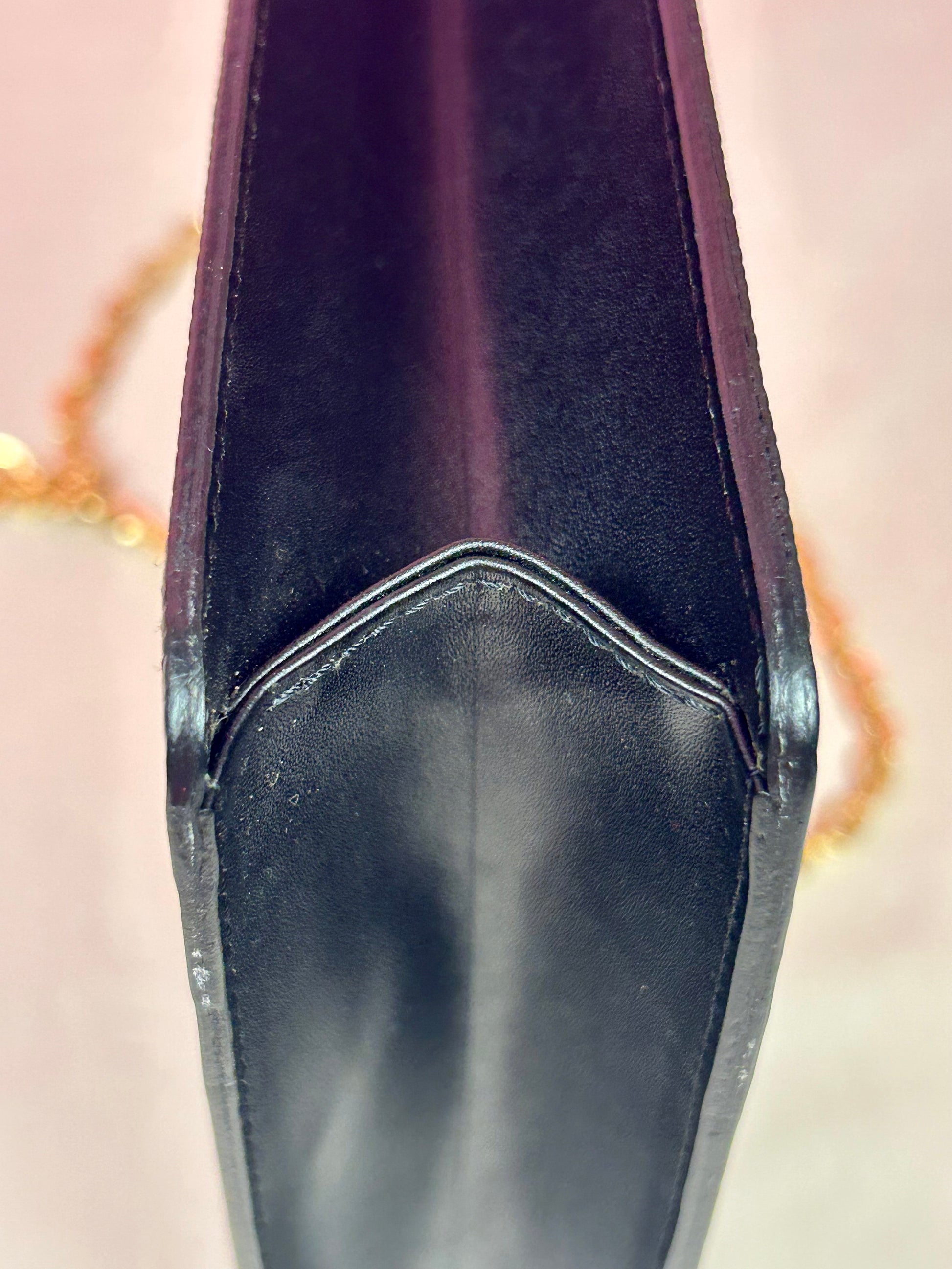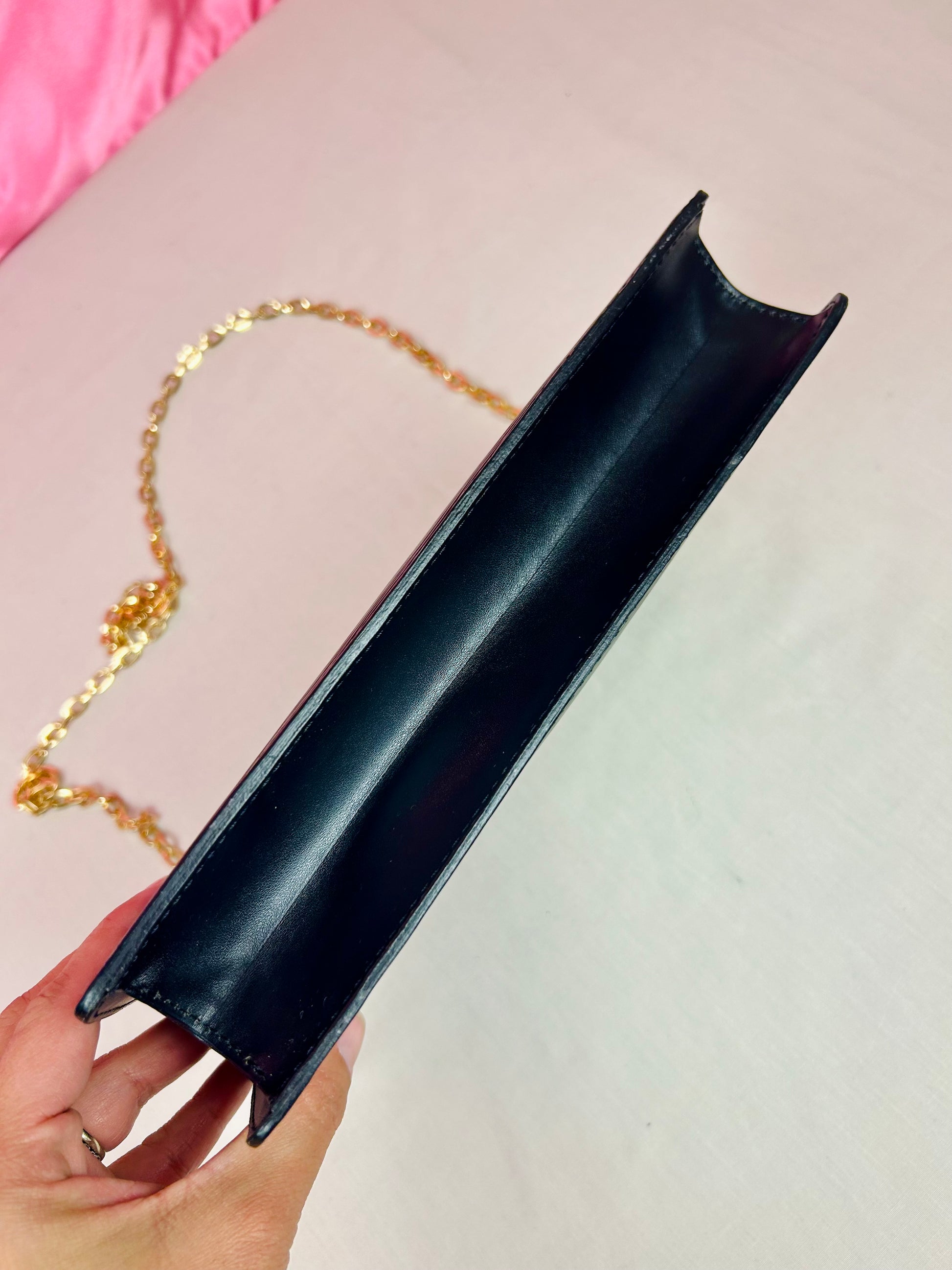 💜 Description: This sleek black clutch has been converted into a stylish crossbody with added D-rings! Some mild wear is noted on the bottom edges, along with some markings on the back canvas. Interior and pocket are clean. Zipper pull works well. A timeless and versatile piece!