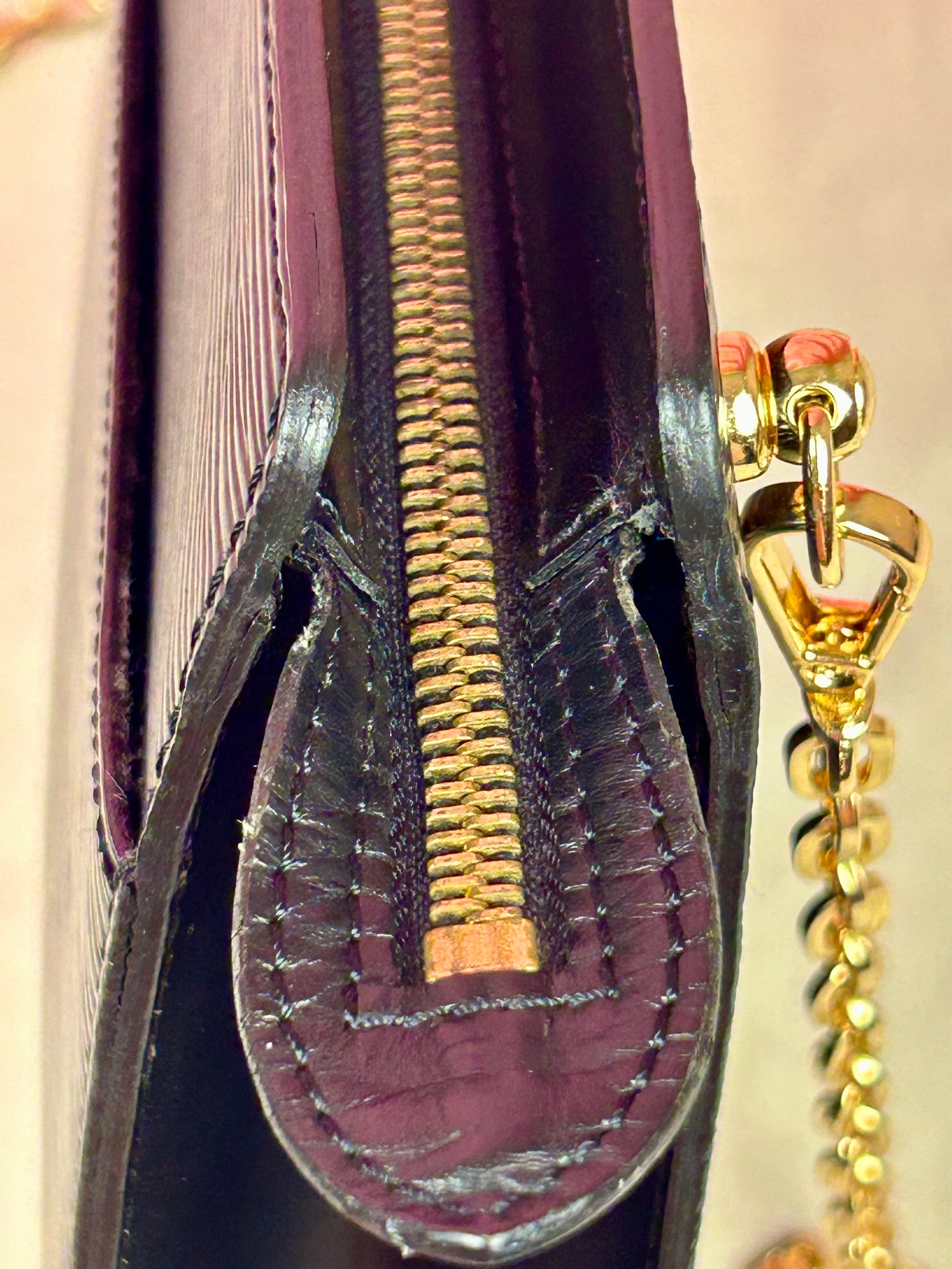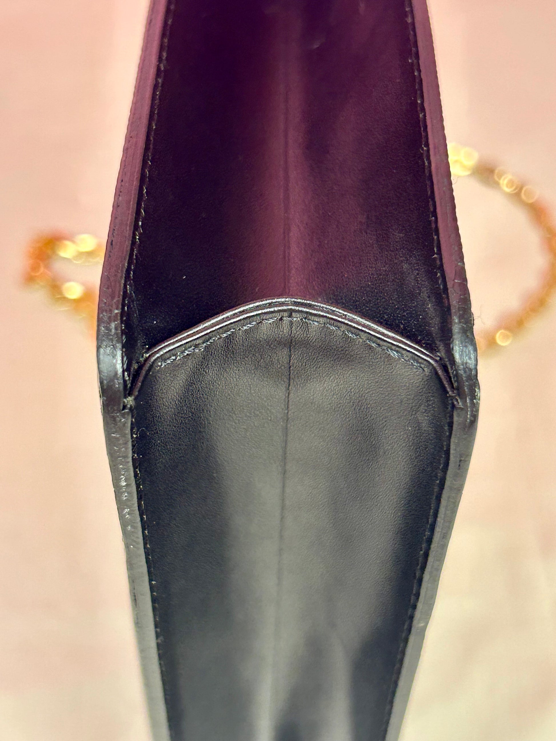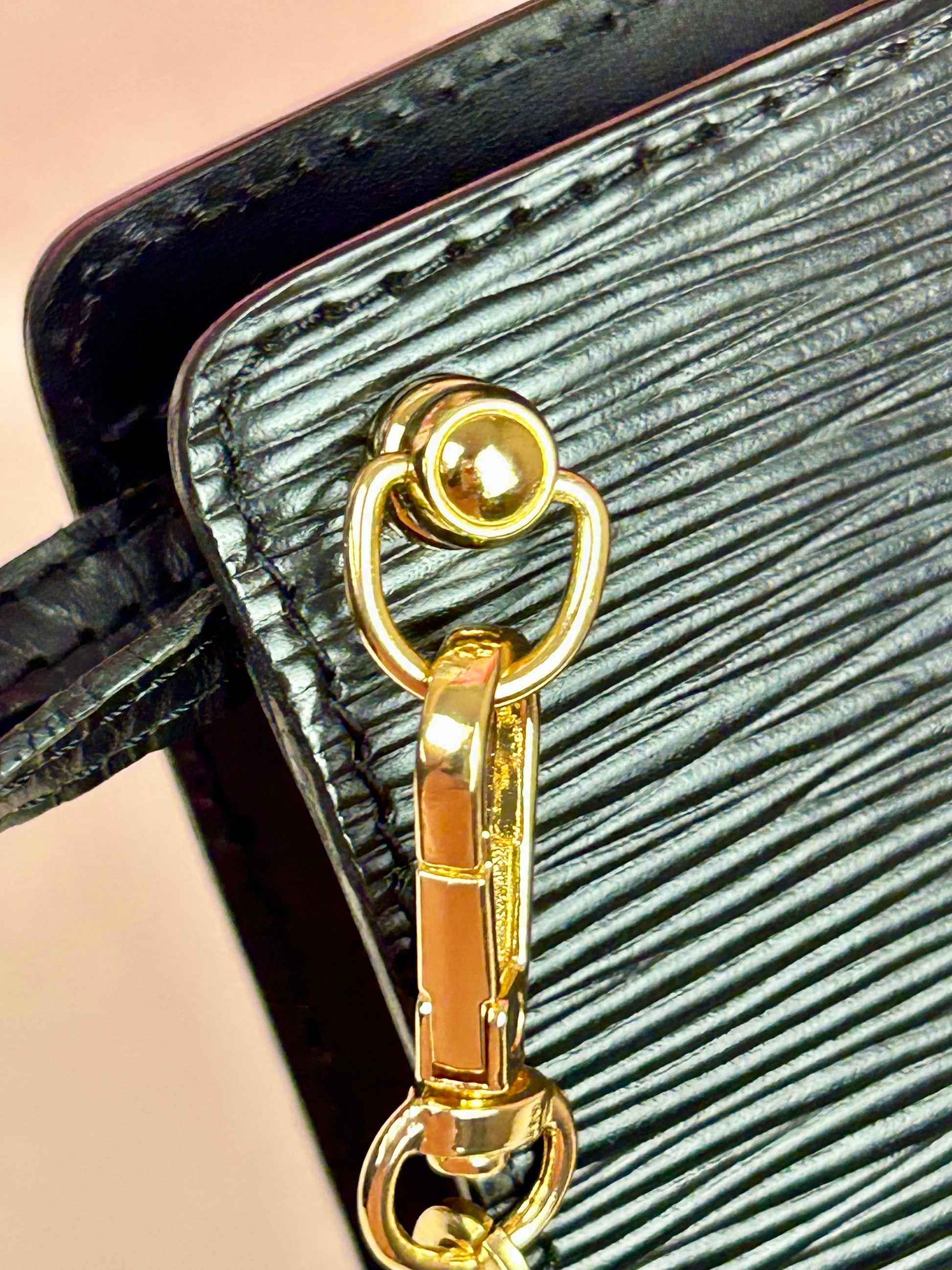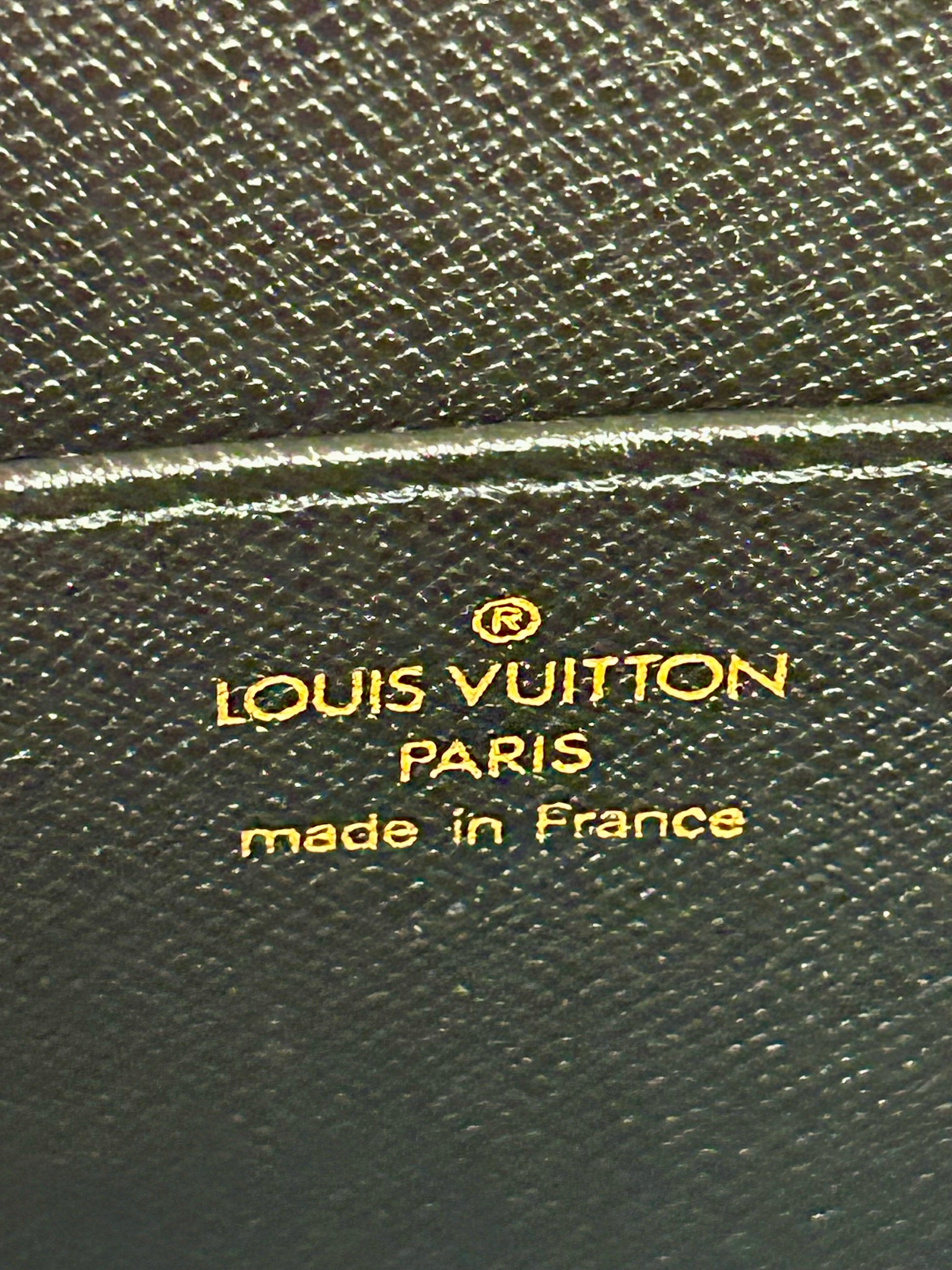 💜 Description: This sleek black clutch has been converted into a stylish crossbody with added D-rings! Some mild wear is noted on the bottom edges, along with some markings on the back canvas. Interior and pocket are clean. Zipper pull works well. A timeless and versatile piece!