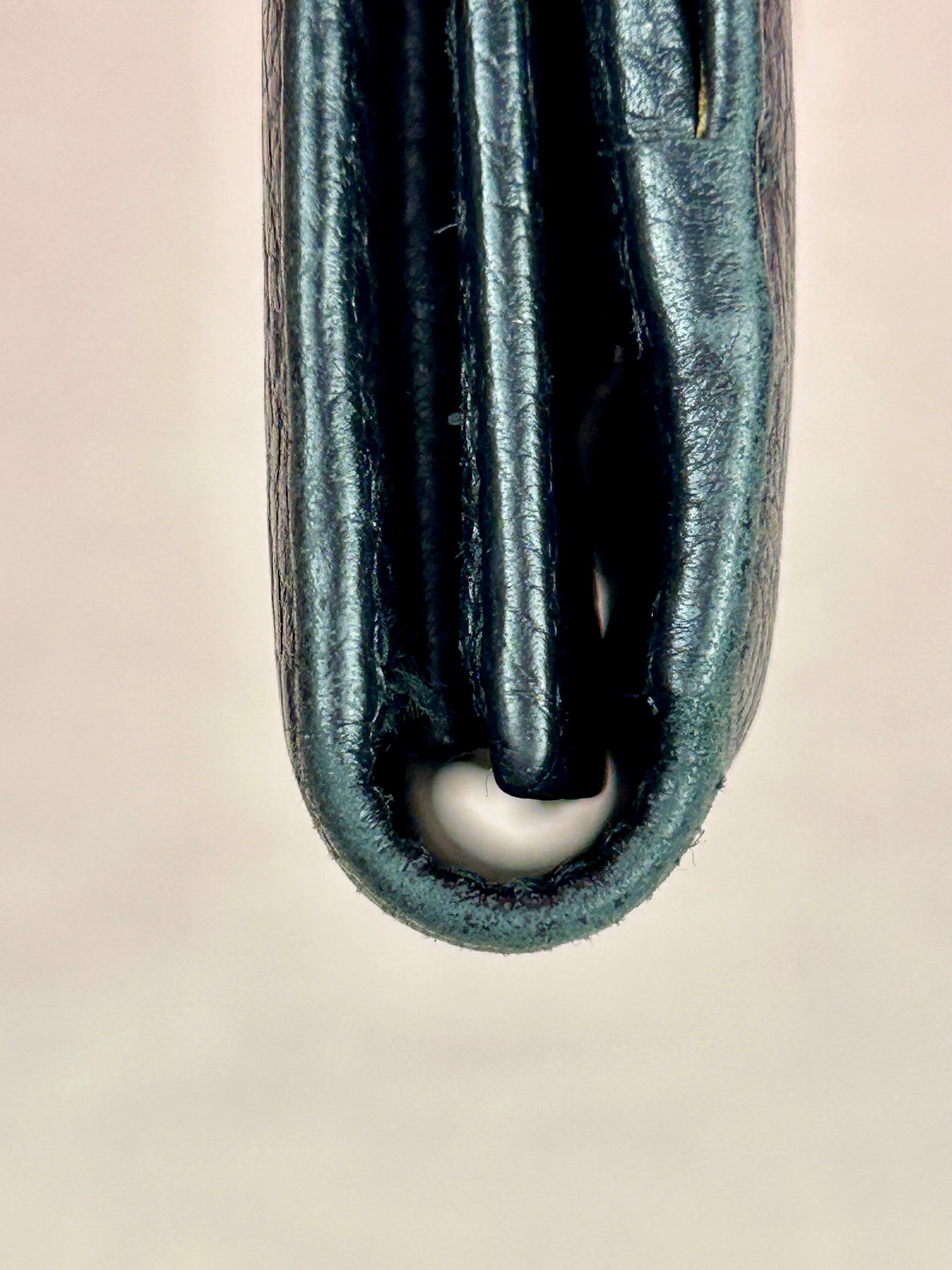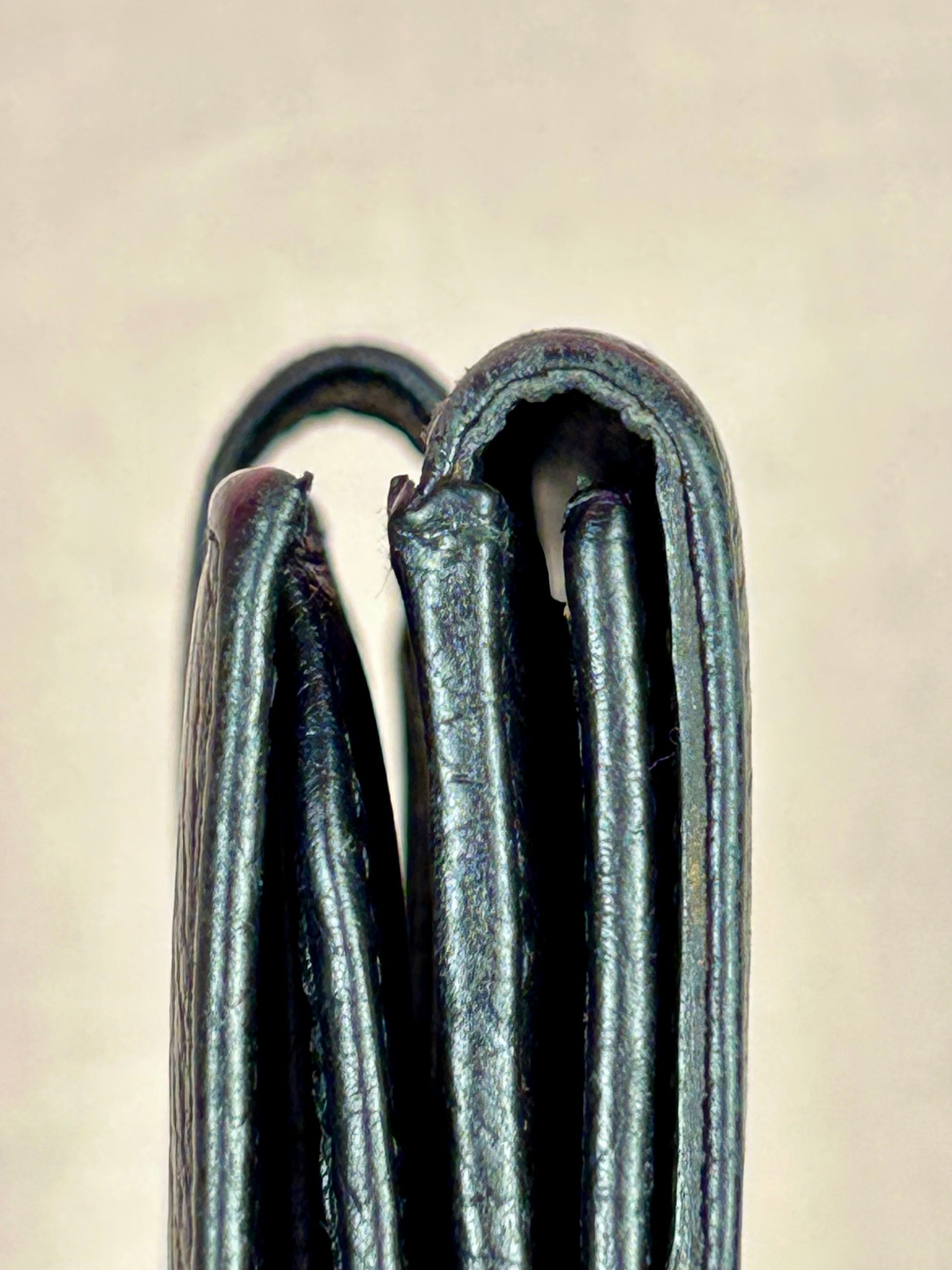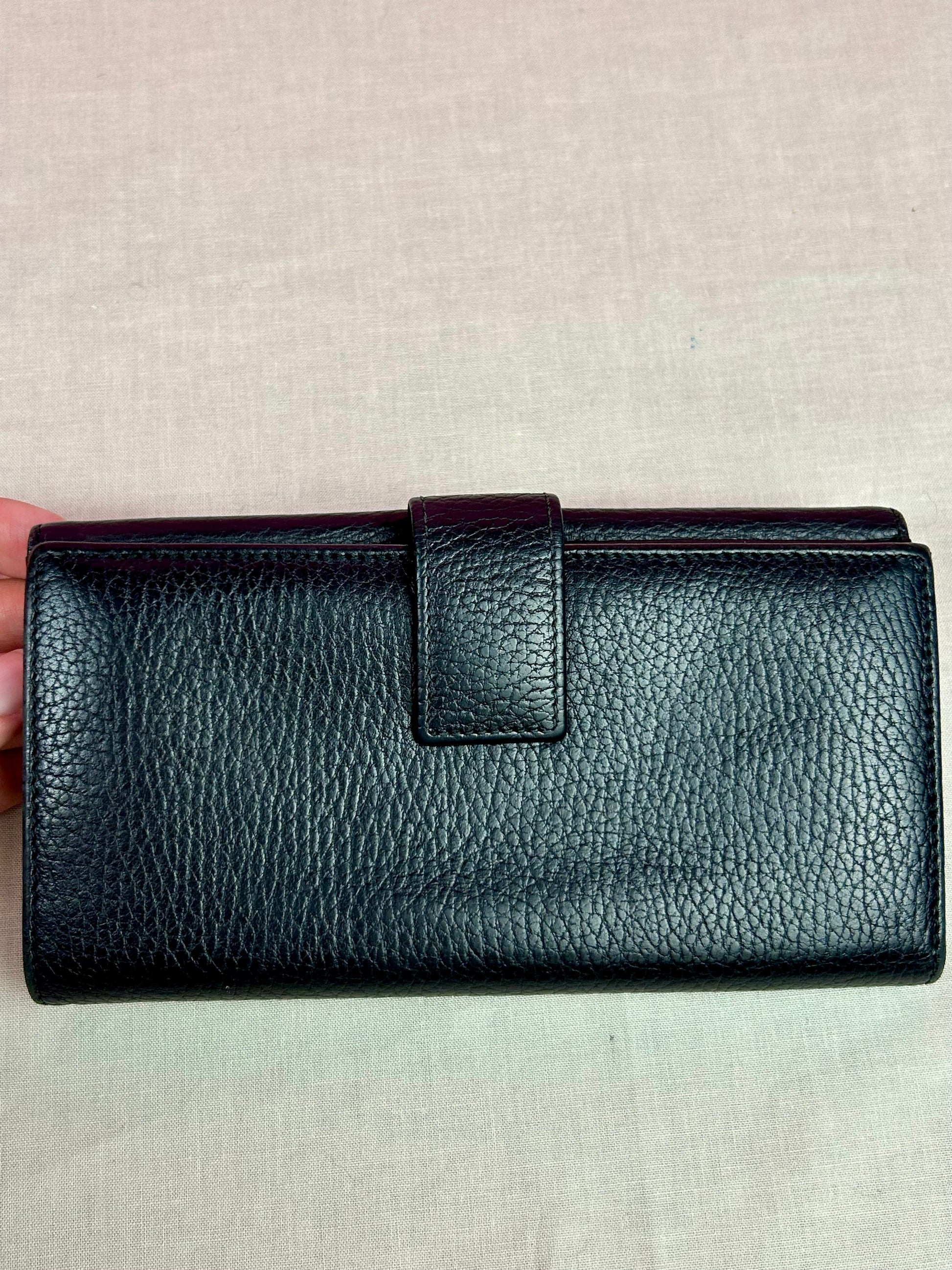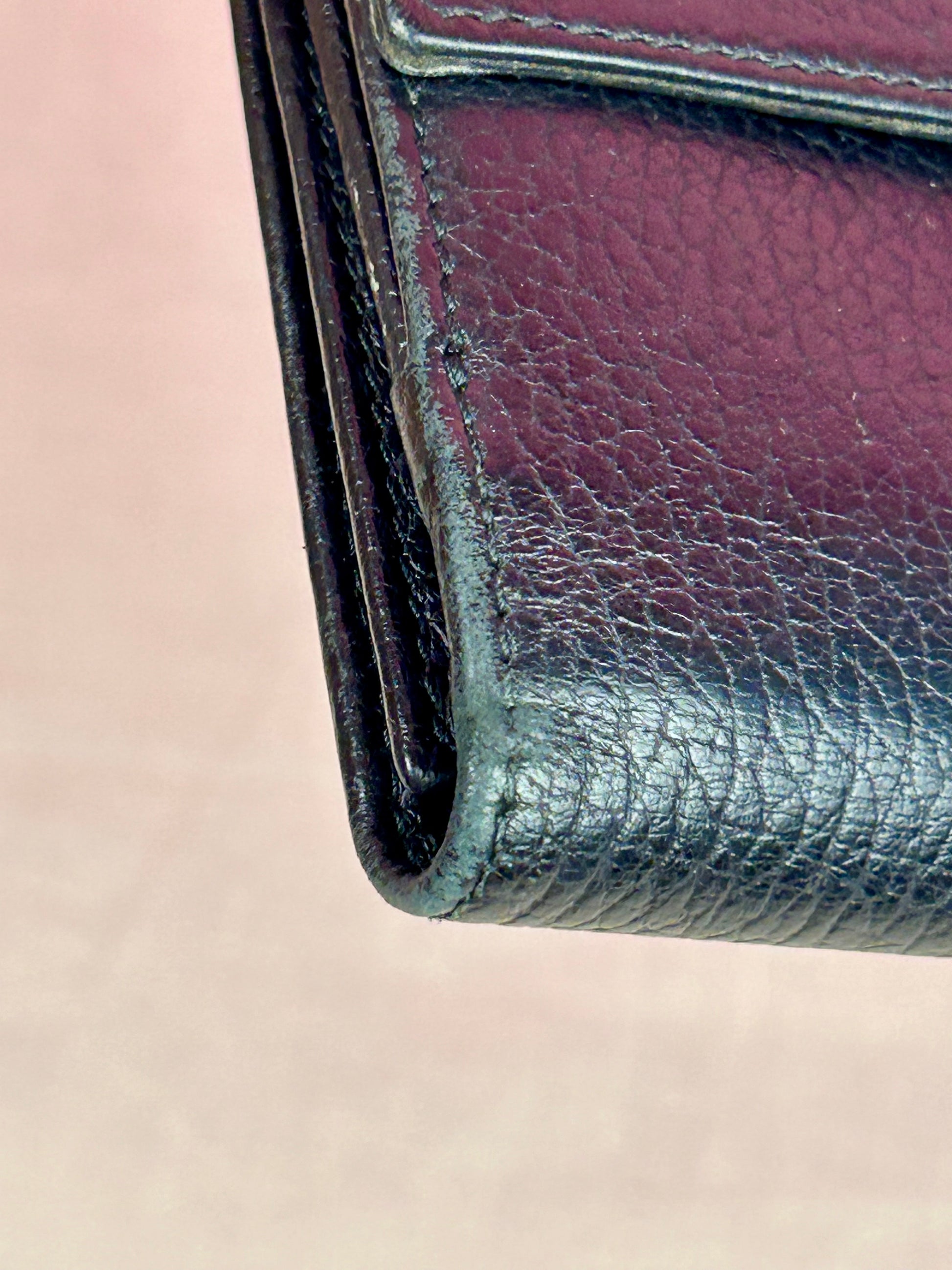 💜 Description: black pebbles leather in beautiful condition with no cracks or tears. The bottom corners have rubs. There is a small indentation on the front where the clasp rests naturally against the leather. Front clasp has a crack, but doesn’t not affect the function. Features include a spacious front compartment, 7 card slots, 2 large slip slots, and 2 roomy divided compartments. Hardware is shiny and the clasp functions smoothly.
