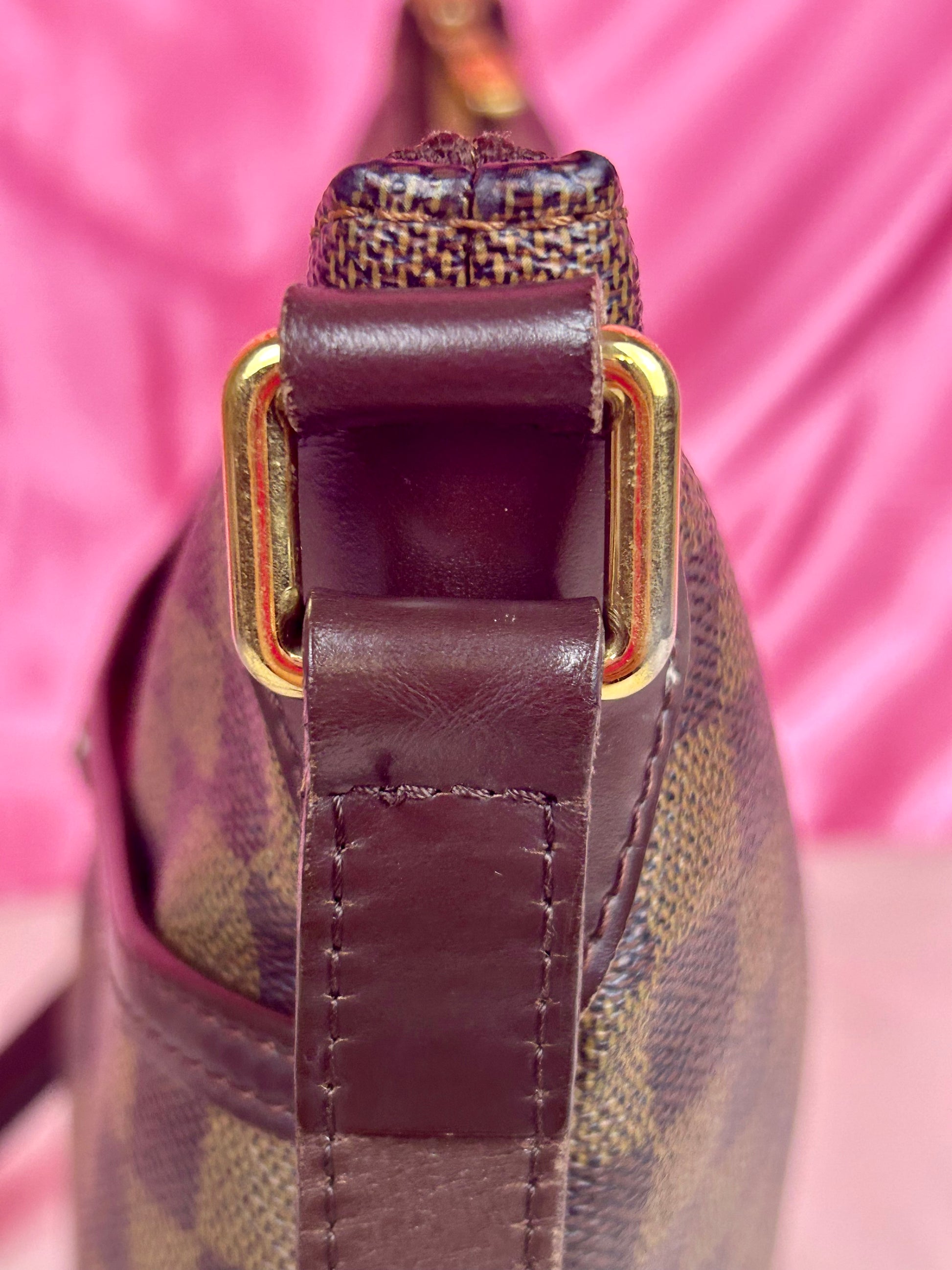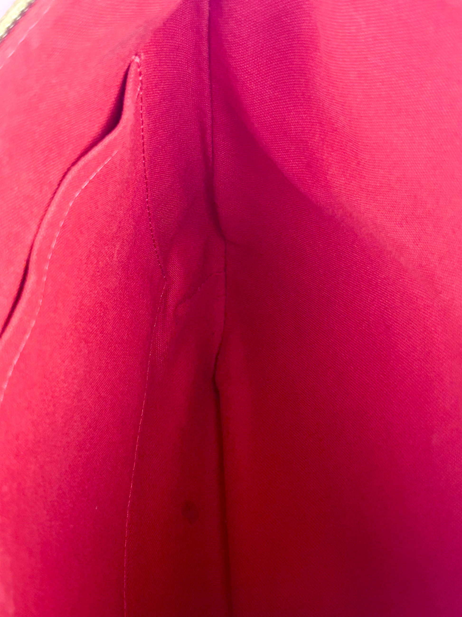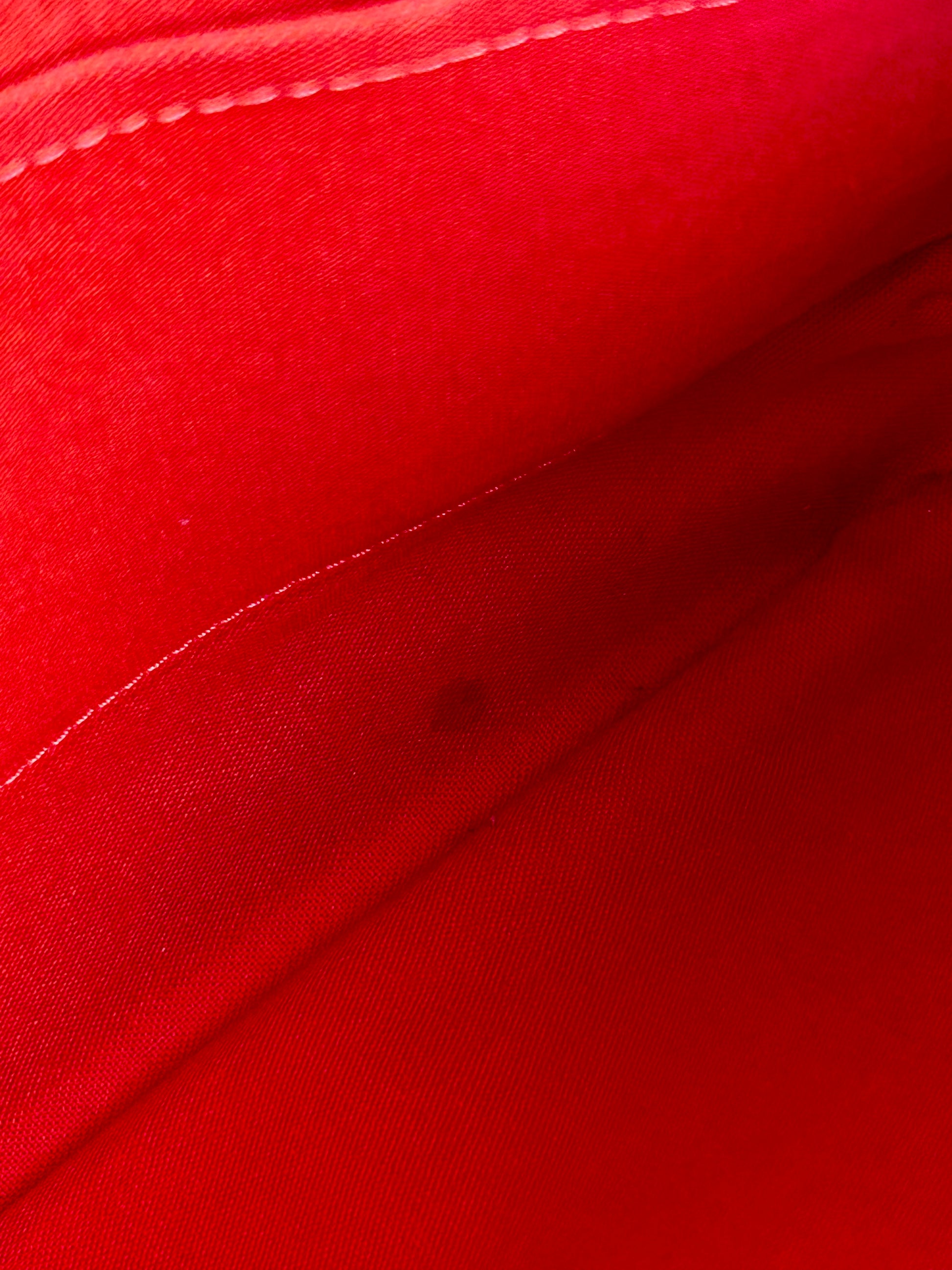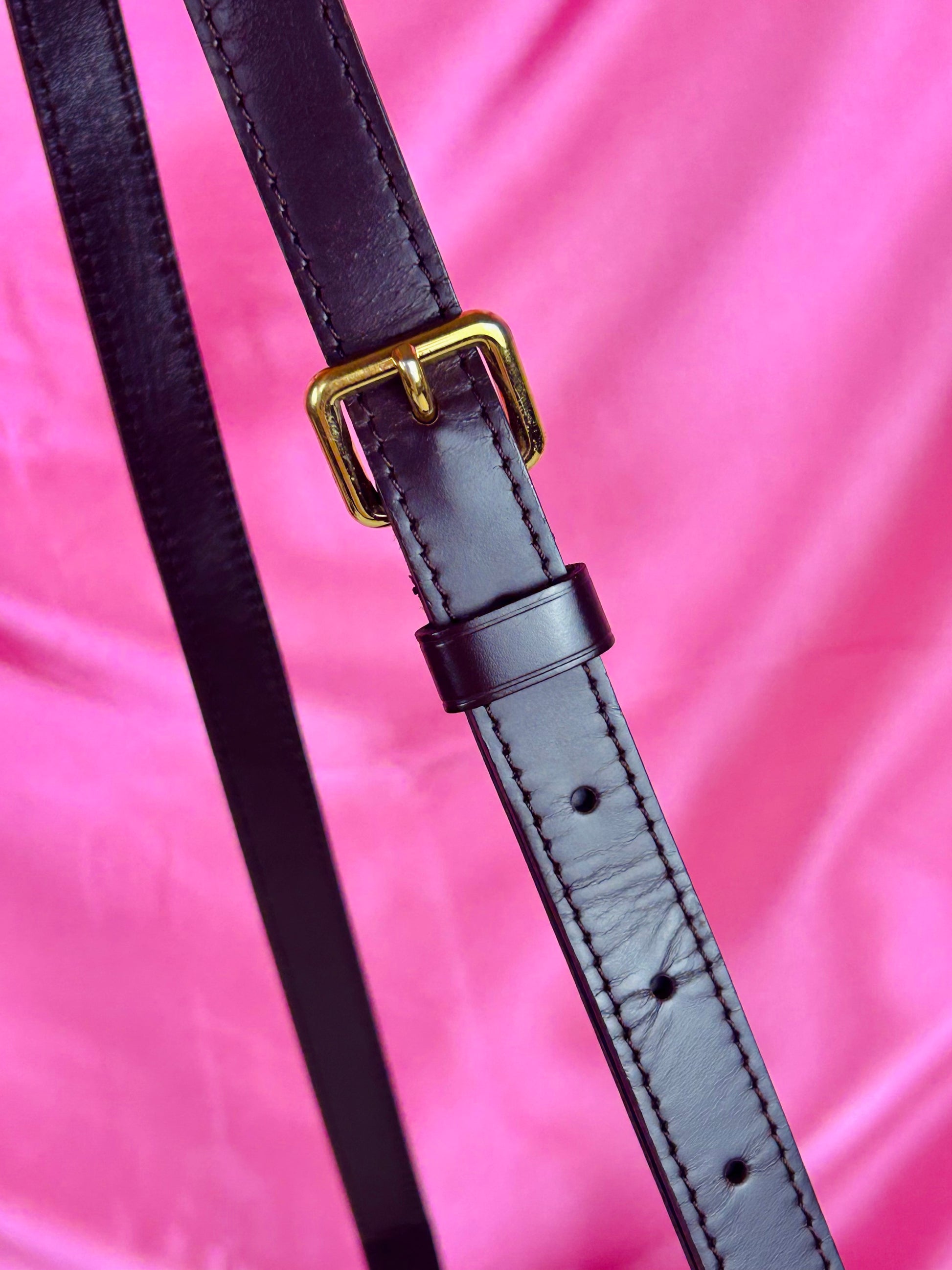 💜 Description: Canvas is in beautiful condition with no cracks or tears. Interior is clean with a small stain noted; interior pocket and front main pocket are both clean. Magnetic clasp works well and zipper pulls smoothly. Hardware is shiny. Piping shows normal rubbing on the bottom corner but no exposed areas. Leather strap is in excellent condition with light wear on the right side—no tears or cracks. Chapes are strong and intact.