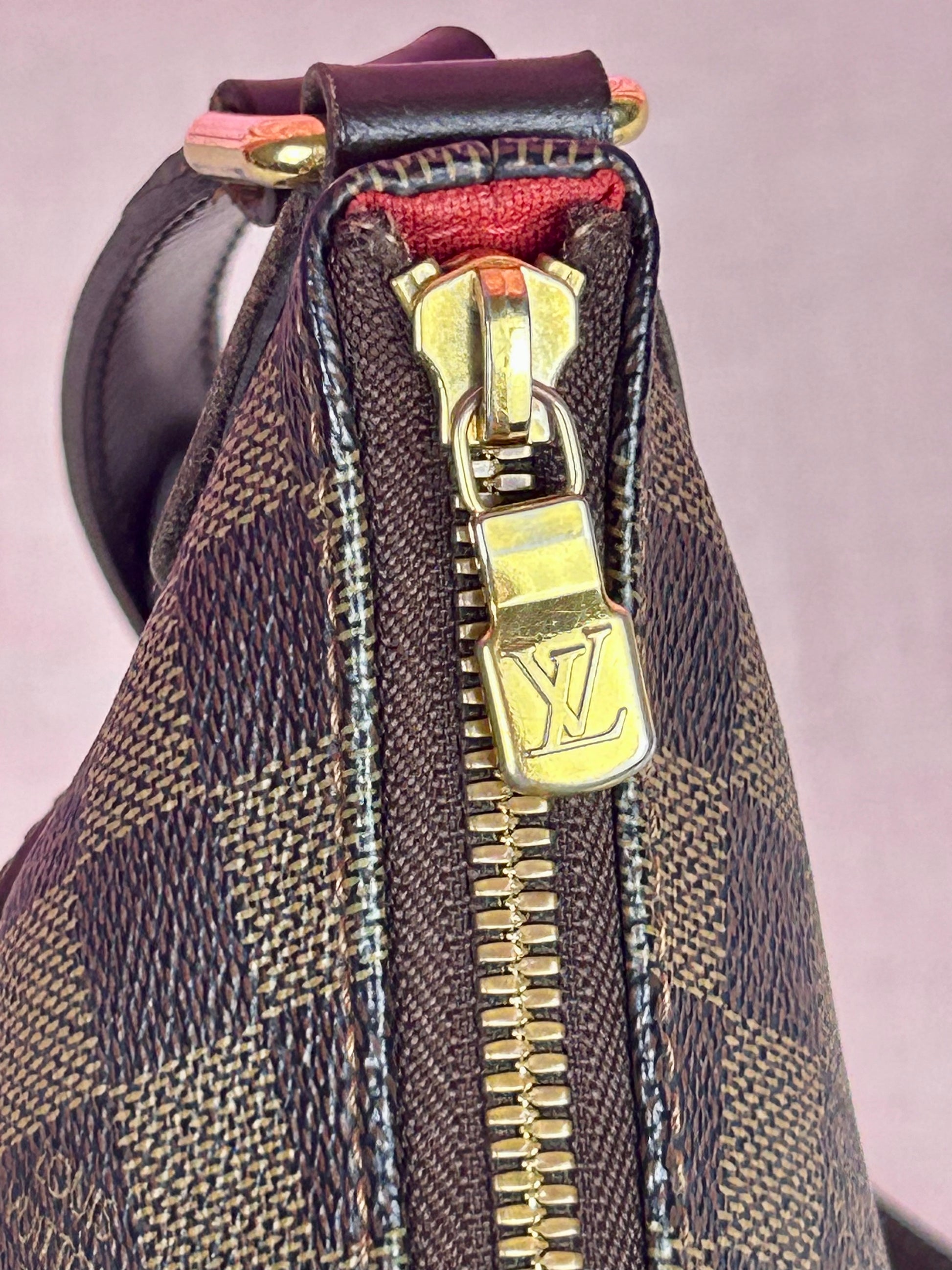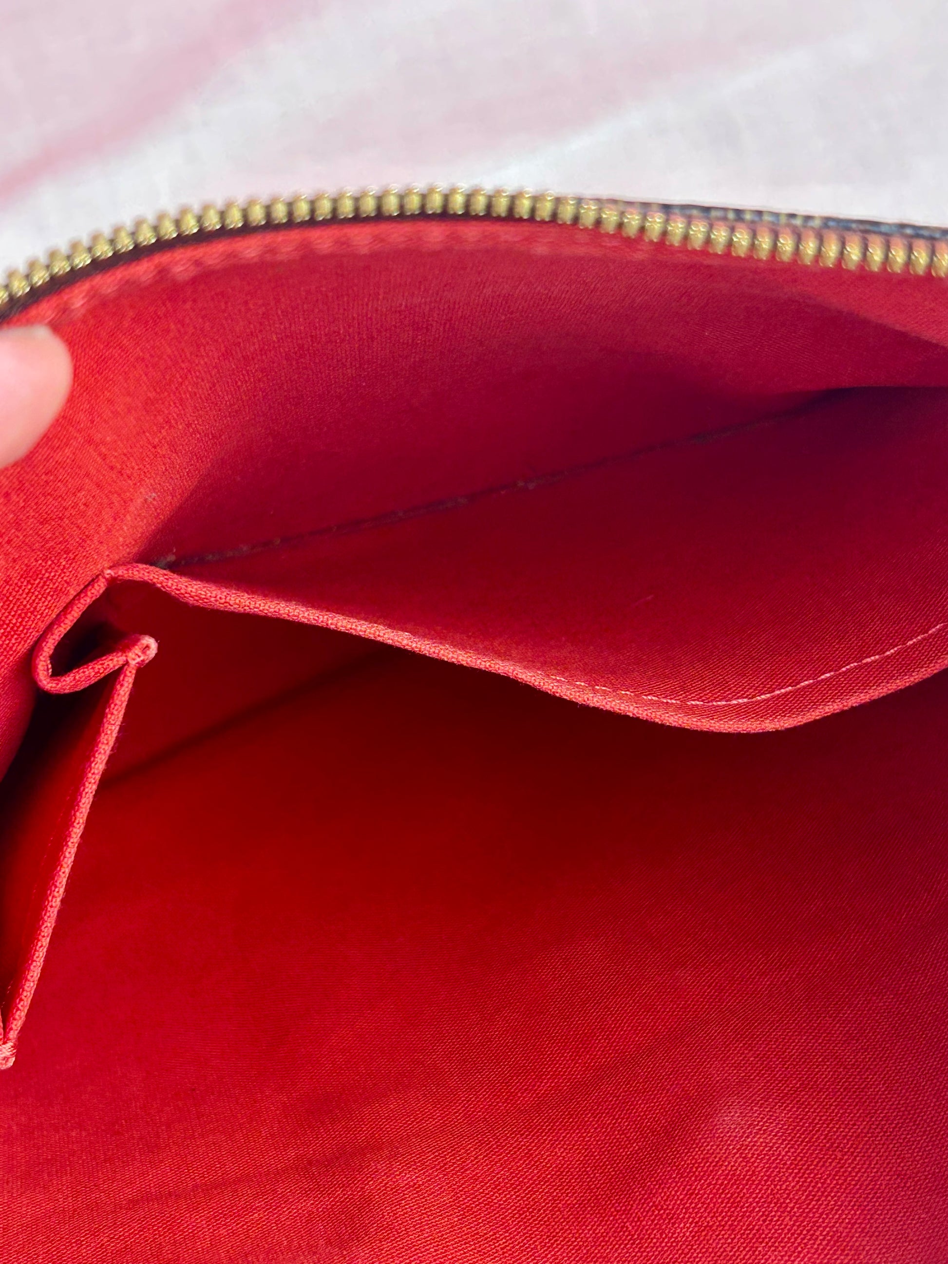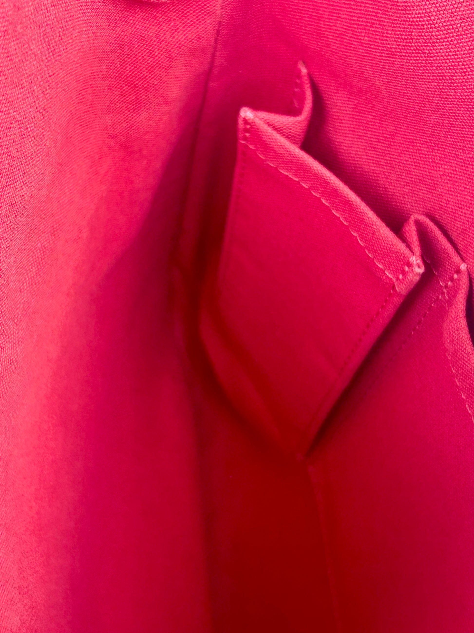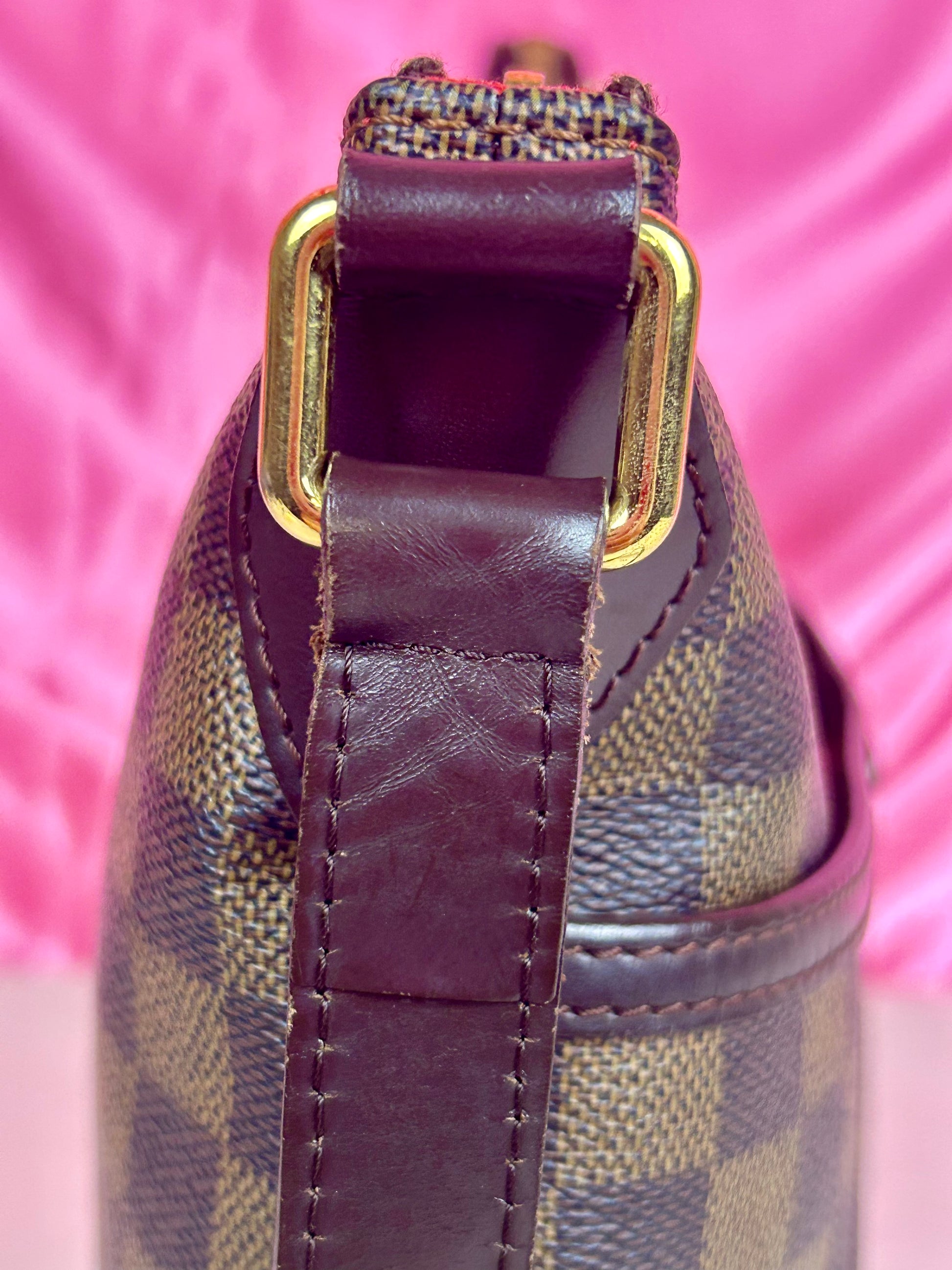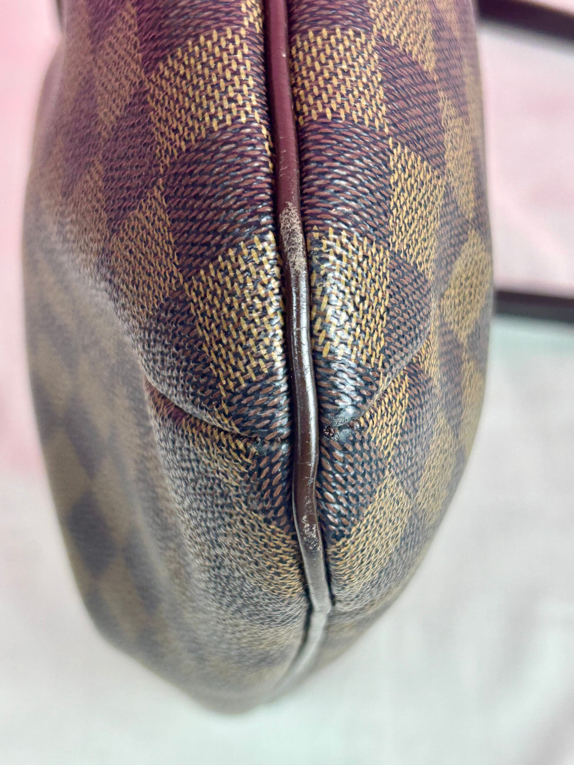 💜 Description: Canvas is in beautiful condition with no cracks or tears. Interior is clean with a small stain noted; interior pocket and front main pocket are both clean. Magnetic clasp works well and zipper pulls smoothly. Hardware is shiny. Piping shows normal rubbing on the bottom corner but no exposed areas. Leather strap is in excellent condition with light wear on the right side—no tears or cracks. Chapes are strong and intact.