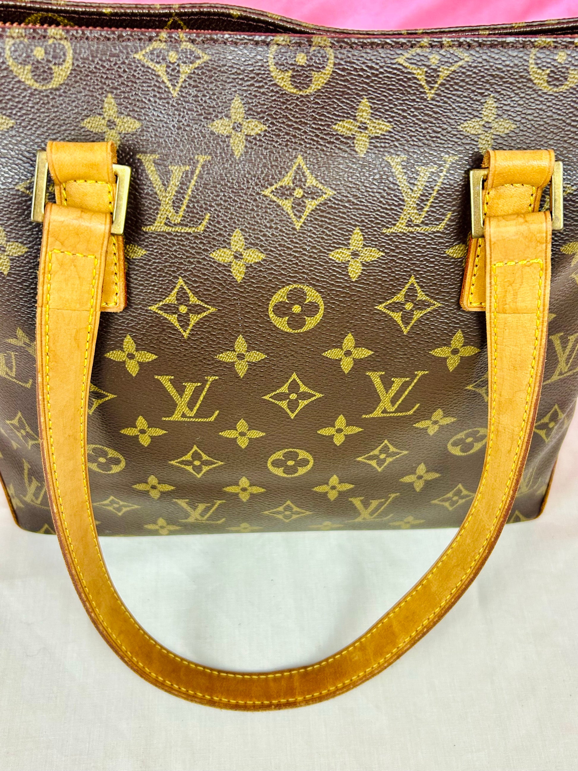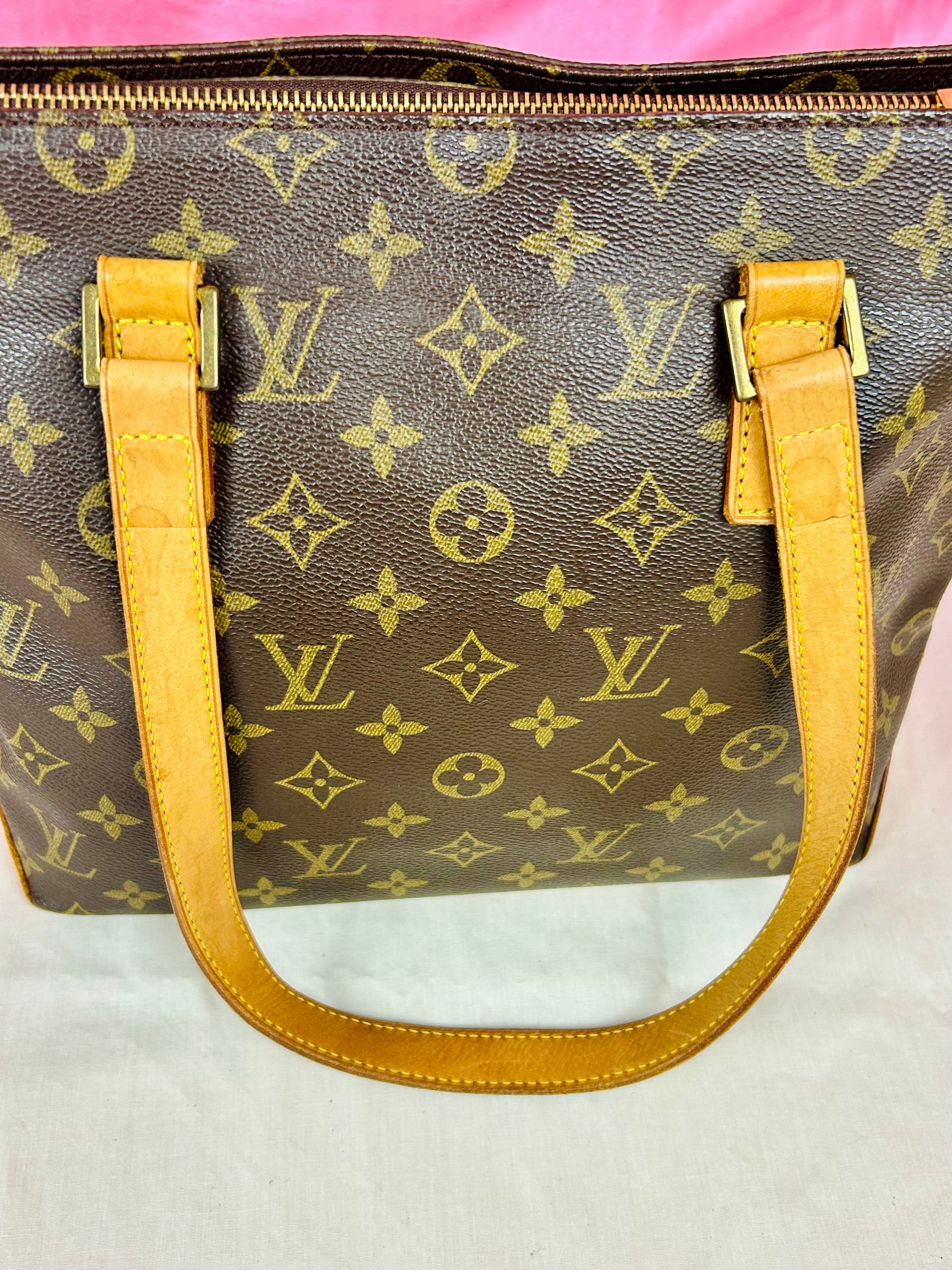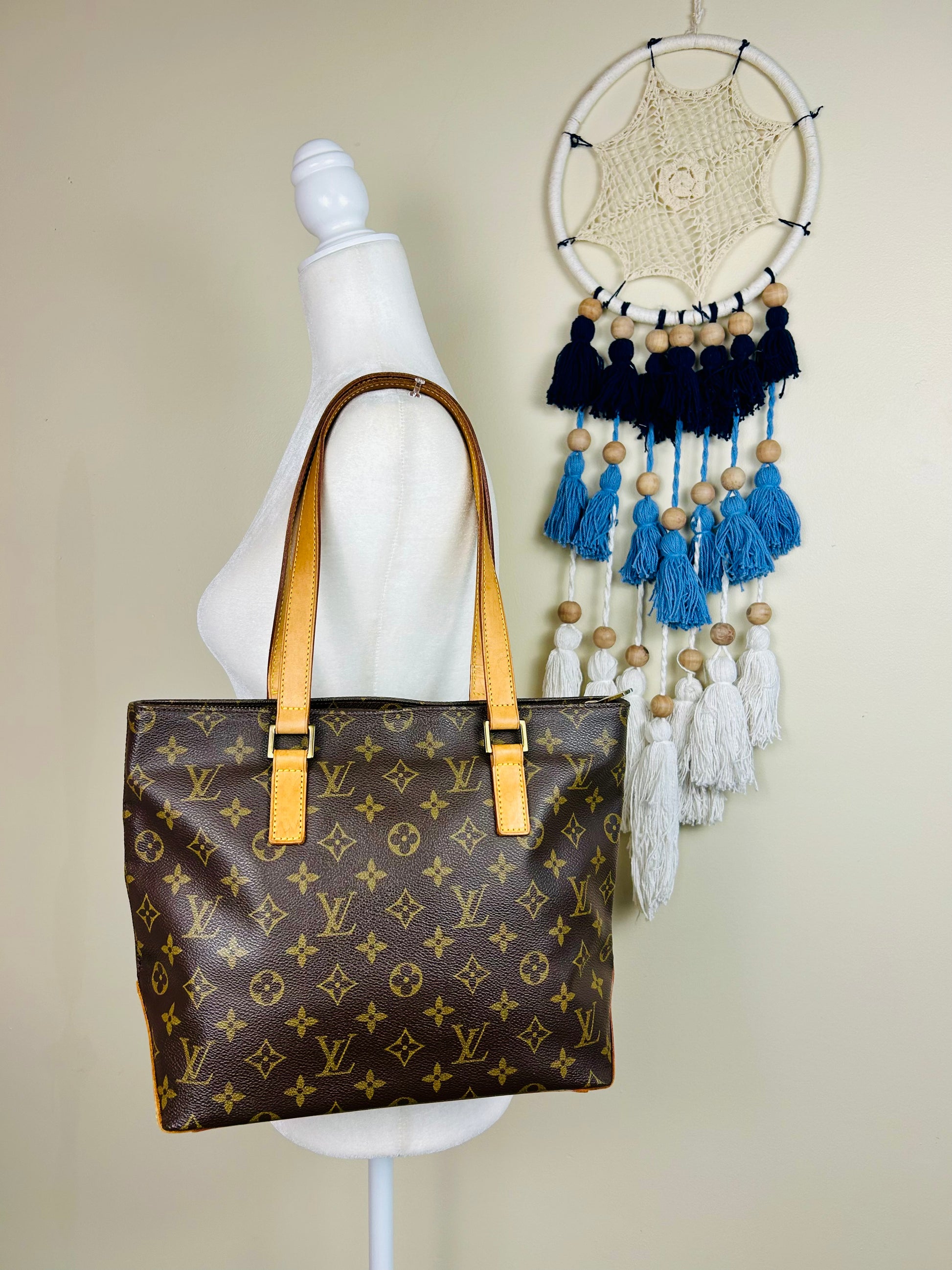 š Description: This Cabas Piano is the smallest of the Cabas models but still has enough room for all your essentials, it's perfect for daily wear. The canvas is in beautiful condition, maintaining its vibrant monogram print. Hairline scratch on the canvas noted in the pictures. No crackings in the corner near the zipper! The leather has an even honey patina with some markings on the bottom and sides. The chapes are in excellent condition, and the handles show minimal wear with some markings and wear consistent with normal usage, no cracks or tears. The zipper pullers are gold and work properly. Interior and pocket are clean. A fantastic everyday luxury bag!