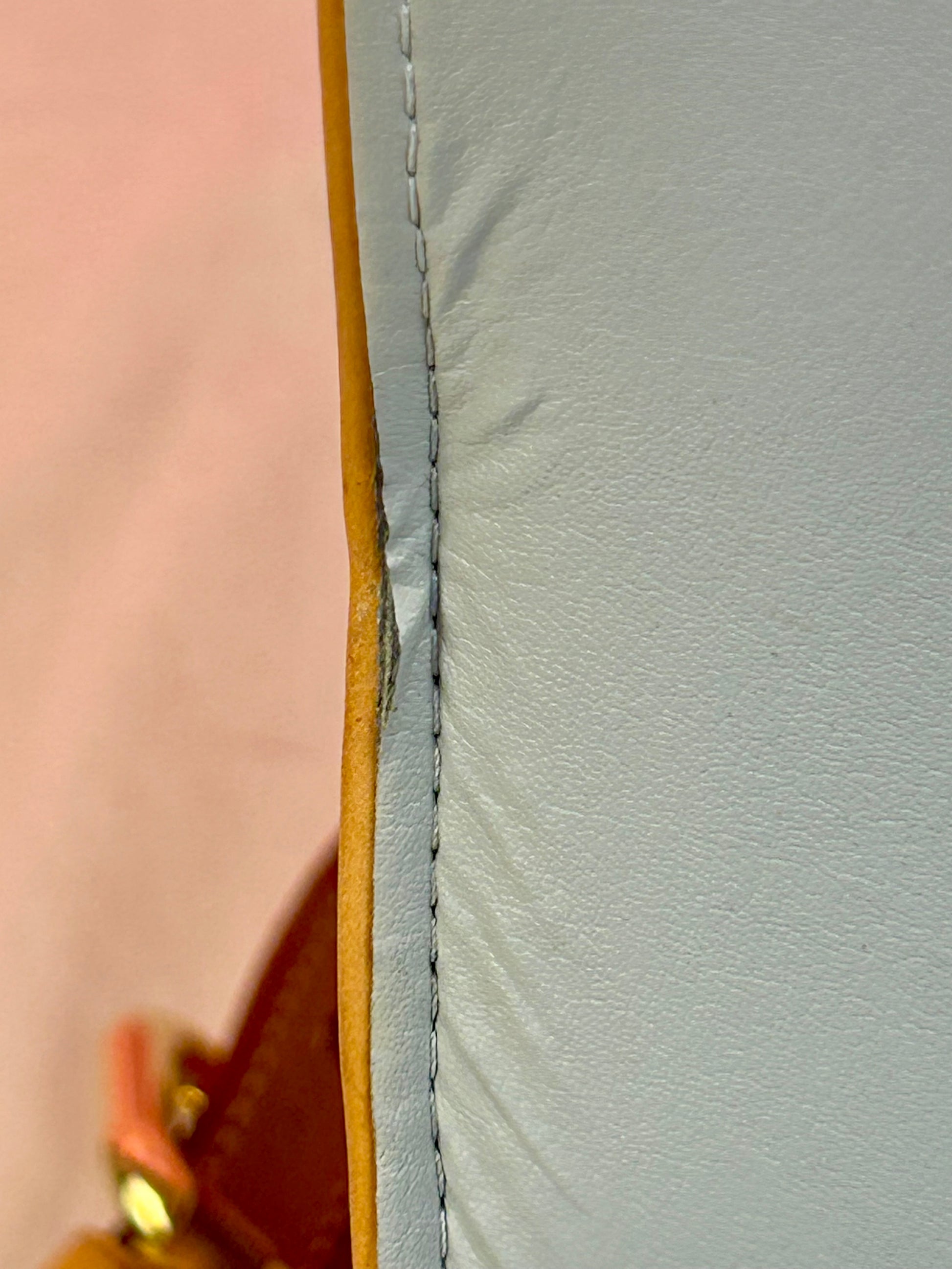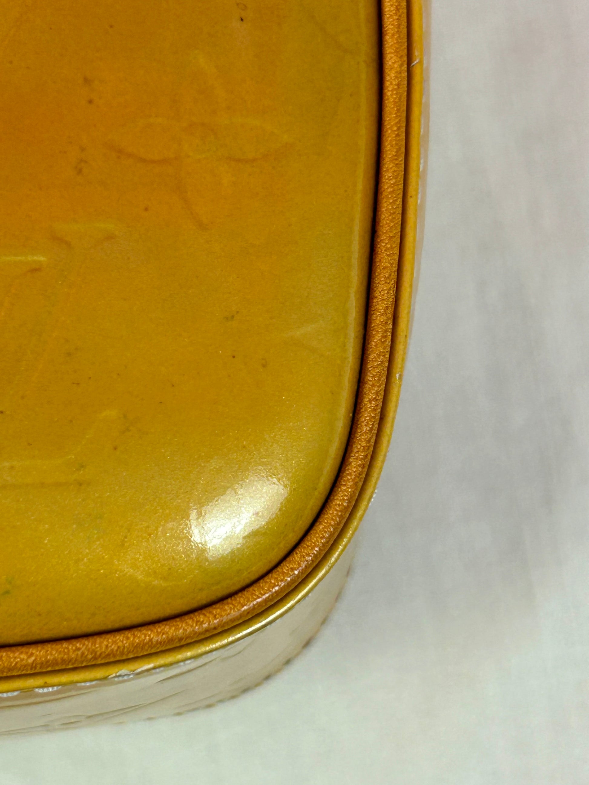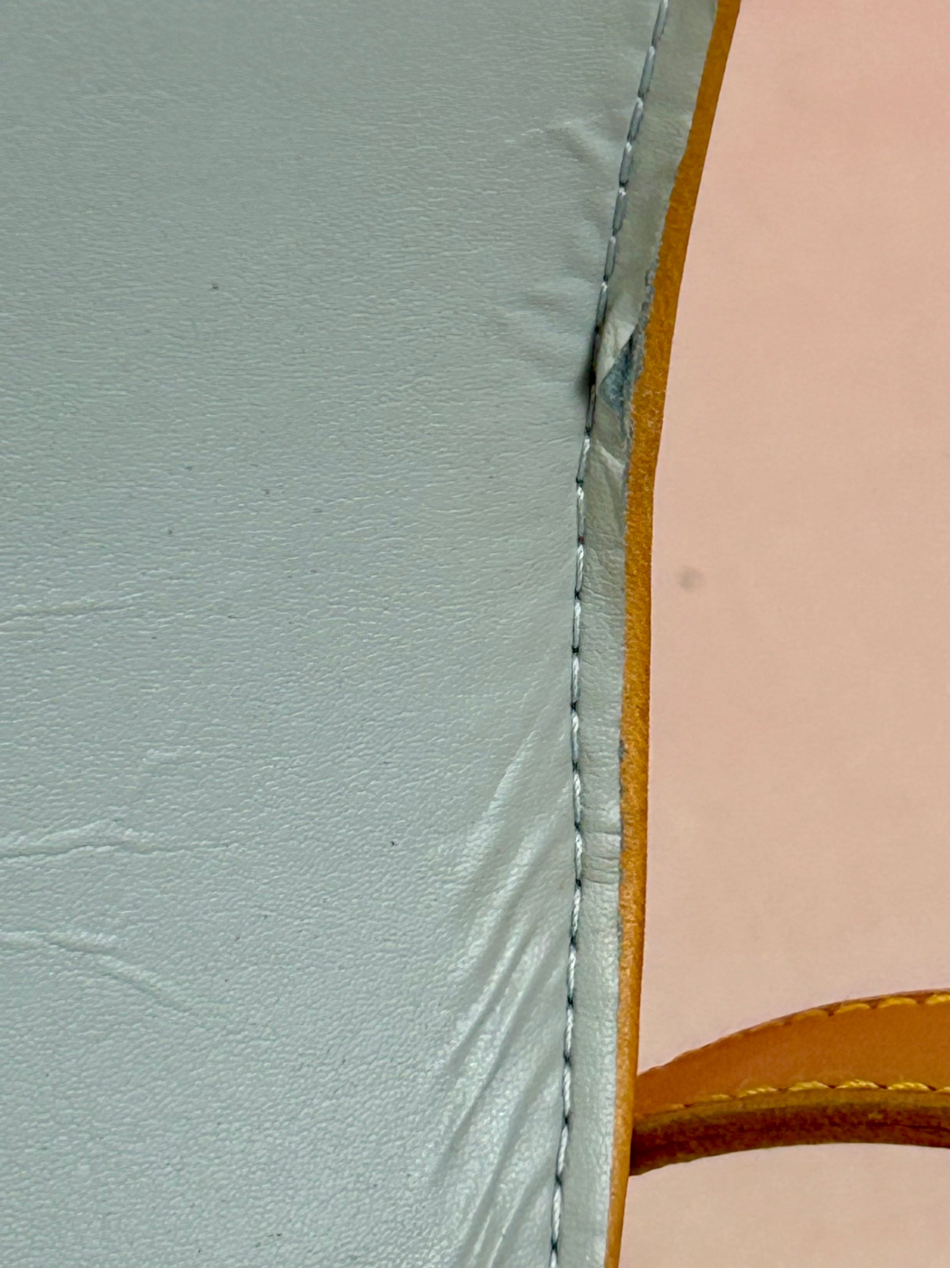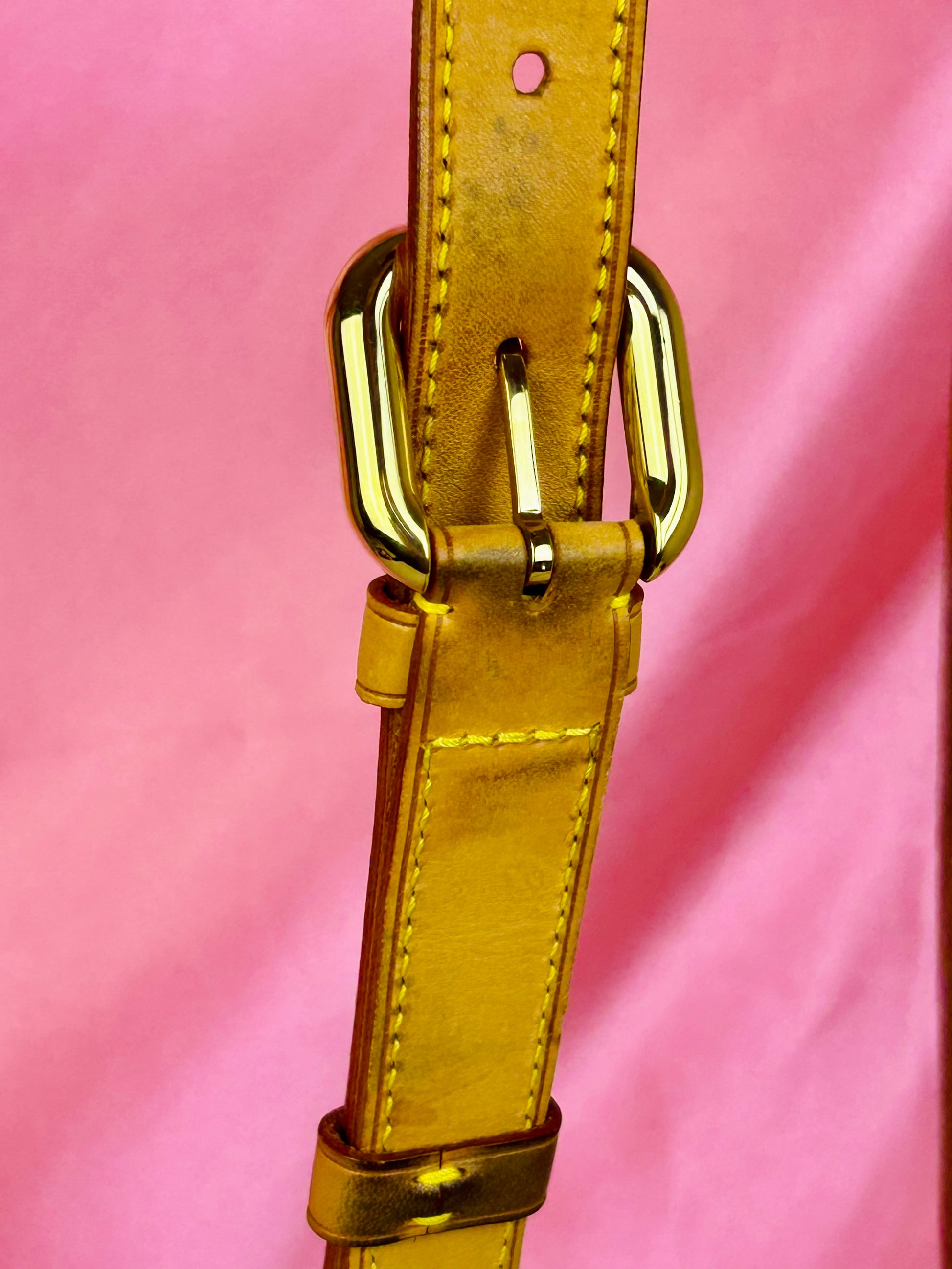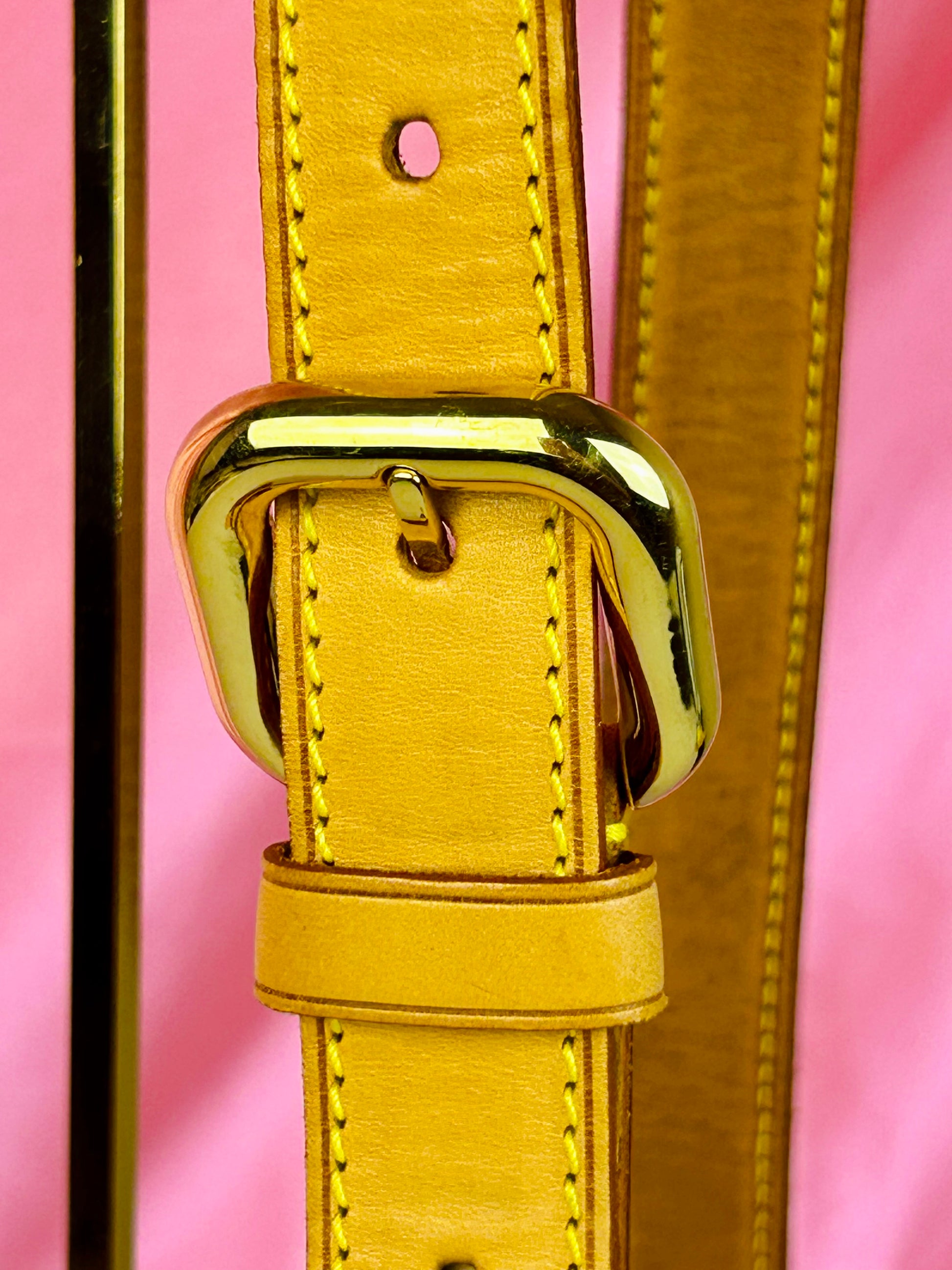 💜 Description: Vernis canvas is in beautiful shape with some discoloration throughout—one main spot on the back and s color transter on the front. Piping remains in excellent condition. Leather strap is in great condition with some watermarks and markings on the underside, but no cracks or tears. Chapes are strong and fully intact. Buckle is in excellent condition. Hardware is gold and shiny. Interior and pockets are very clean with minimal signs of wear.