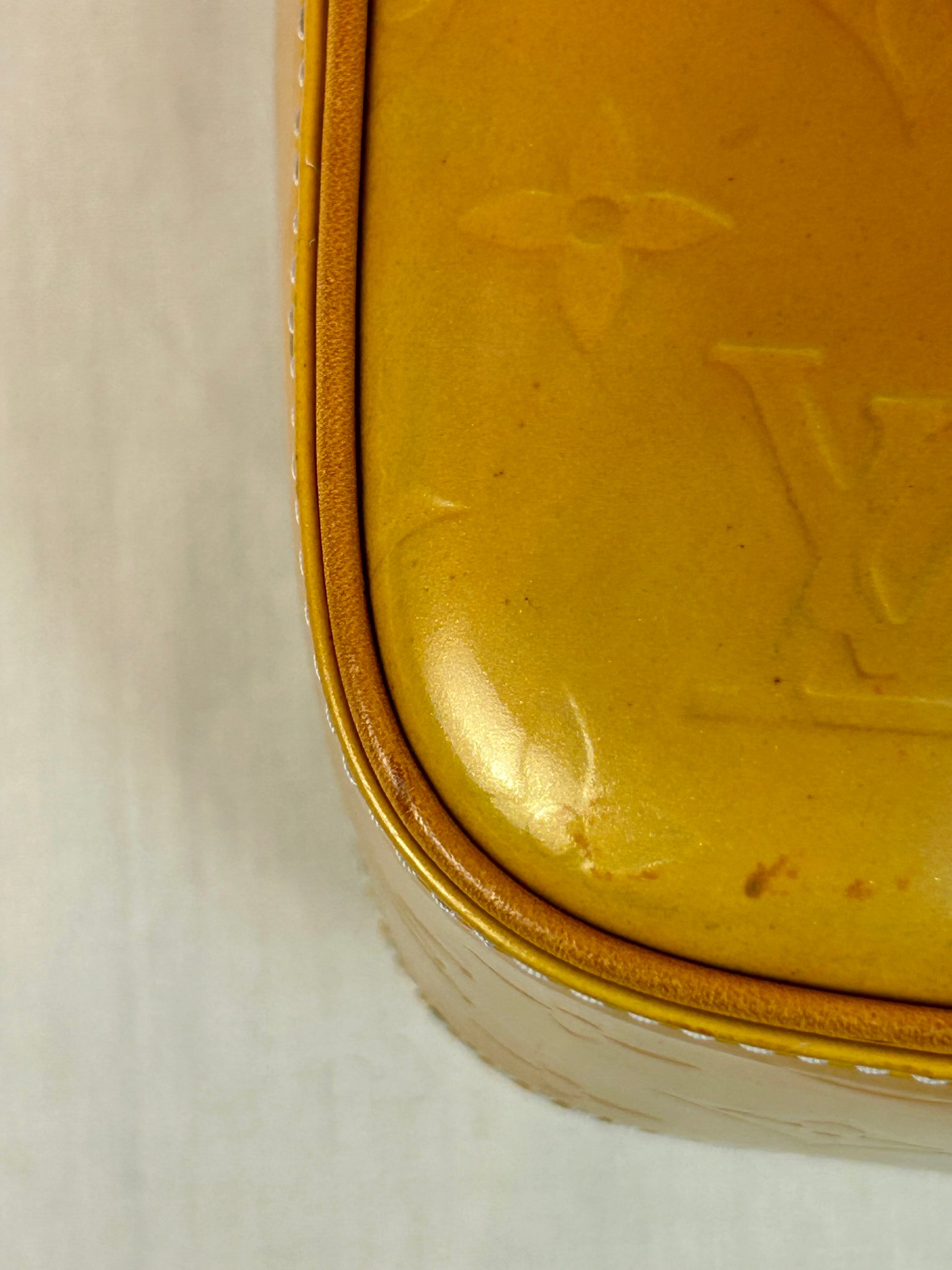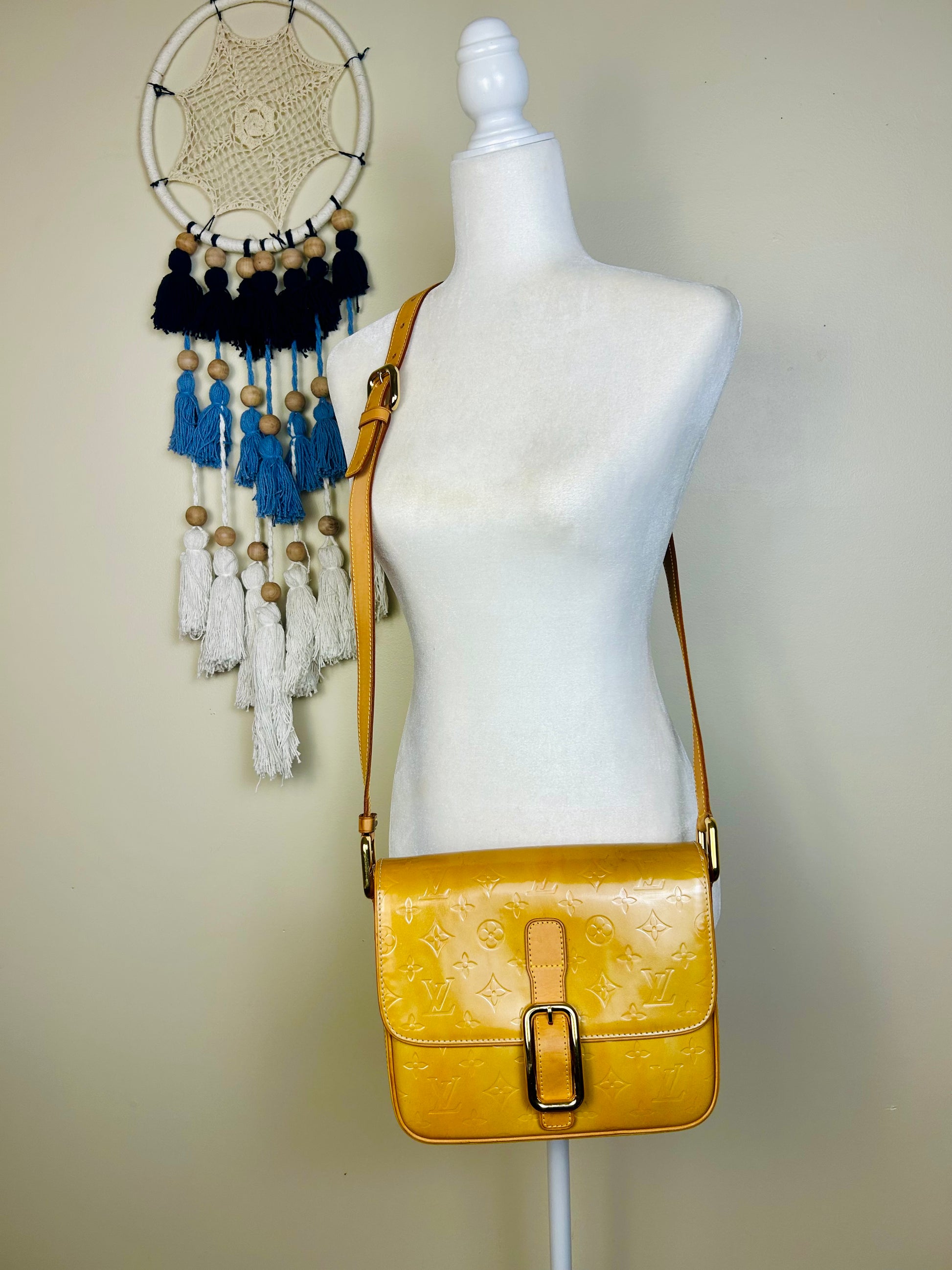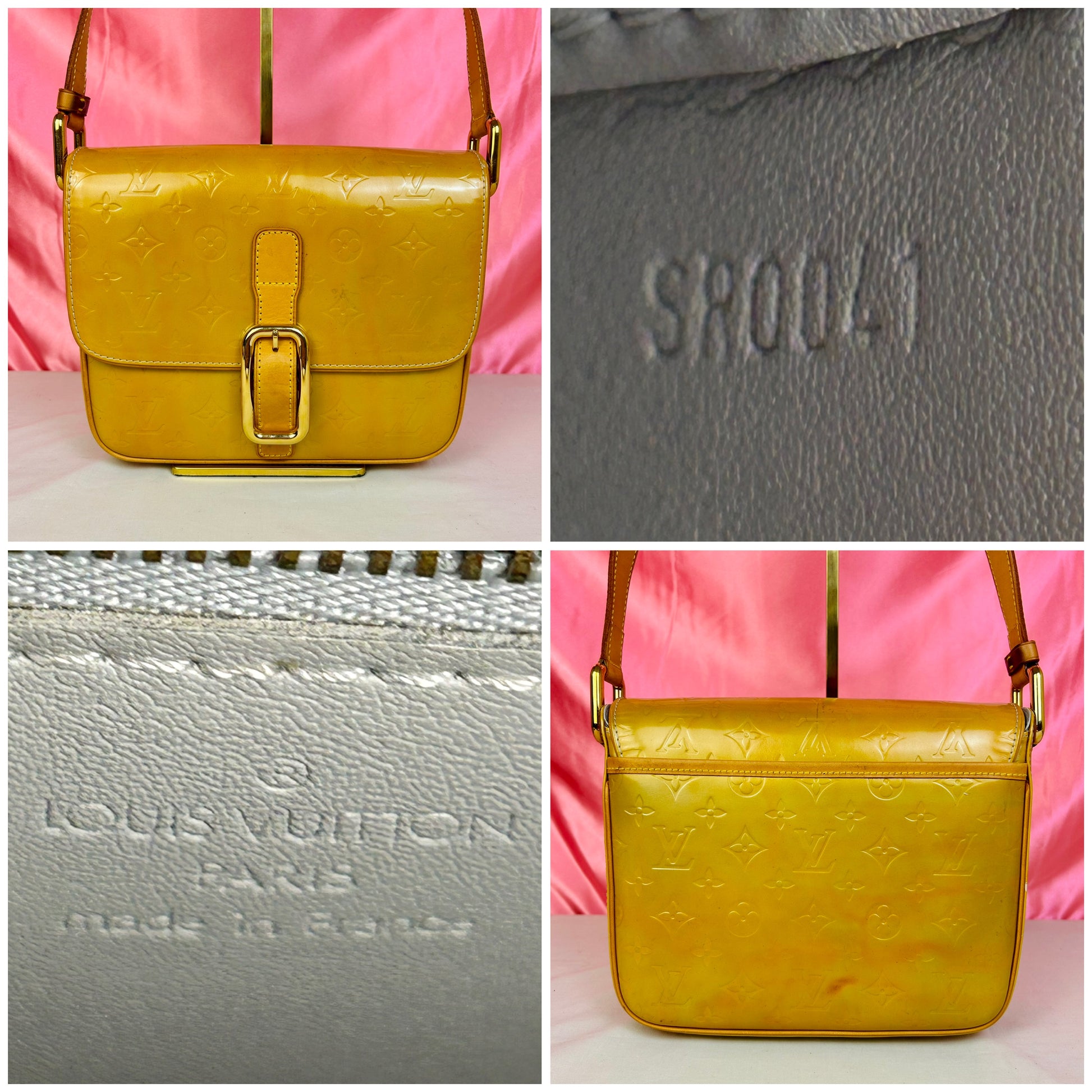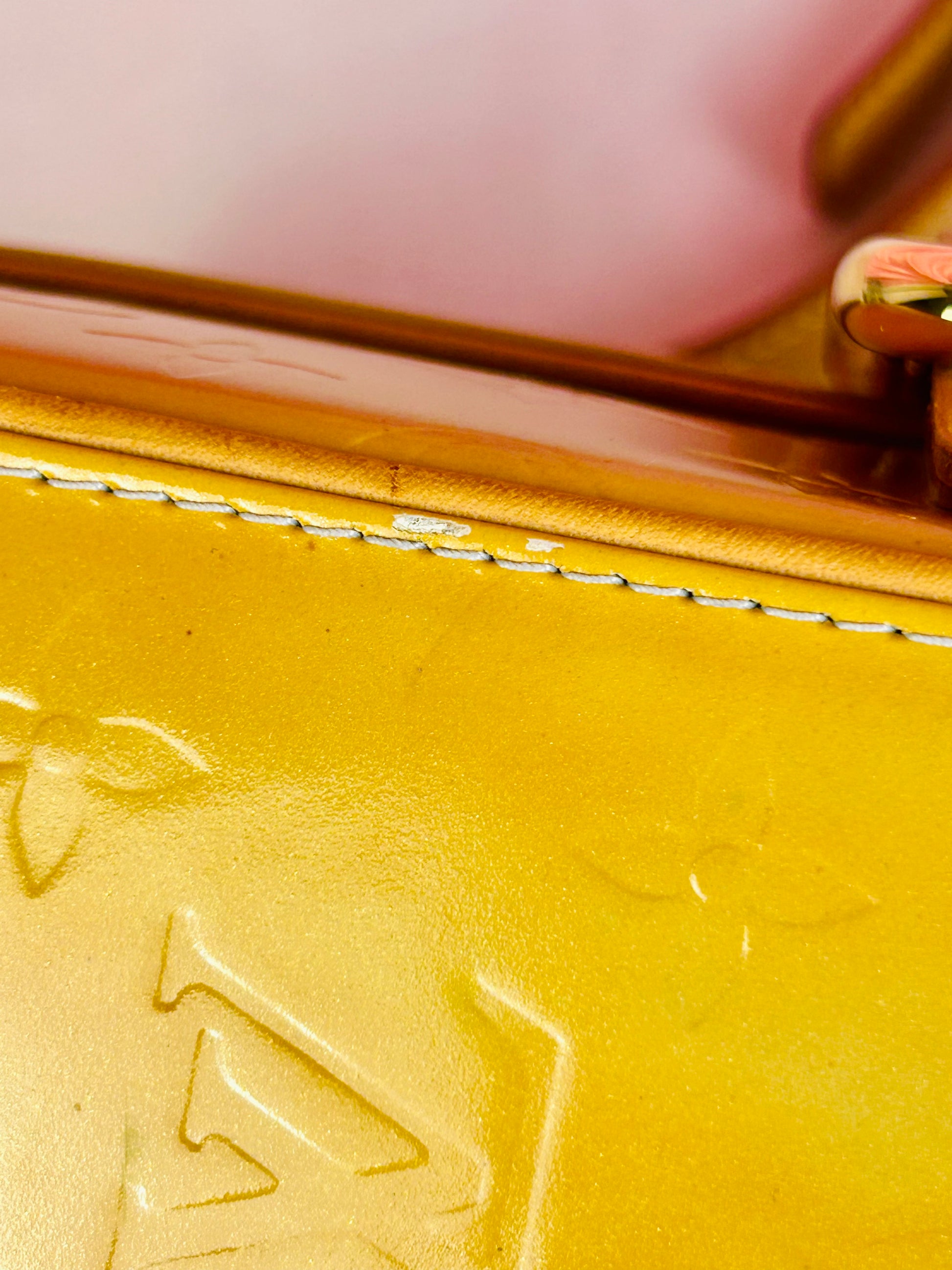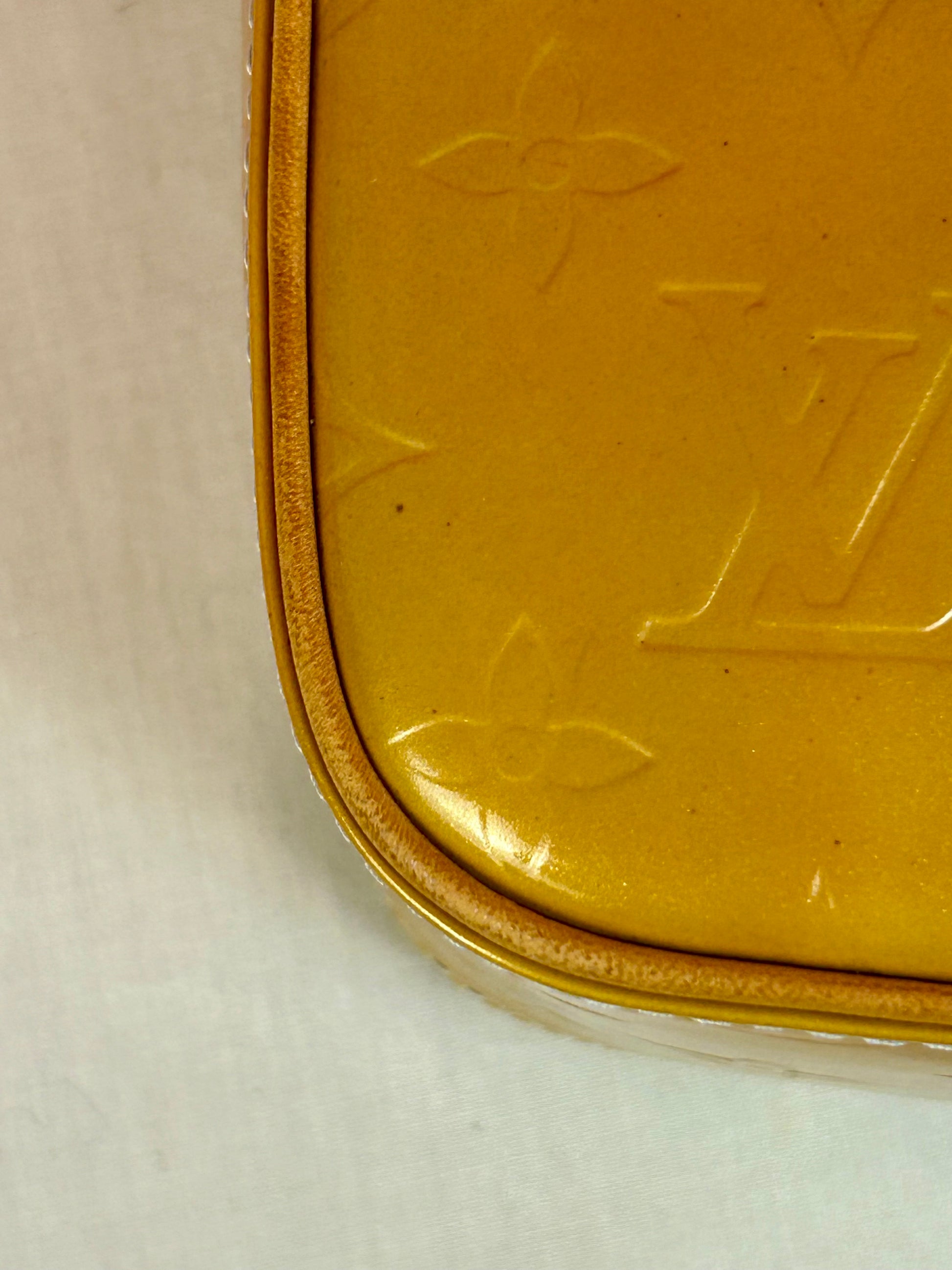 💜 Description: Vernis canvas is in beautiful shape with some discoloration throughout—one main spot on the back and s color transter on the front. Piping remains in excellent condition. Leather strap is in great condition with some watermarks and markings on the underside, but no cracks or tears. Chapes are strong and fully intact. Buckle is in excellent condition. Hardware is gold and shiny. Interior and pockets are very clean with minimal signs of wear.