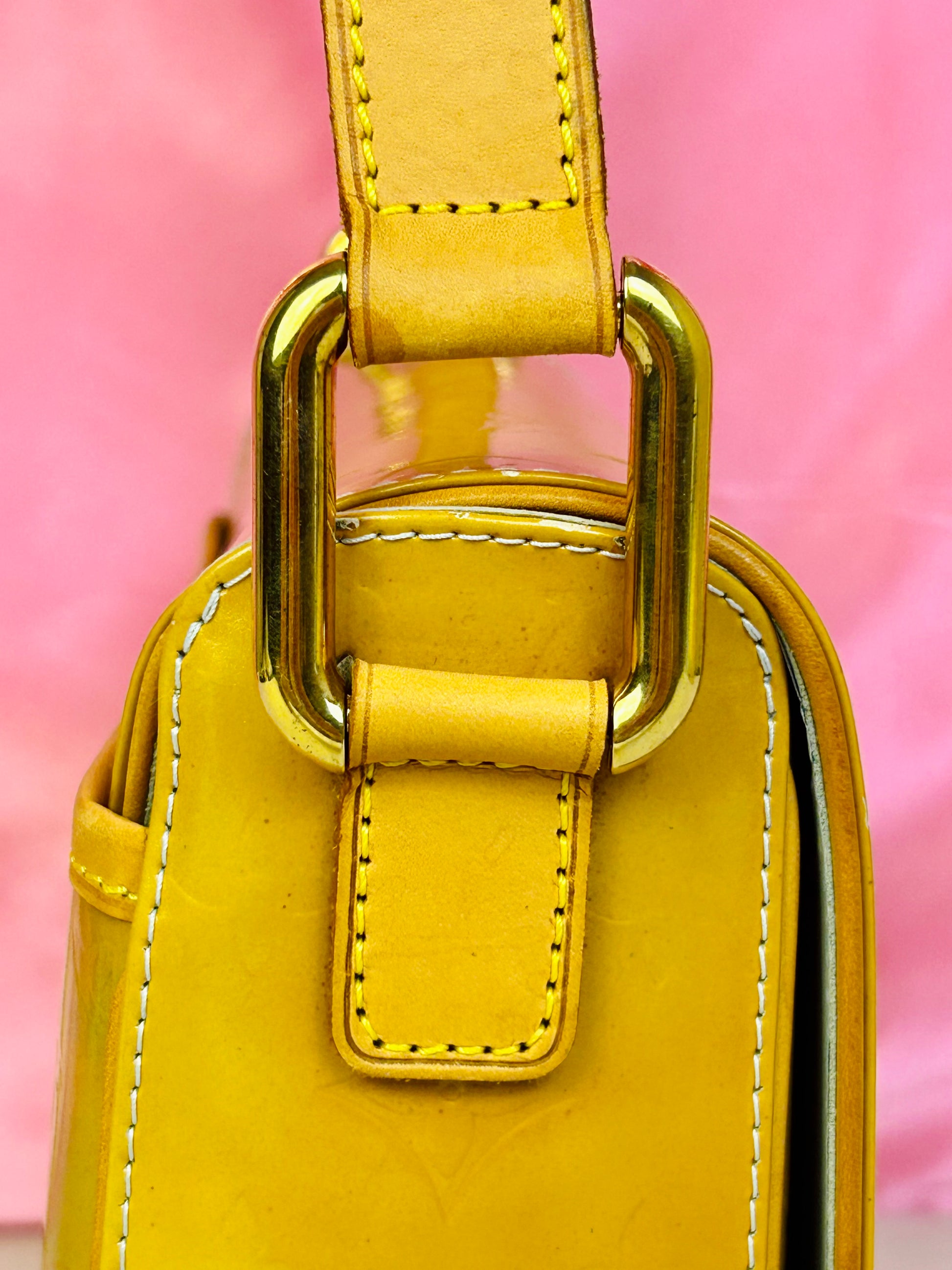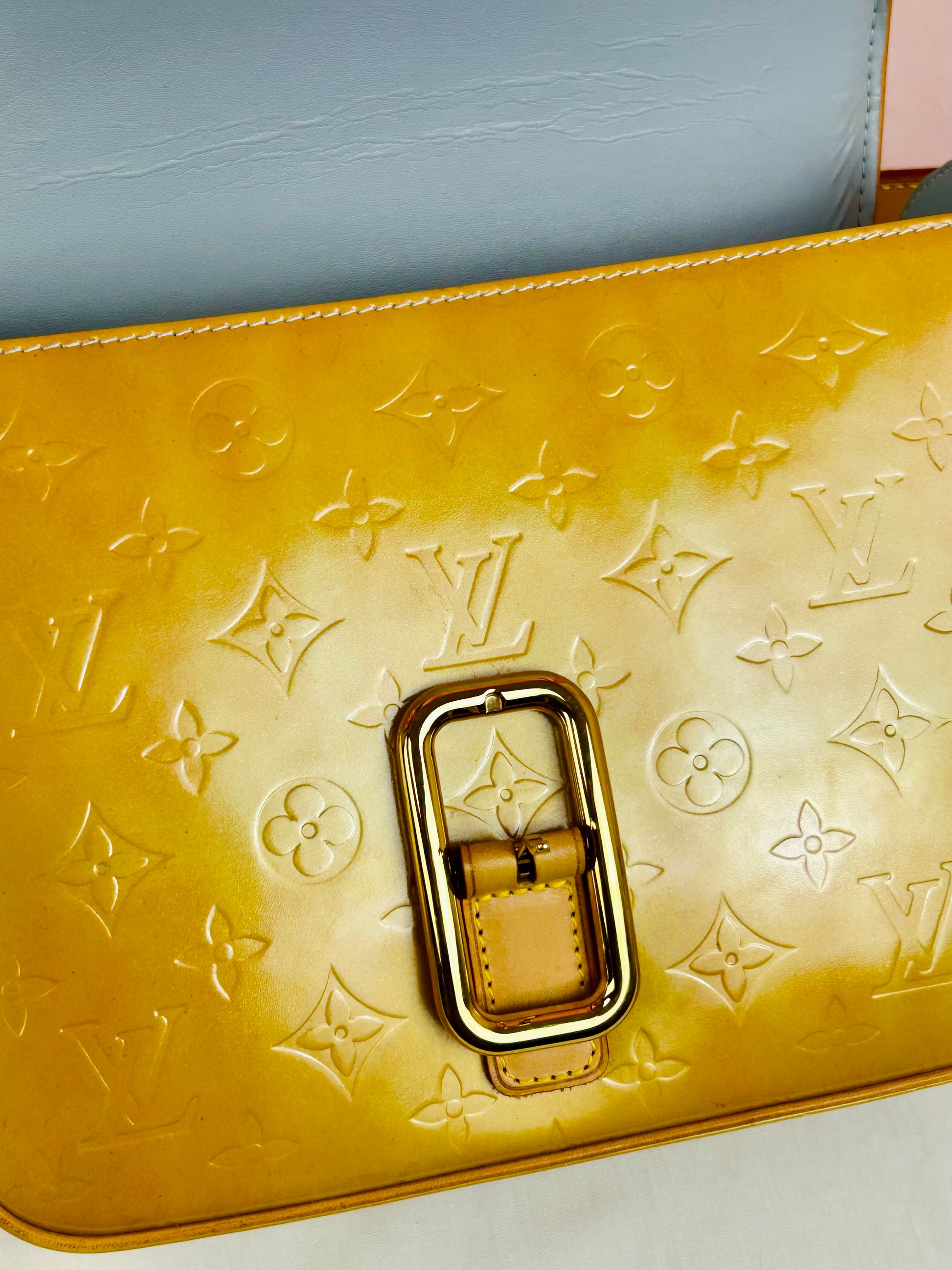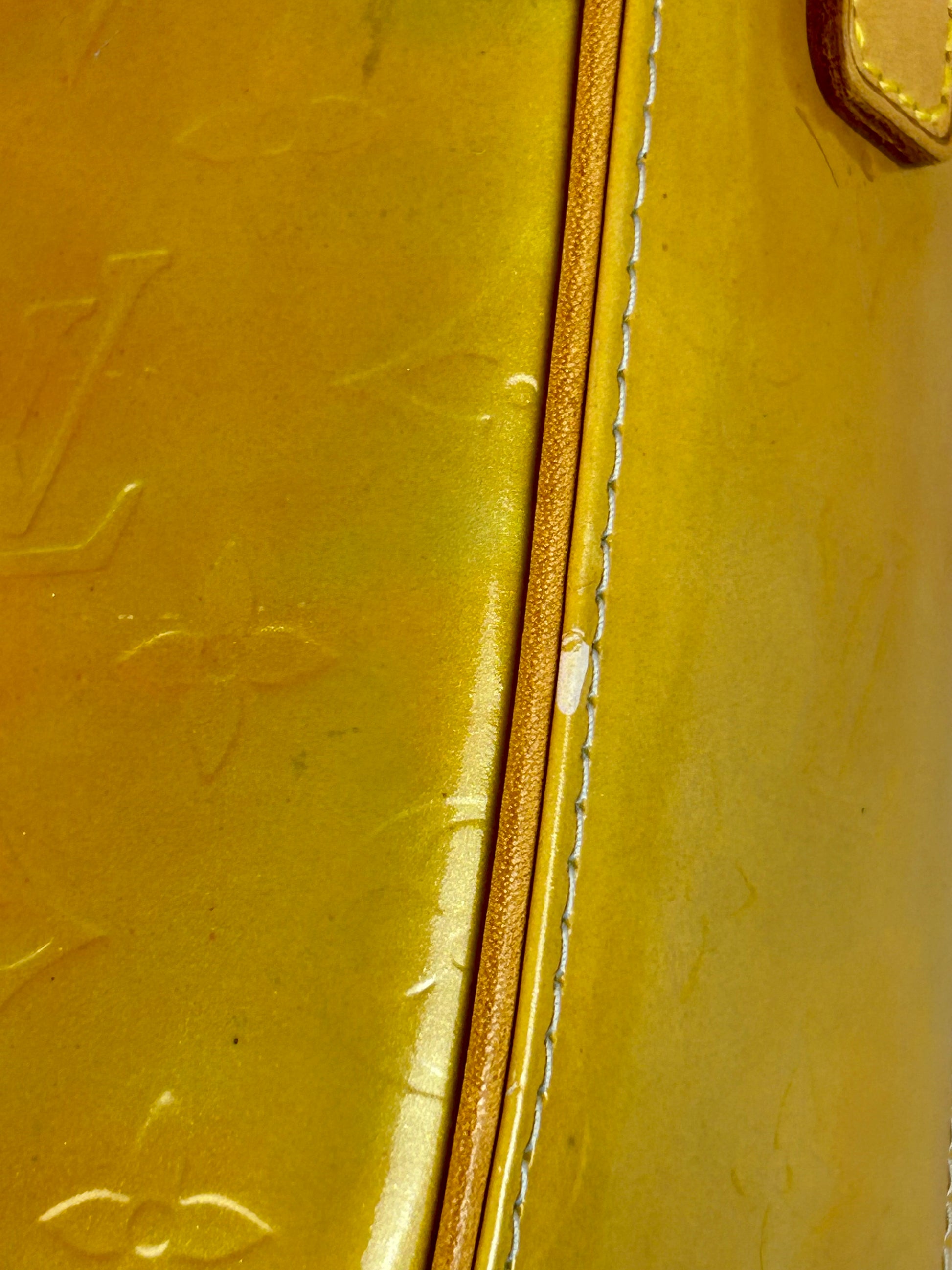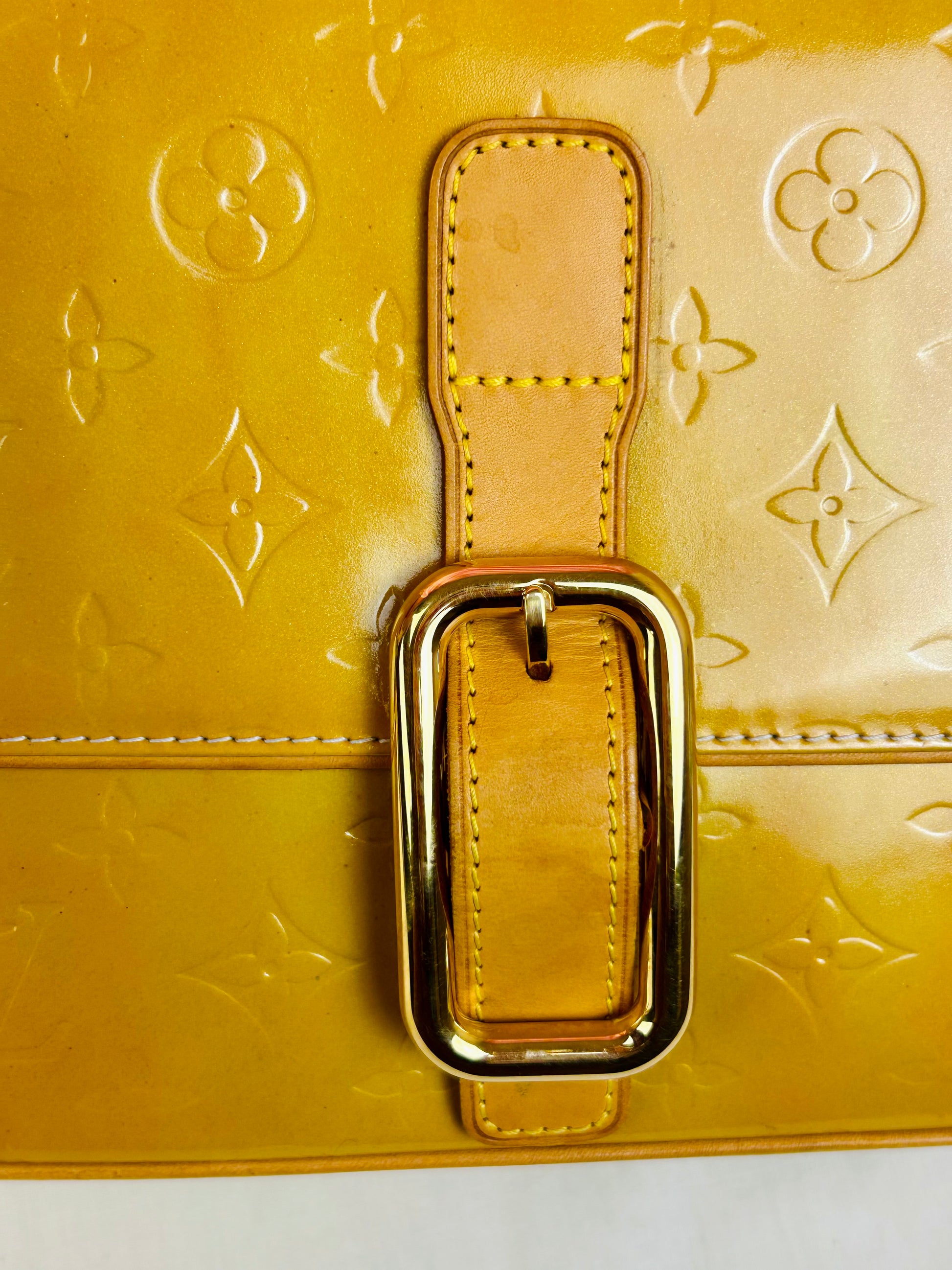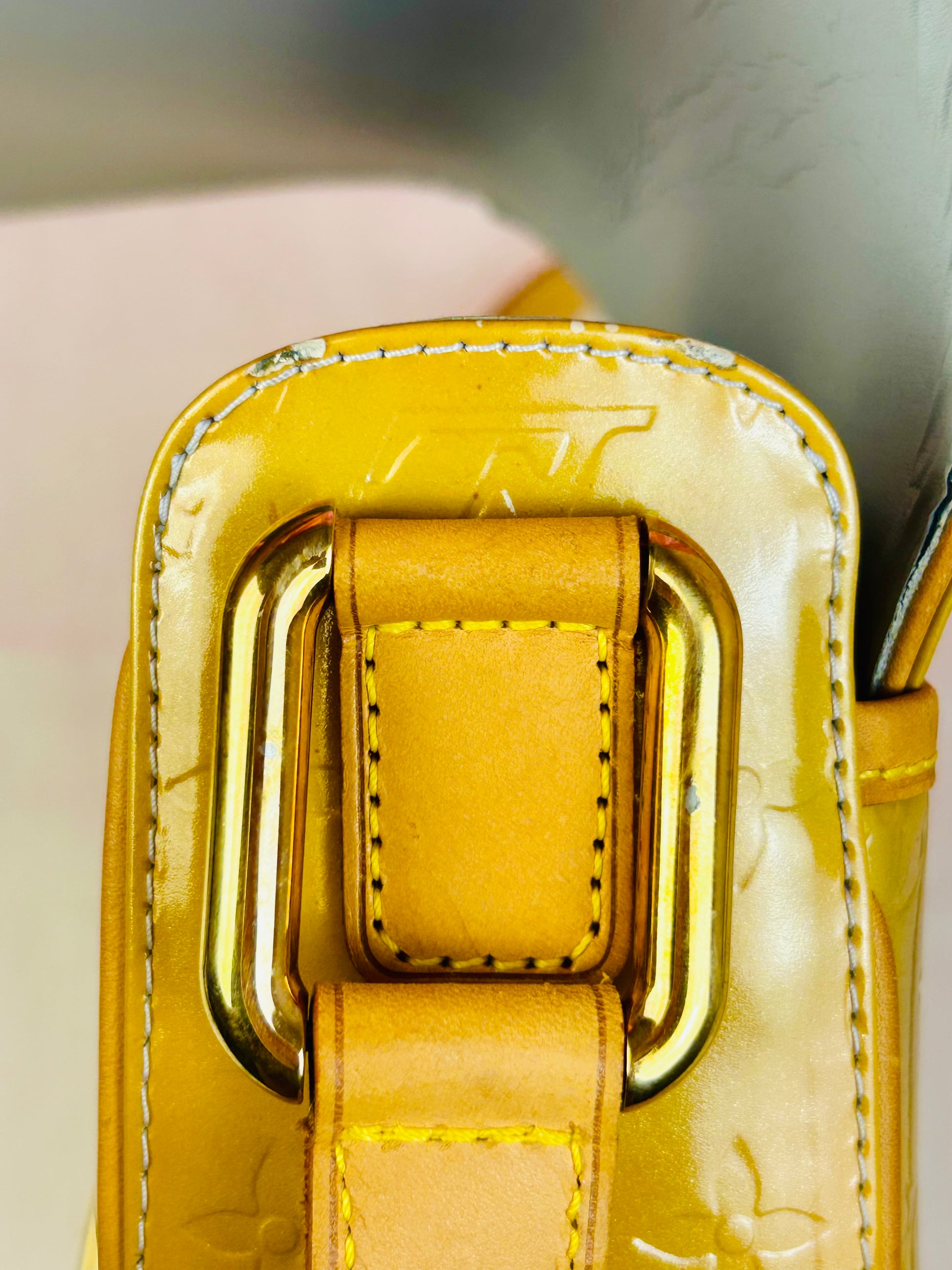 💜 Description: Vernis canvas is in beautiful shape with some discoloration throughout—one main spot on the back and s color transter on the front. Piping remains in excellent condition. Leather strap is in great condition with some watermarks and markings on the underside, but no cracks or tears. Chapes are strong and fully intact. Buckle is in excellent condition. Hardware is gold and shiny. Interior and pockets are very clean with minimal signs of wear.