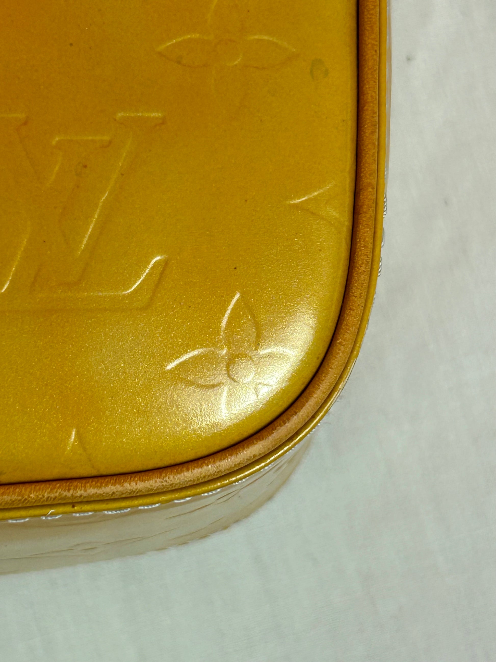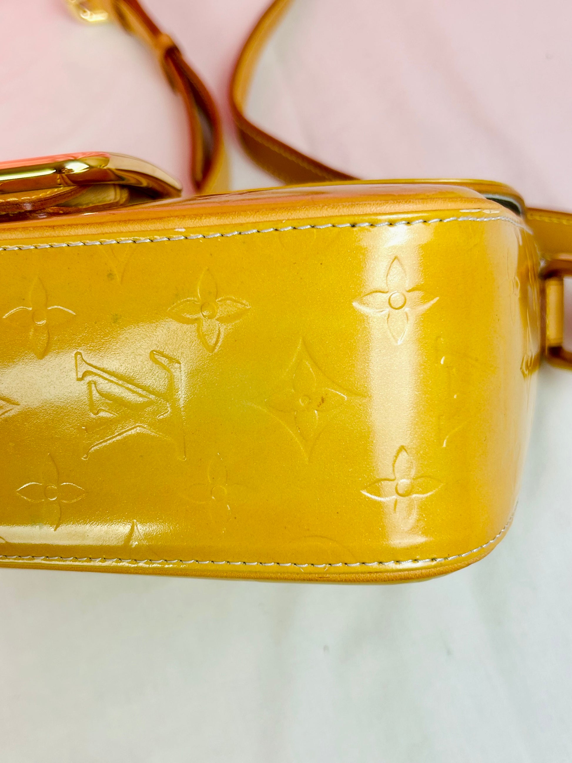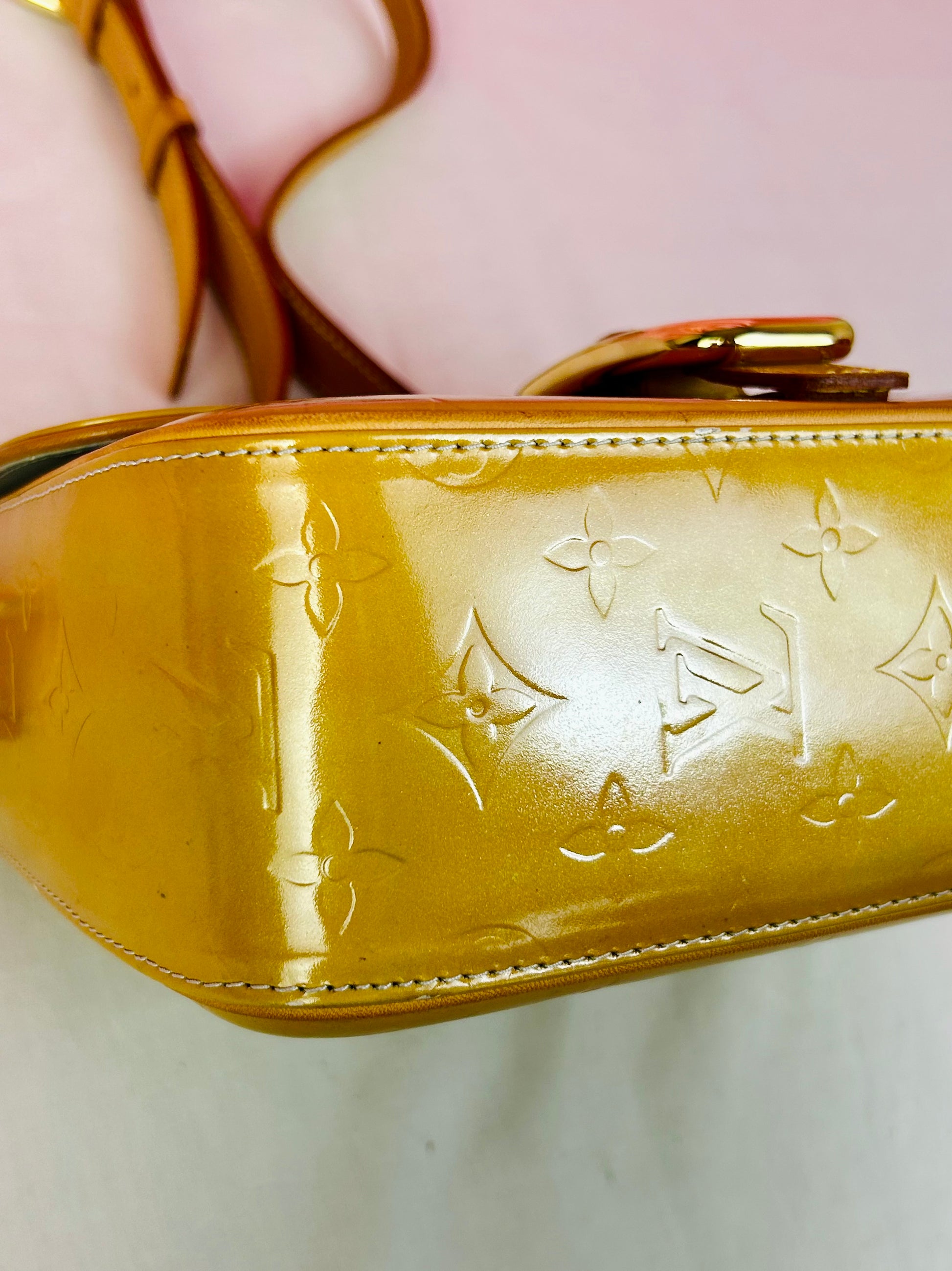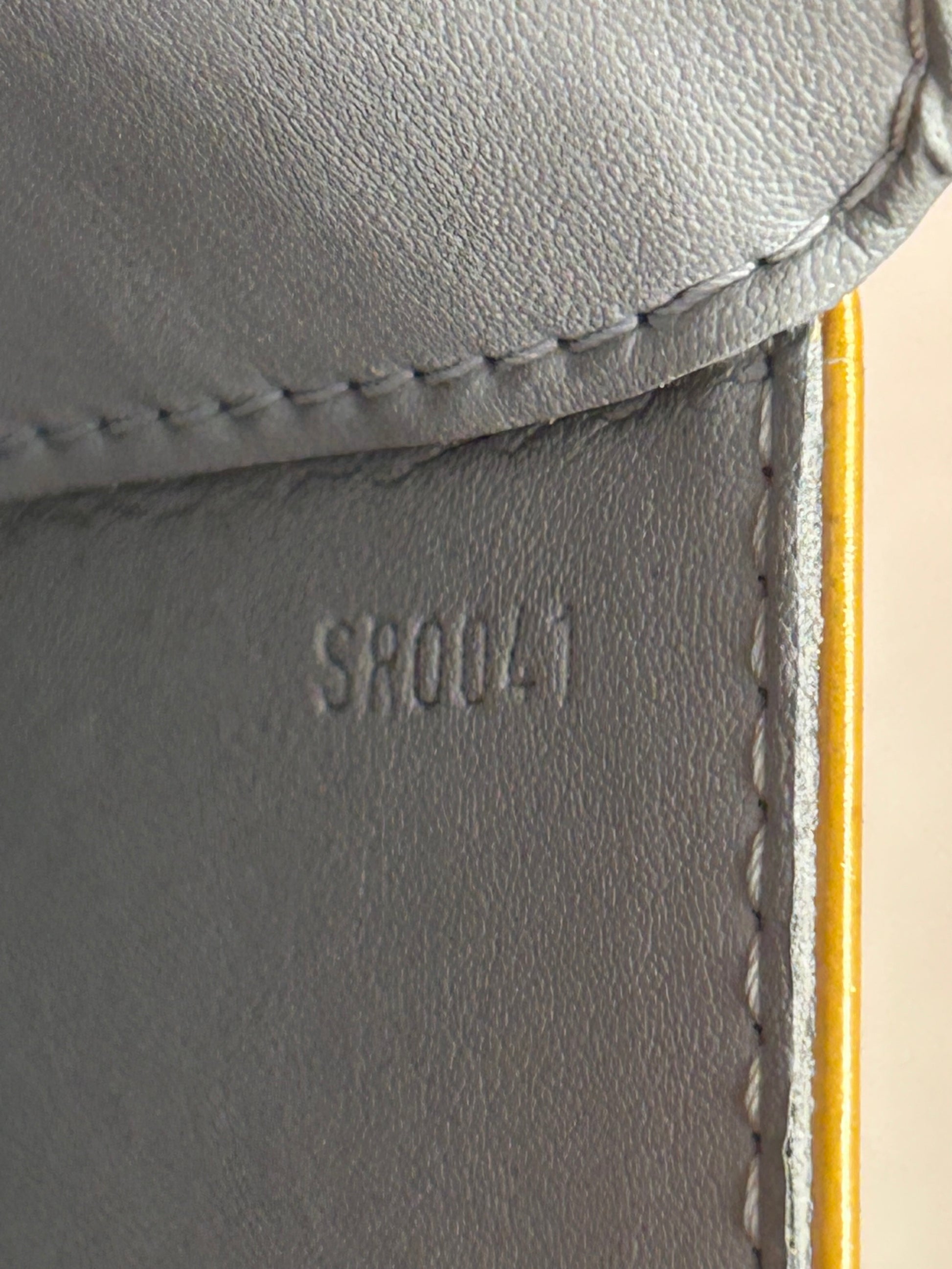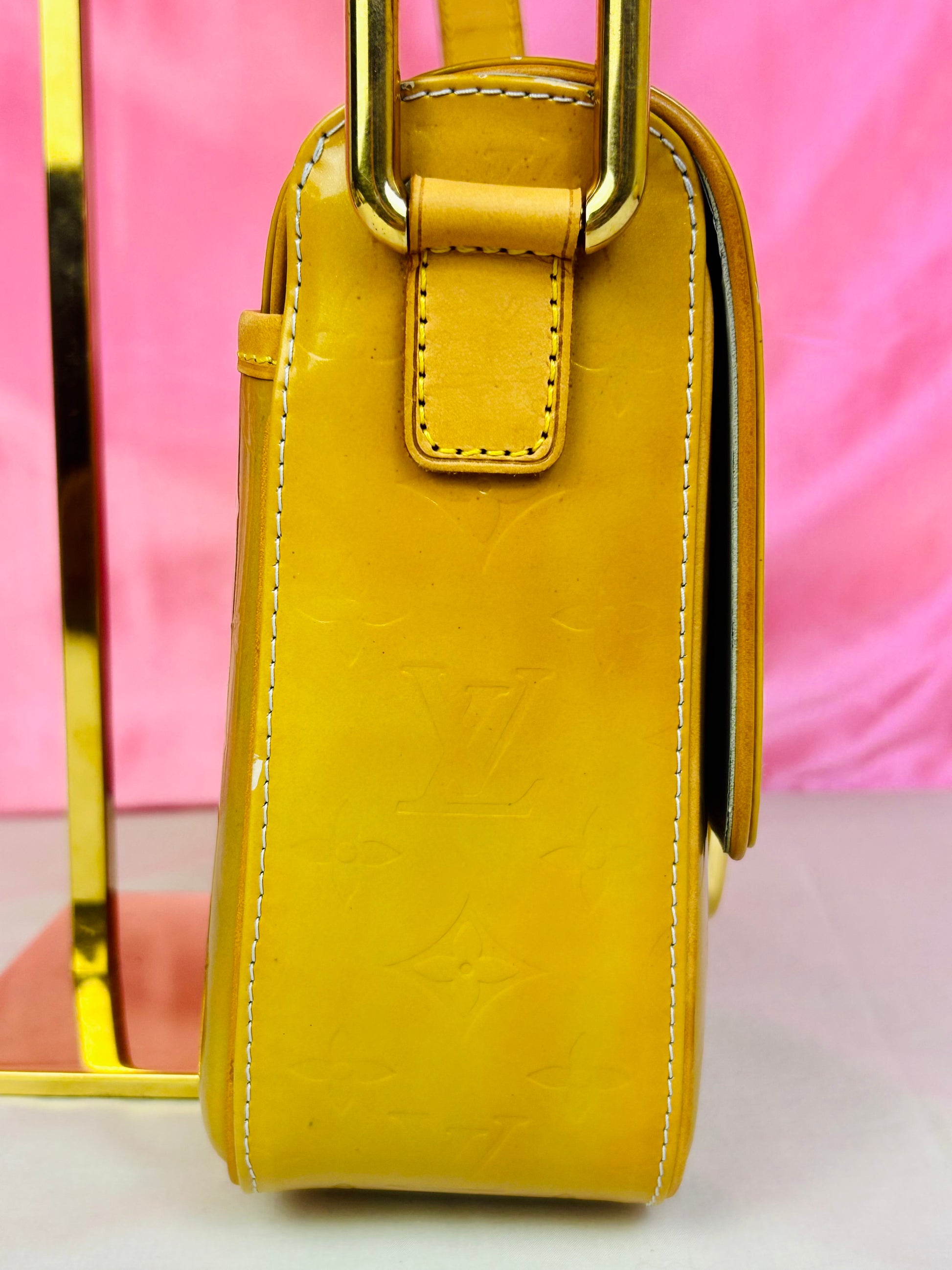 💜 Description: Vernis canvas is in beautiful shape with some discoloration throughout—one main spot on the back and s color transter on the front. Piping remains in excellent condition. Leather strap is in great condition with some watermarks and markings on the underside, but no cracks or tears. Chapes are strong and fully intact. Buckle is in excellent condition. Hardware is gold and shiny. Interior and pockets are very clean with minimal signs of wear.