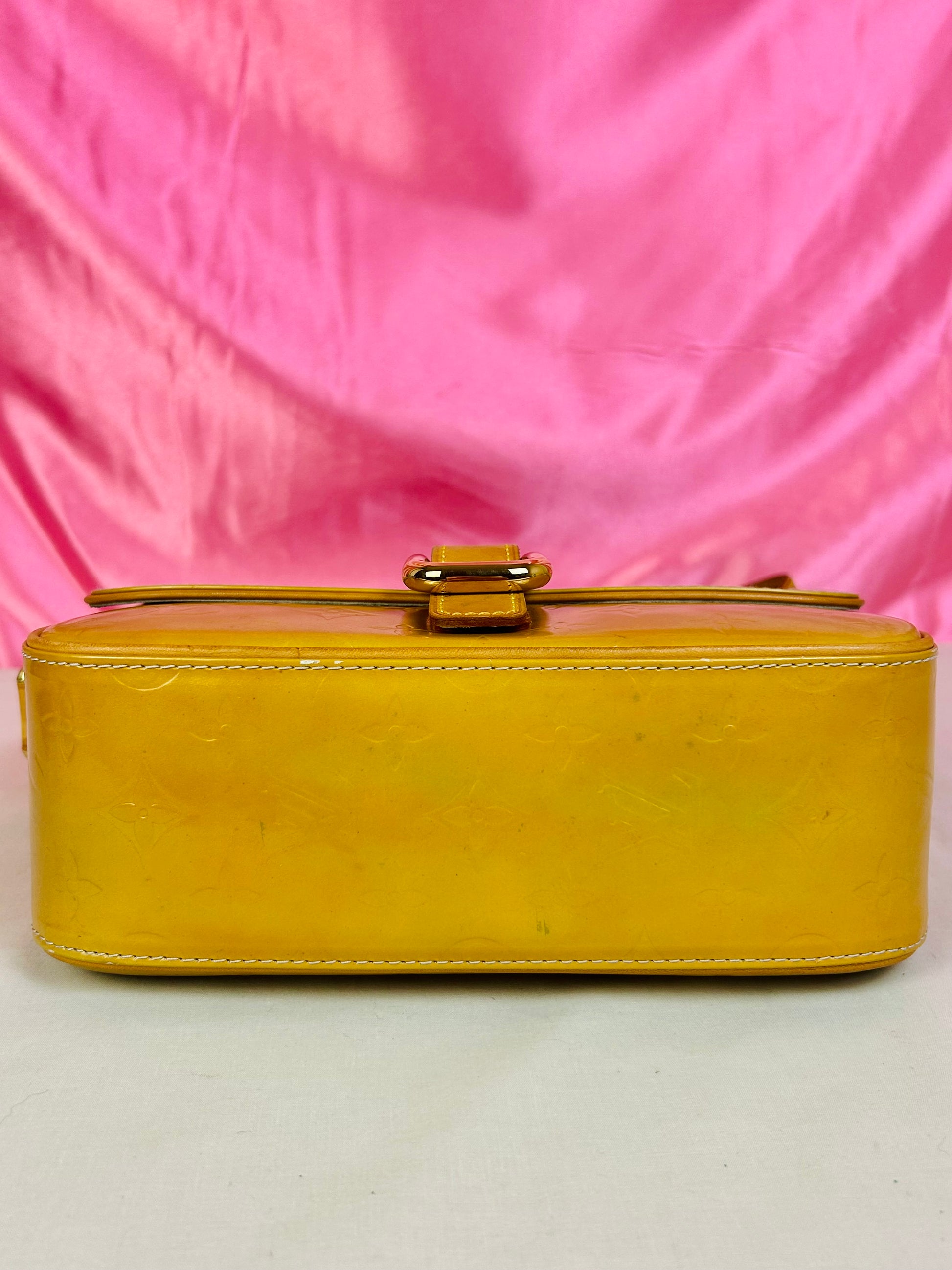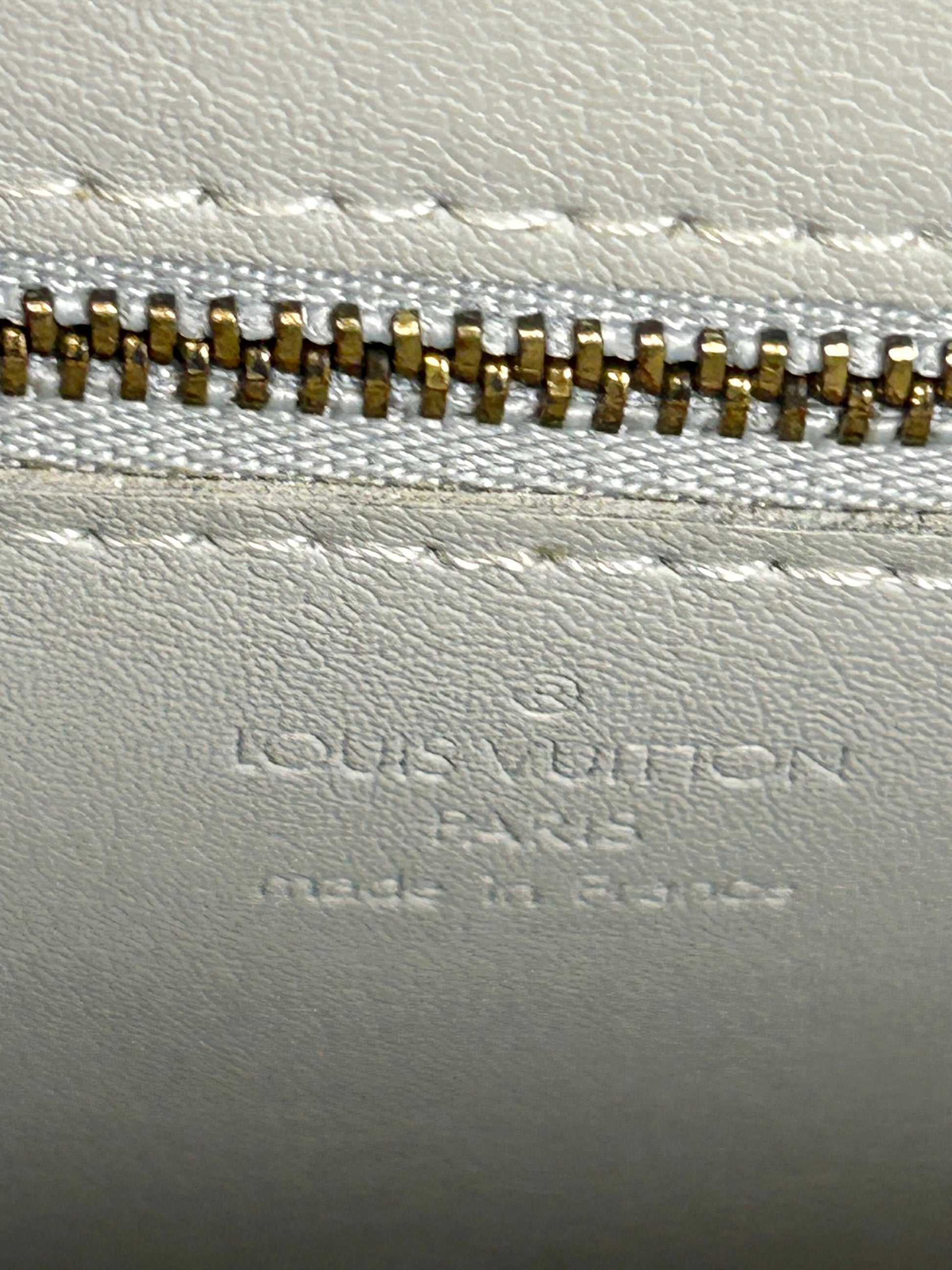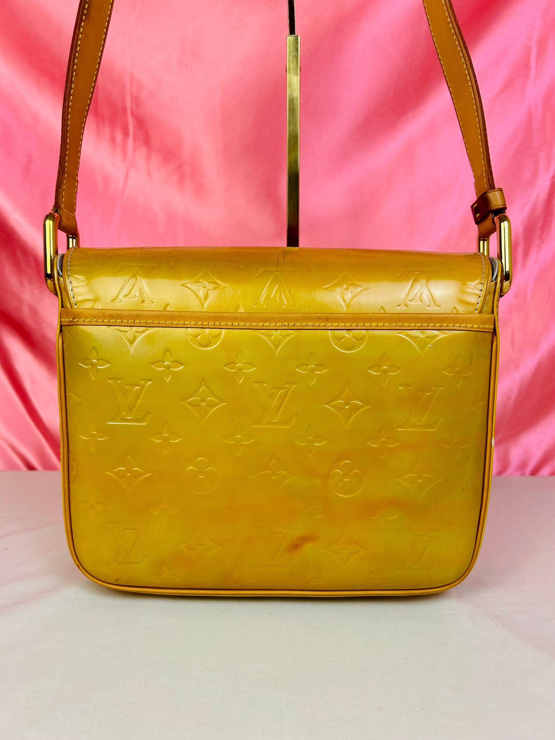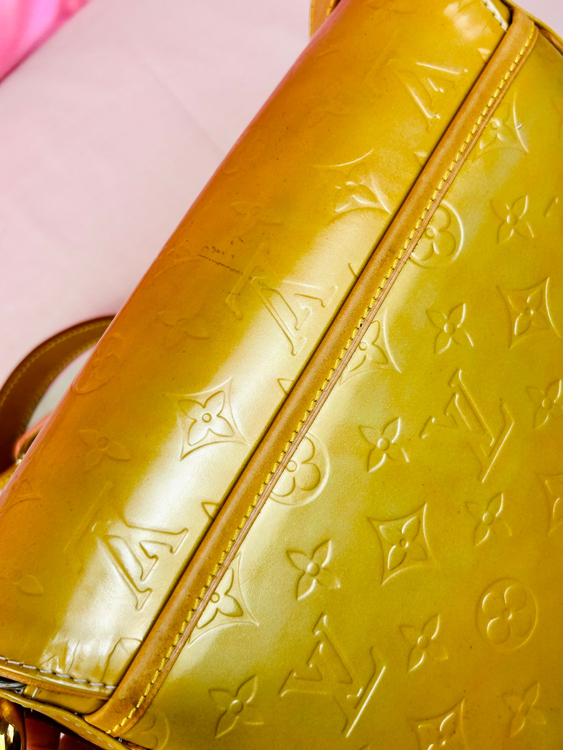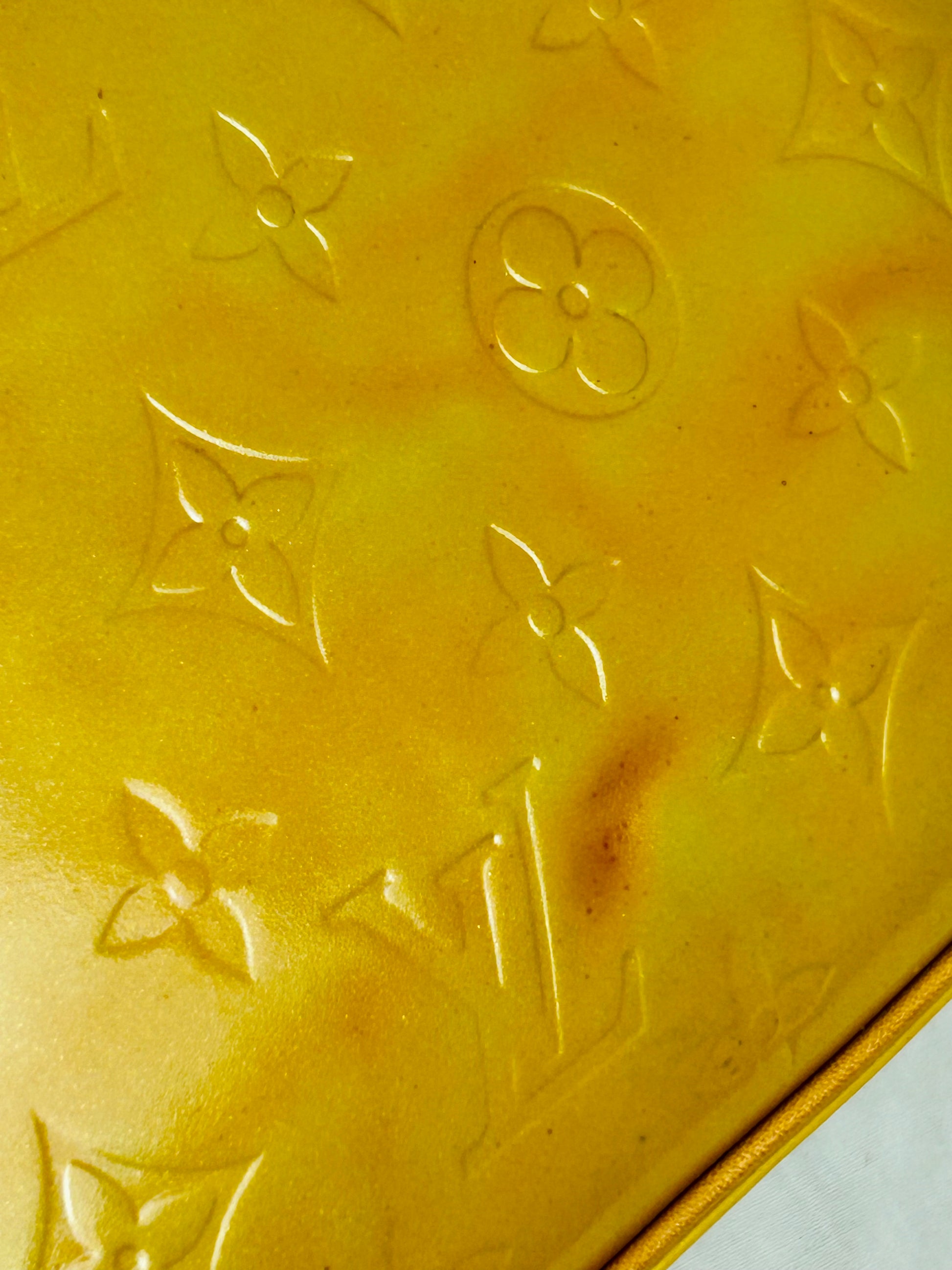 💜 Description: Vernis canvas is in beautiful shape with some discoloration throughout—one main spot on the back and s color transter on the front. Piping remains in excellent condition. Leather strap is in great condition with some watermarks and markings on the underside, but no cracks or tears. Chapes are strong and fully intact. Buckle is in excellent condition. Hardware is gold and shiny. Interior and pockets are very clean with minimal signs of wear.