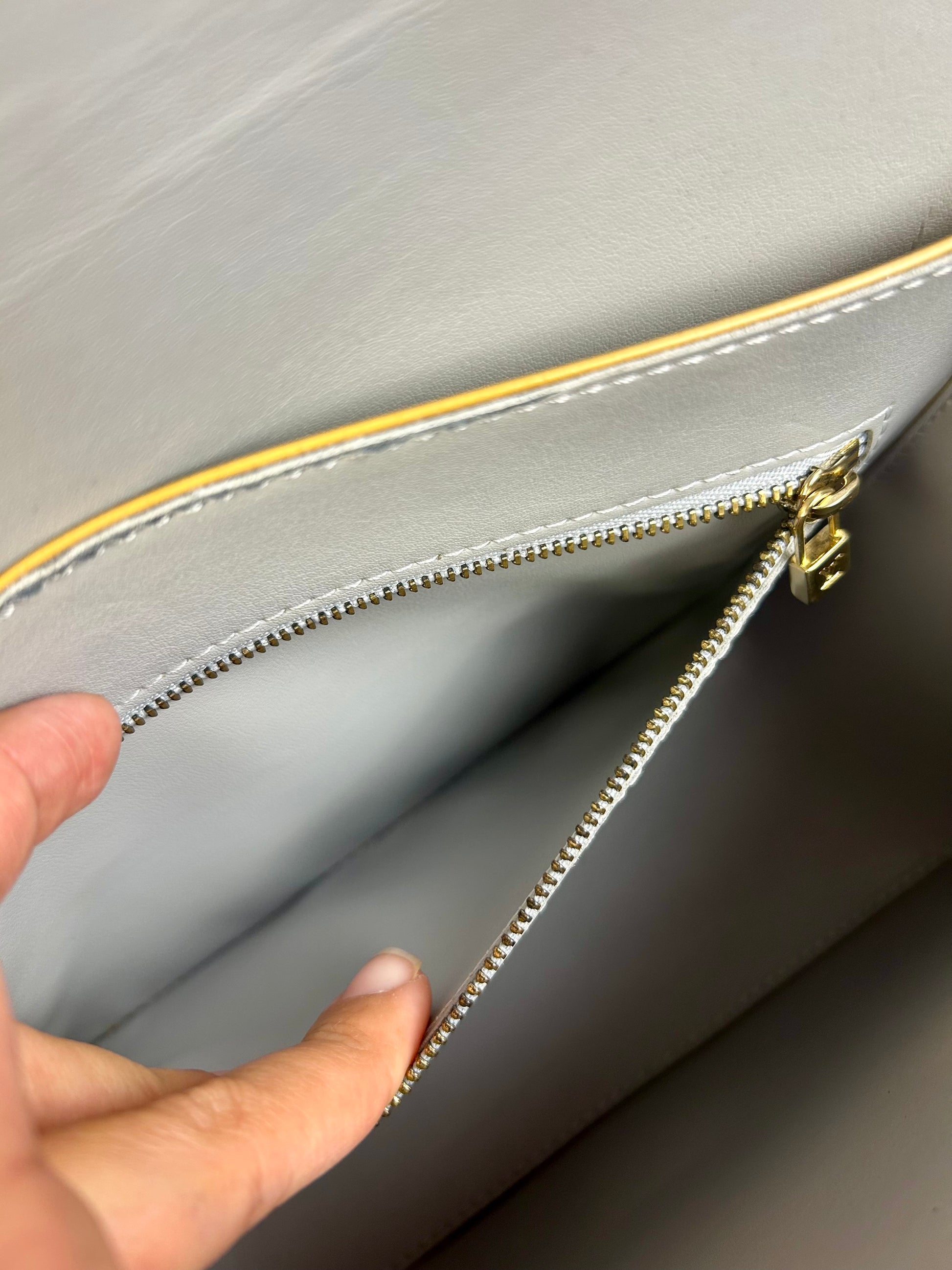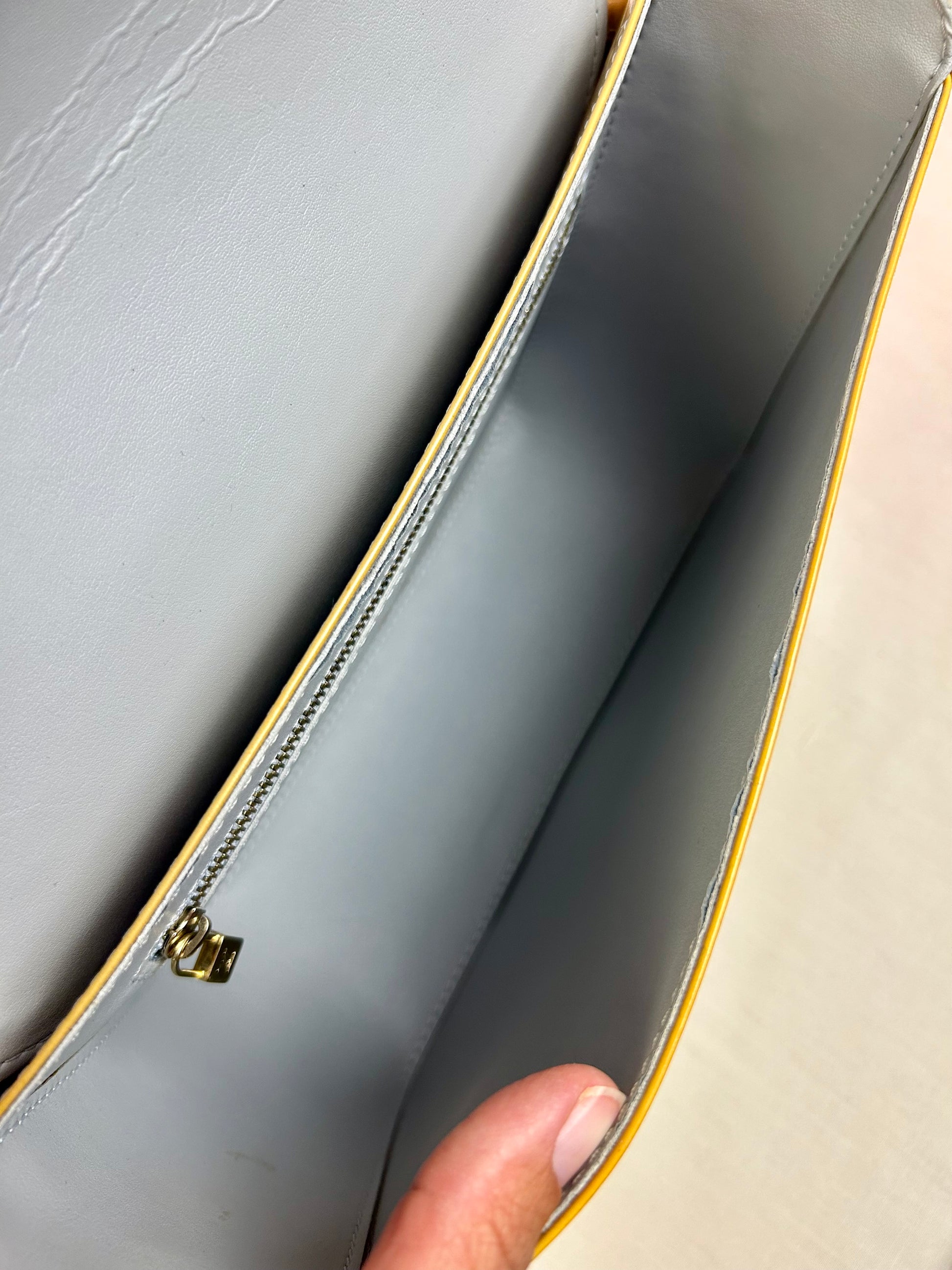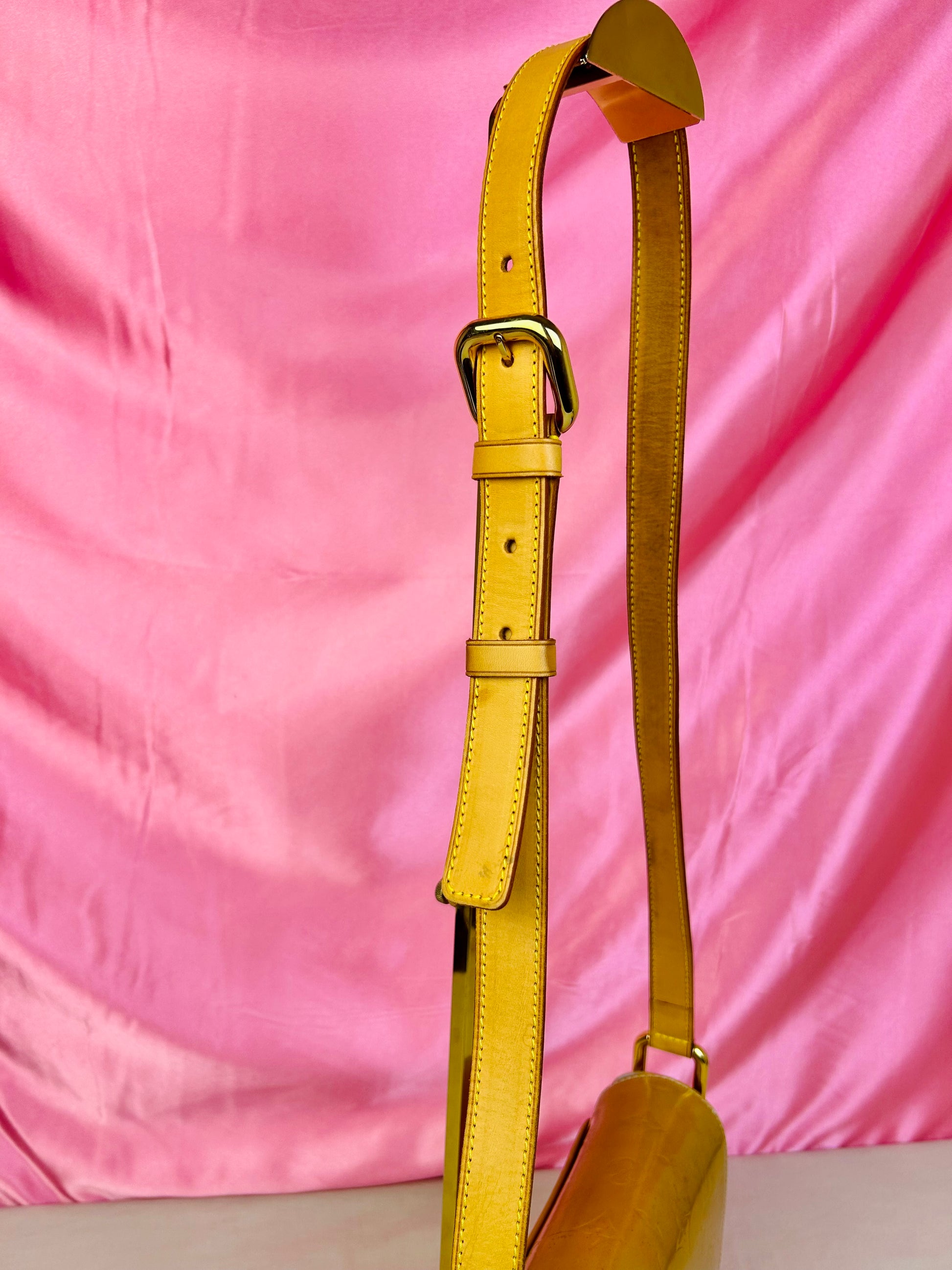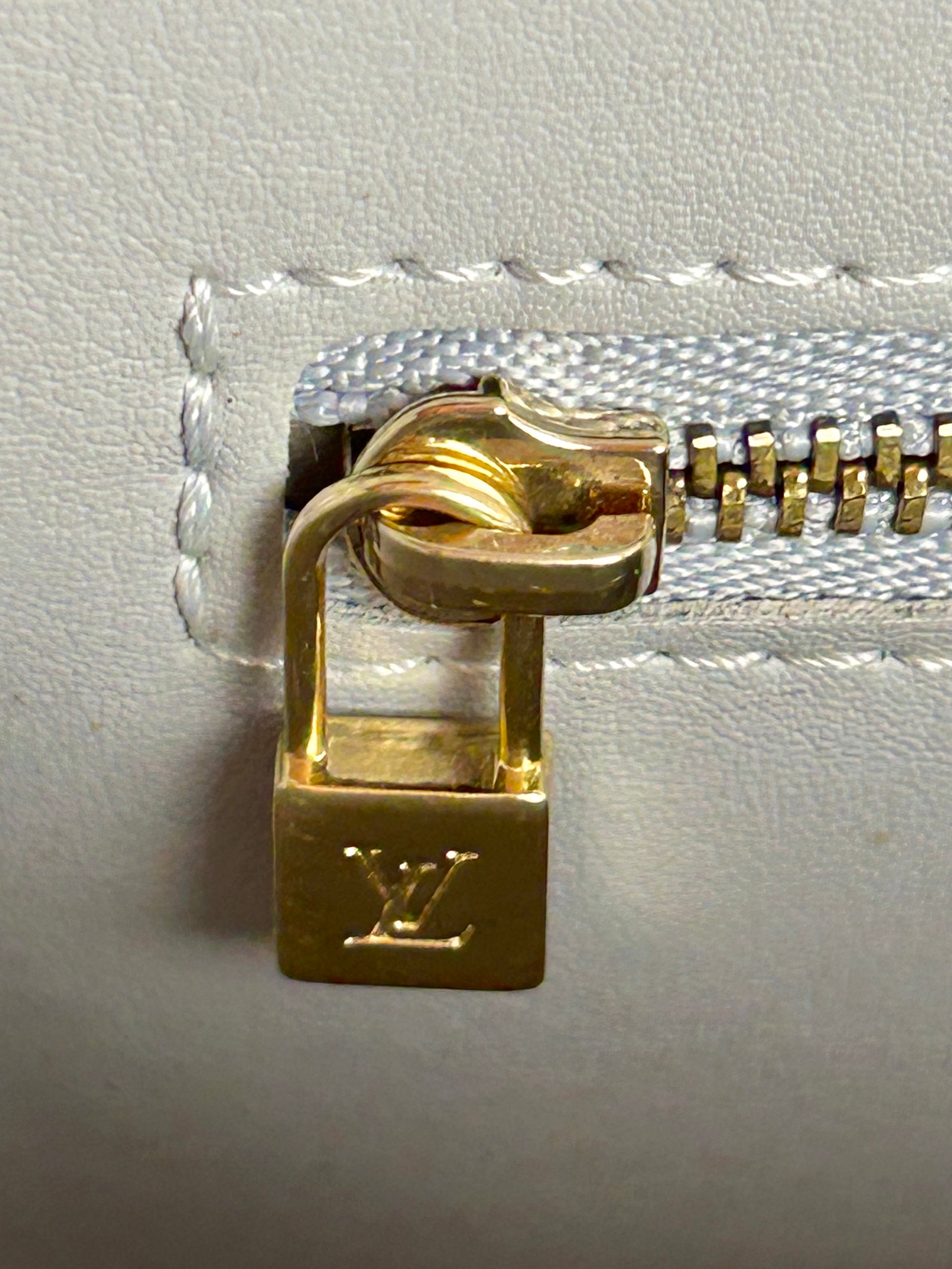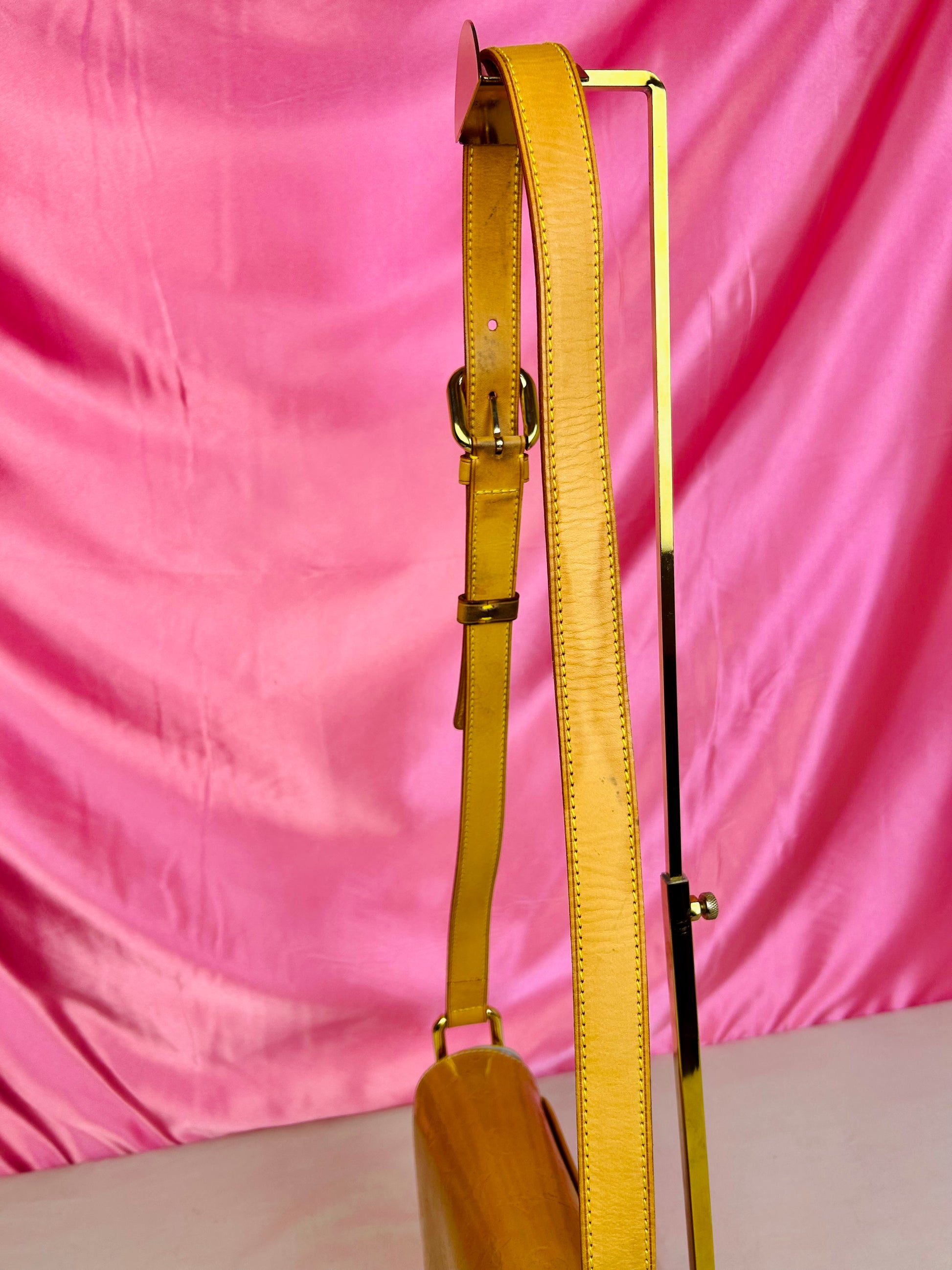 💜 Description: Vernis canvas is in beautiful shape with some discoloration throughout—one main spot on the back and s color transter on the front. Piping remains in excellent condition. Leather strap is in great condition with some watermarks and markings on the underside, but no cracks or tears. Chapes are strong and fully intact. Buckle is in excellent condition. Hardware is gold and shiny. Interior and pockets are very clean with minimal signs of wear.