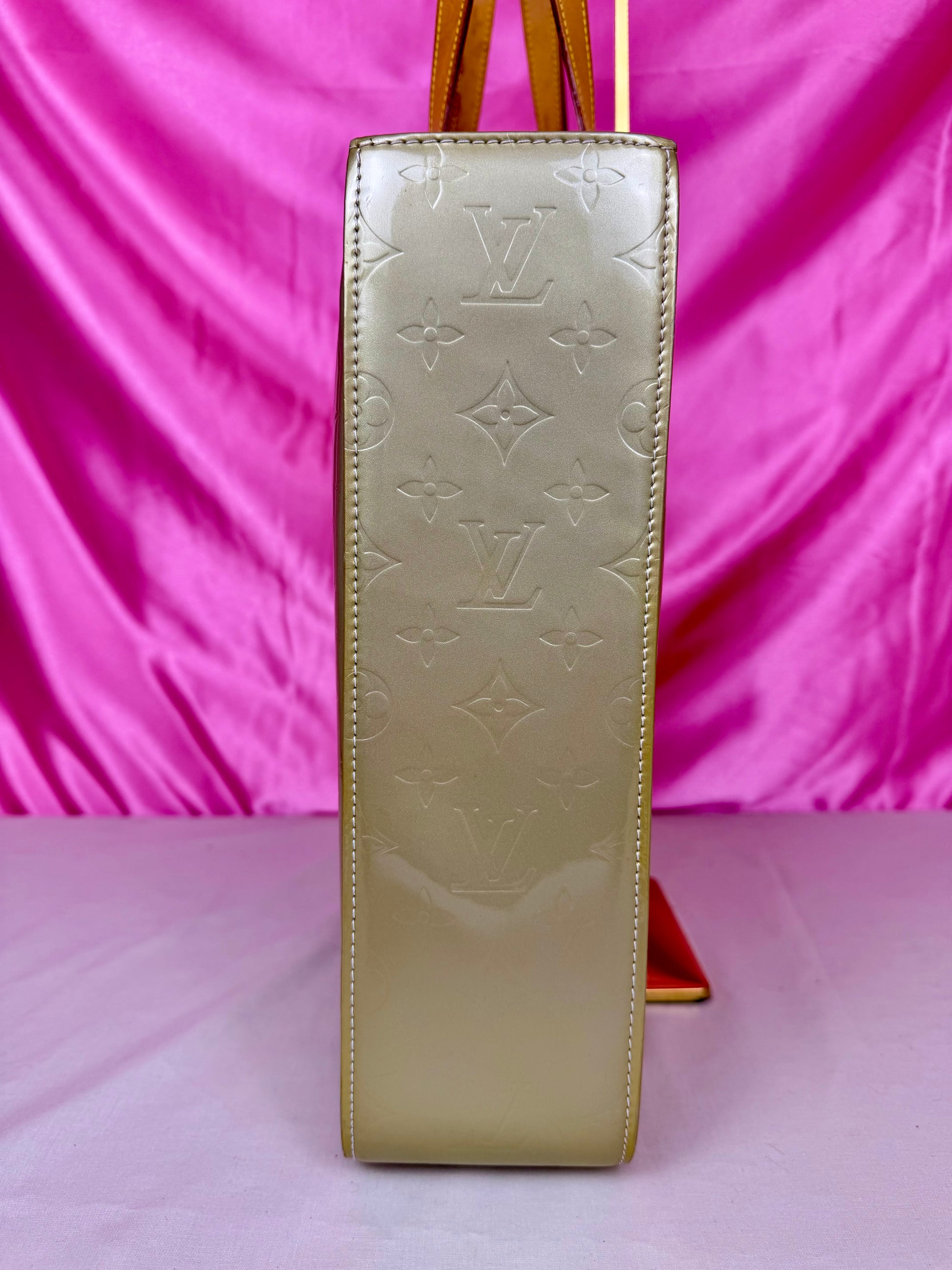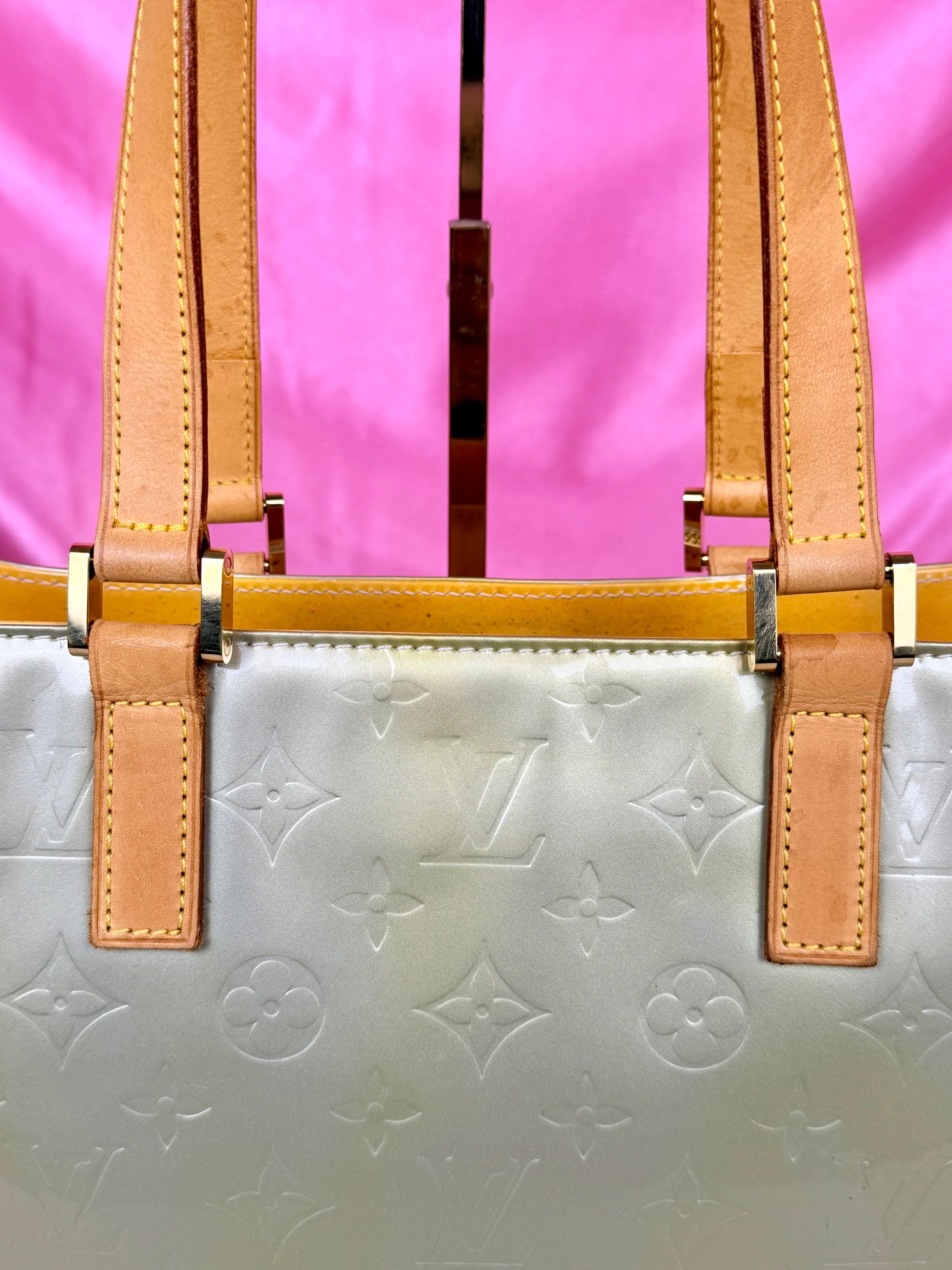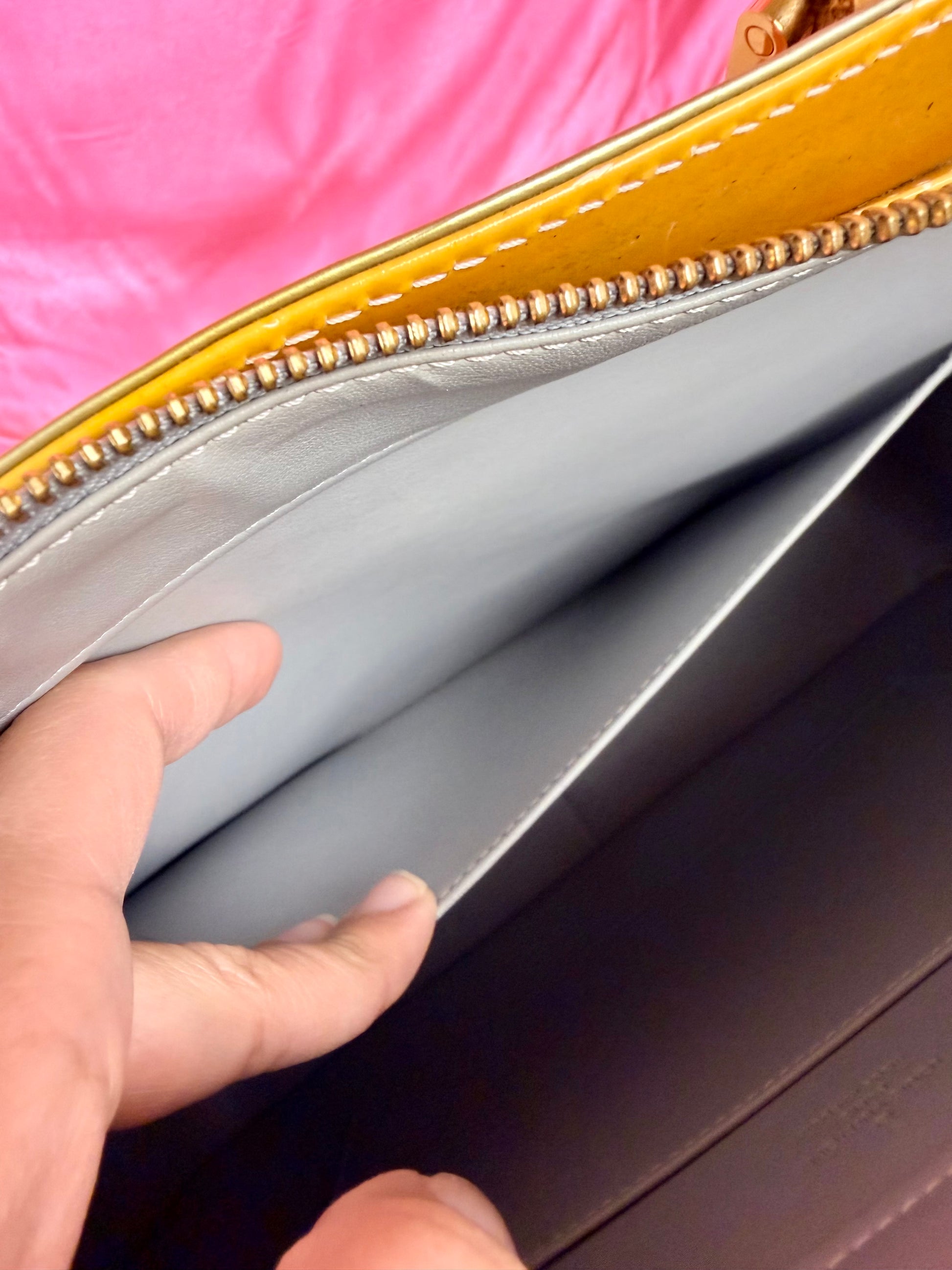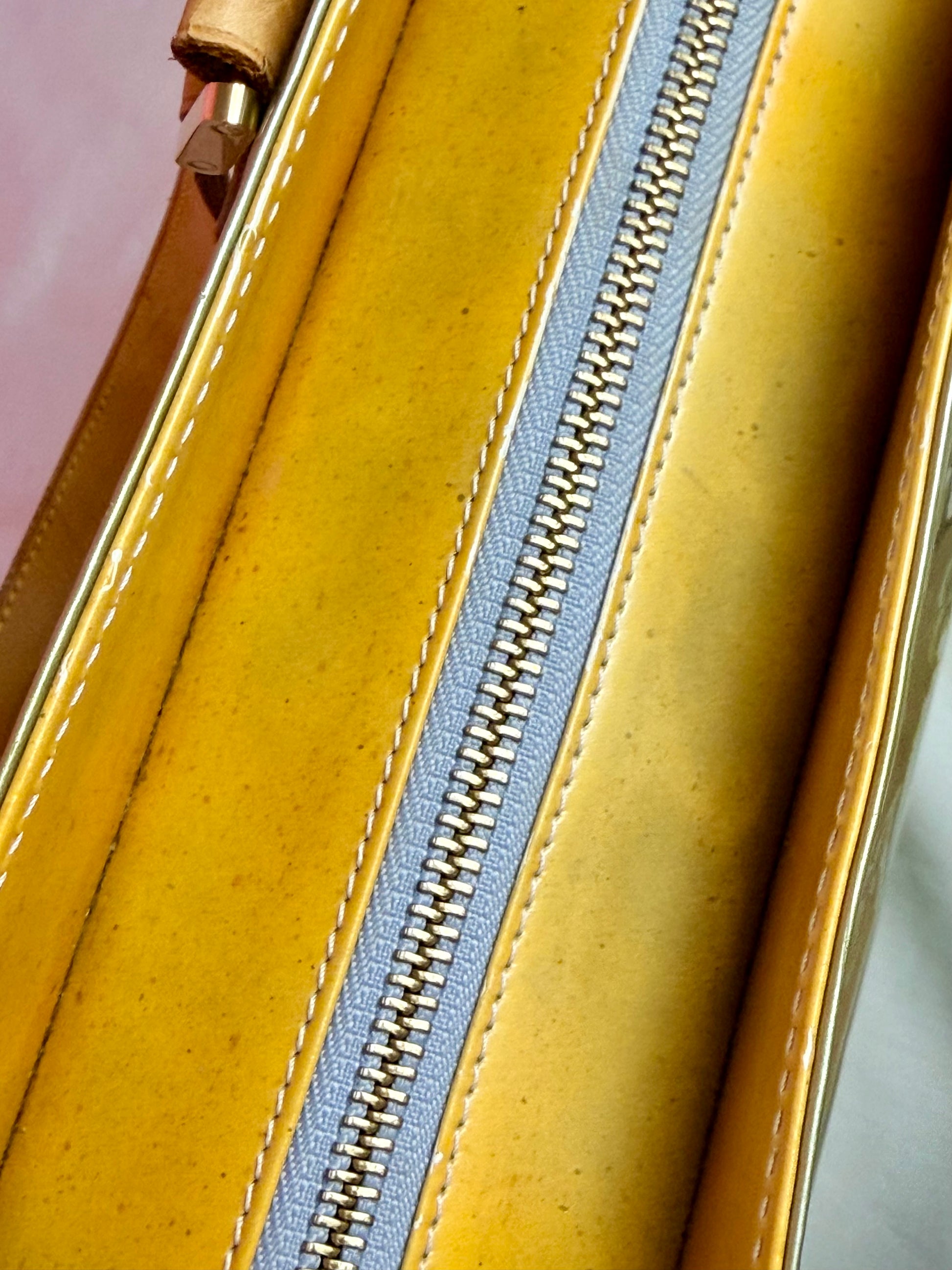 š Description: A stunning and elegant tote with a glossy finish! Canvas is in excellent condition, slight discoloration. Leather around the zipper has discoloration spots. Leather handles have some watermarks. Hardware is shiny, and the zipper pull works well. Interior is clean. A gorgeous statement piece!
