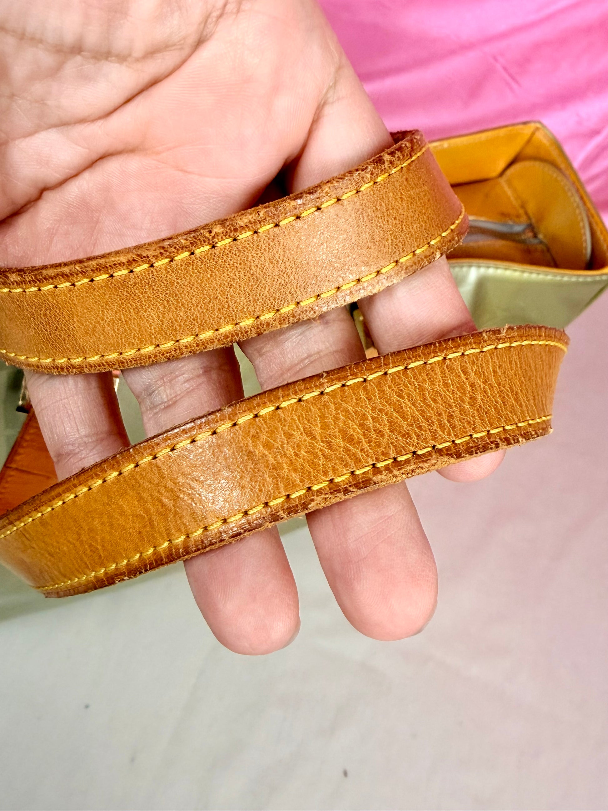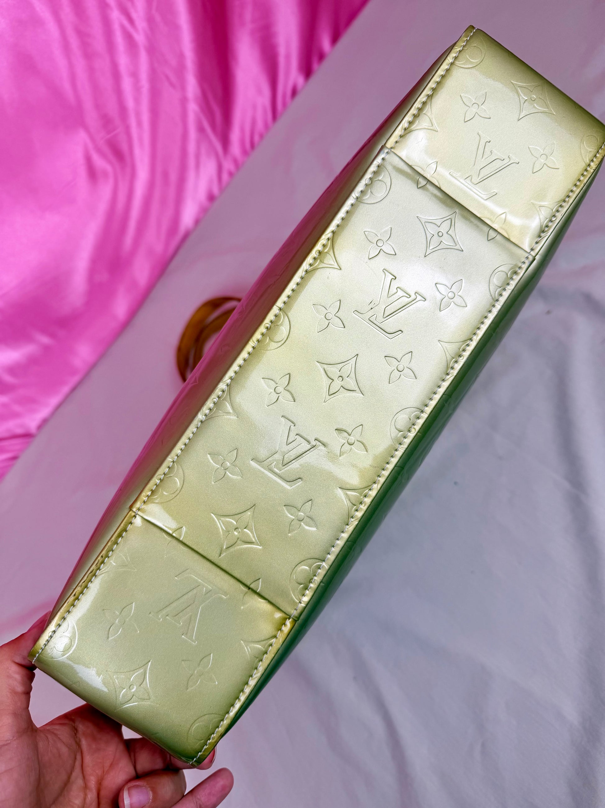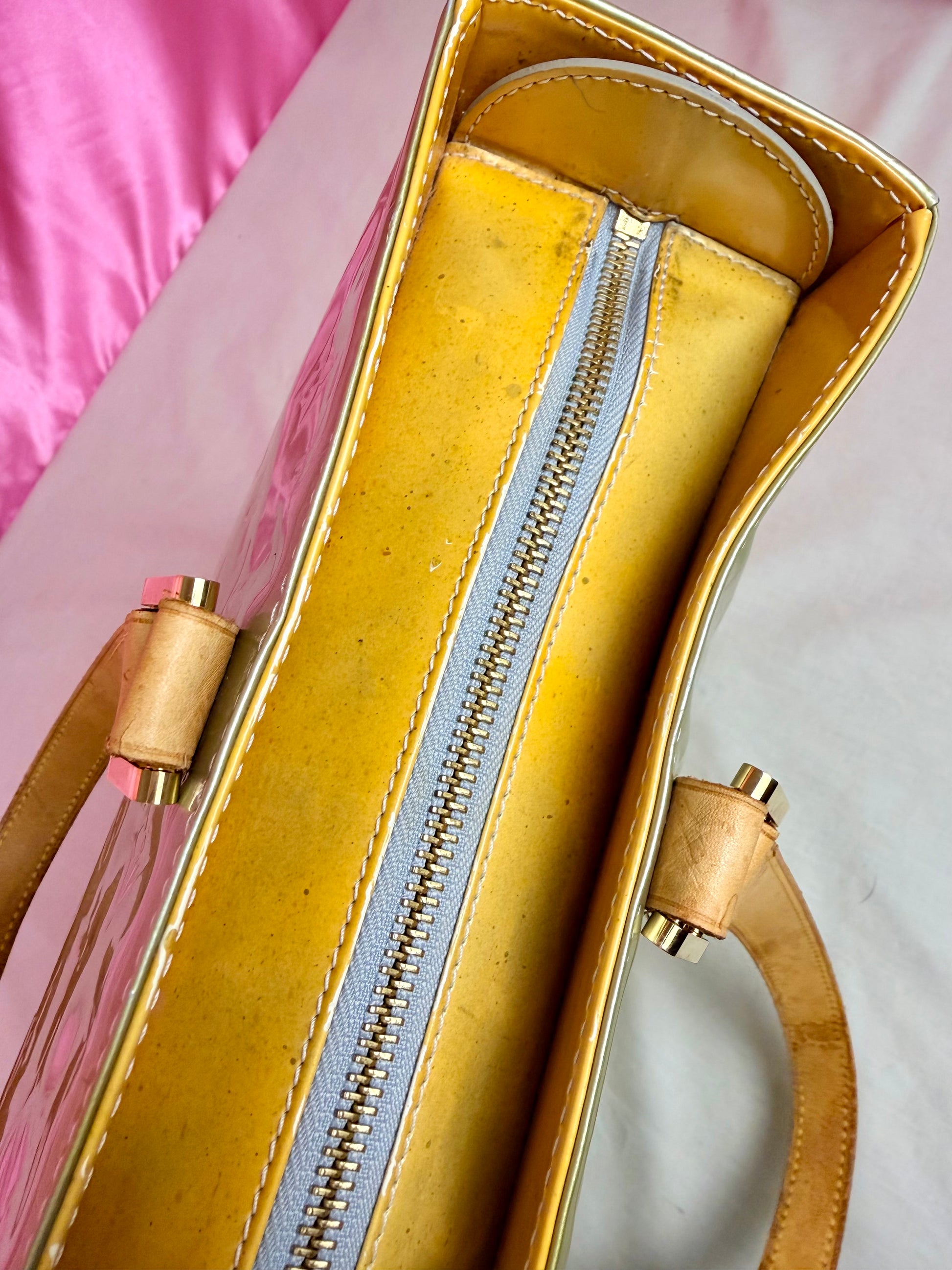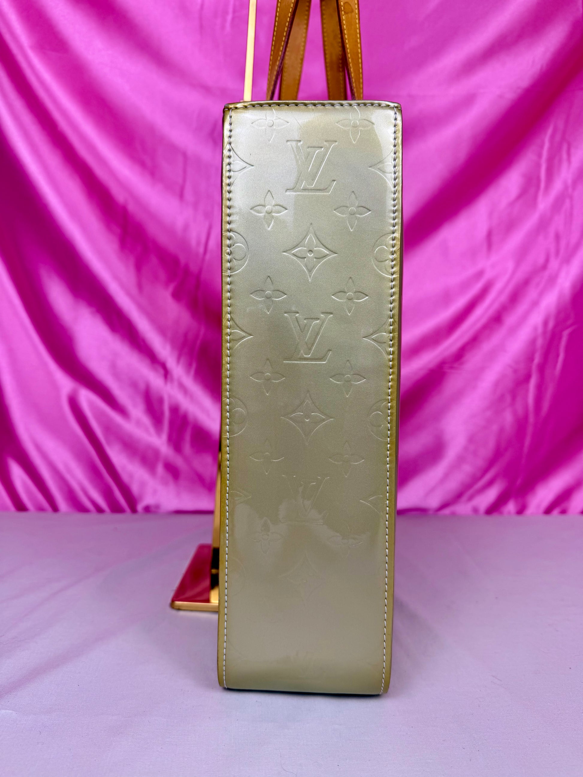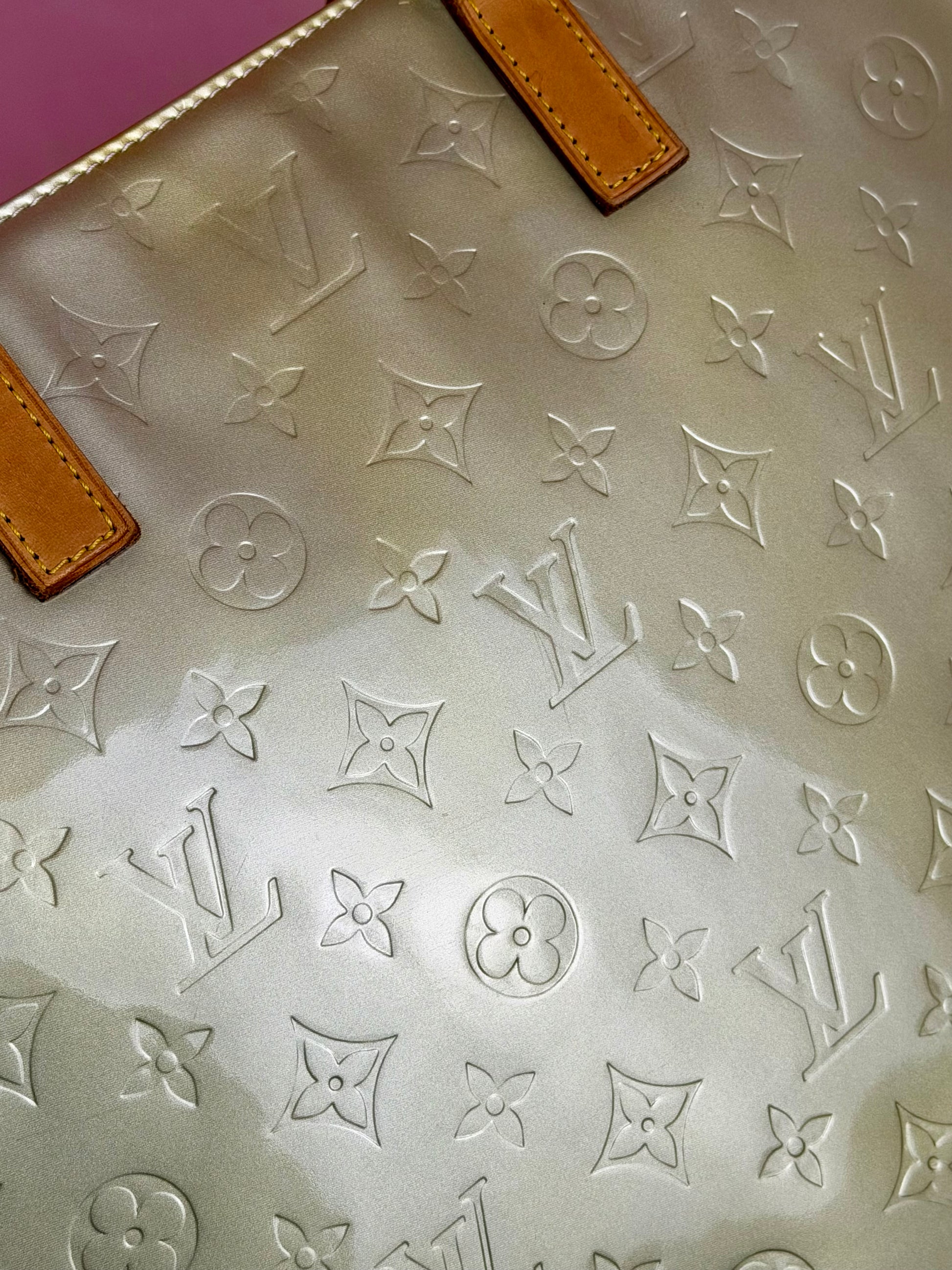 š Description: A stunning and elegant tote with a glossy finish! Canvas is in excellent condition, slight discoloration. Leather around the zipper has discoloration spots. Leather handles have some watermarks. Hardware is shiny, and the zipper pull works well. Interior is clean. A gorgeous statement piece!