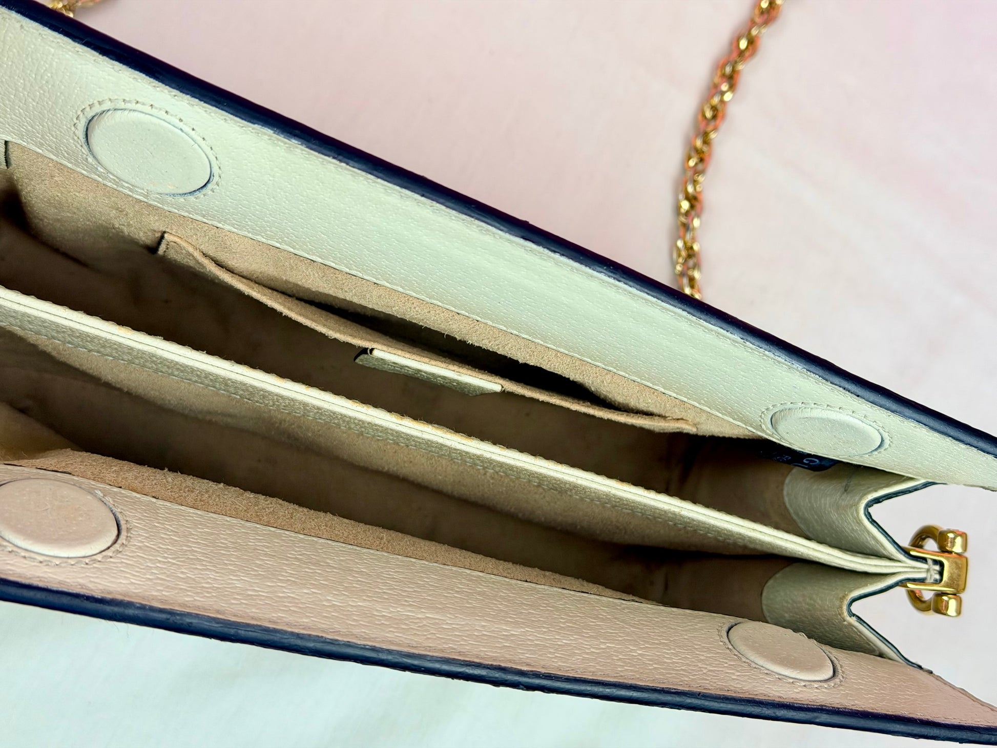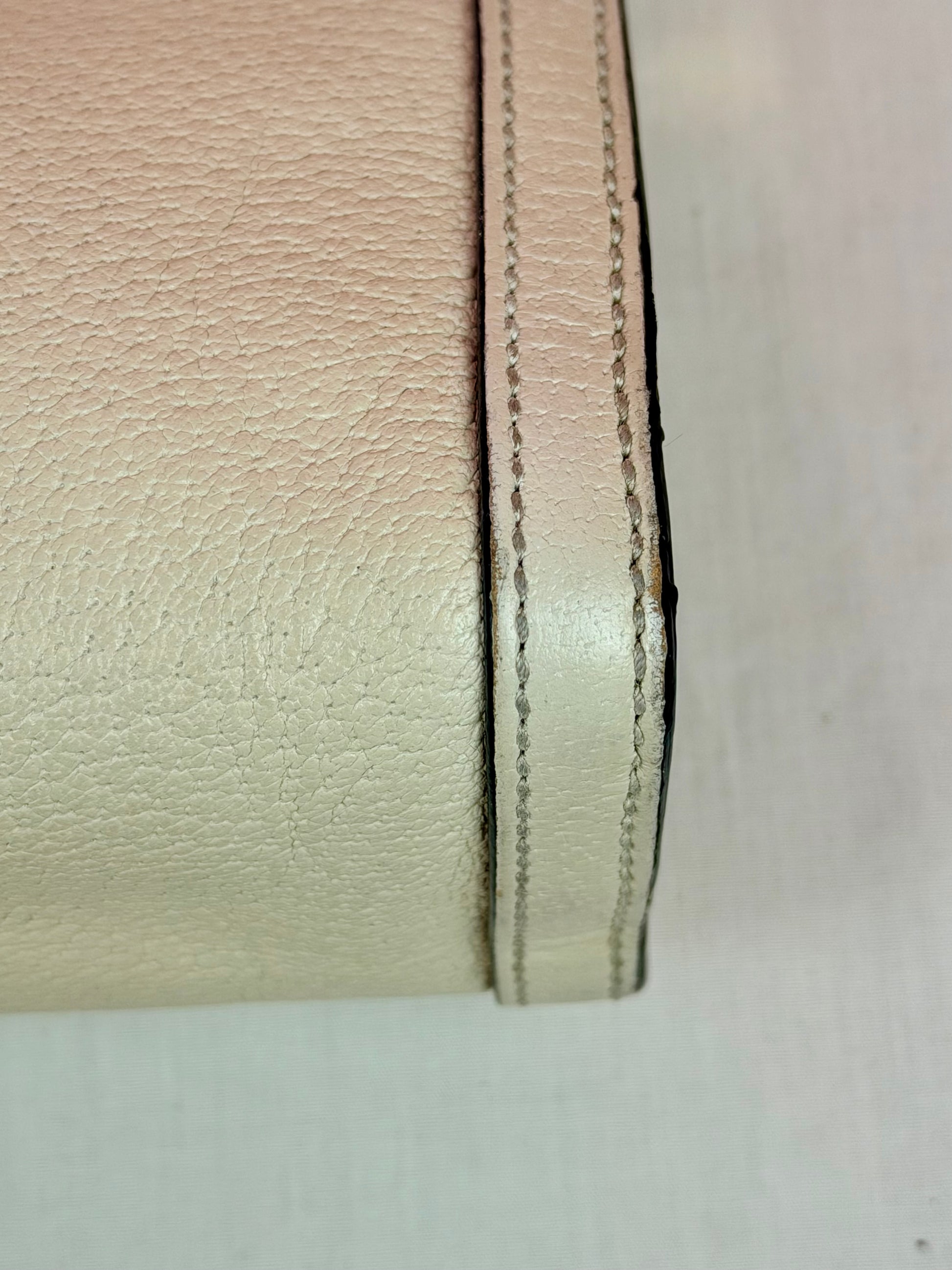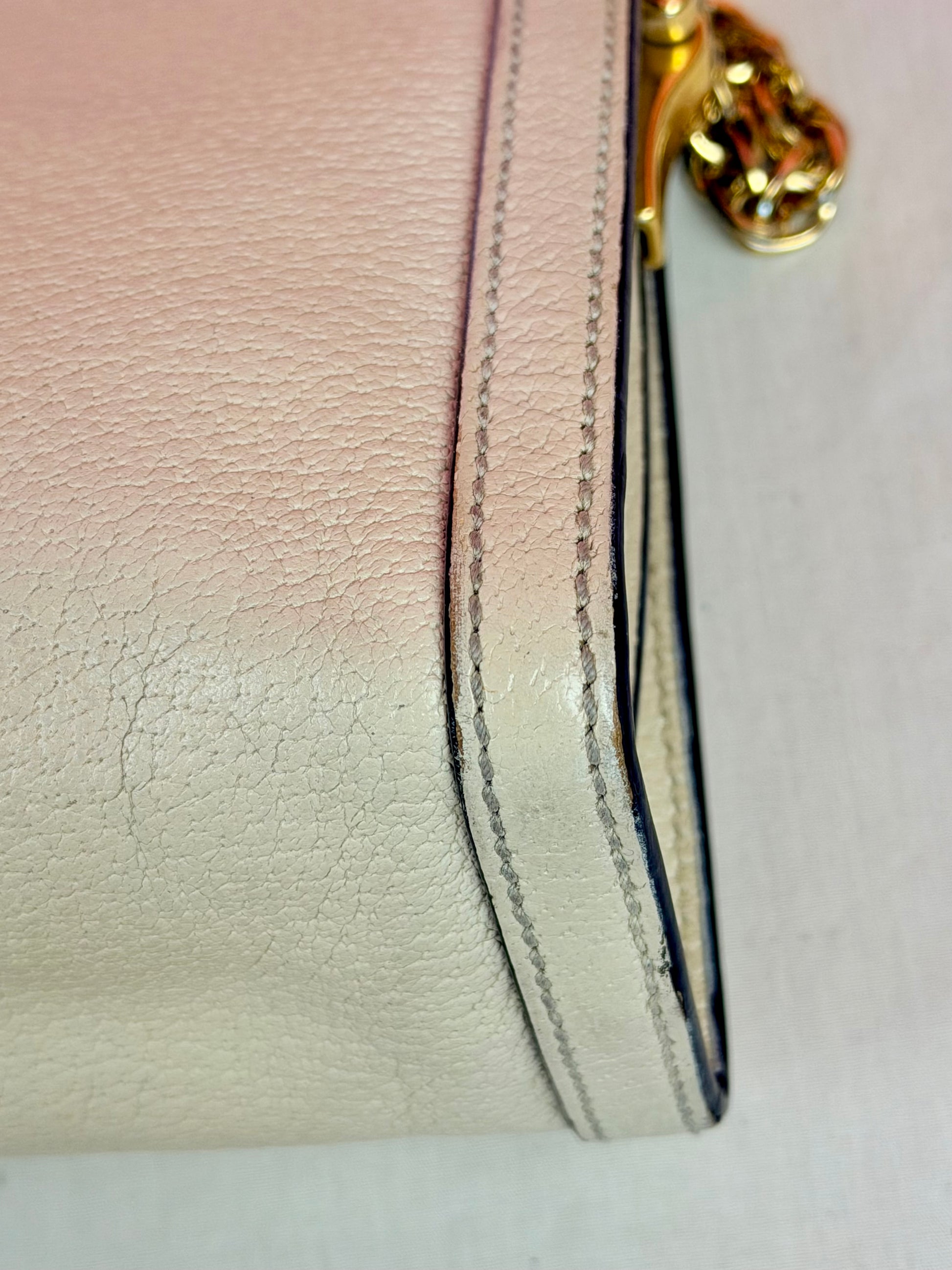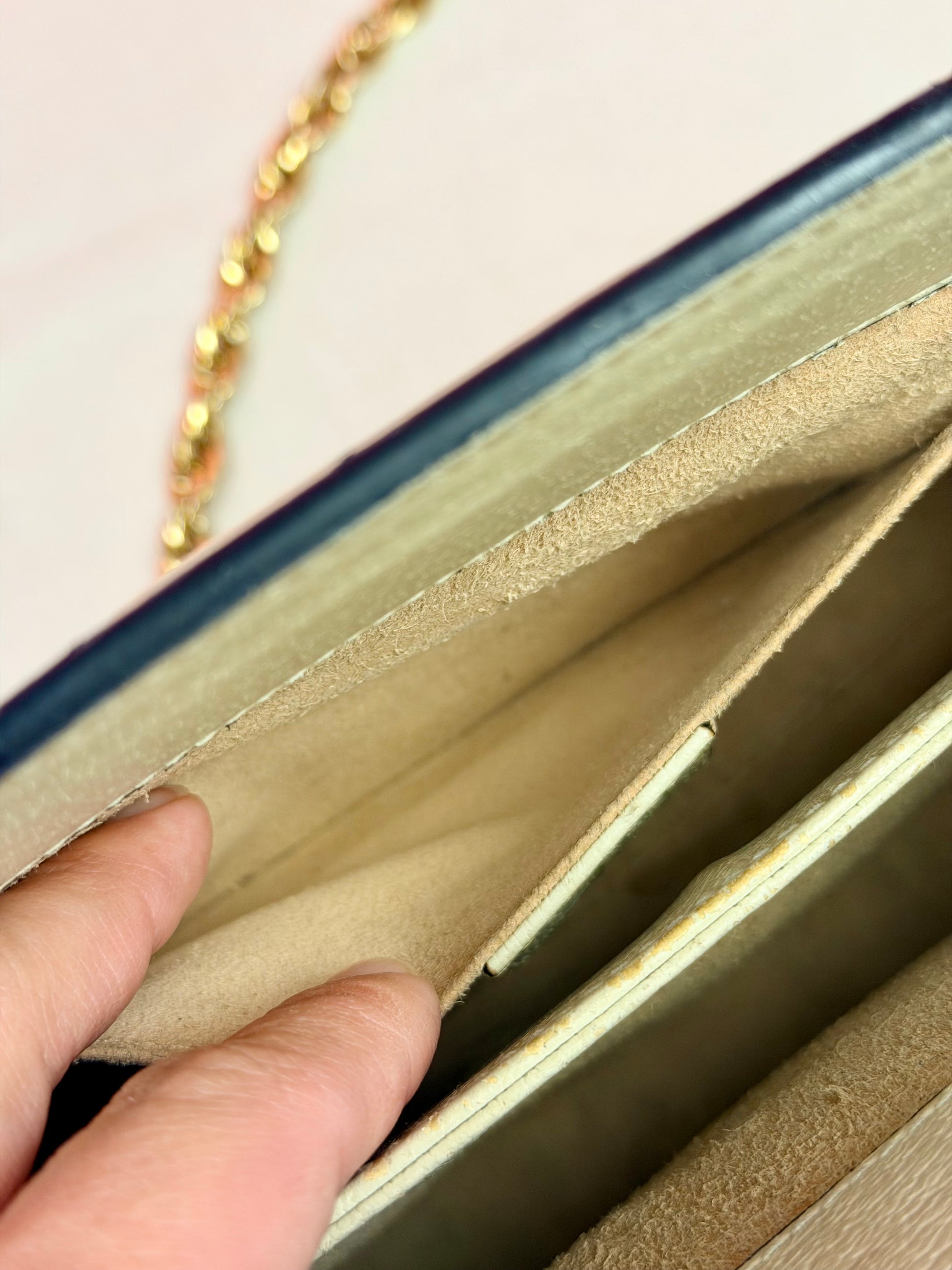 💜 Description: Leather canvas is in beautiful condition with no cracks or tears. There is some wrinkling on the bottom and backside consistent with normal usage. Light wear on the bottom corners. Glazing is in excellent condition. Interior features a two-compartment light pink suede lining that is clean overall, with some rubbing and mild discoloration consistent with use. Interior pocket is clean. Hardware is shiny, magnetic clasp works well. The metal chain remains shiny with slight silvering but mostly gold still.