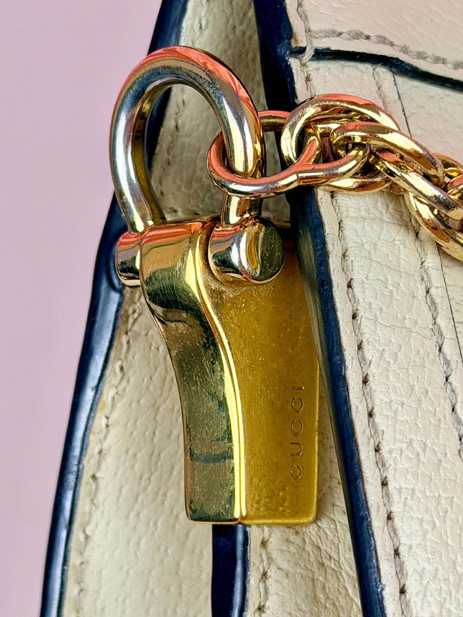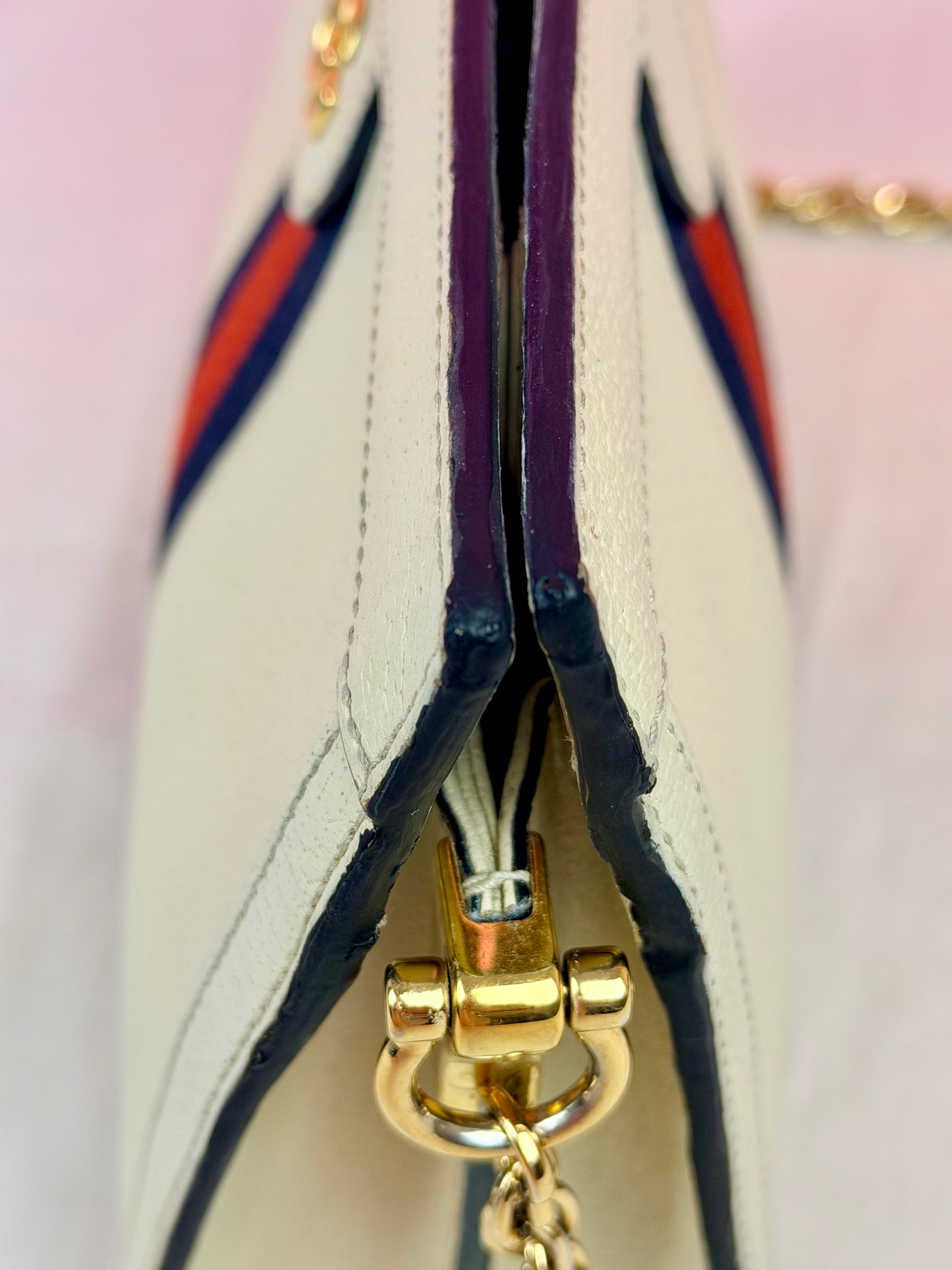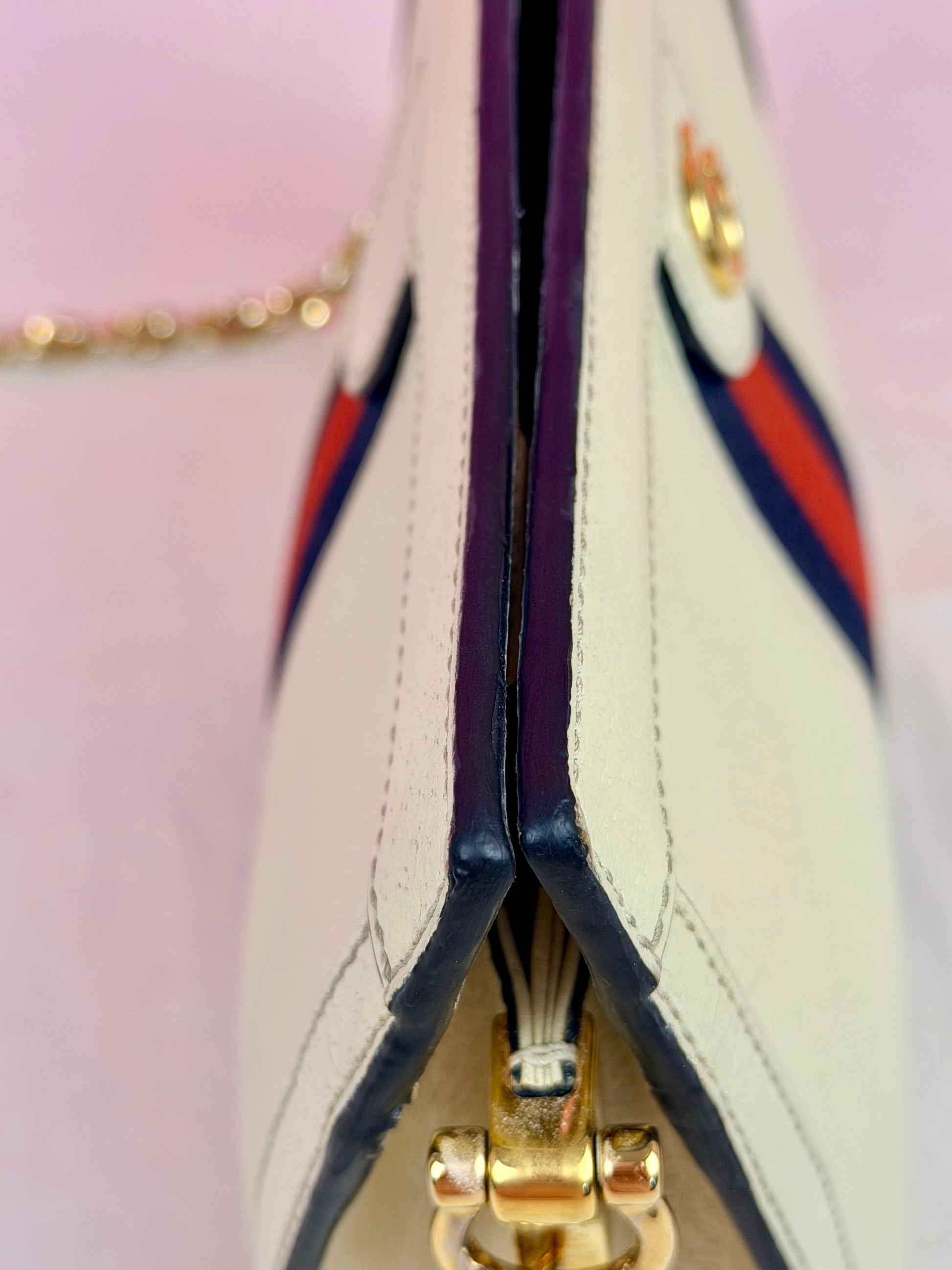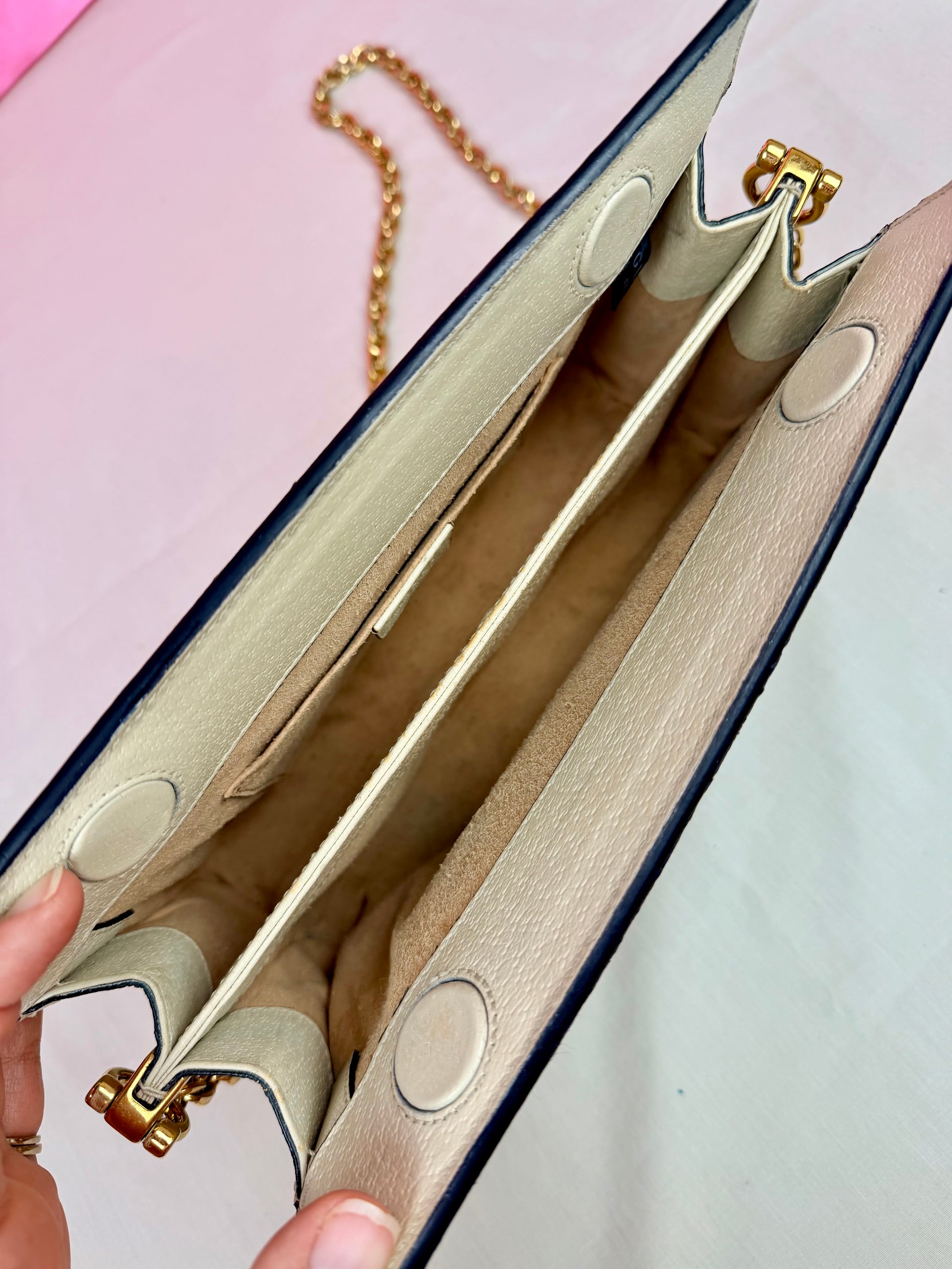💜 Description: Leather canvas is in beautiful condition with no cracks or tears. There is some wrinkling on the bottom and backside consistent with normal usage. Light wear on the bottom corners. Glazing is in excellent condition. Interior features a two-compartment light pink suede lining that is clean overall, with some rubbing and mild discoloration consistent with use. Interior pocket is clean. Hardware is shiny, magnetic clasp works well. The metal chain remains shiny with slight silvering but mostly gold still.