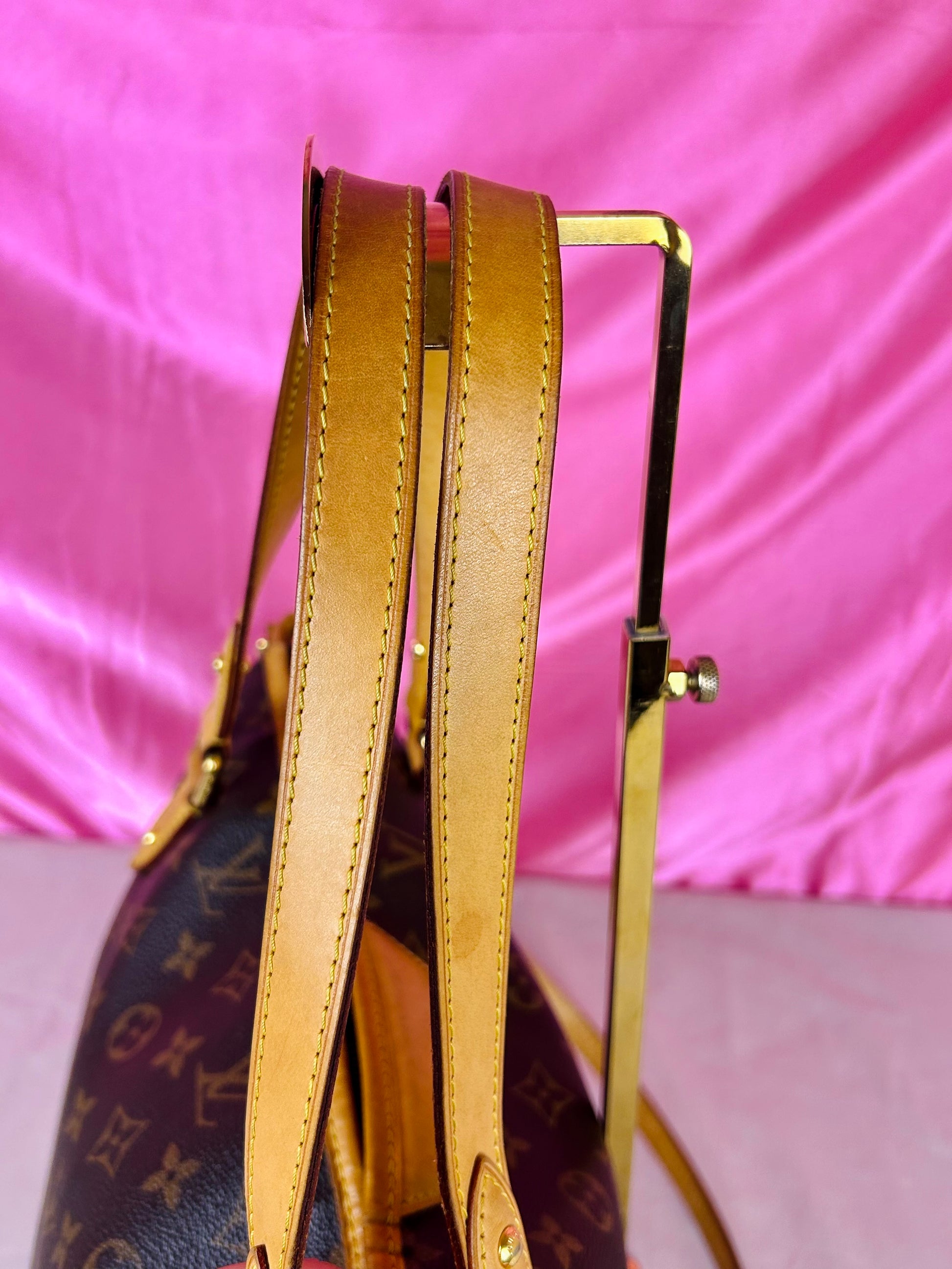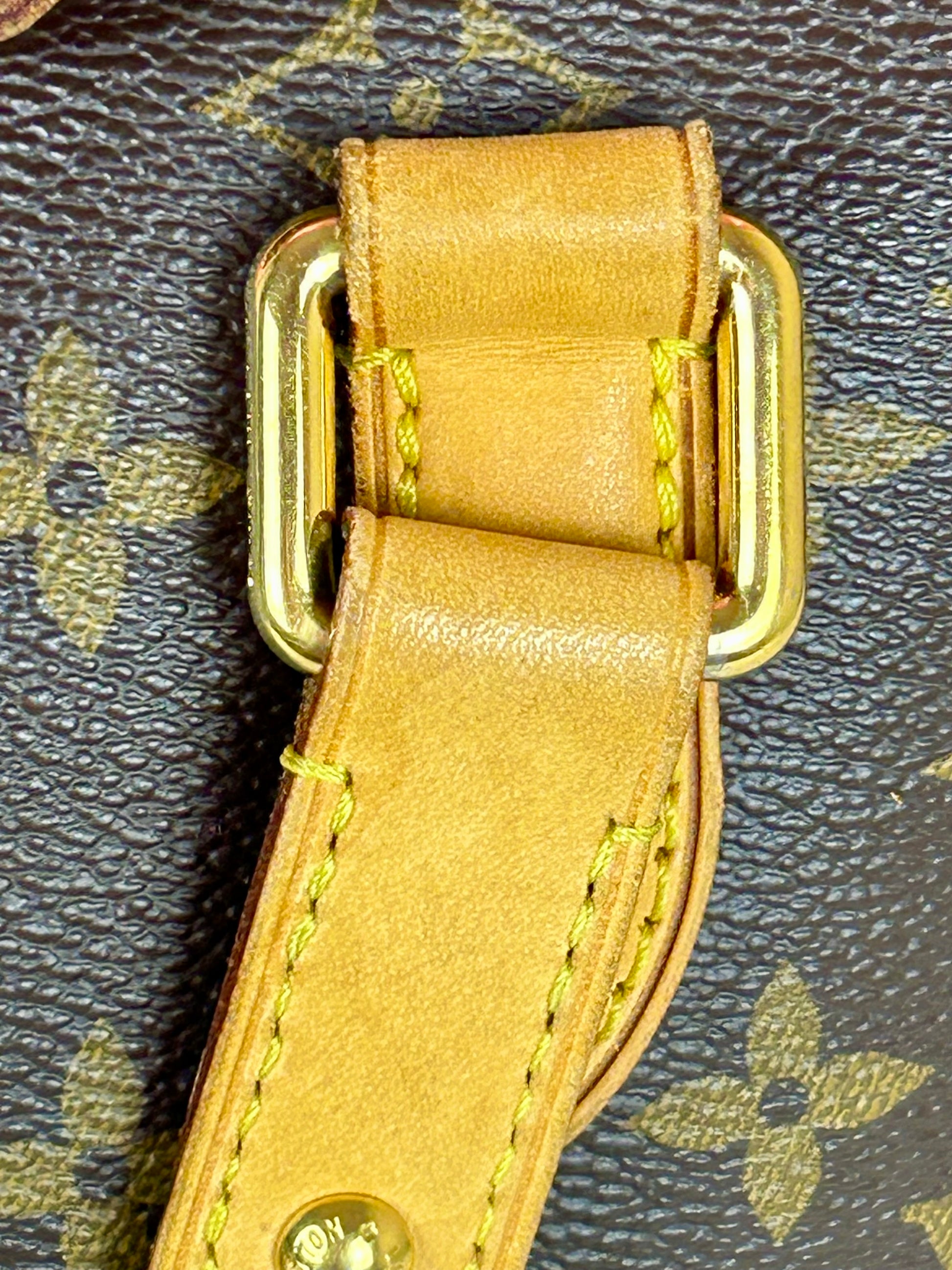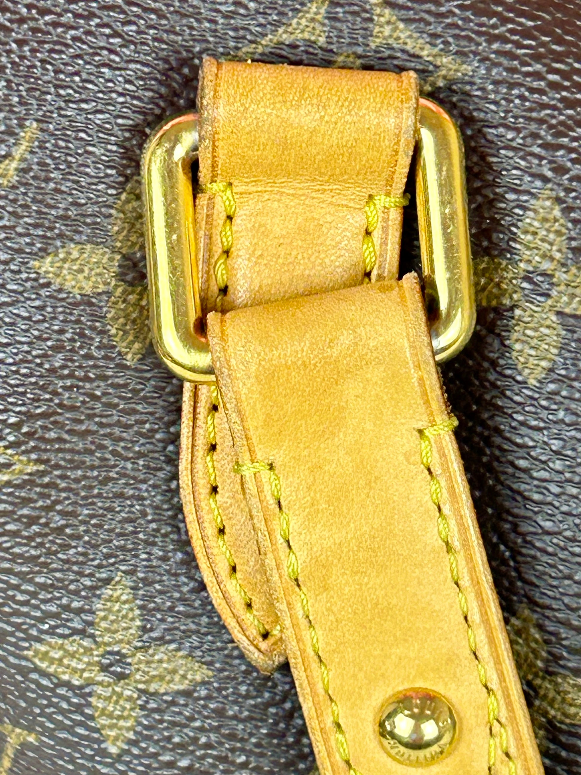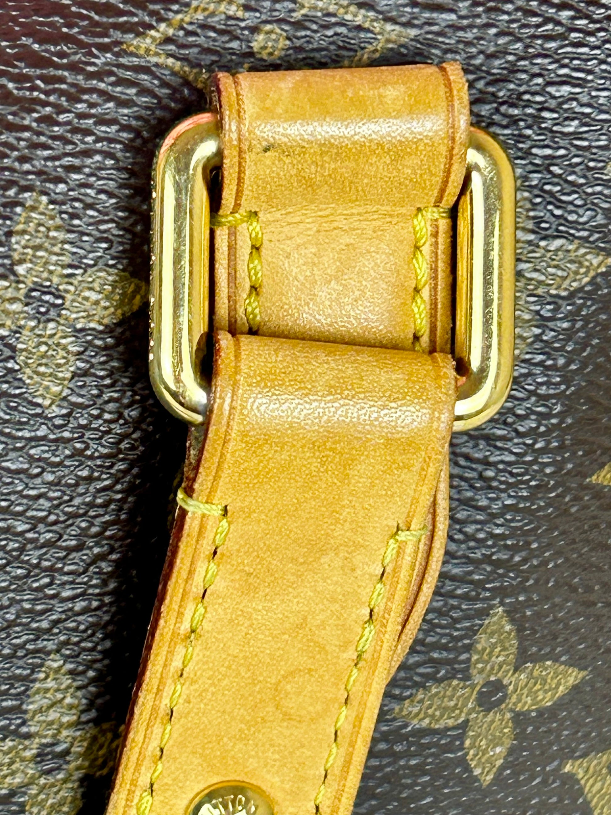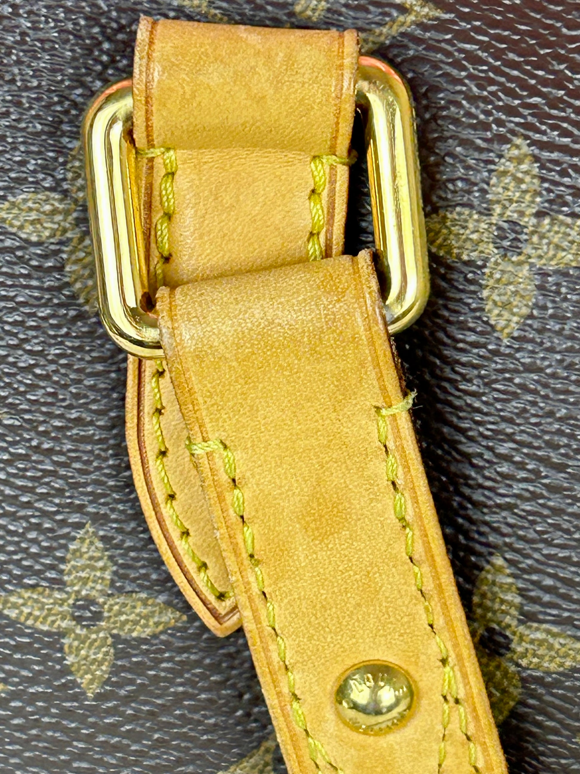 š Description: Canvas is in beautiful condition with no cracks or tears. Piping shows some wear on the bottom corners with one small area of exposure. Top leather trim has light wrinkling and normal wear. Leather handles are in great condition with slight marking but no cracks or tears. Chapes are strong and intact with some surface marks. Leather shoulder strap is in great condition with minimal signs of wear. Interior and interior pocket are clean with a few small markings. Hardware remains shiny.