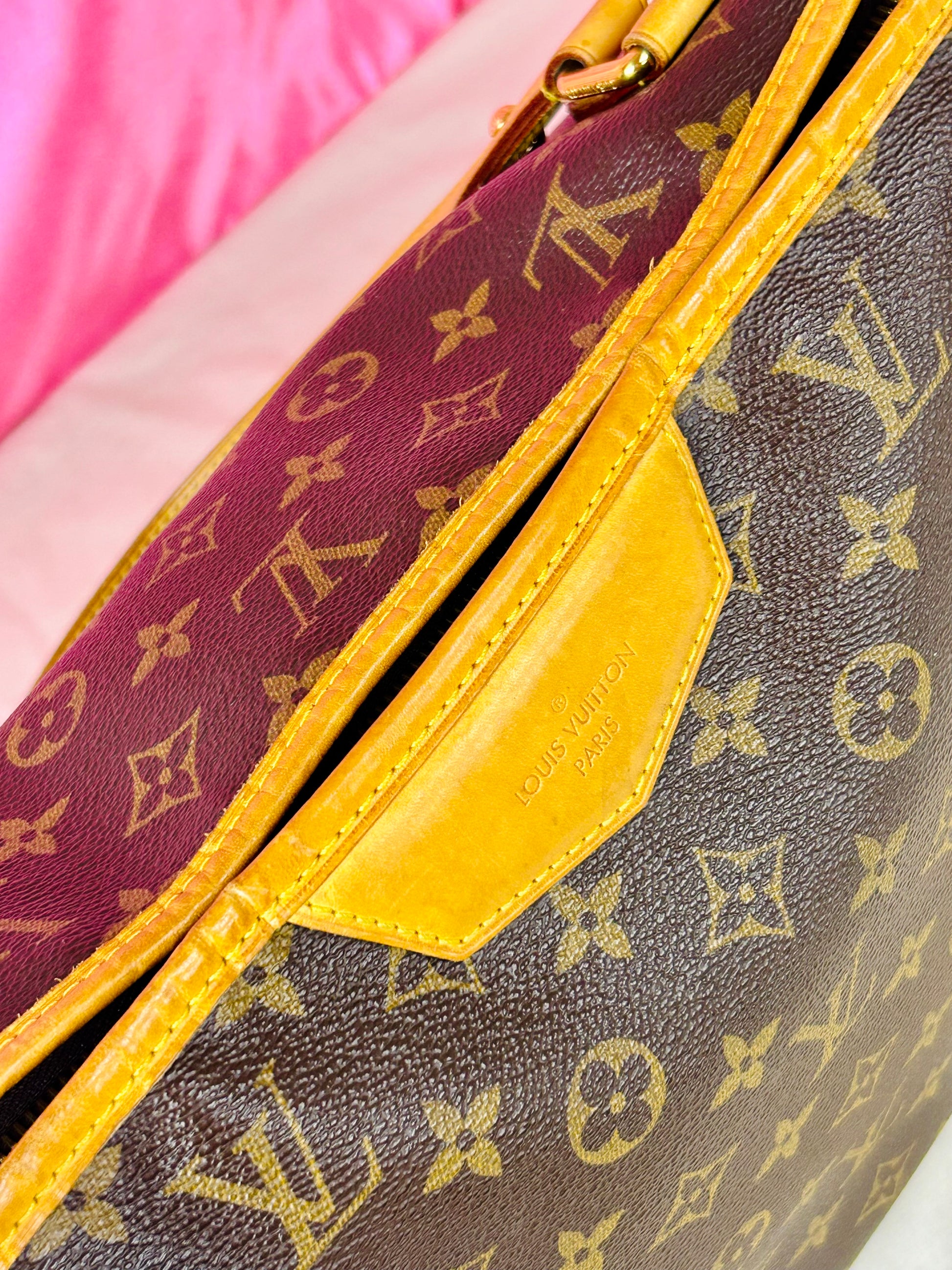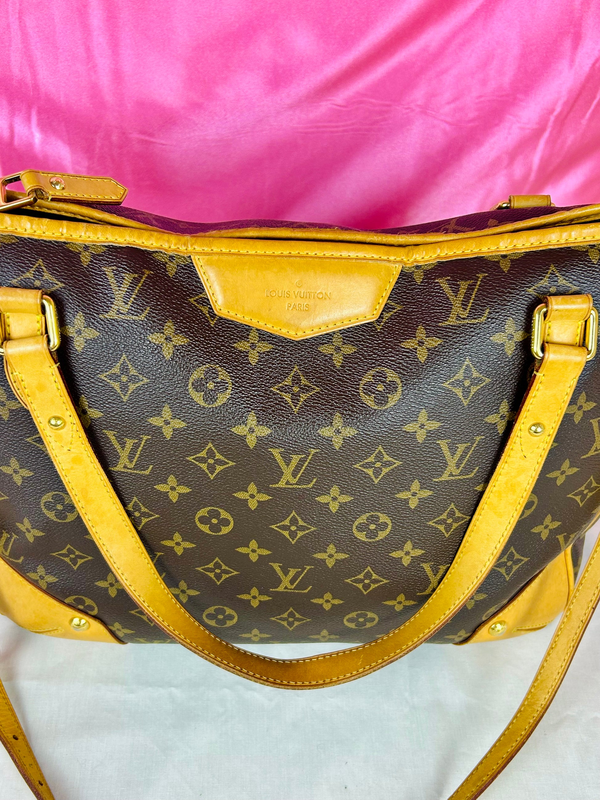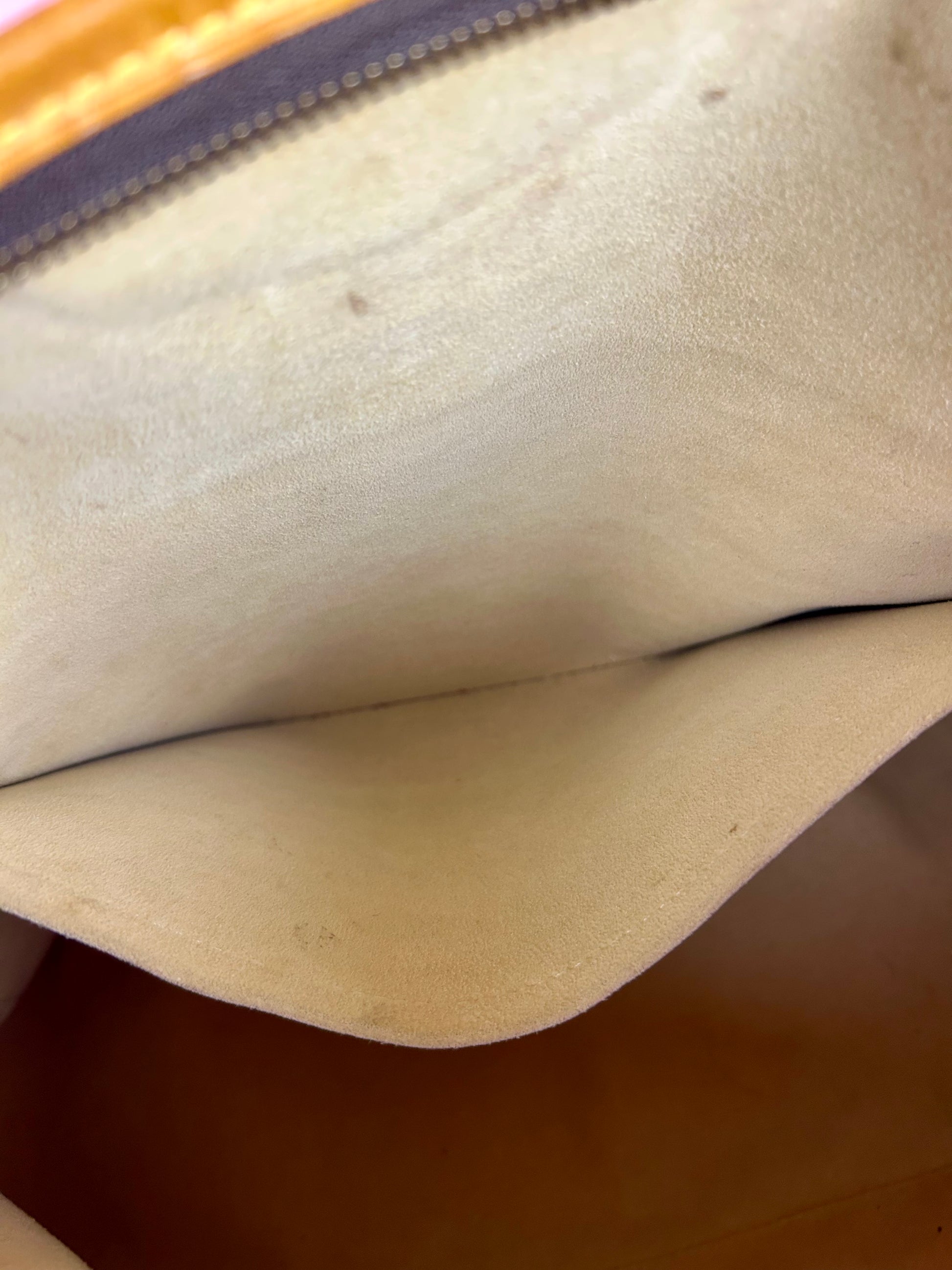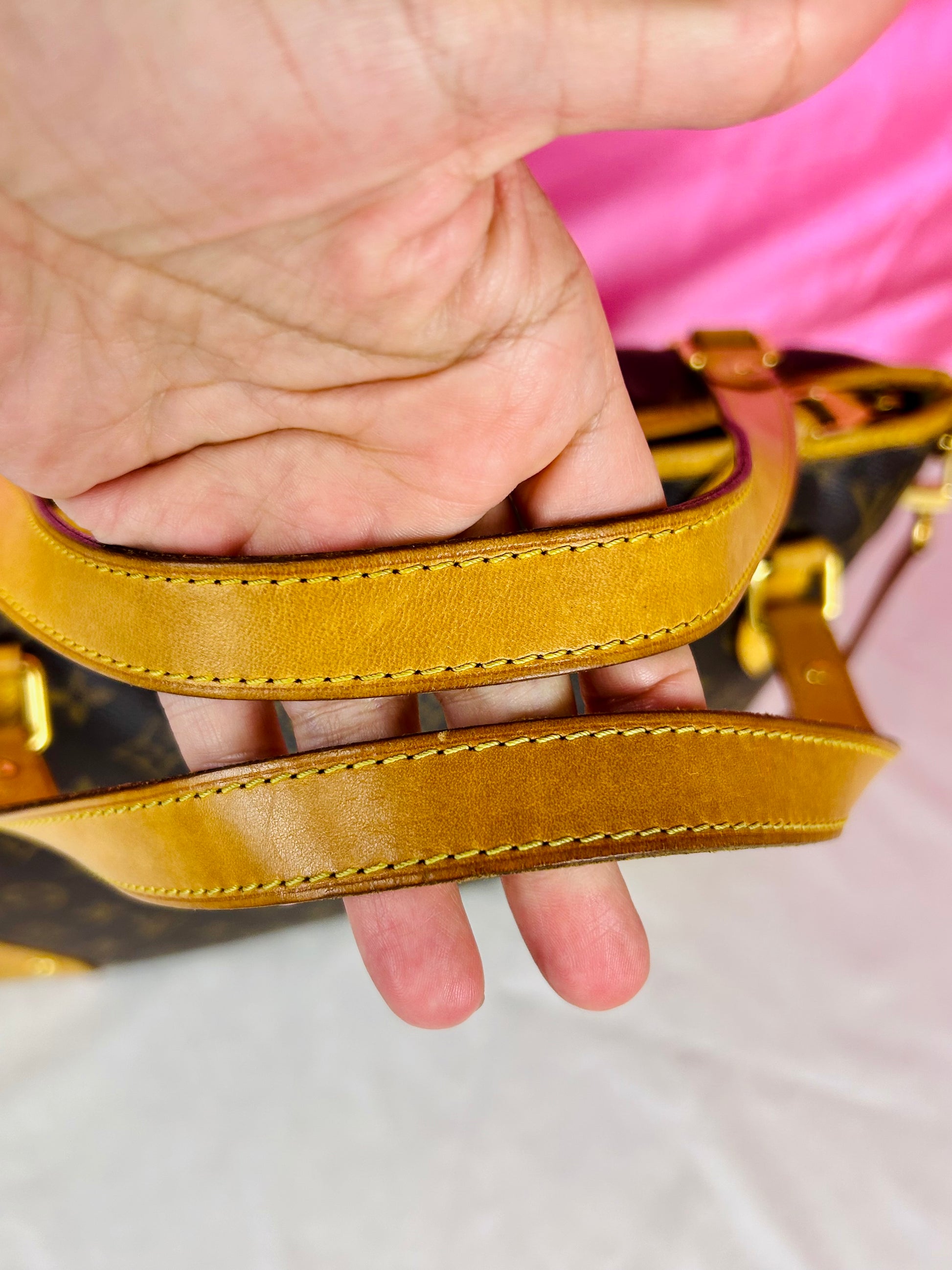 š Description: Canvas is in beautiful condition with no cracks or tears. Piping shows some wear on the bottom corners with one small area of exposure. Top leather trim has light wrinkling and normal wear. Leather handles are in great condition with slight marking but no cracks or tears. Chapes are strong and intact with some surface marks. Leather shoulder strap is in great condition with minimal signs of wear. Interior and interior pocket are clean with a few small markings. Hardware remains shiny.