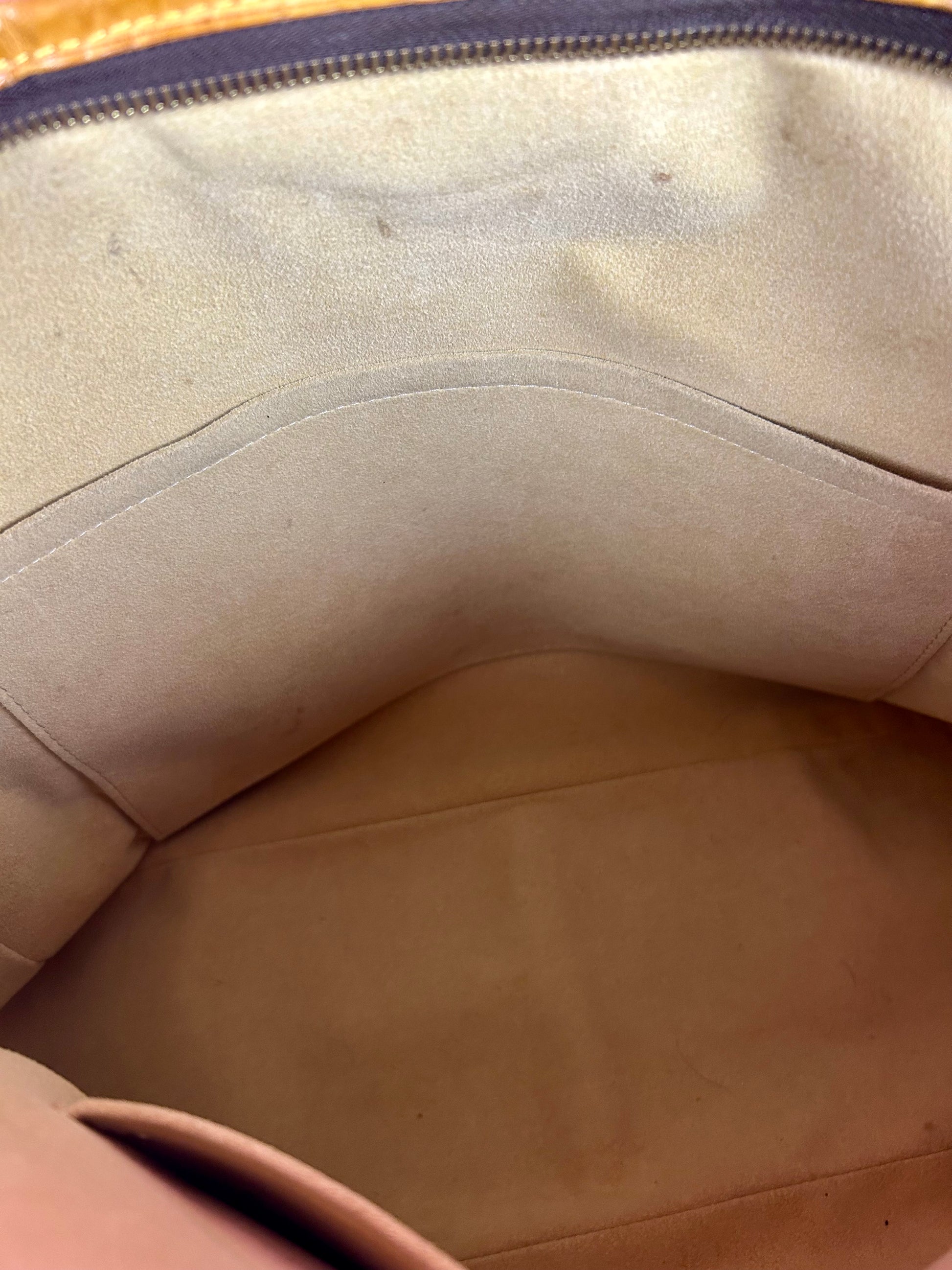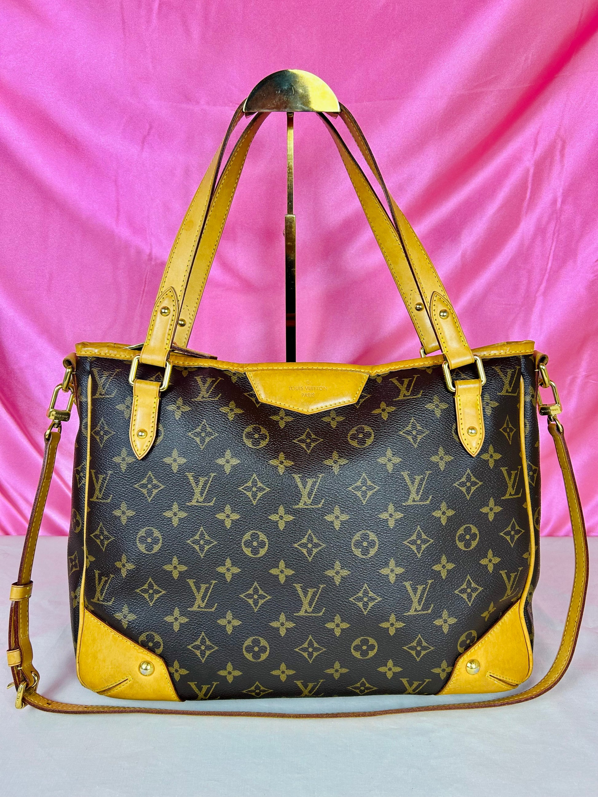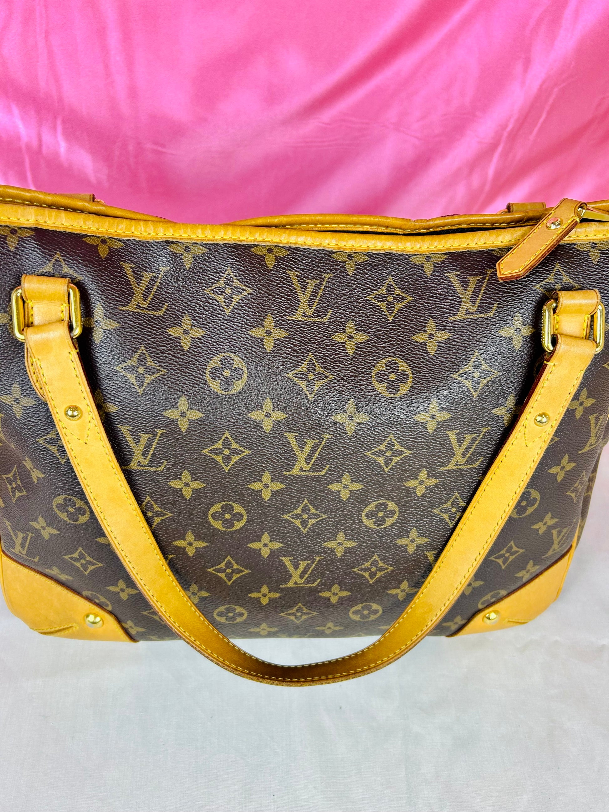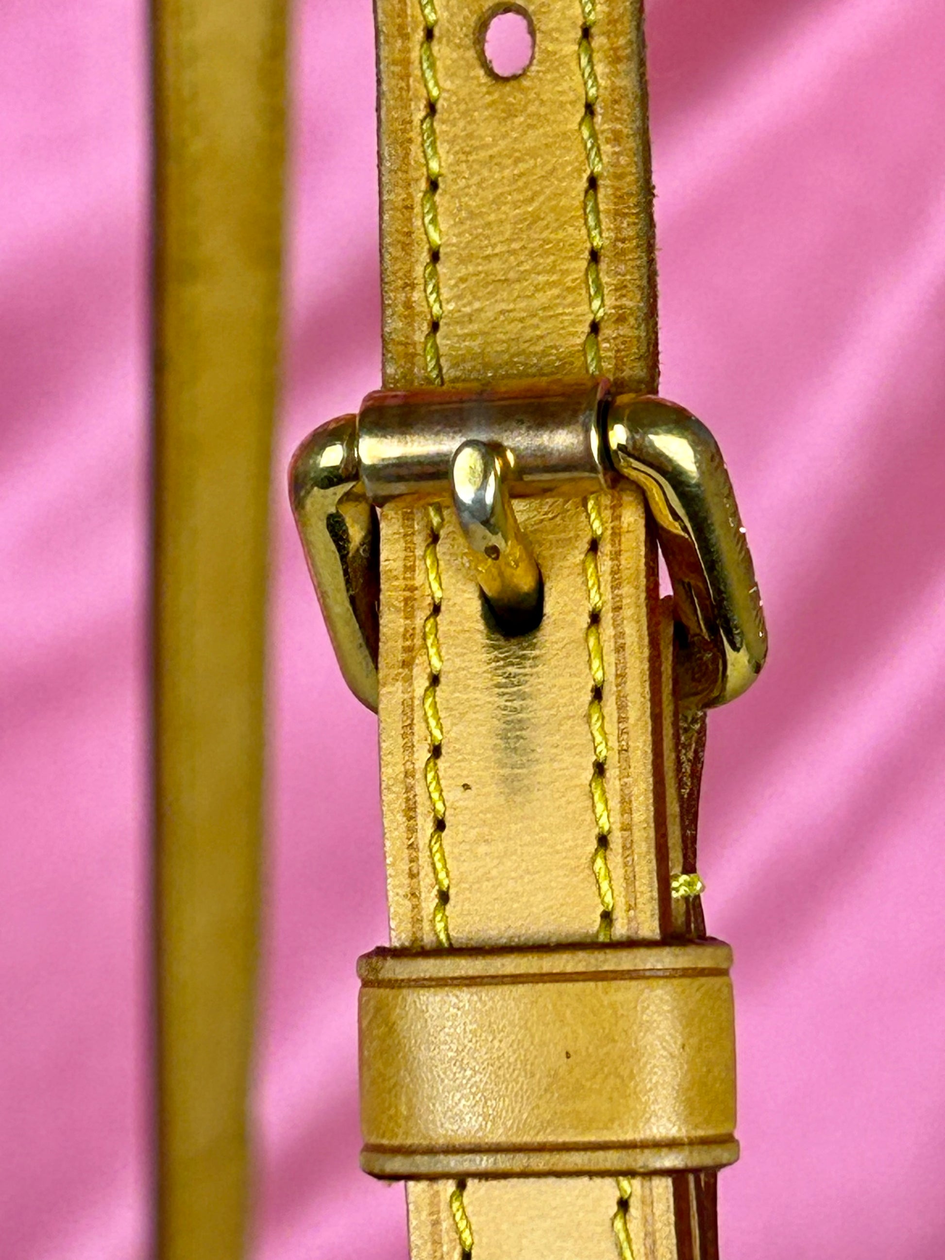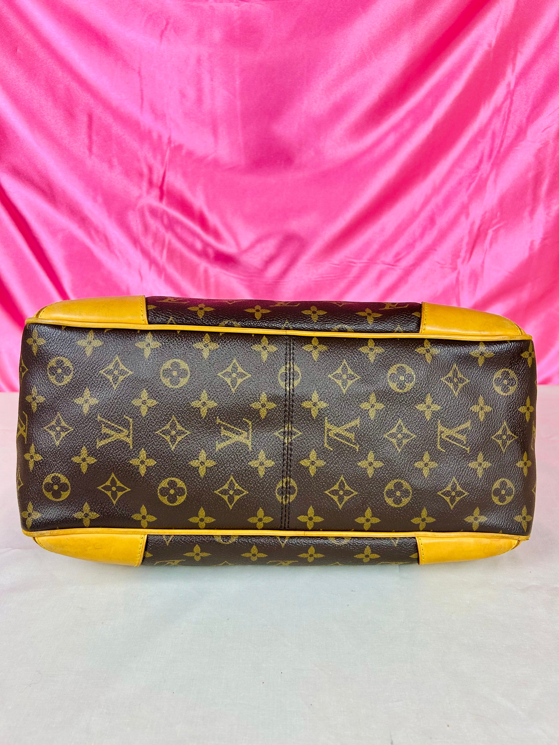 š Description: Canvas is in beautiful condition with no cracks or tears. Piping shows some wear on the bottom corners with one small area of exposure. Top leather trim has light wrinkling and normal wear. Leather handles are in great condition with slight marking but no cracks or tears. Chapes are strong and intact with some surface marks. Leather shoulder strap is in great condition with minimal signs of wear. Interior and interior pocket are clean with a few small markings. Hardware remains shiny.