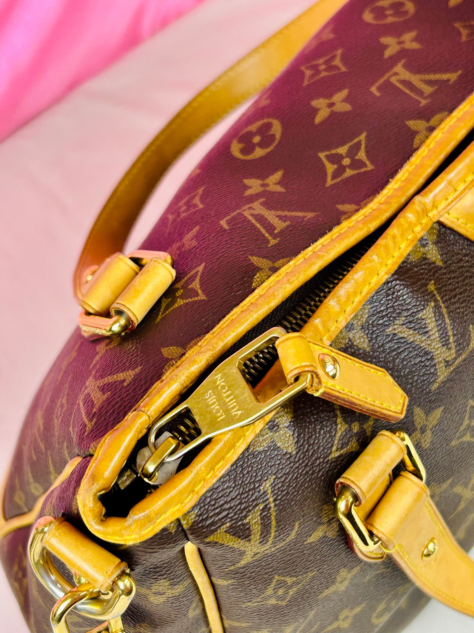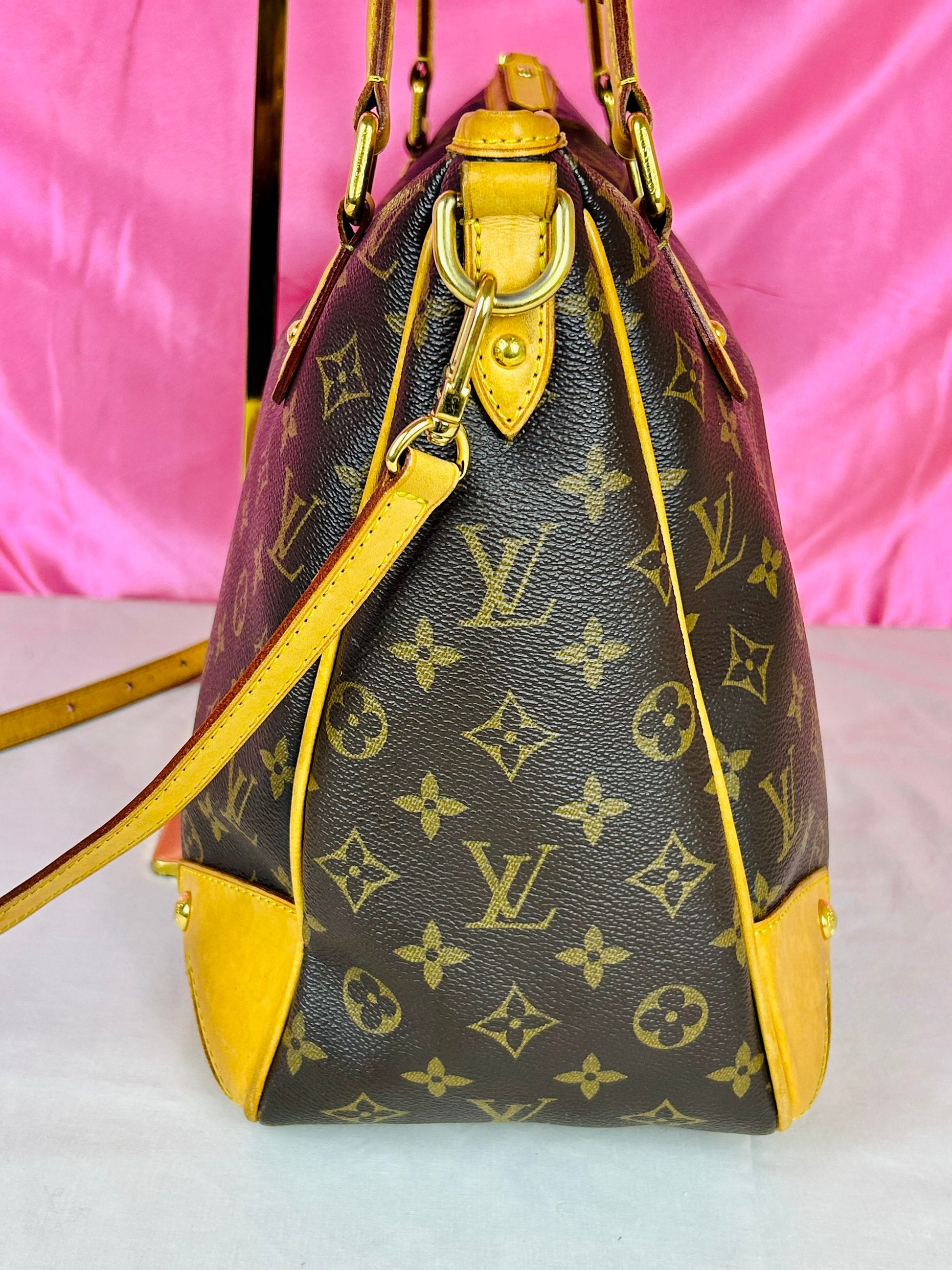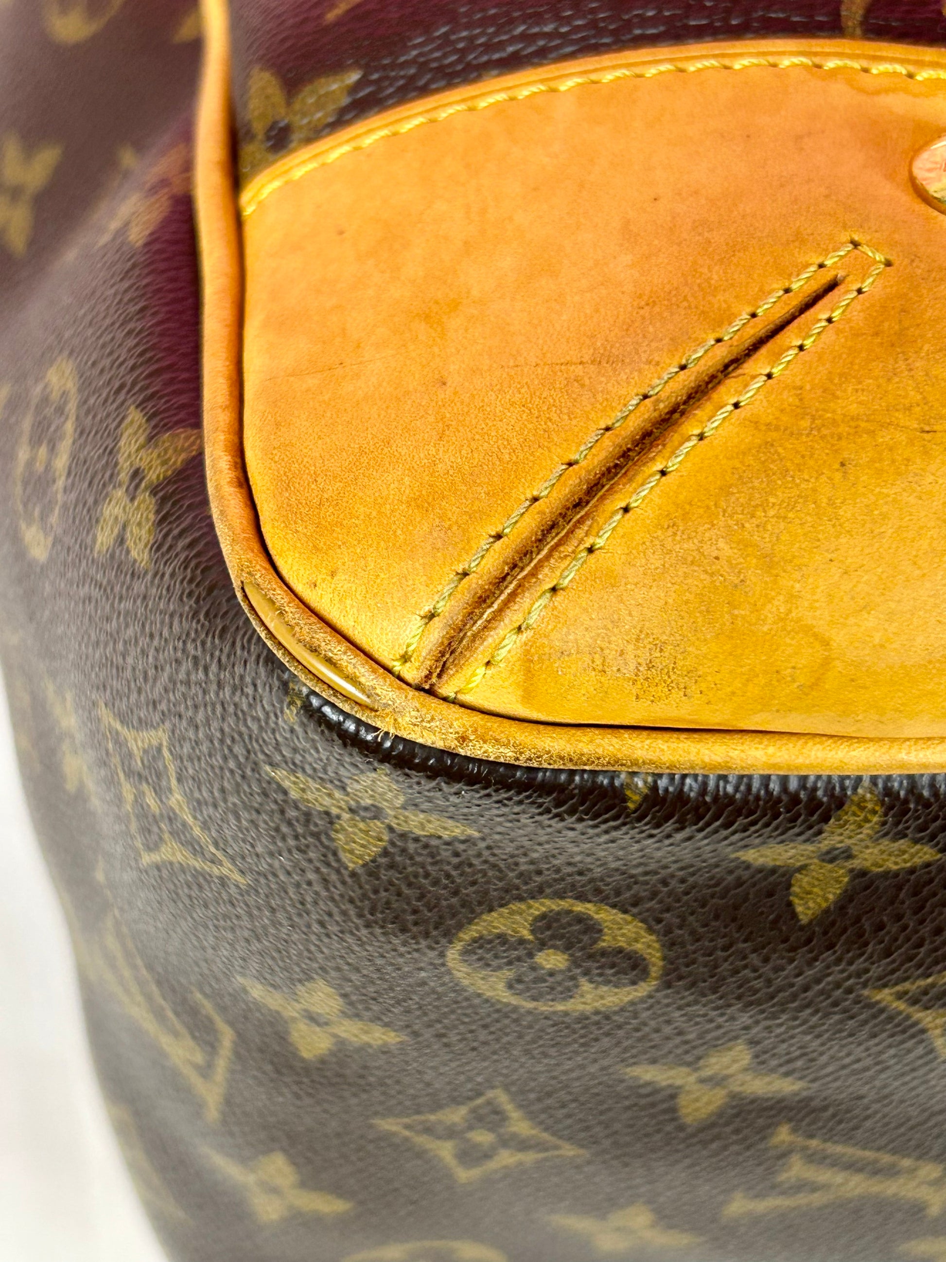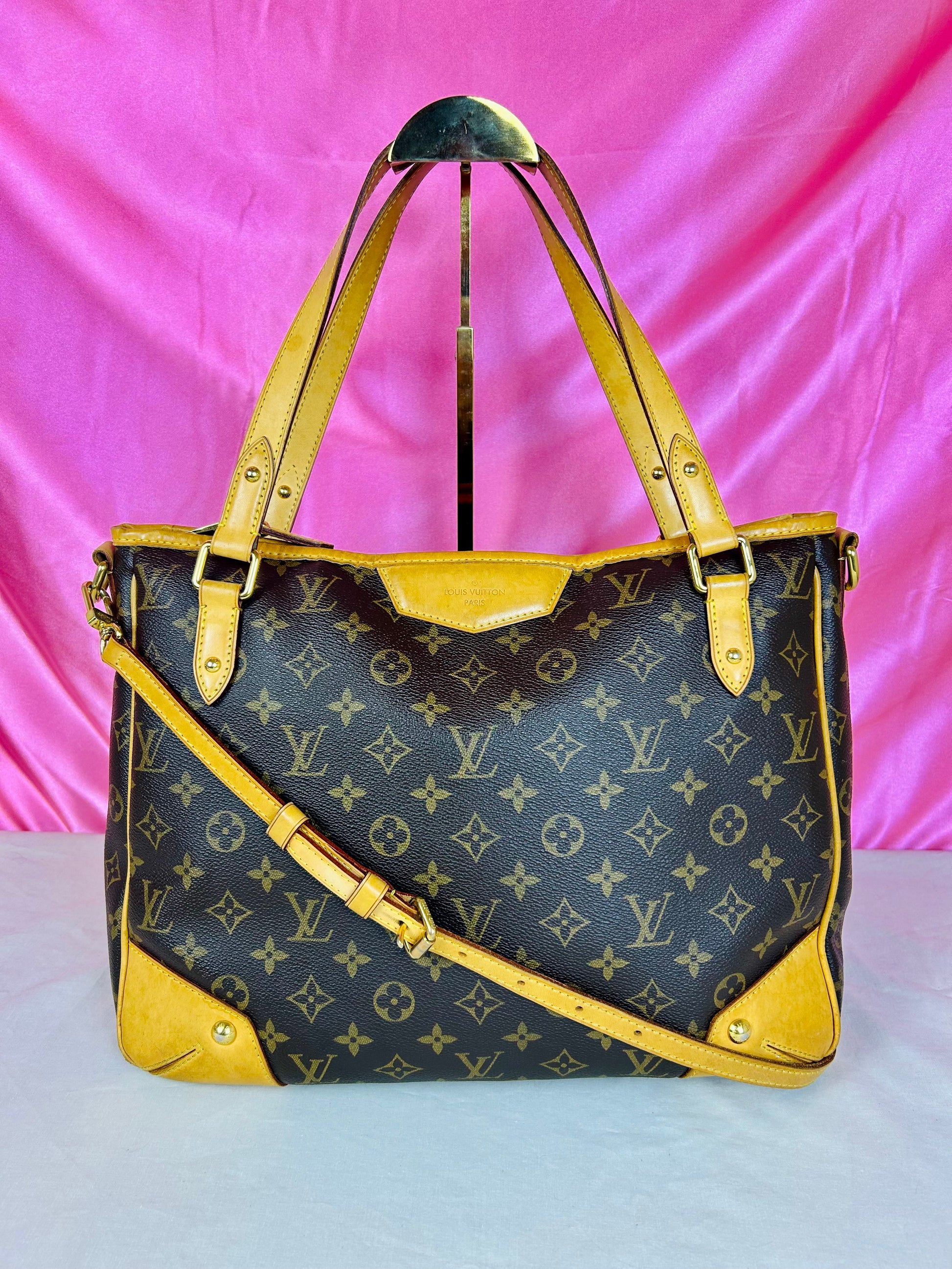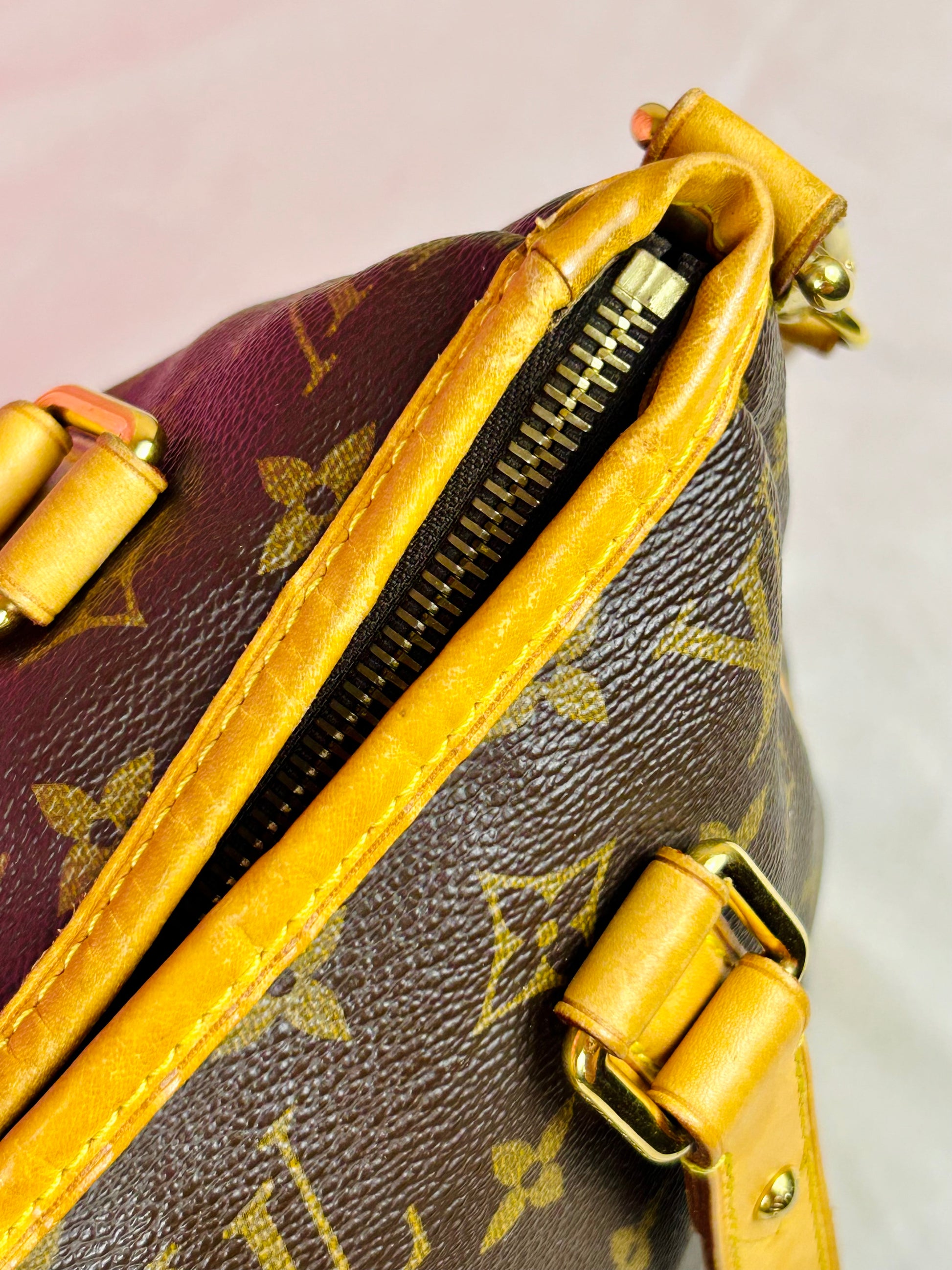 š Description: Canvas is in beautiful condition with no cracks or tears. Piping shows some wear on the bottom corners with one small area of exposure. Top leather trim has light wrinkling and normal wear. Leather handles are in great condition with slight marking but no cracks or tears. Chapes are strong and intact with some surface marks. Leather shoulder strap is in great condition with minimal signs of wear. Interior and interior pocket are clean with a few small markings. Hardware remains shiny.