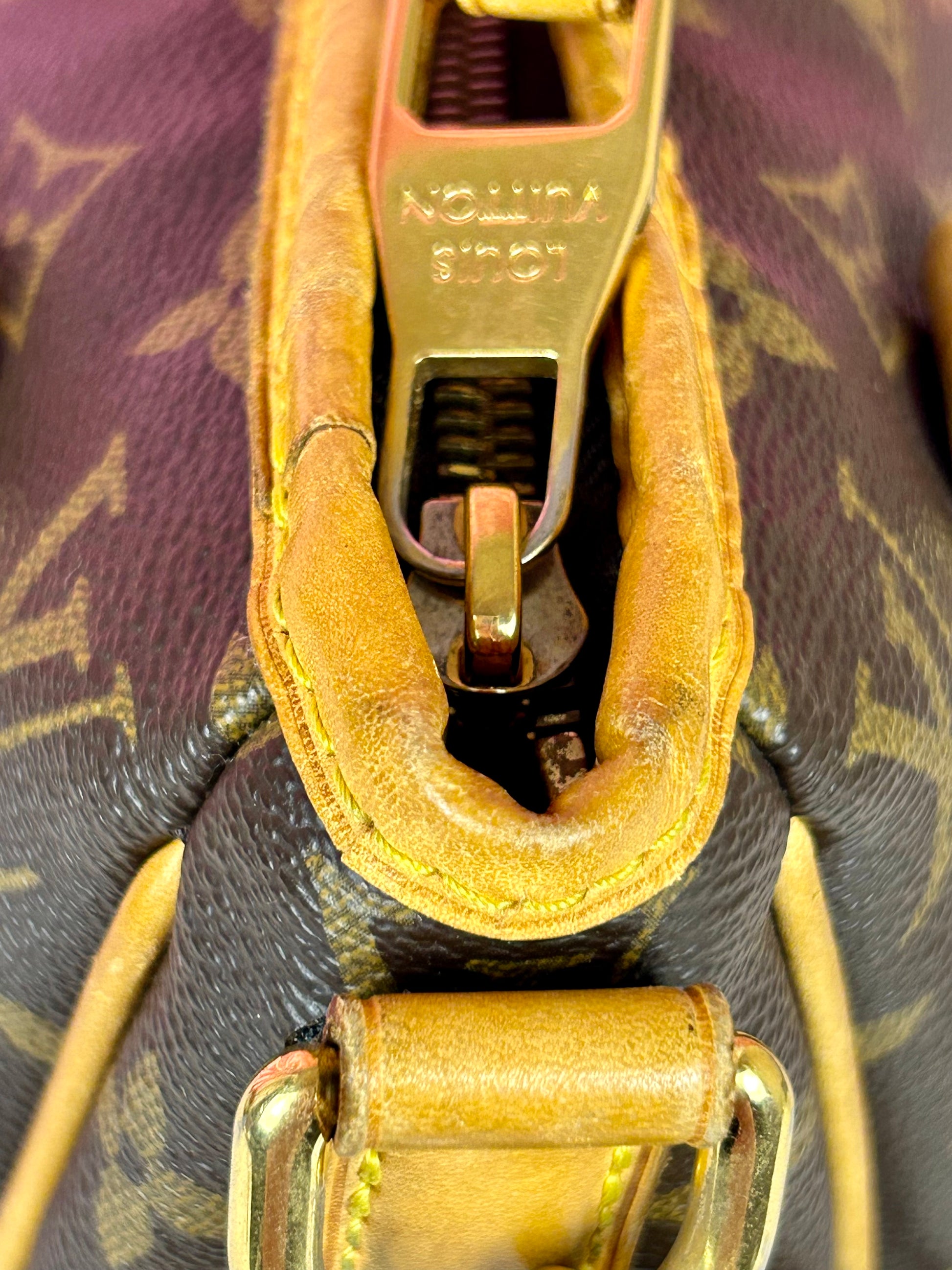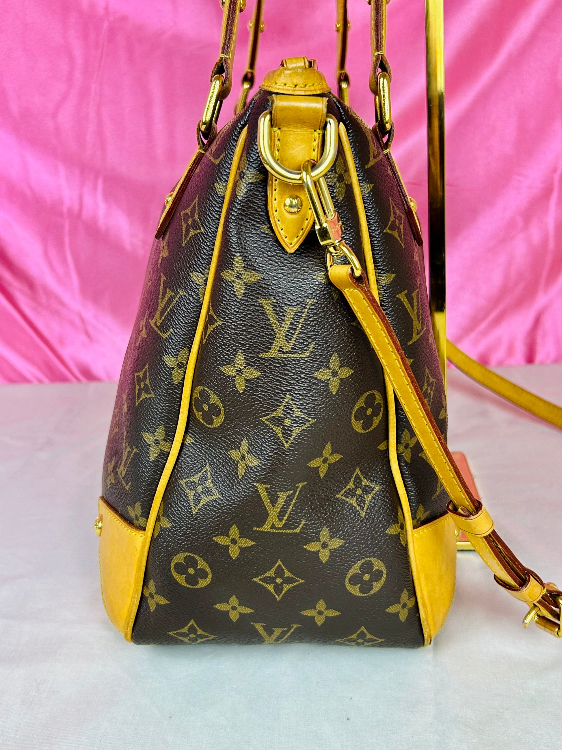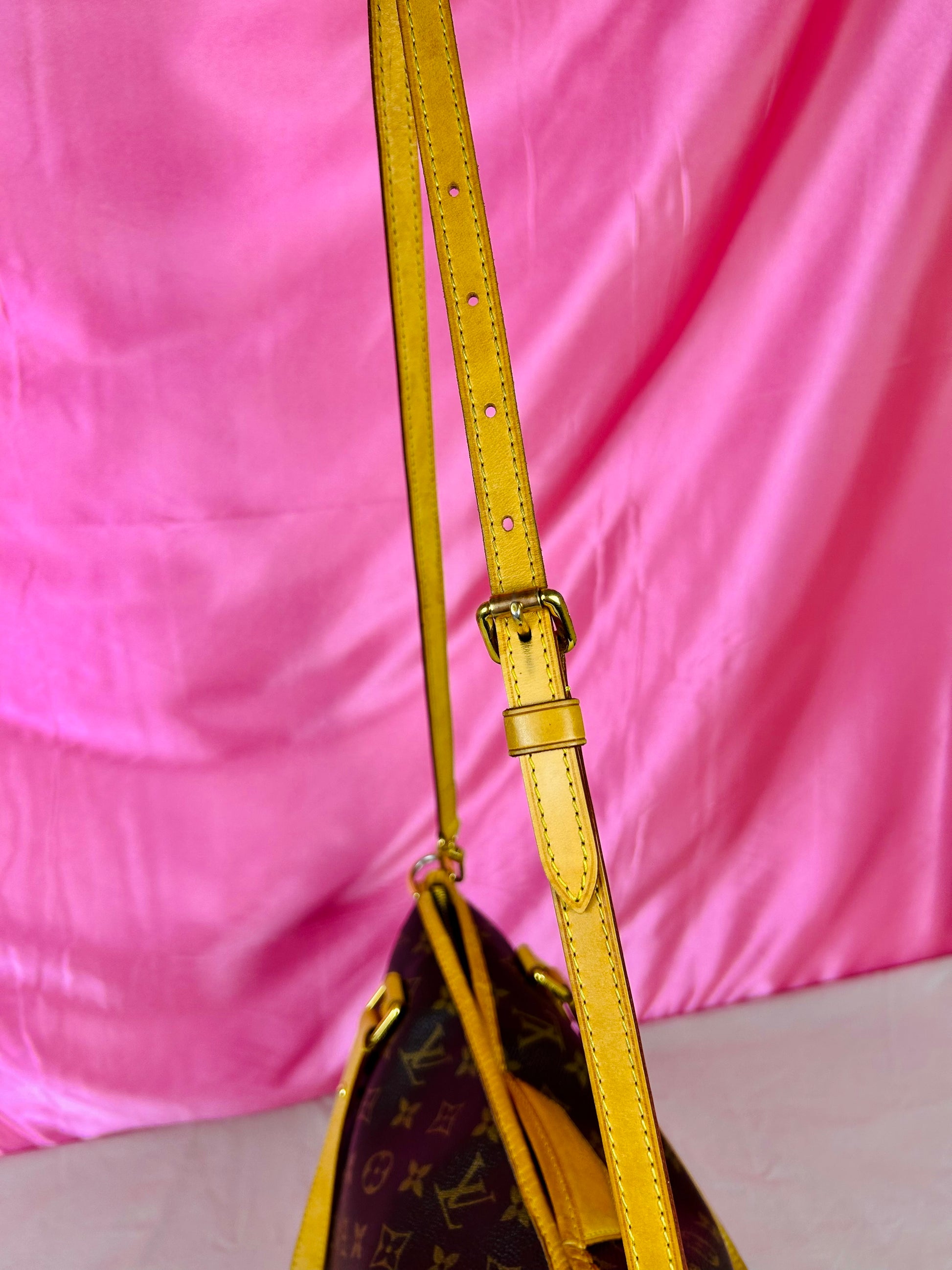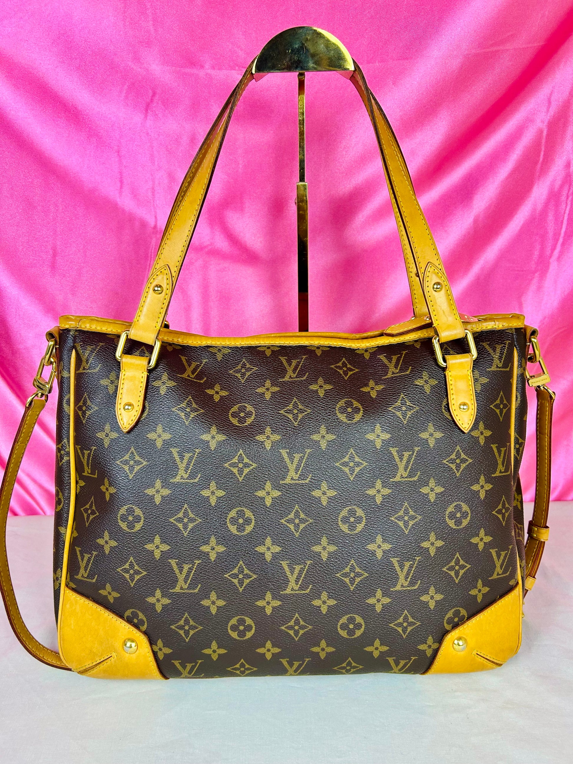 š Description: Canvas is in beautiful condition with no cracks or tears. Piping shows some wear on the bottom corners with one small area of exposure. Top leather trim has light wrinkling and normal wear. Leather handles are in great condition with slight marking but no cracks or tears. Chapes are strong and intact with some surface marks. Leather shoulder strap is in great condition with minimal signs of wear. Interior and interior pocket are clean with a few small markings. Hardware remains shiny.