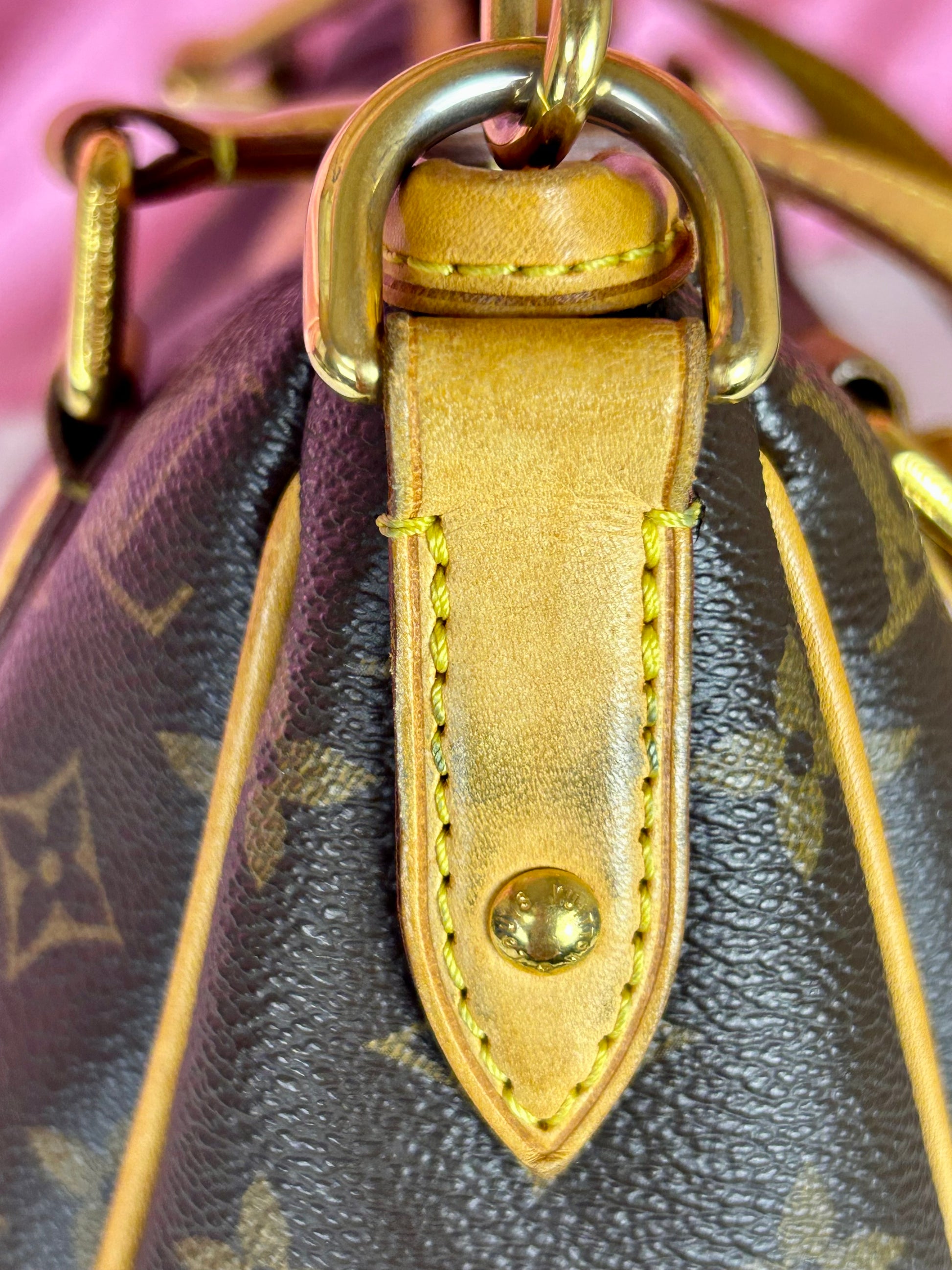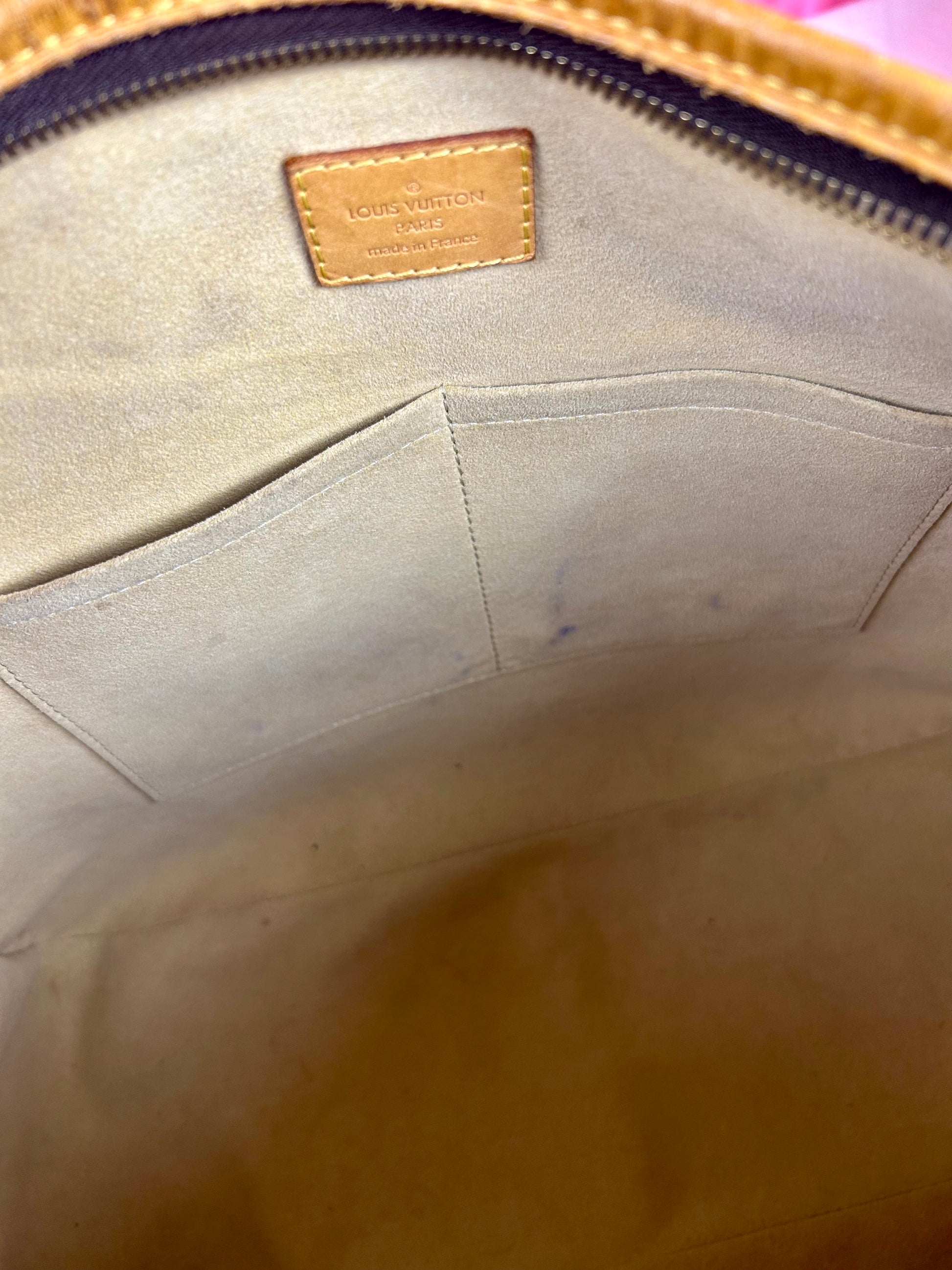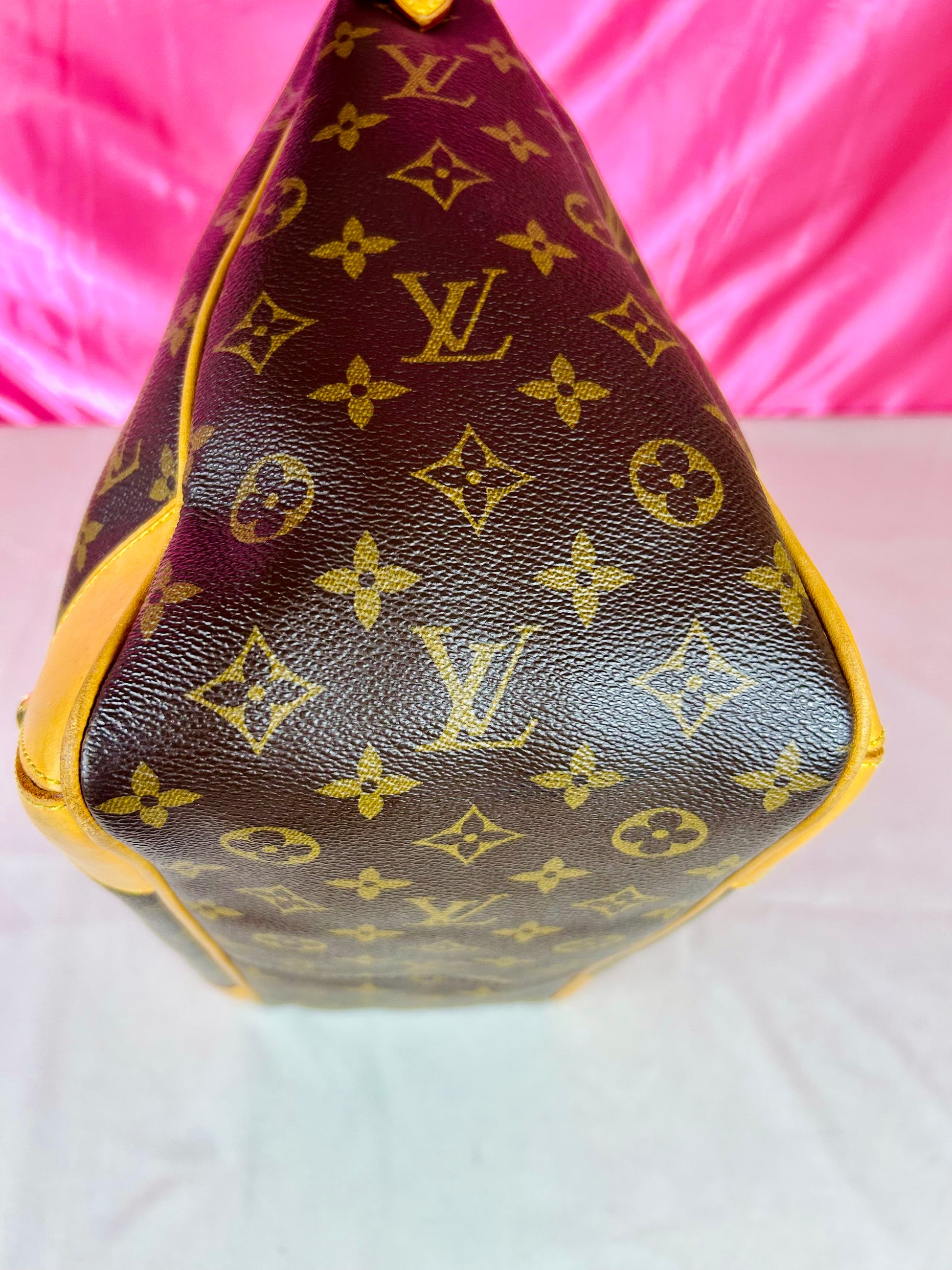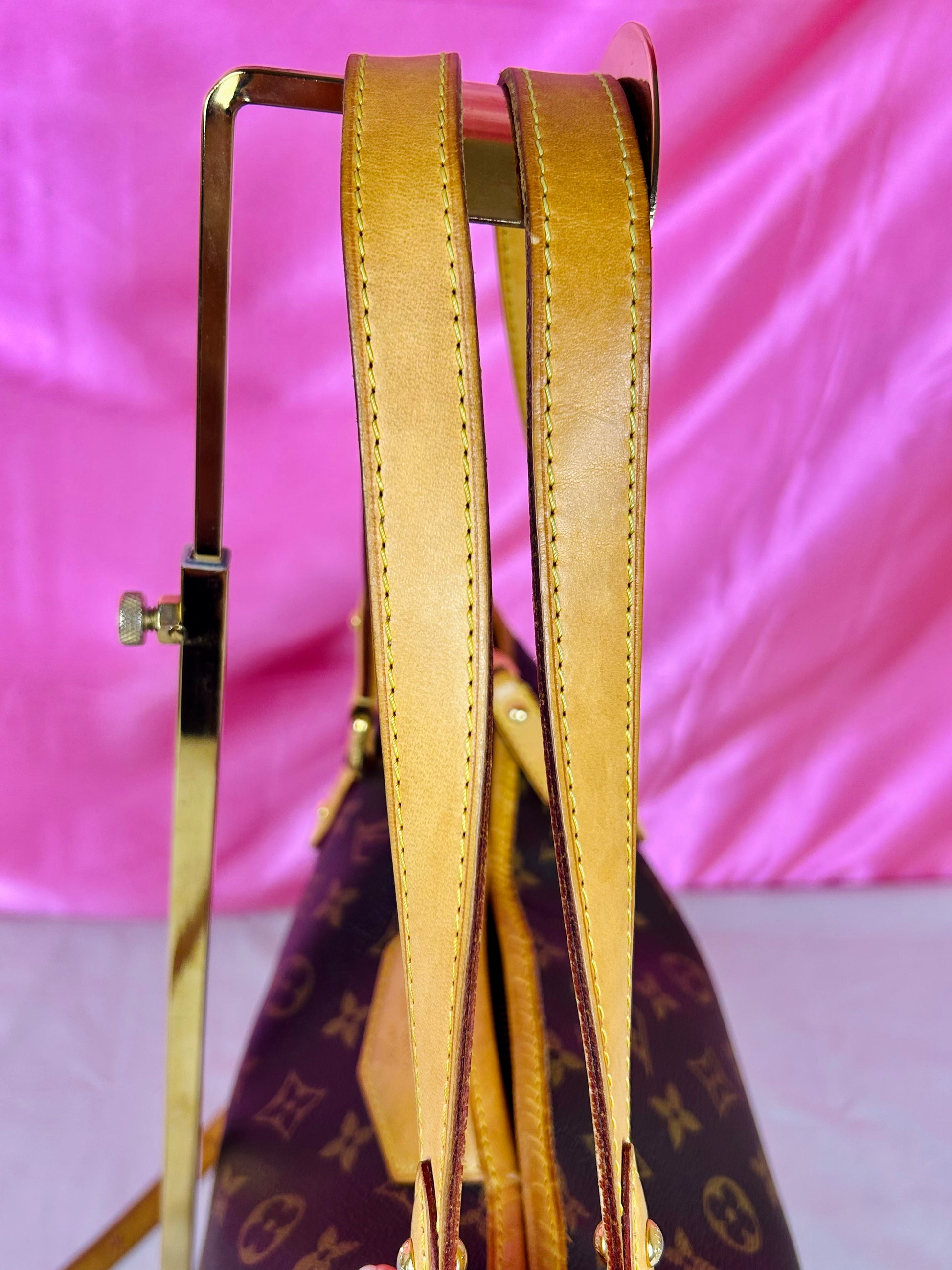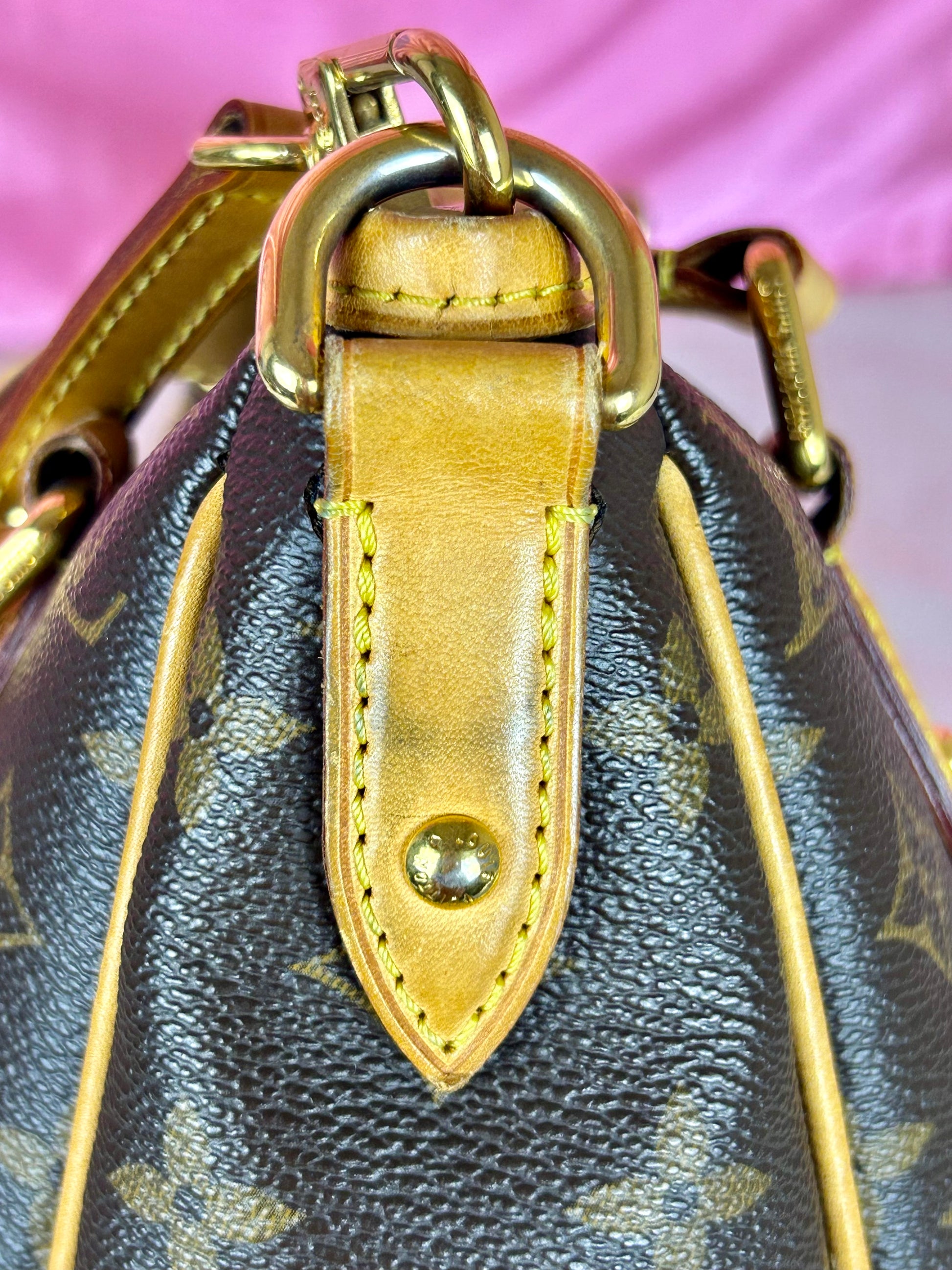 š Description: Canvas is in beautiful condition with no cracks or tears. Piping shows some wear on the bottom corners with one small area of exposure. Top leather trim has light wrinkling and normal wear. Leather handles are in great condition with slight marking but no cracks or tears. Chapes are strong and intact with some surface marks. Leather shoulder strap is in great condition with minimal signs of wear. Interior and interior pocket are clean with a few small markings. Hardware remains shiny.