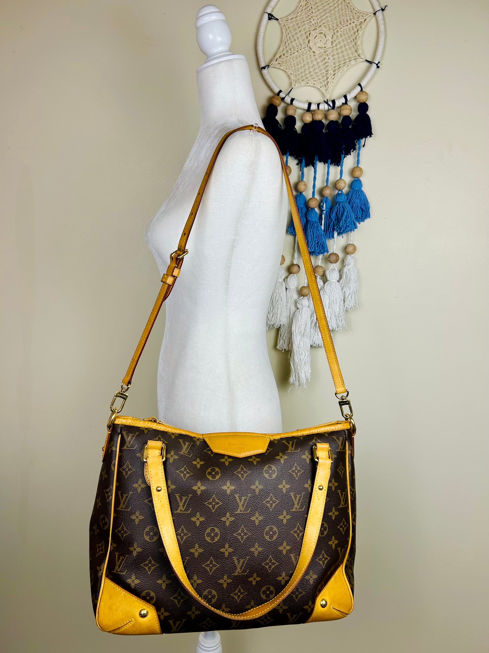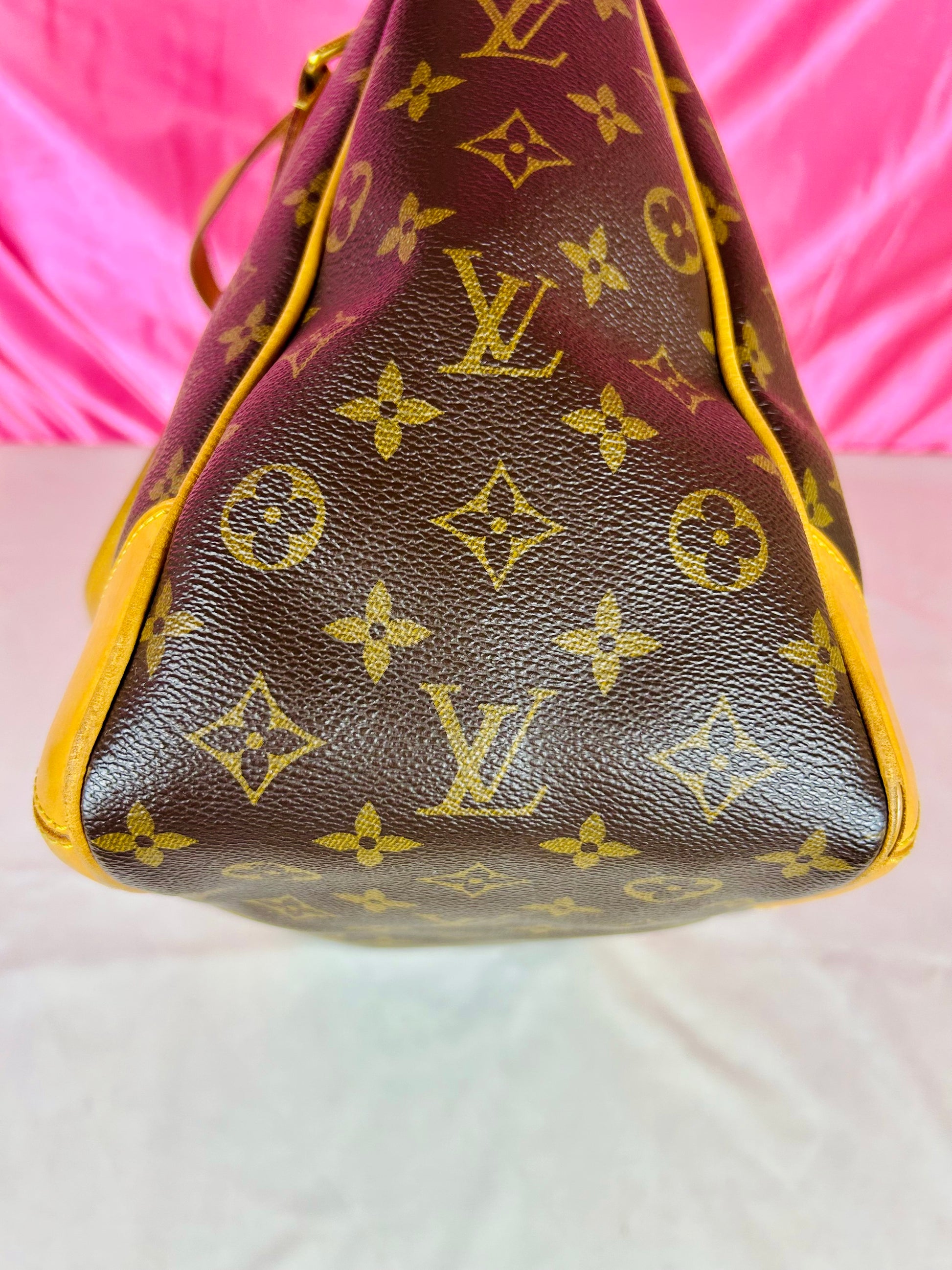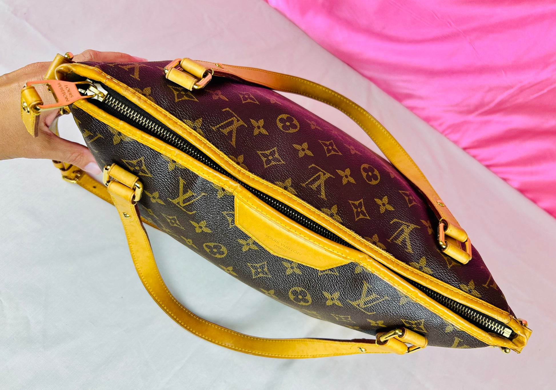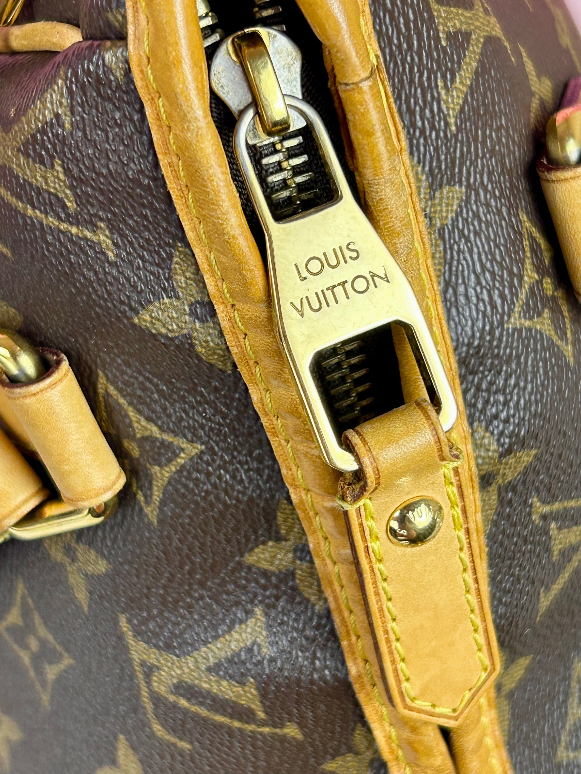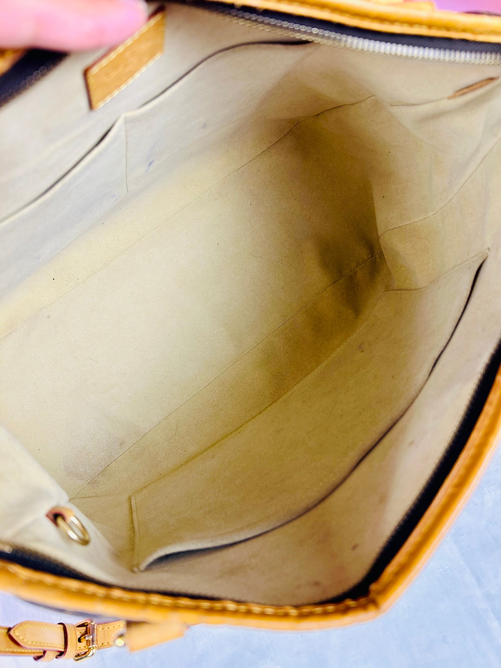 š Description: Canvas is in beautiful condition with no cracks or tears. Piping shows some wear on the bottom corners with one small area of exposure. Top leather trim has light wrinkling and normal wear. Leather handles are in great condition with slight marking but no cracks or tears. Chapes are strong and intact with some surface marks. Leather shoulder strap is in great condition with minimal signs of wear. Interior and interior pocket are clean with a few small markings. Hardware remains shiny.