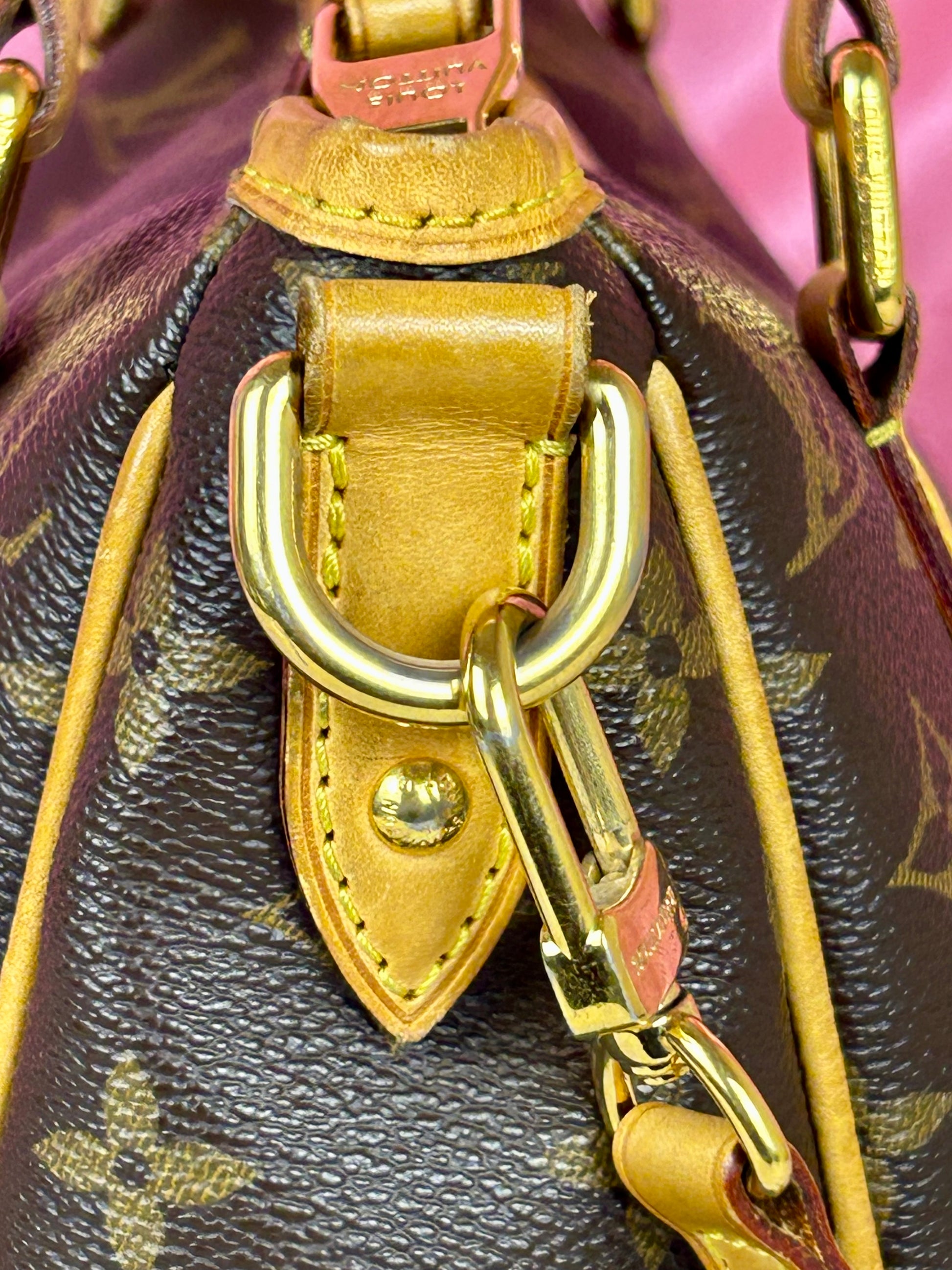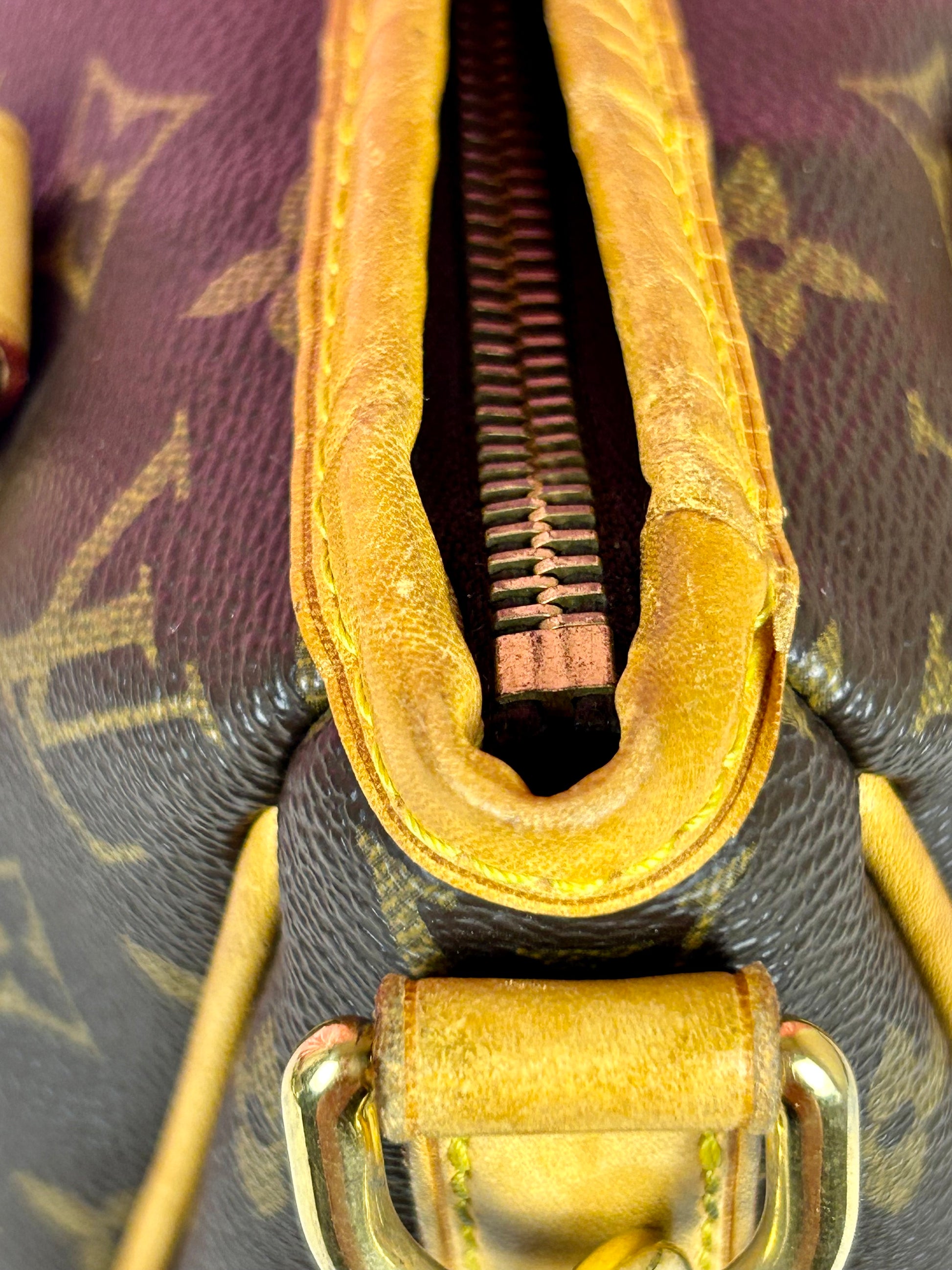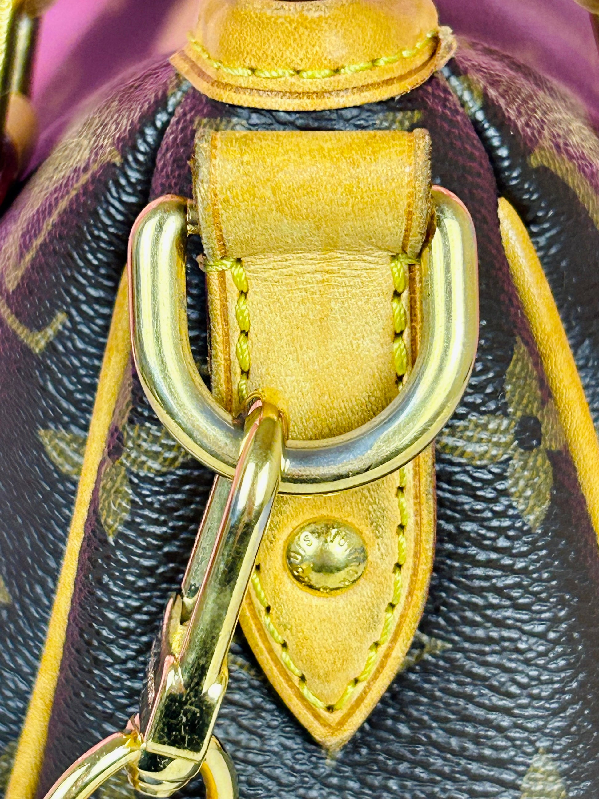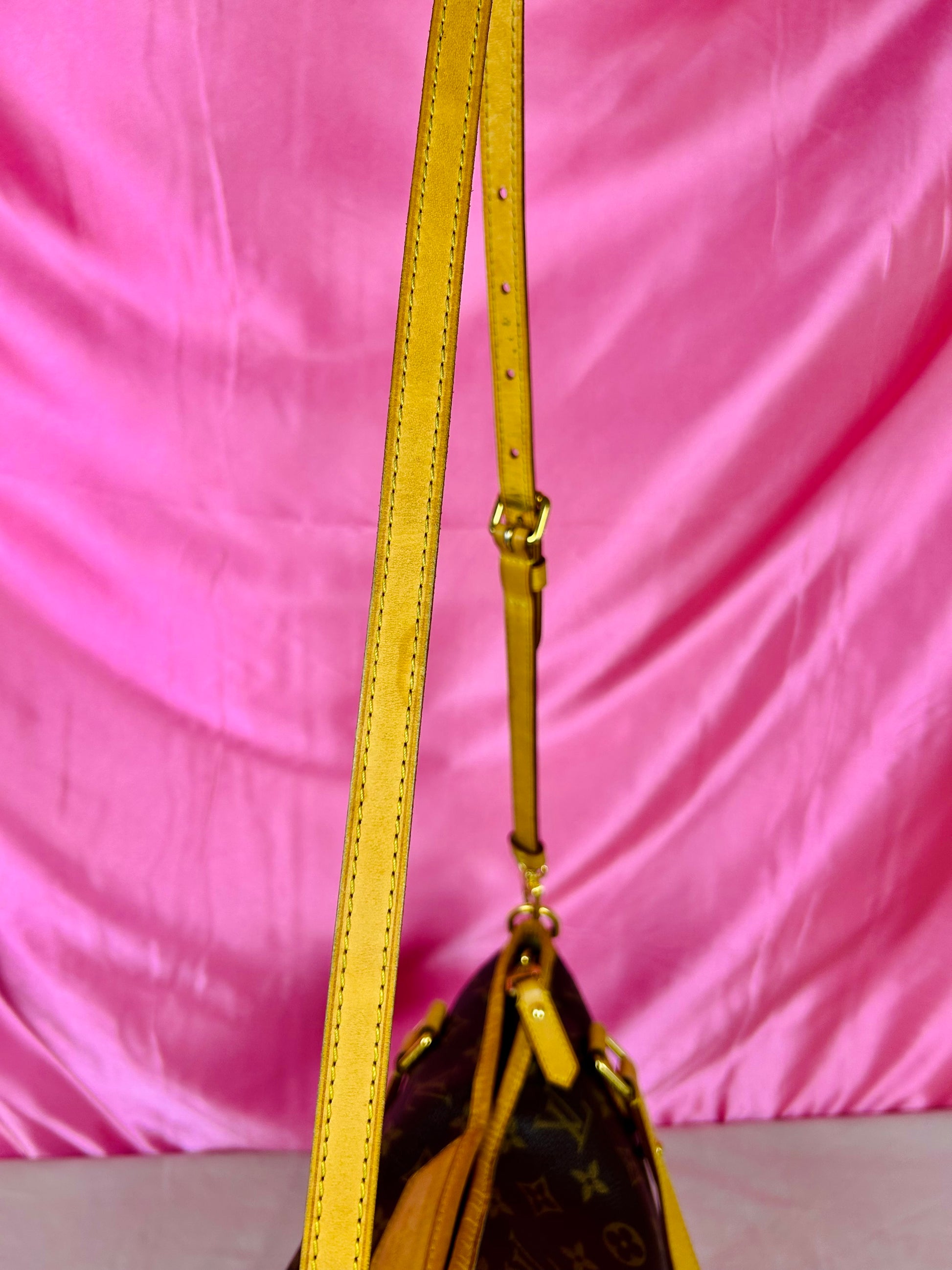 š Description: Canvas is in beautiful condition with no cracks or tears. Piping shows some wear on the bottom corners with one small area of exposure. Top leather trim has light wrinkling and normal wear. Leather handles are in great condition with slight marking but no cracks or tears. Chapes are strong and intact with some surface marks. Leather shoulder strap is in great condition with minimal signs of wear. Interior and interior pocket are clean with a few small markings. Hardware remains shiny.