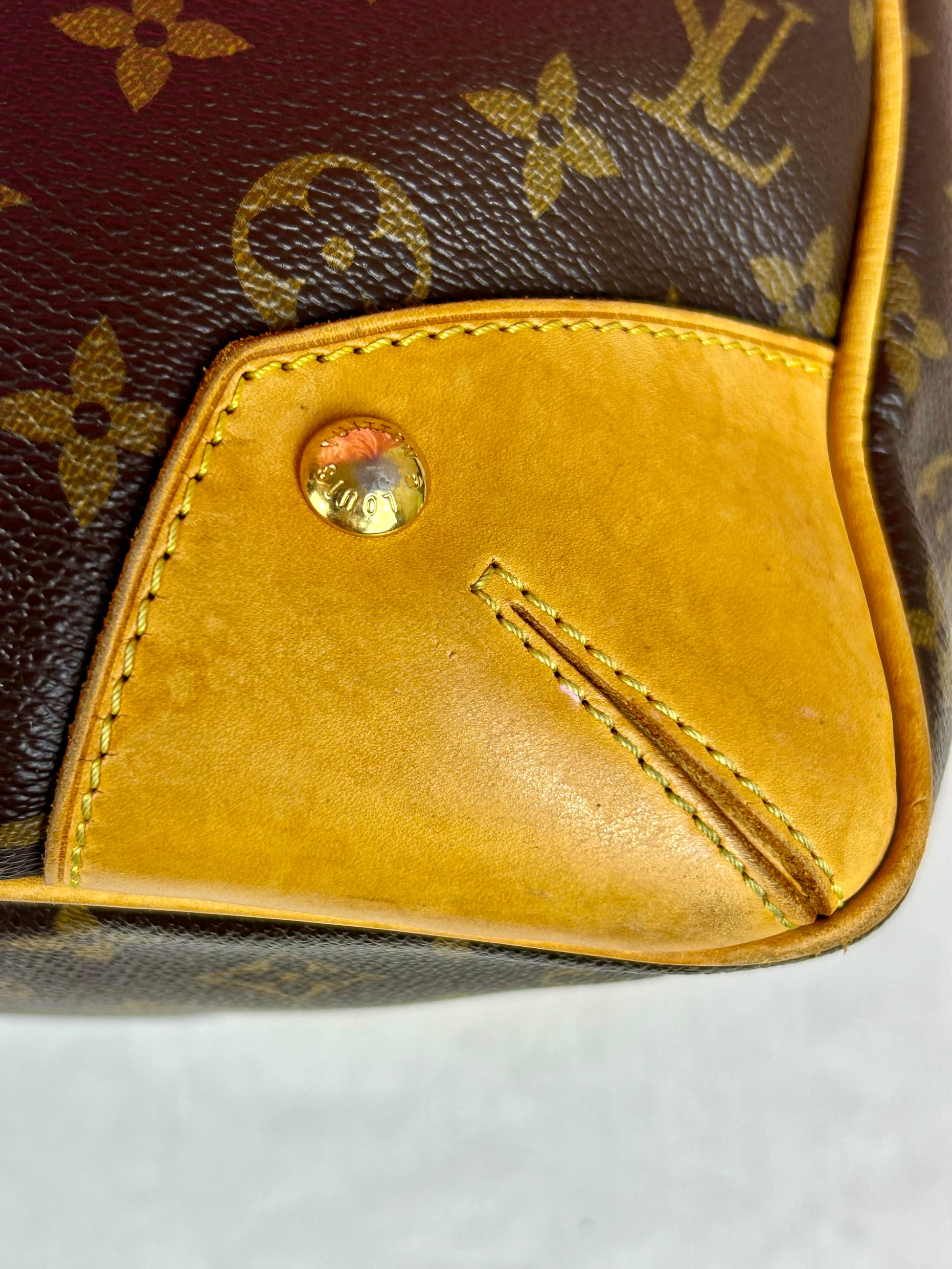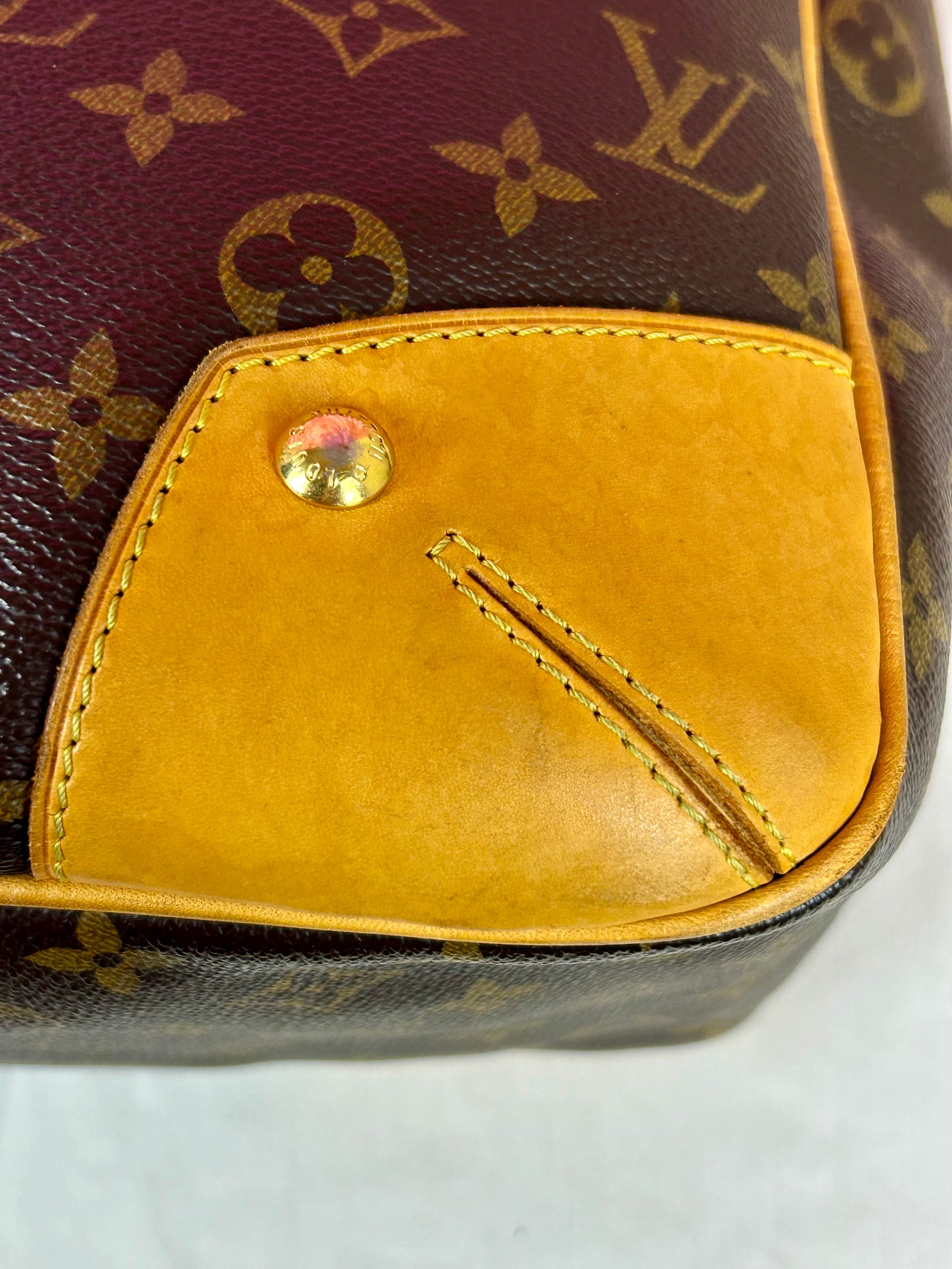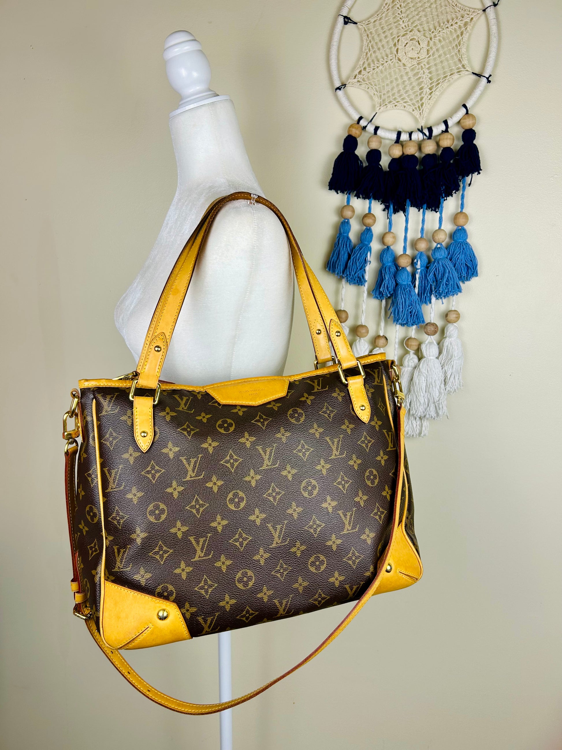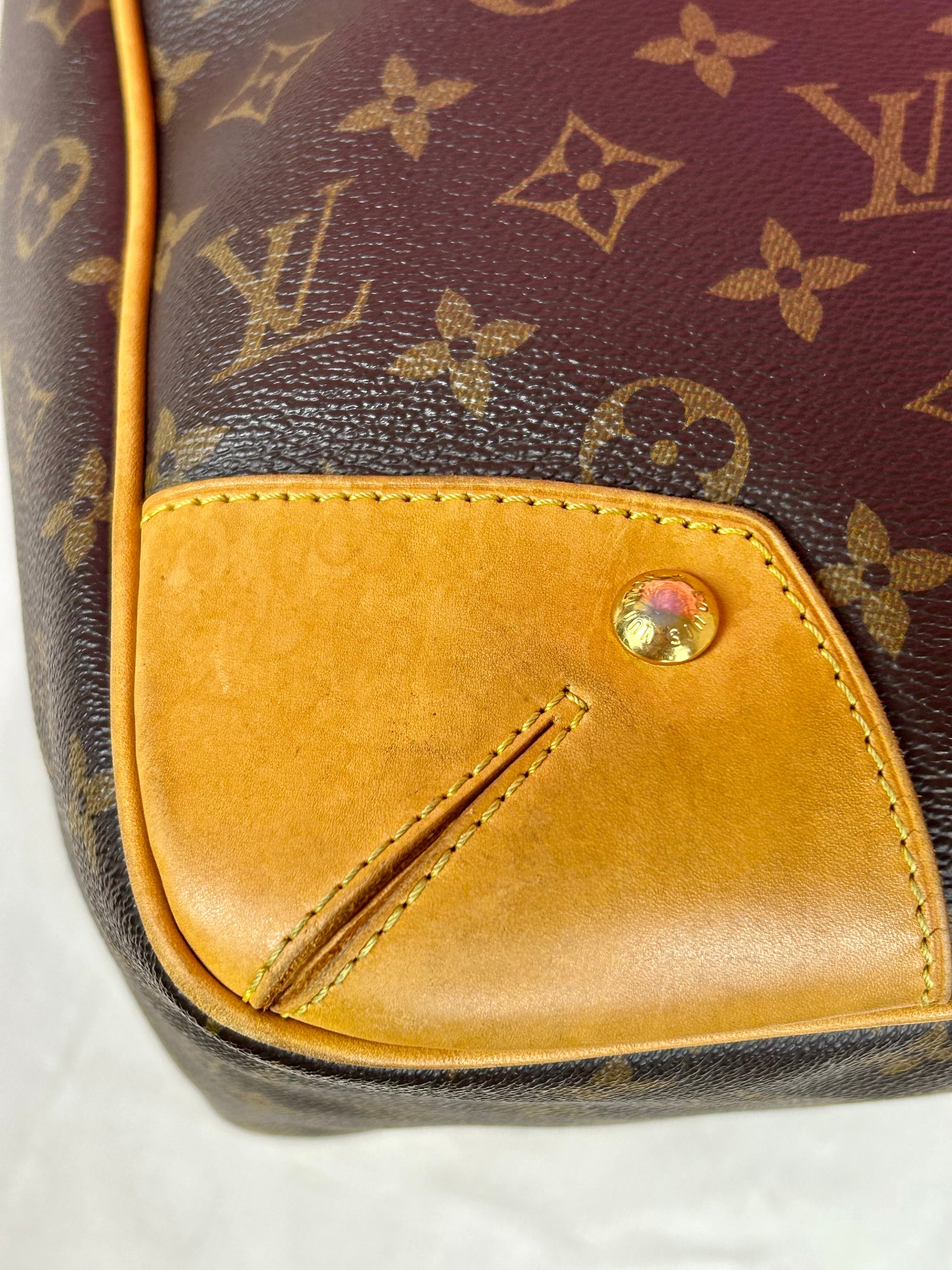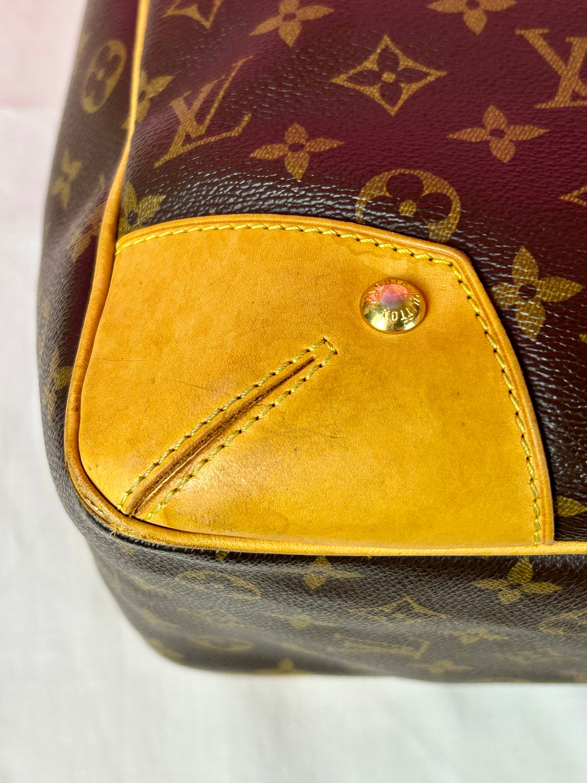 š Description: Canvas is in beautiful condition with no cracks or tears. Piping shows some wear on the bottom corners with one small area of exposure. Top leather trim has light wrinkling and normal wear. Leather handles are in great condition with slight marking but no cracks or tears. Chapes are strong and intact with some surface marks. Leather shoulder strap is in great condition with minimal signs of wear. Interior and interior pocket are clean with a few small markings. Hardware remains shiny.