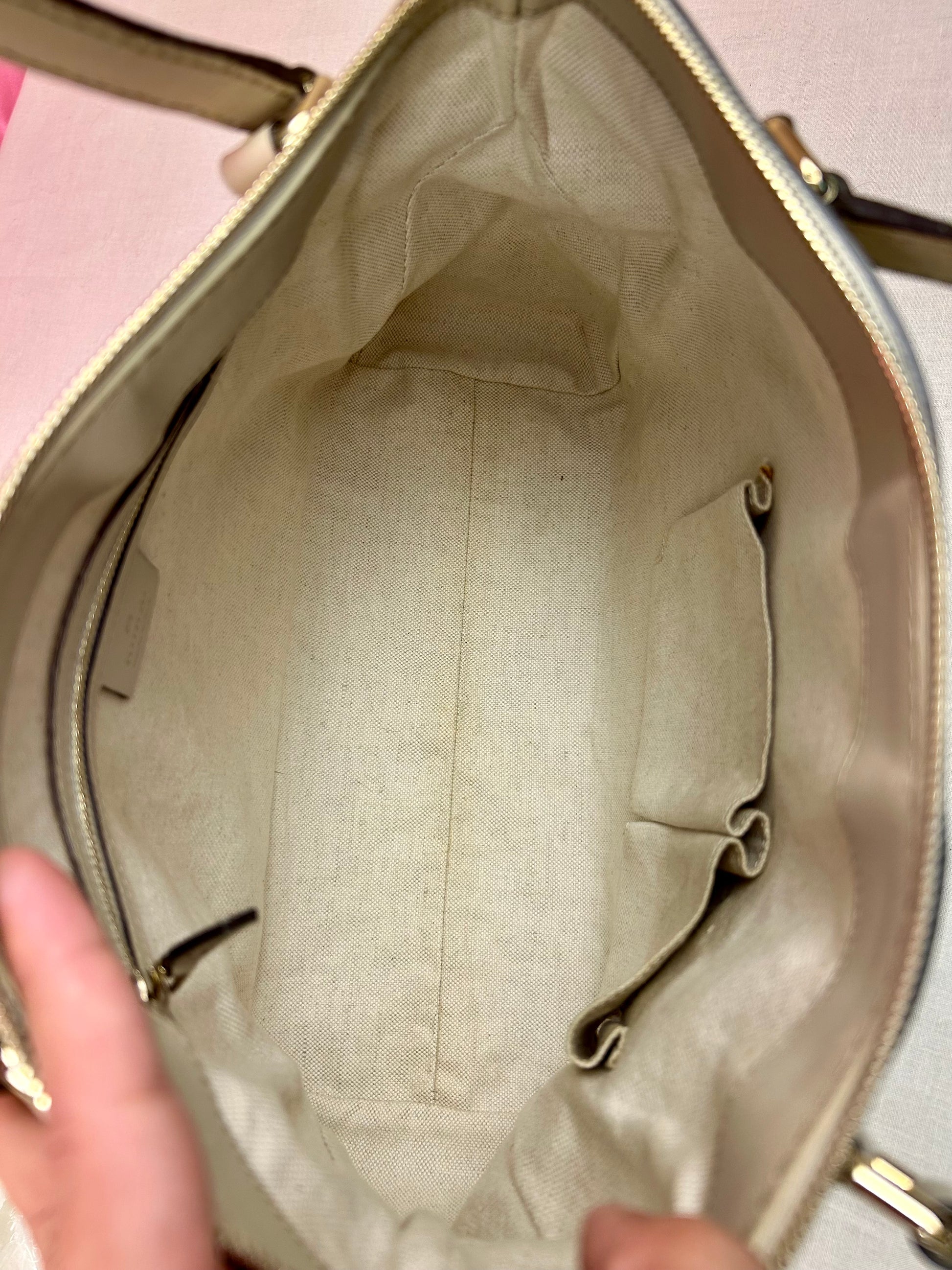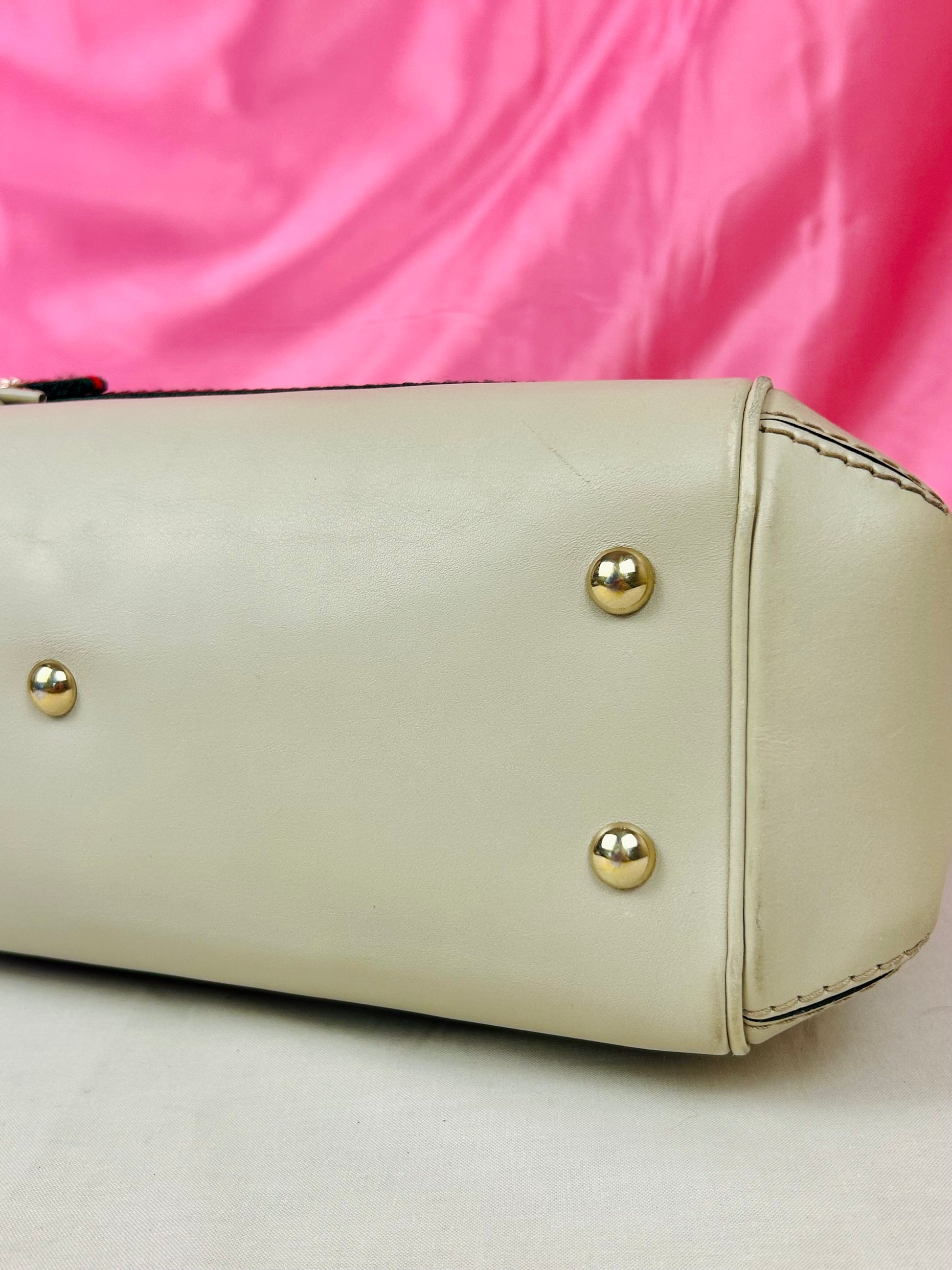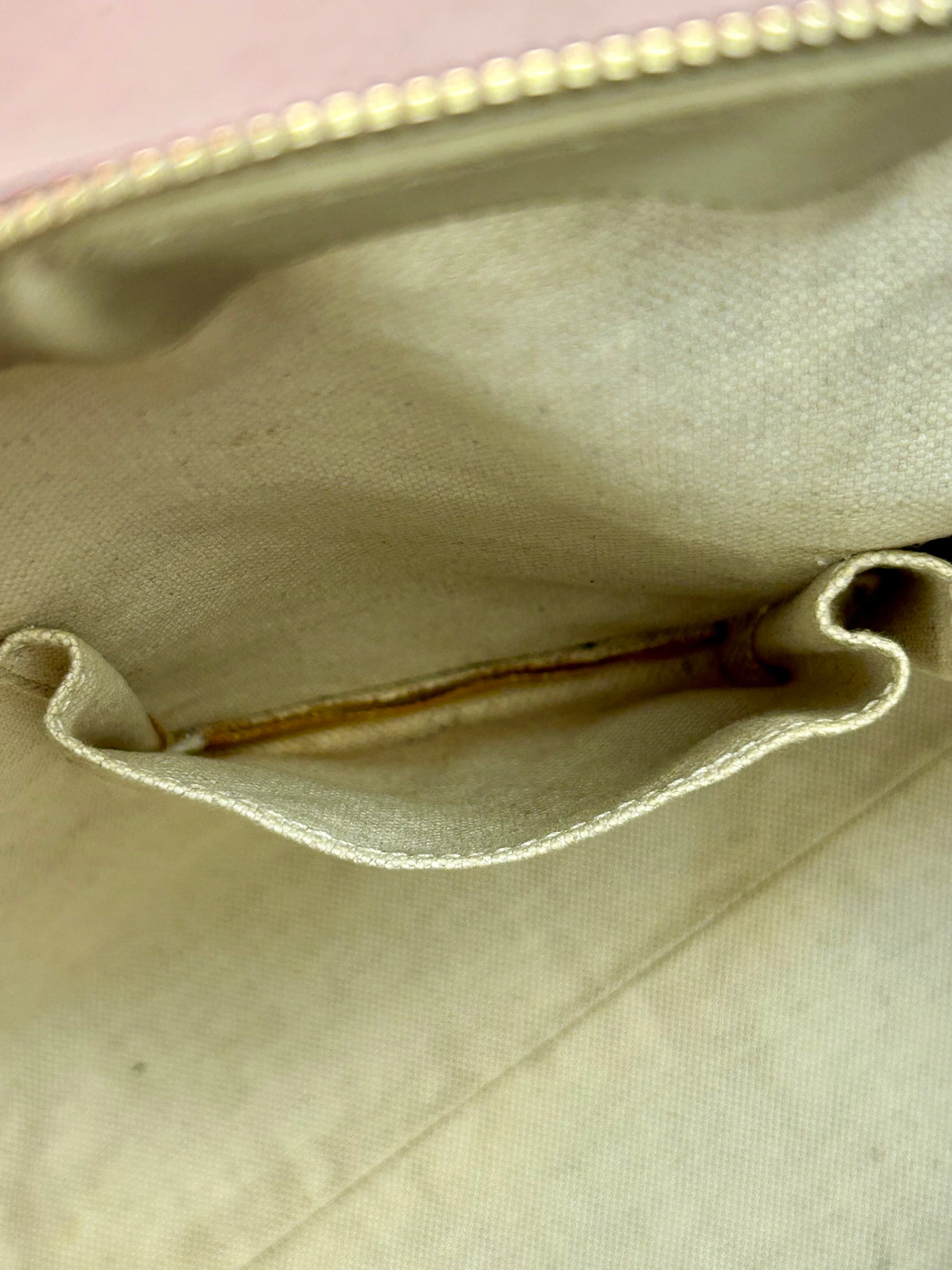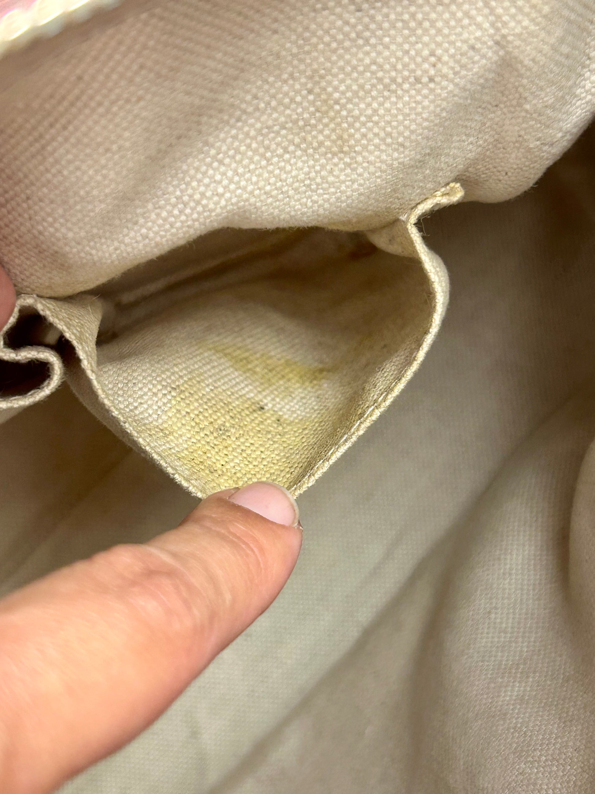 💜 Description: Fabric canvas is in excellent condition with no tears, frays, or stains. White leather trim is in great shape—no tears or cracks—though there is normal scuffing on the bottom corners. Leather handles are strong and intact, with wear on the side glazing. Chapes are strong. Hardware is shiny and functional. Zippers function well. Interior is clean, stains/discoloration inside both slip pockets. Comes with generic crossbody strap.