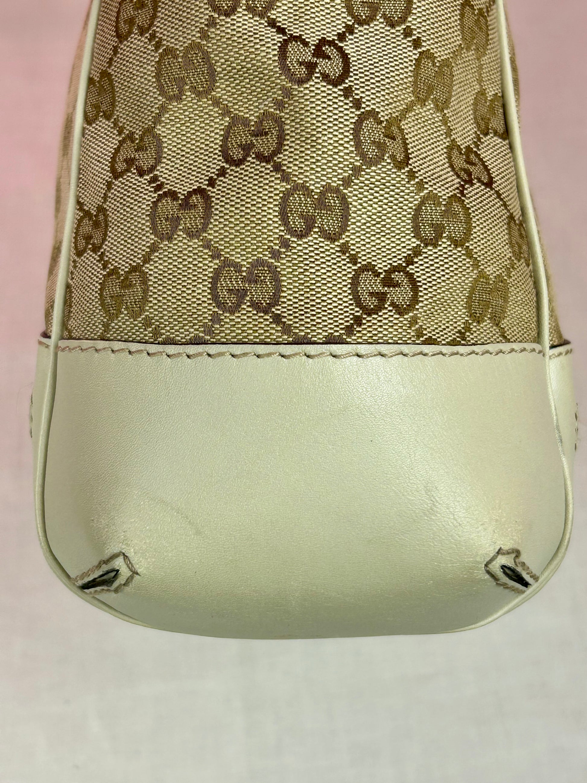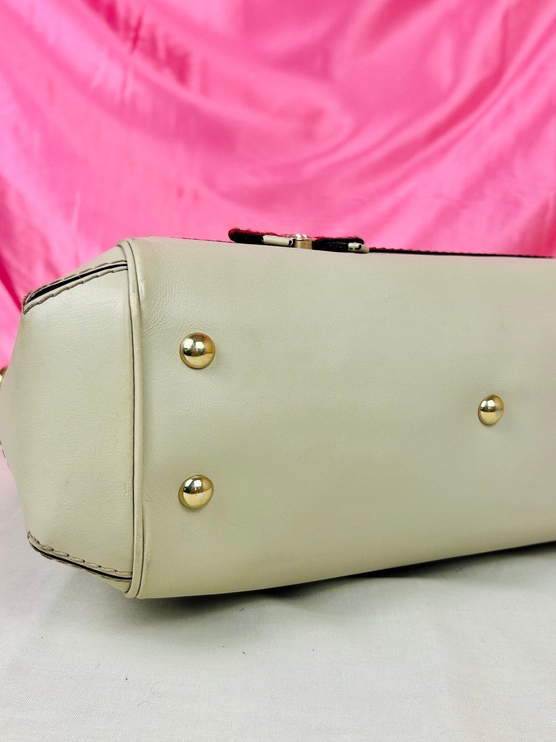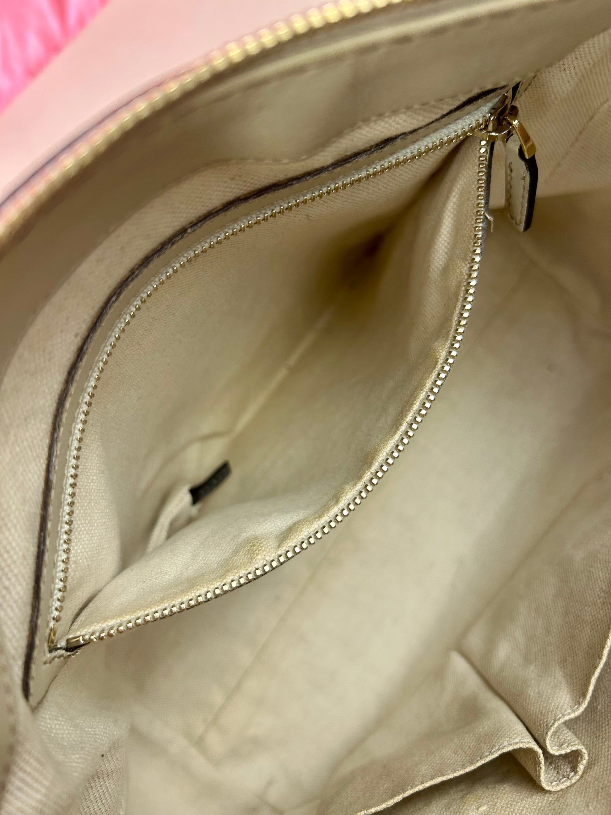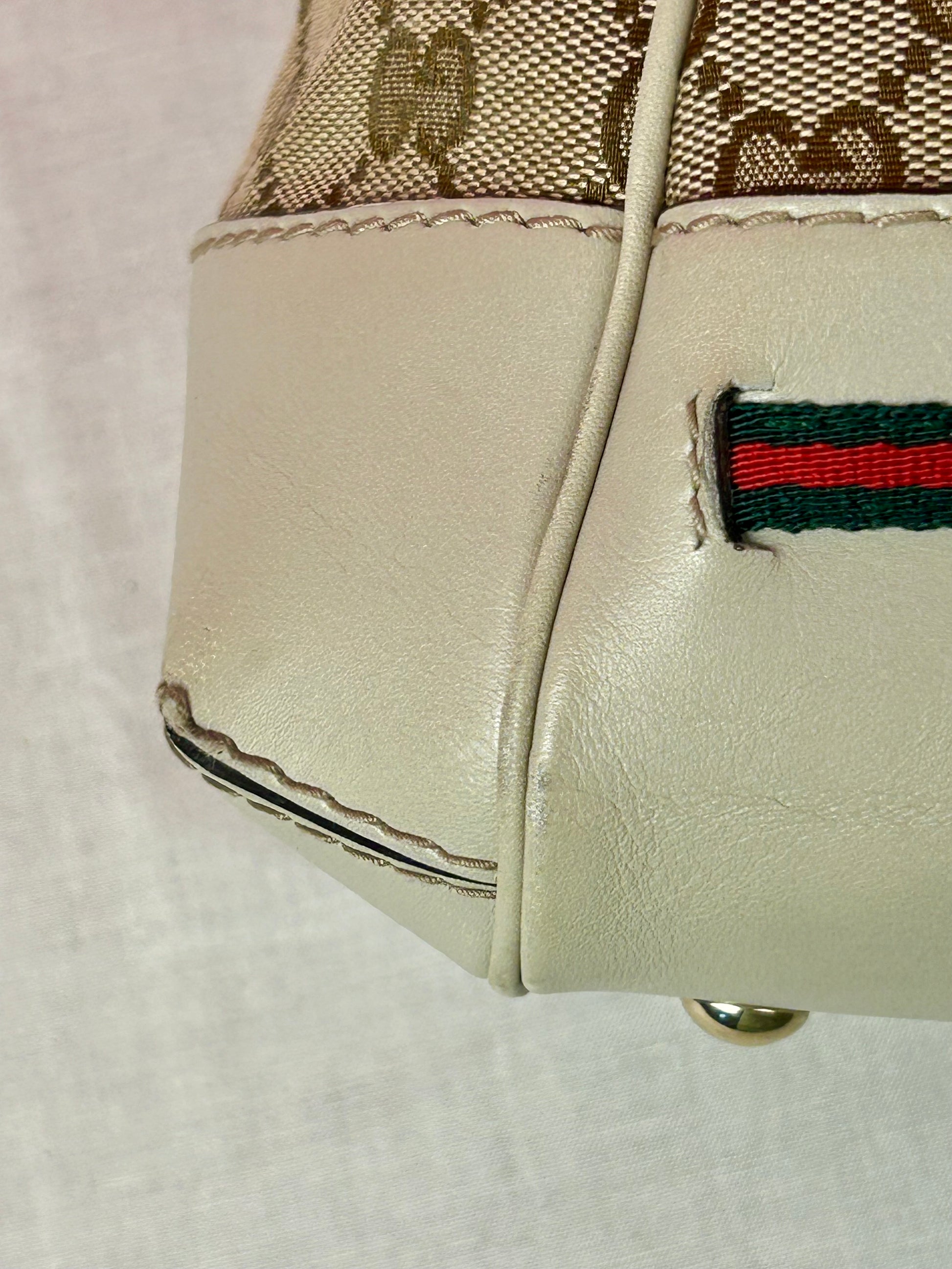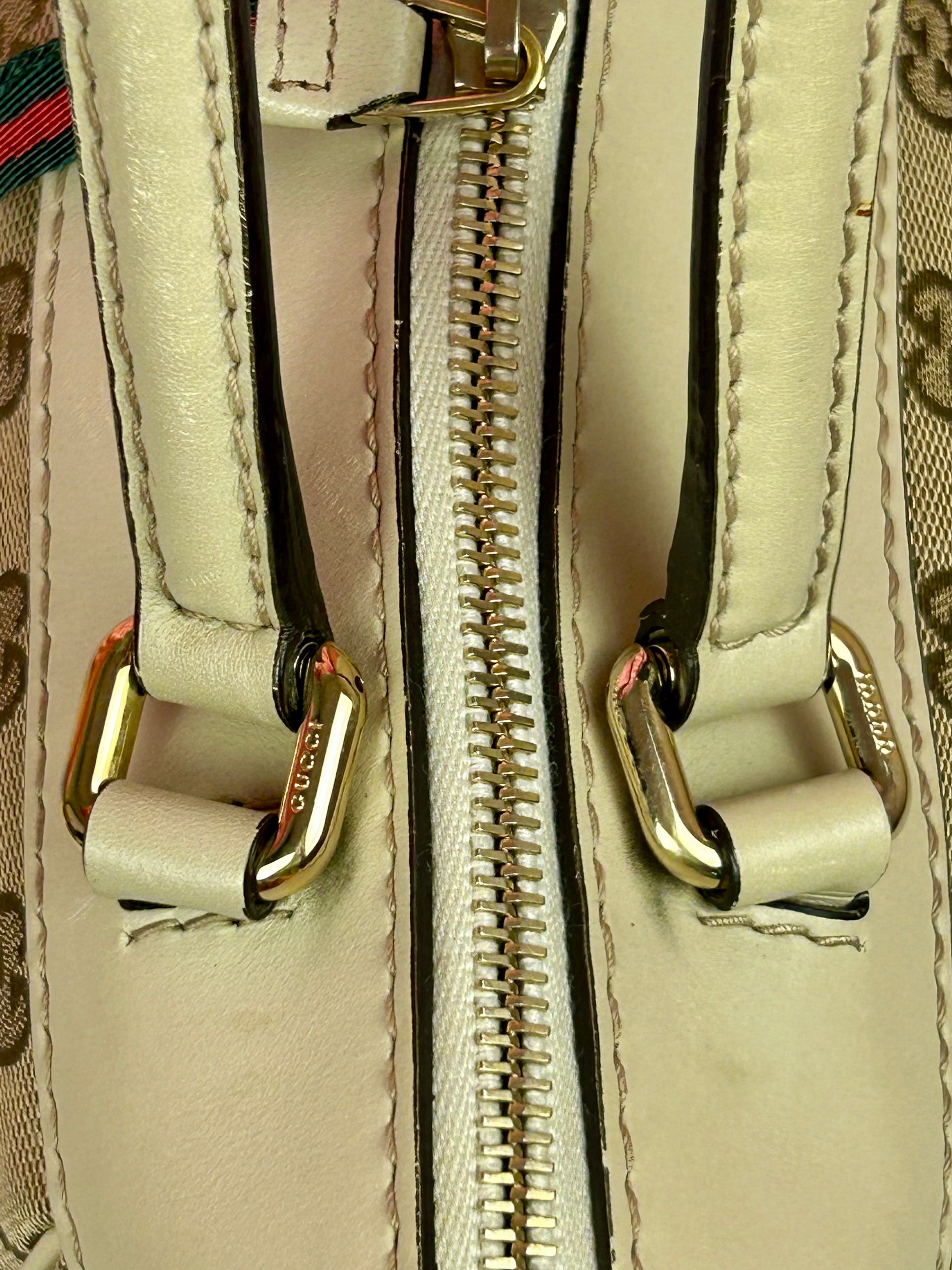 💜 Description: Fabric canvas is in excellent condition with no tears, frays, or stains. White leather trim is in great shape—no tears or cracks—though there is normal scuffing on the bottom corners. Leather handles are strong and intact, with wear on the side glazing. Chapes are strong. Hardware is shiny and functional. Zippers function well. Interior is clean, stains/discoloration inside both slip pockets. Comes with generic crossbody strap.