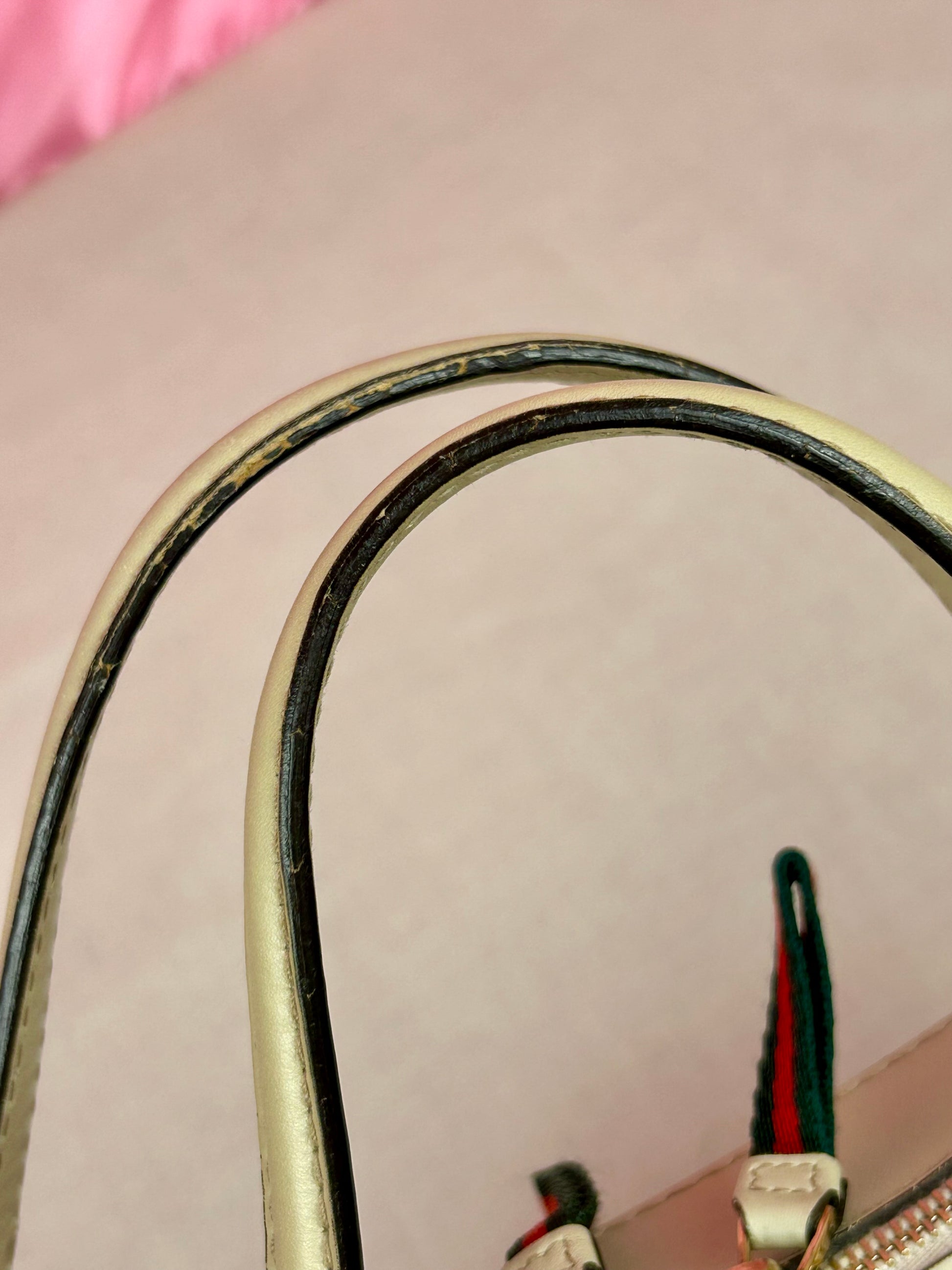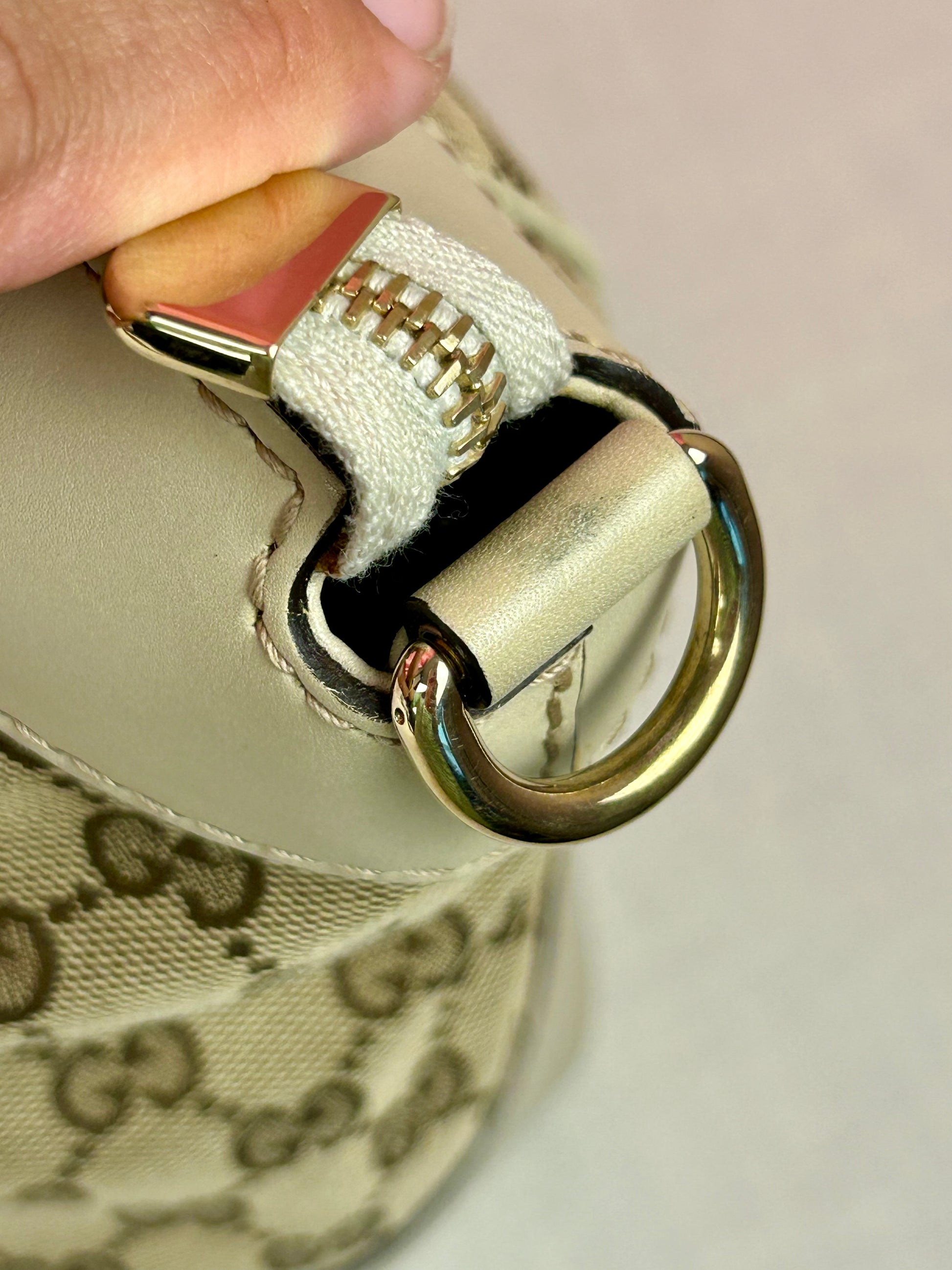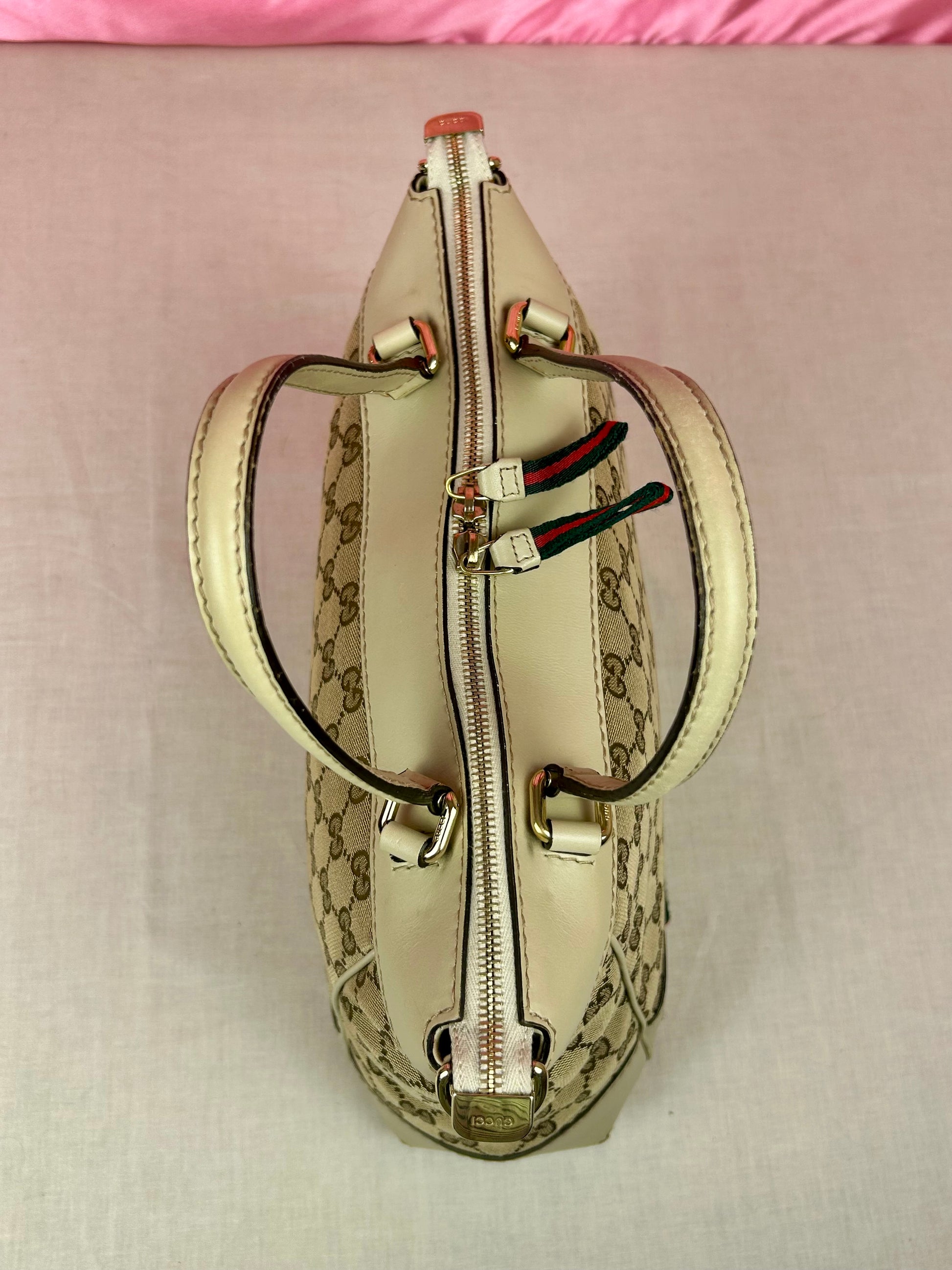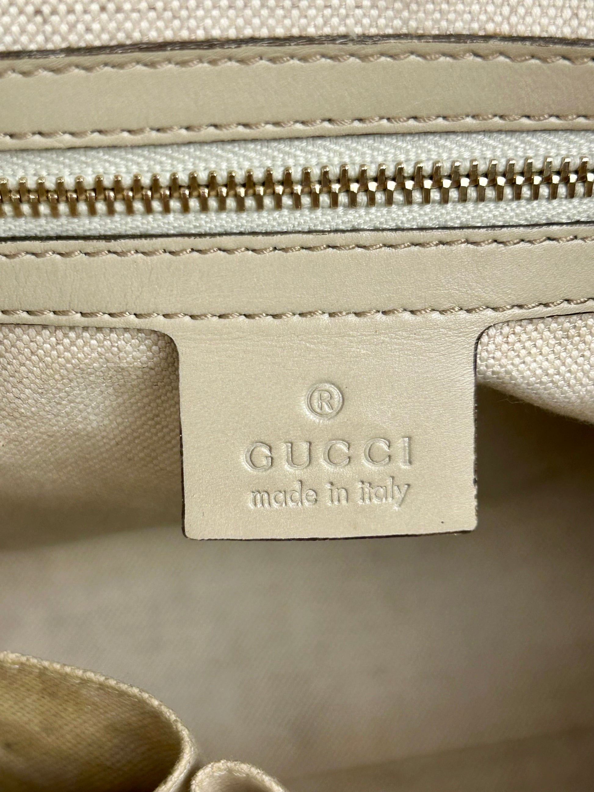 💜 Description: Fabric canvas is in excellent condition with no tears, frays, or stains. White leather trim is in great shape—no tears or cracks—though there is normal scuffing on the bottom corners. Leather handles are strong and intact, with wear on the side glazing. Chapes are strong. Hardware is shiny and functional. Zippers function well. Interior is clean, stains/discoloration inside both slip pockets. Comes with generic crossbody strap.