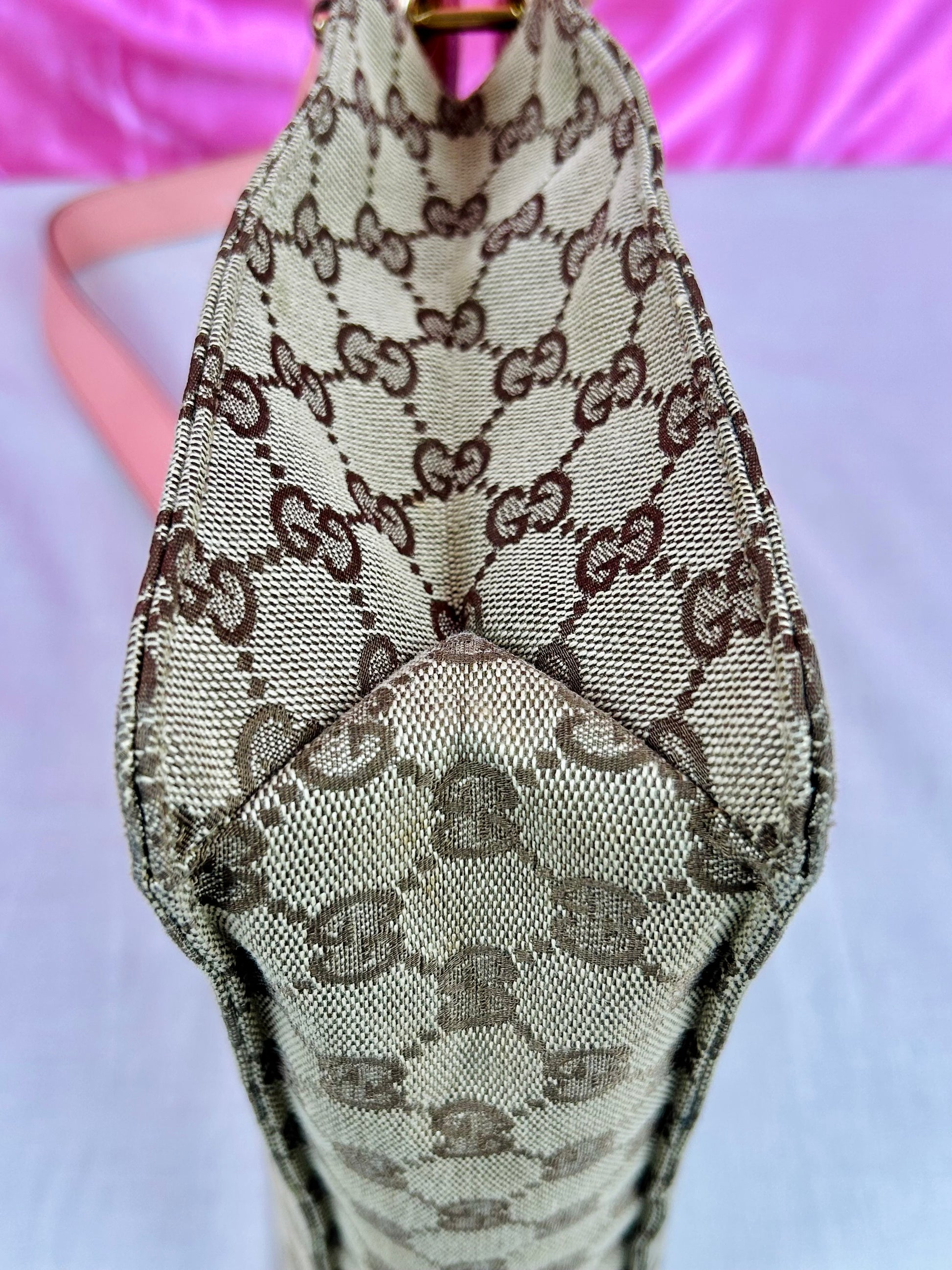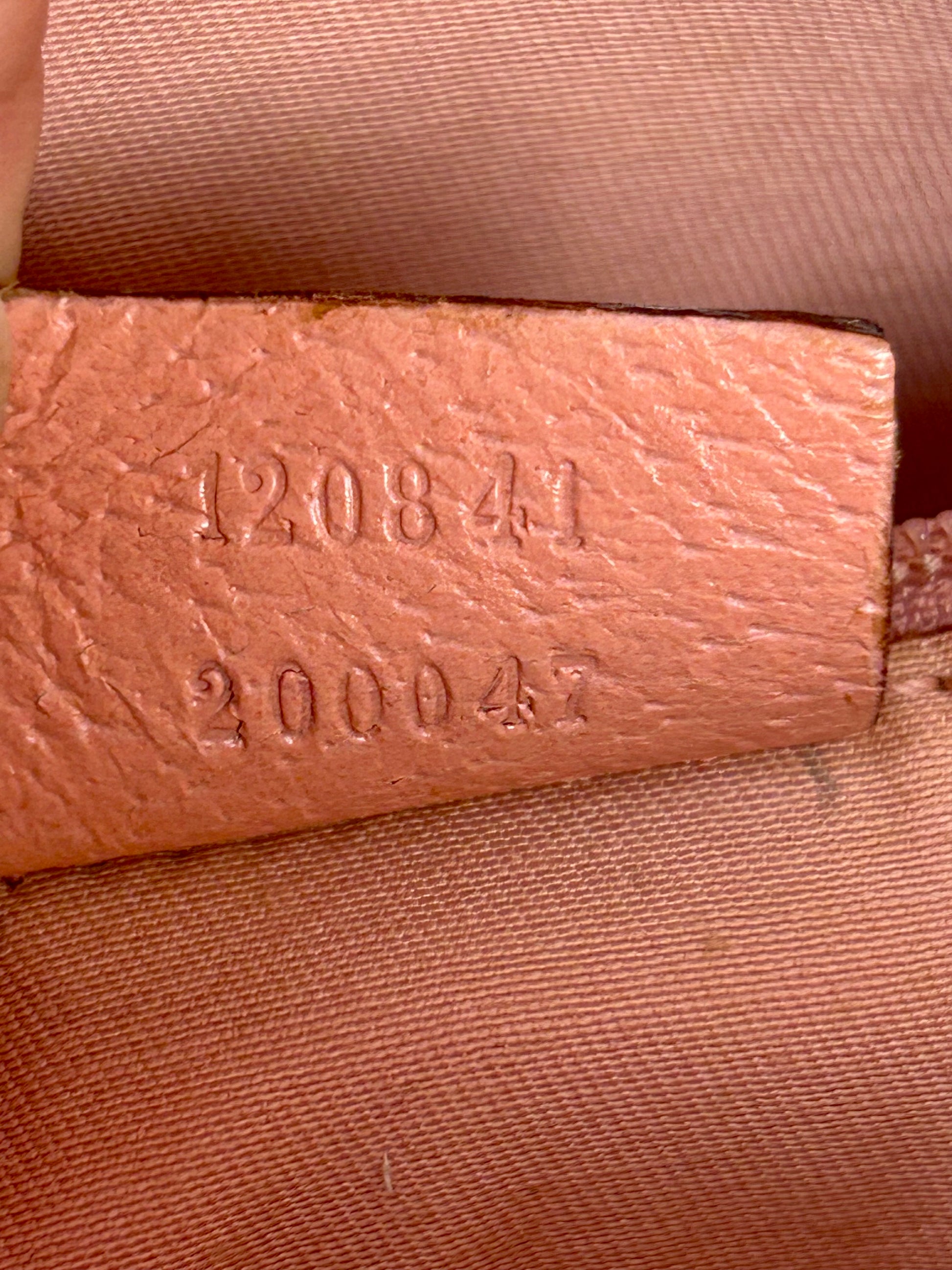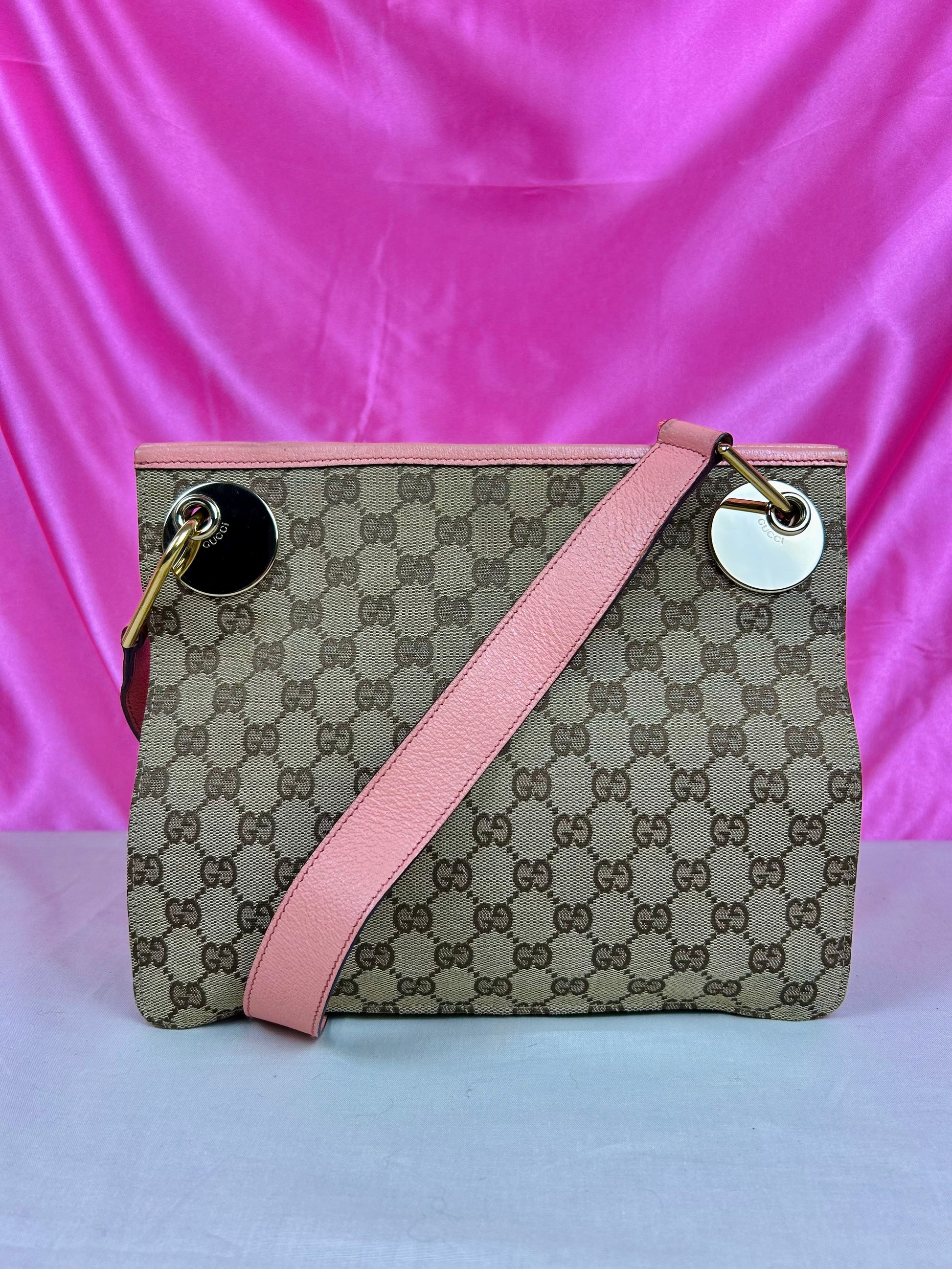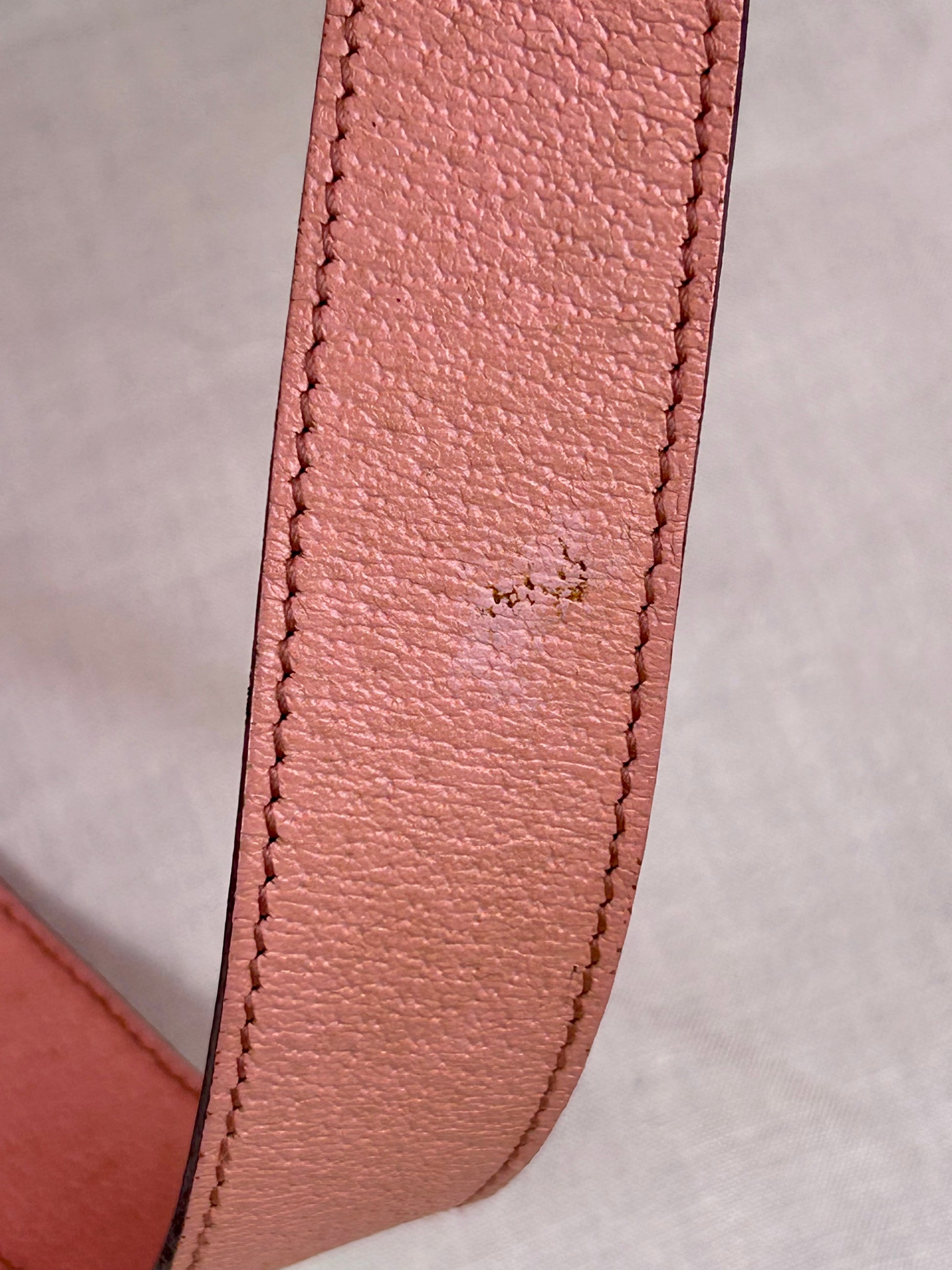 💜 Description: Canvas is in great condition with no tears or cracks, though there are some small discolorations present. The leather strap is in good condition, with some wear near the adjustable buckle and minor marking at the top center and near the metal clasps — no cracks or tears. Pink leather trim shows some wear with rubs on the corners. Interior has light pen markings on the leather and mild markings consistent with normal use. Interior pocket is clean, zipper works smoothly, hardware is shiny, and the magnetic strap closure functions well.
