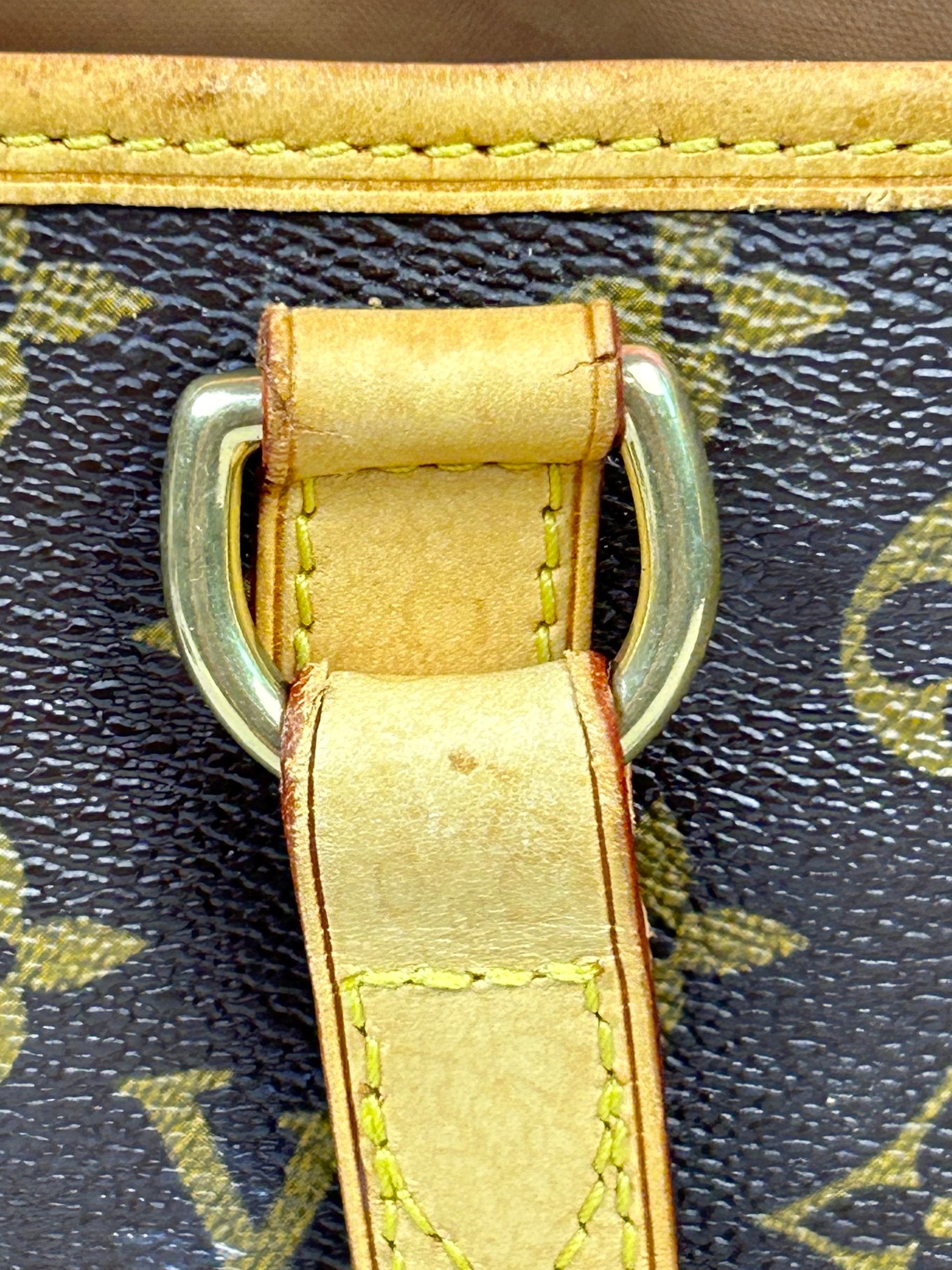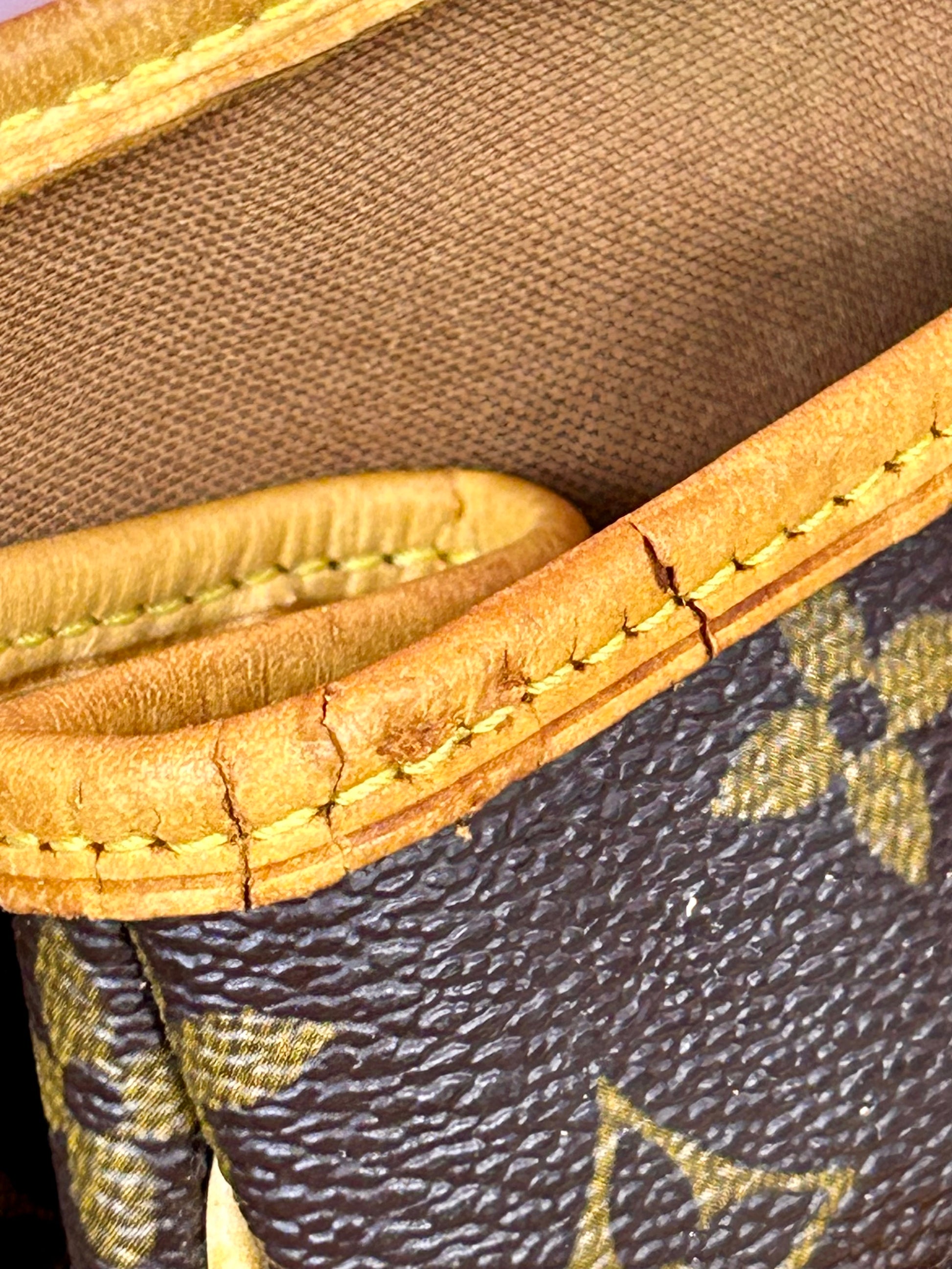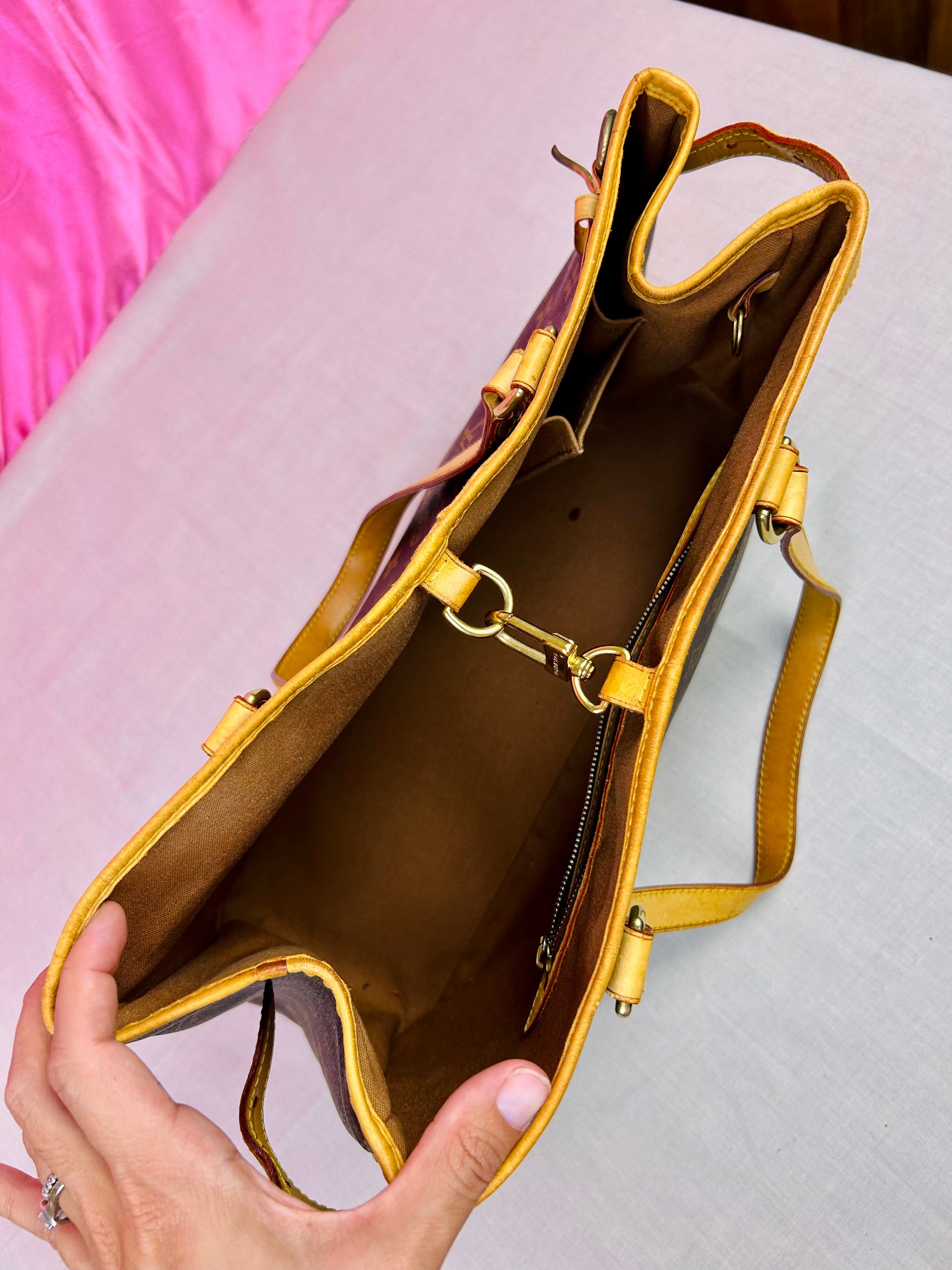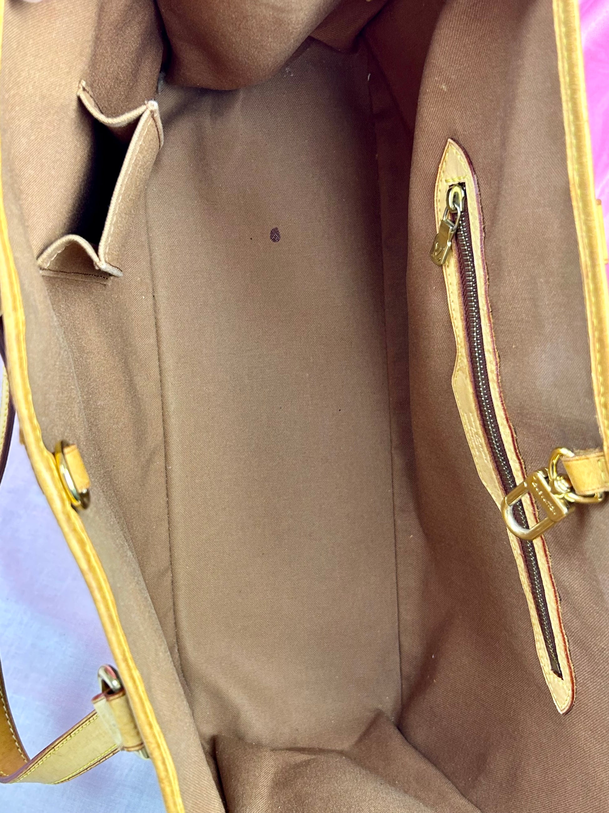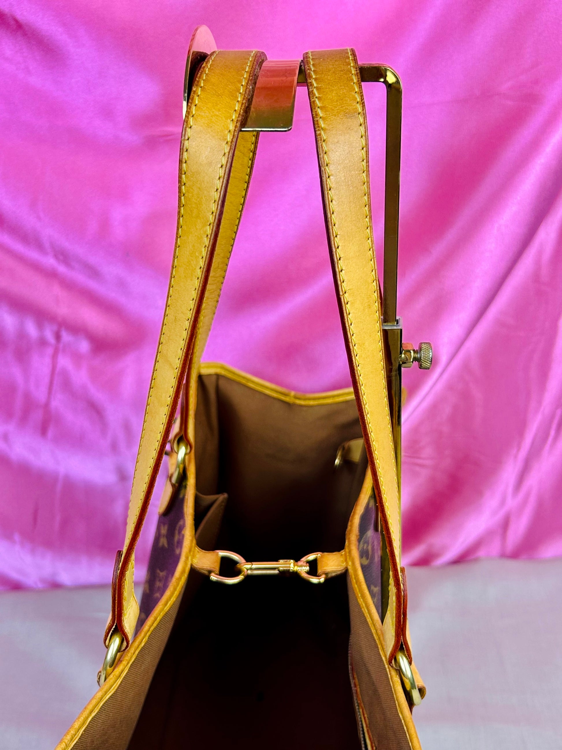 💜 Description: Canvas is in excellent condition—this bag is absolutely gorgeous! Chapes are strong and secure. Leather handles are in excellent condition, sturdy and comfortable for everyday use. Top leather trim has some wearing consistent with normal usage. Side leather straps are dry and have cracks. Four bottom corners have exposed piping, very common for this model. Interior has small spot on the bottom but is otherwise very clean. A spacious and elegant tote, perfect for daily essentials!