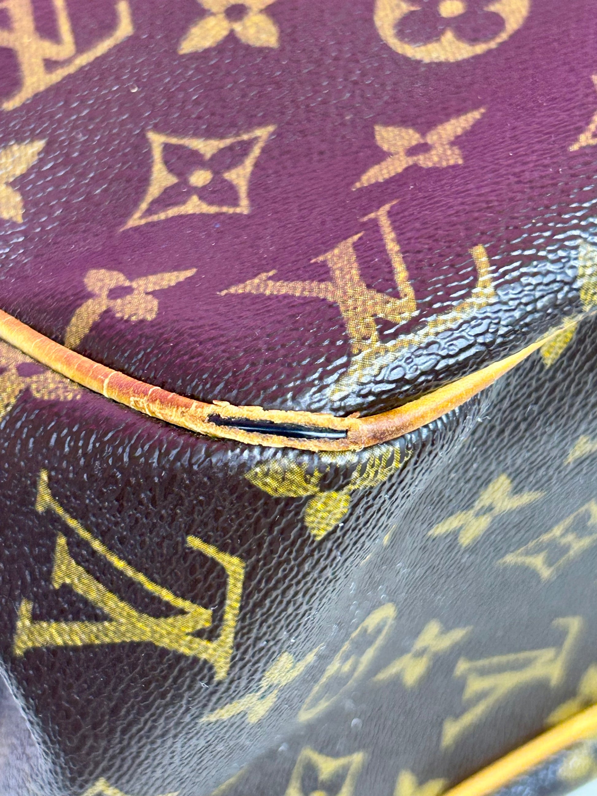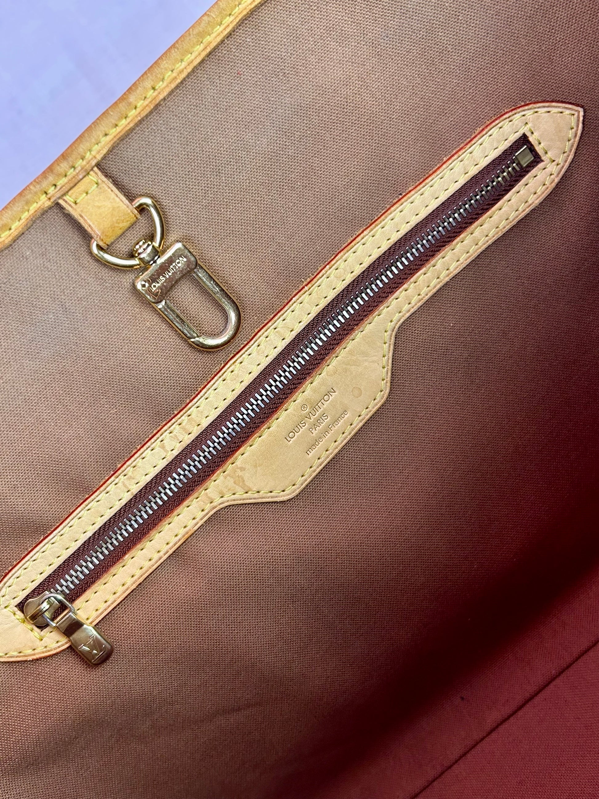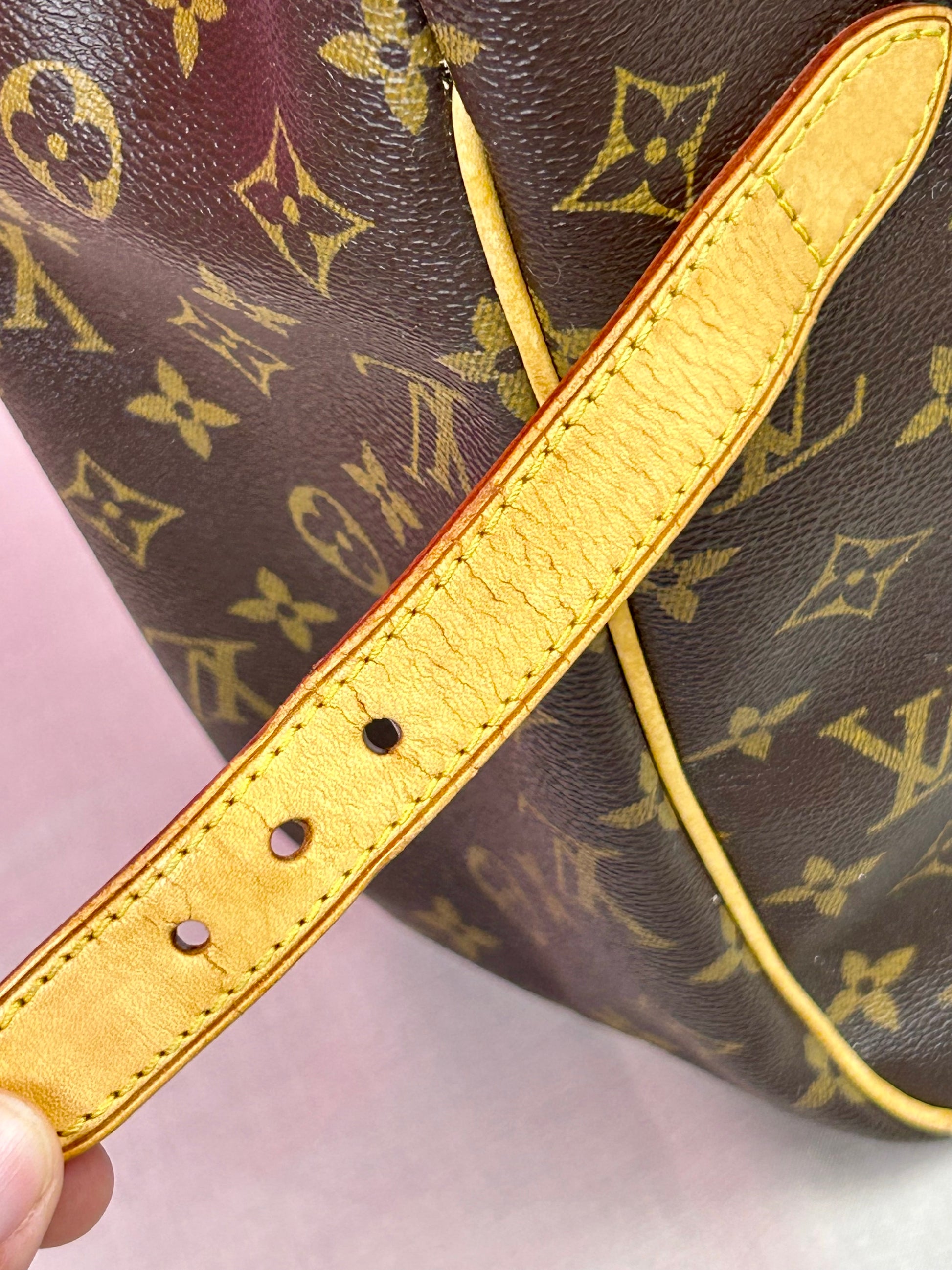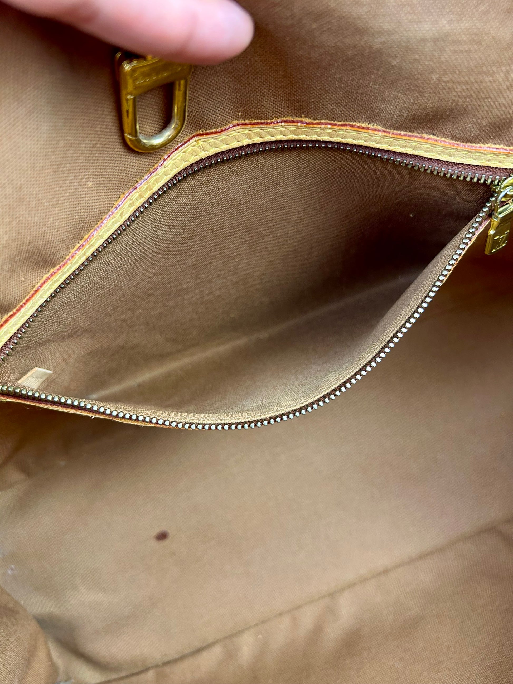 💜 Description: Canvas is in excellent condition—this bag is absolutely gorgeous! Chapes are strong and secure. Leather handles are in excellent condition, sturdy and comfortable for everyday use. Top leather trim has some wearing consistent with normal usage. Side leather straps are dry and have cracks. Four bottom corners have exposed piping, very common for this model. Interior has small spot on the bottom but is otherwise very clean. A spacious and elegant tote, perfect for daily essentials!