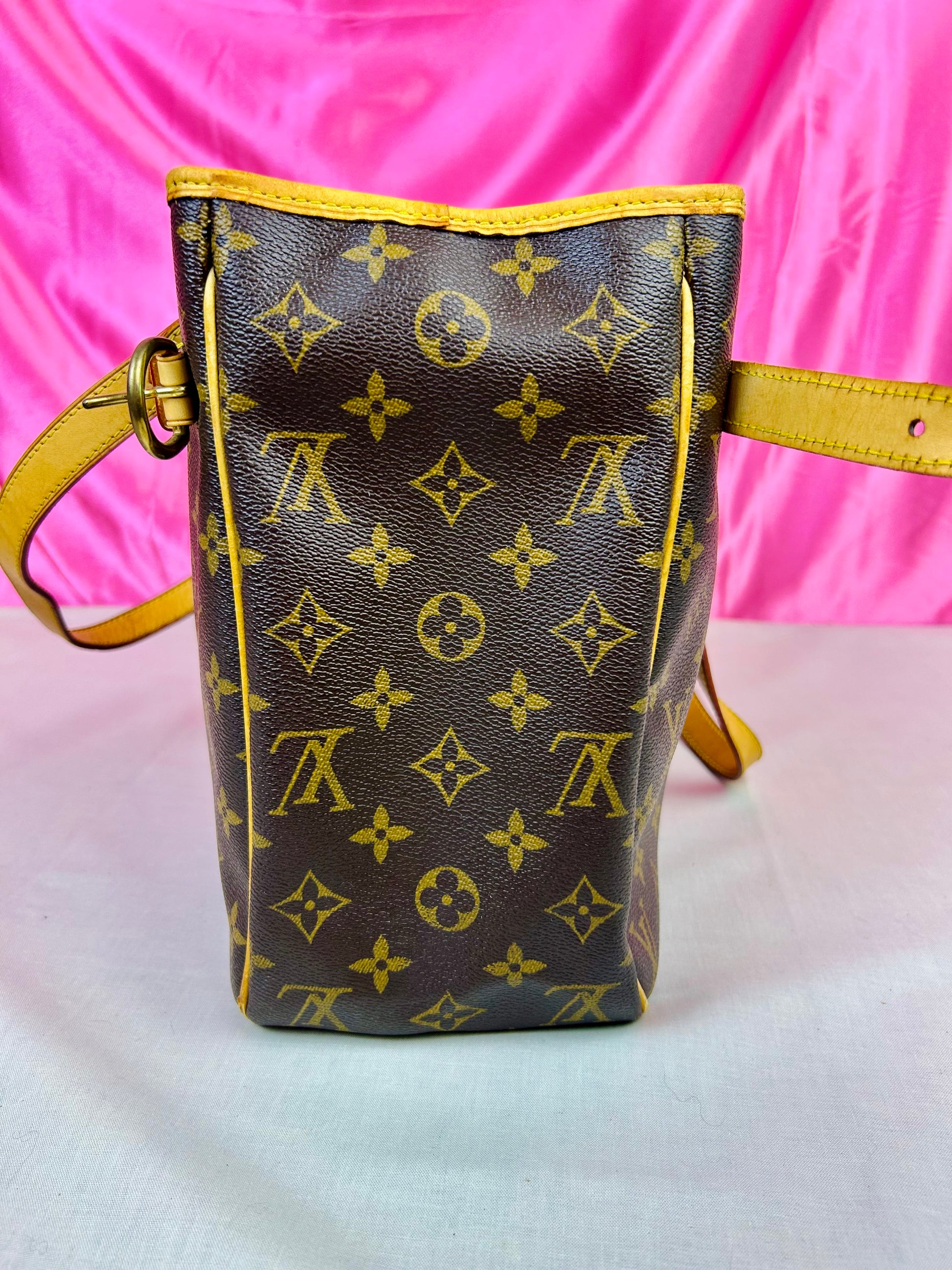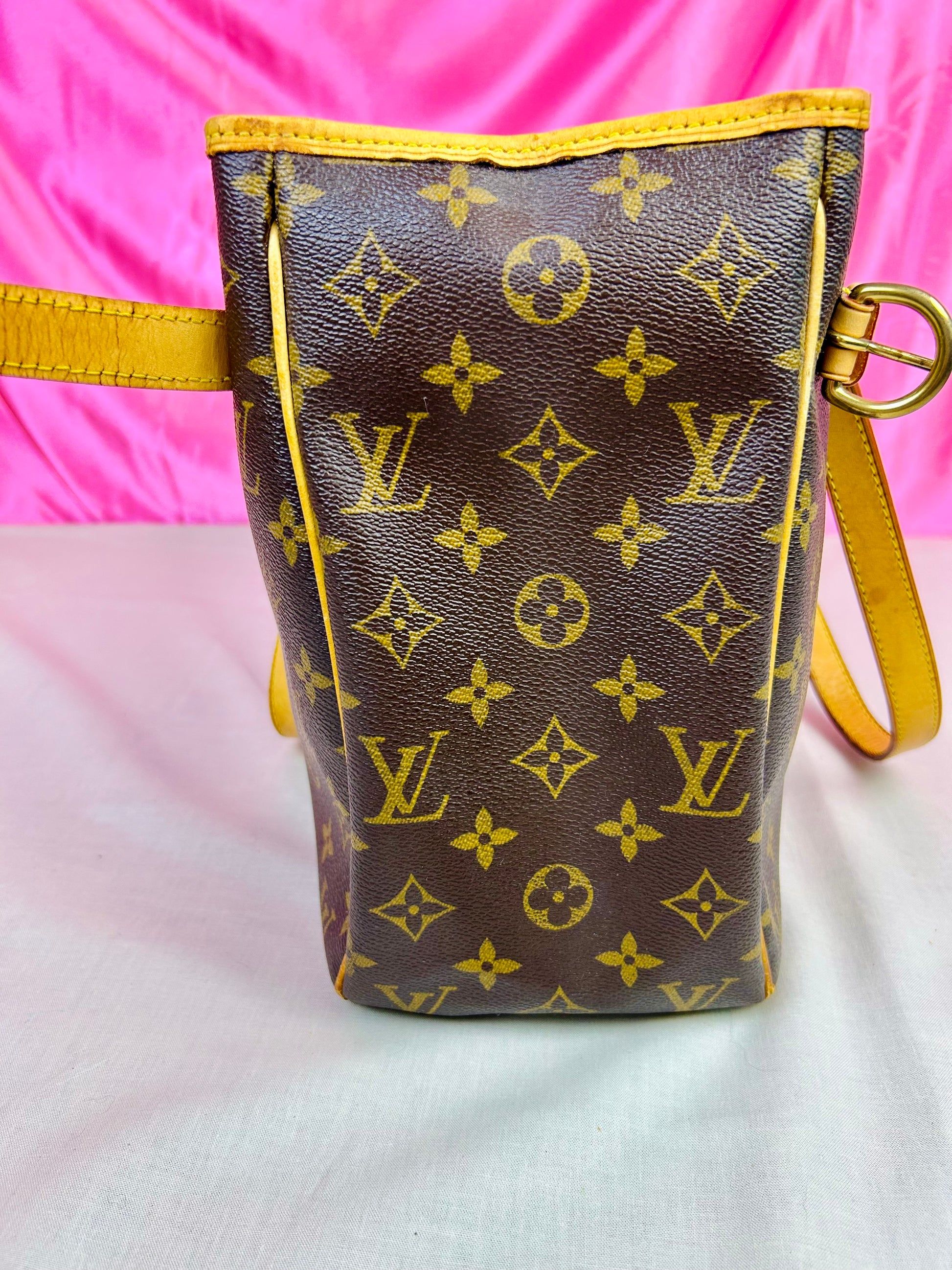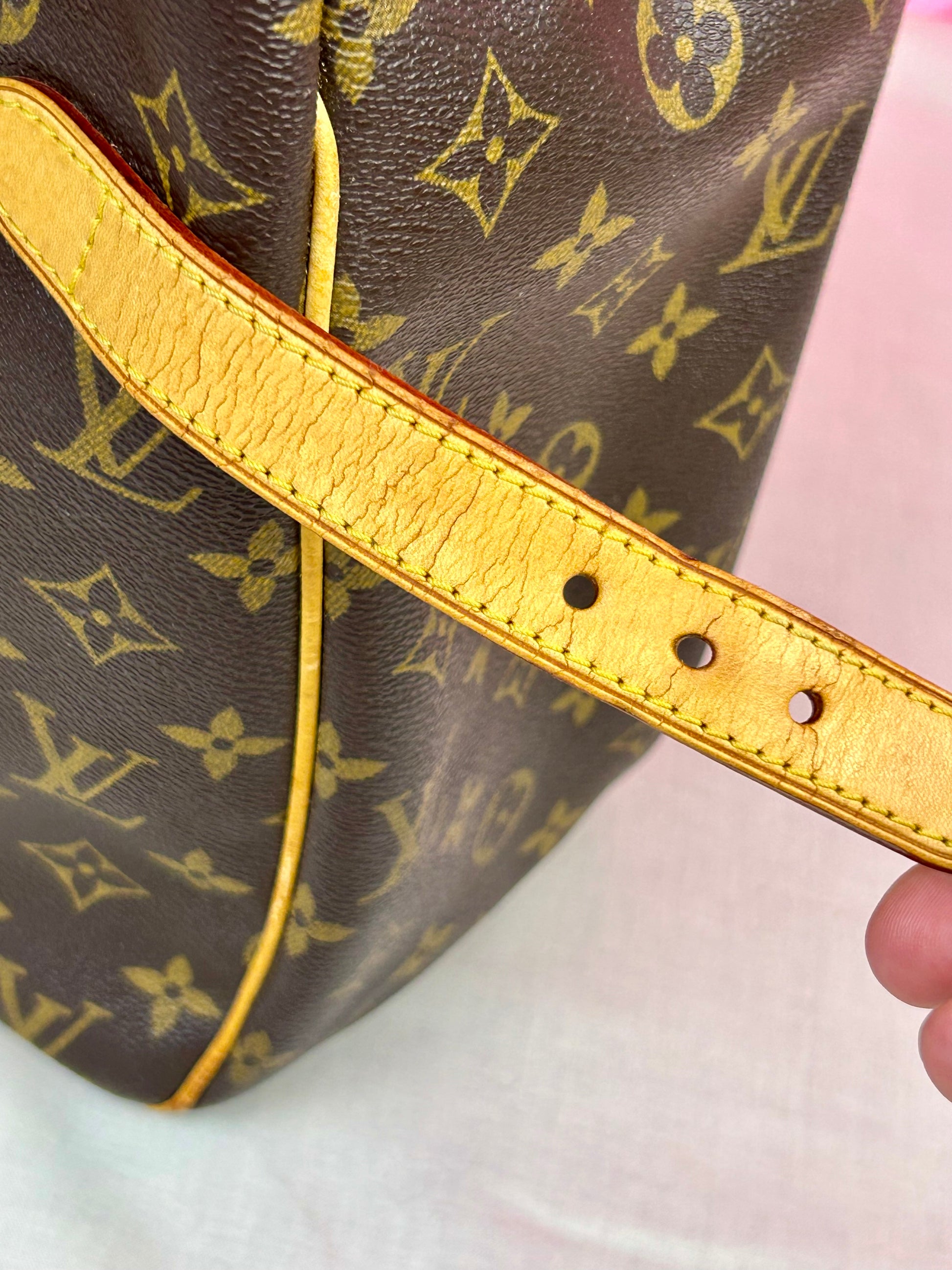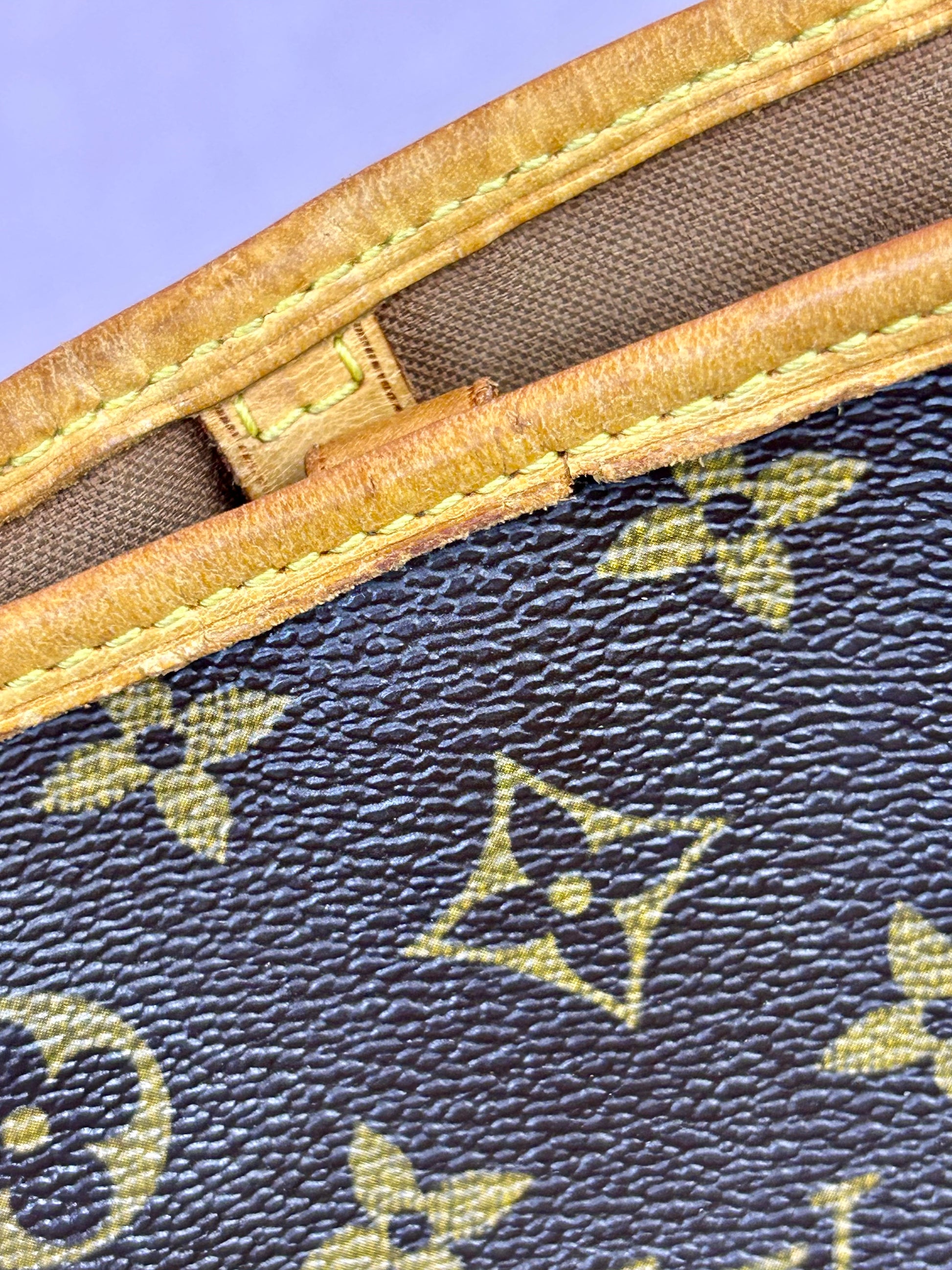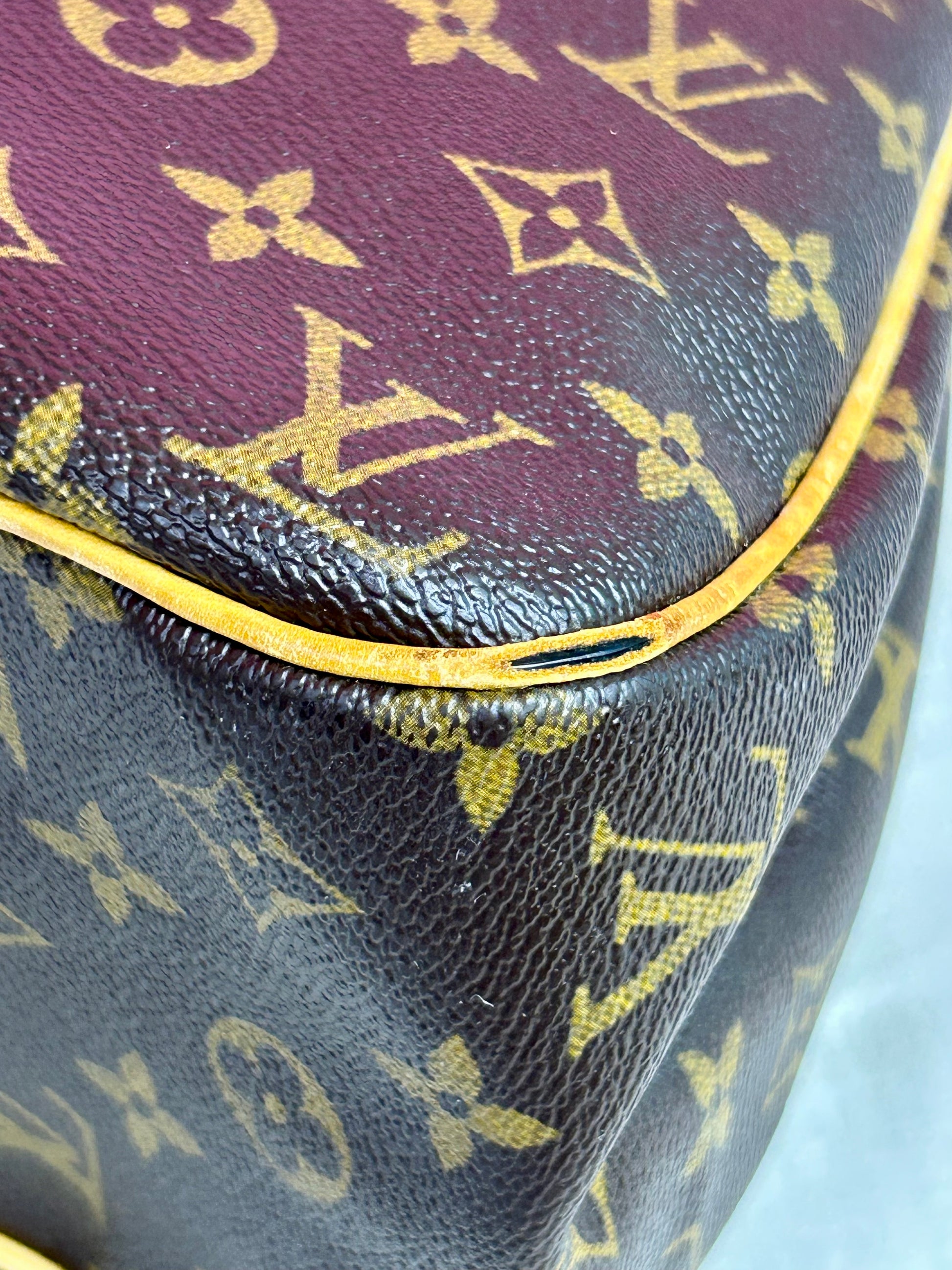 💜 Description: Canvas is in excellent condition—this bag is absolutely gorgeous! Chapes are strong and secure. Leather handles are in excellent condition, sturdy and comfortable for everyday use. Top leather trim has some wearing consistent with normal usage. Side leather straps are dry and have cracks. Four bottom corners have exposed piping, very common for this model. Interior has small spot on the bottom but is otherwise very clean. A spacious and elegant tote, perfect for daily essentials!