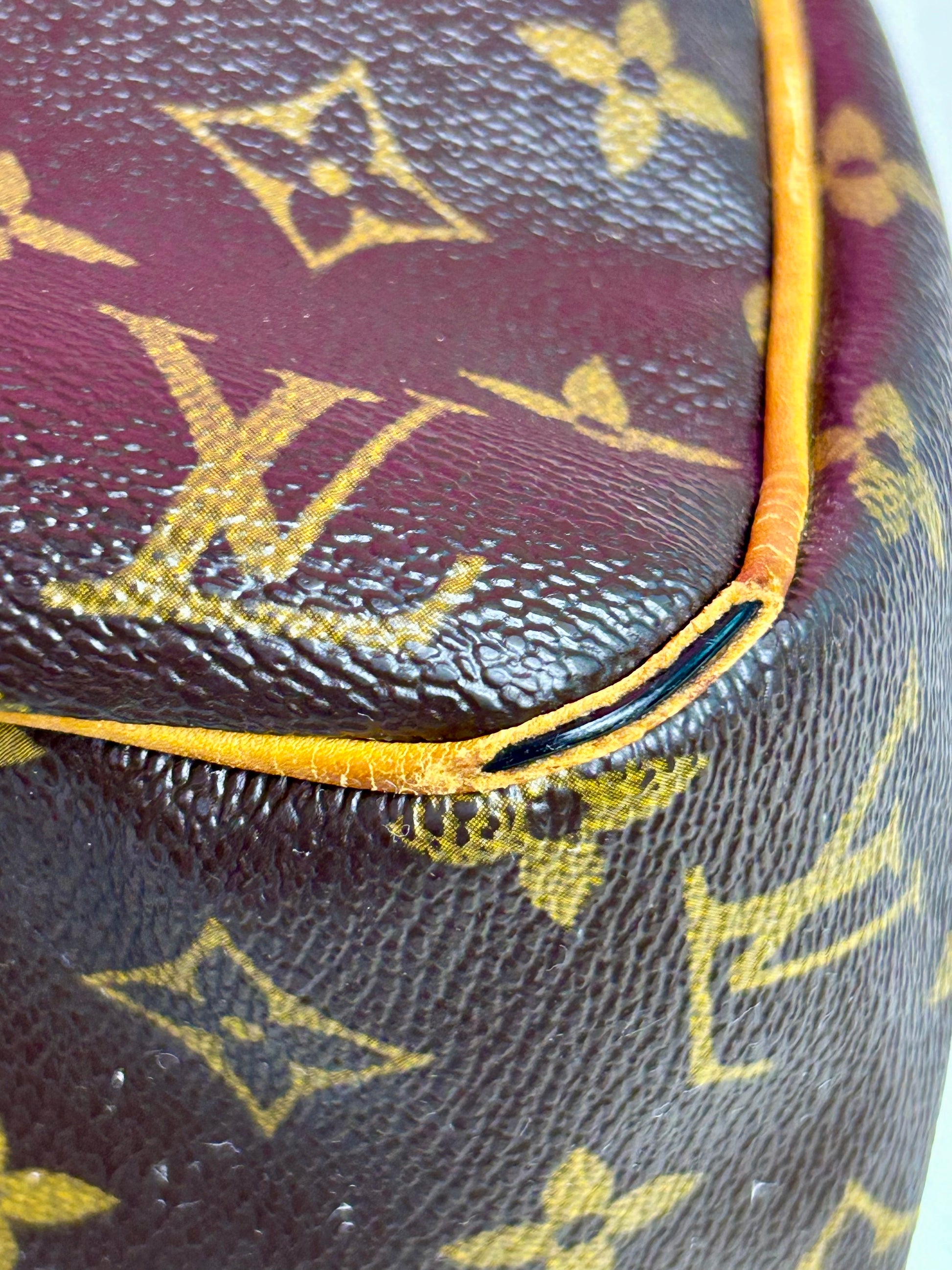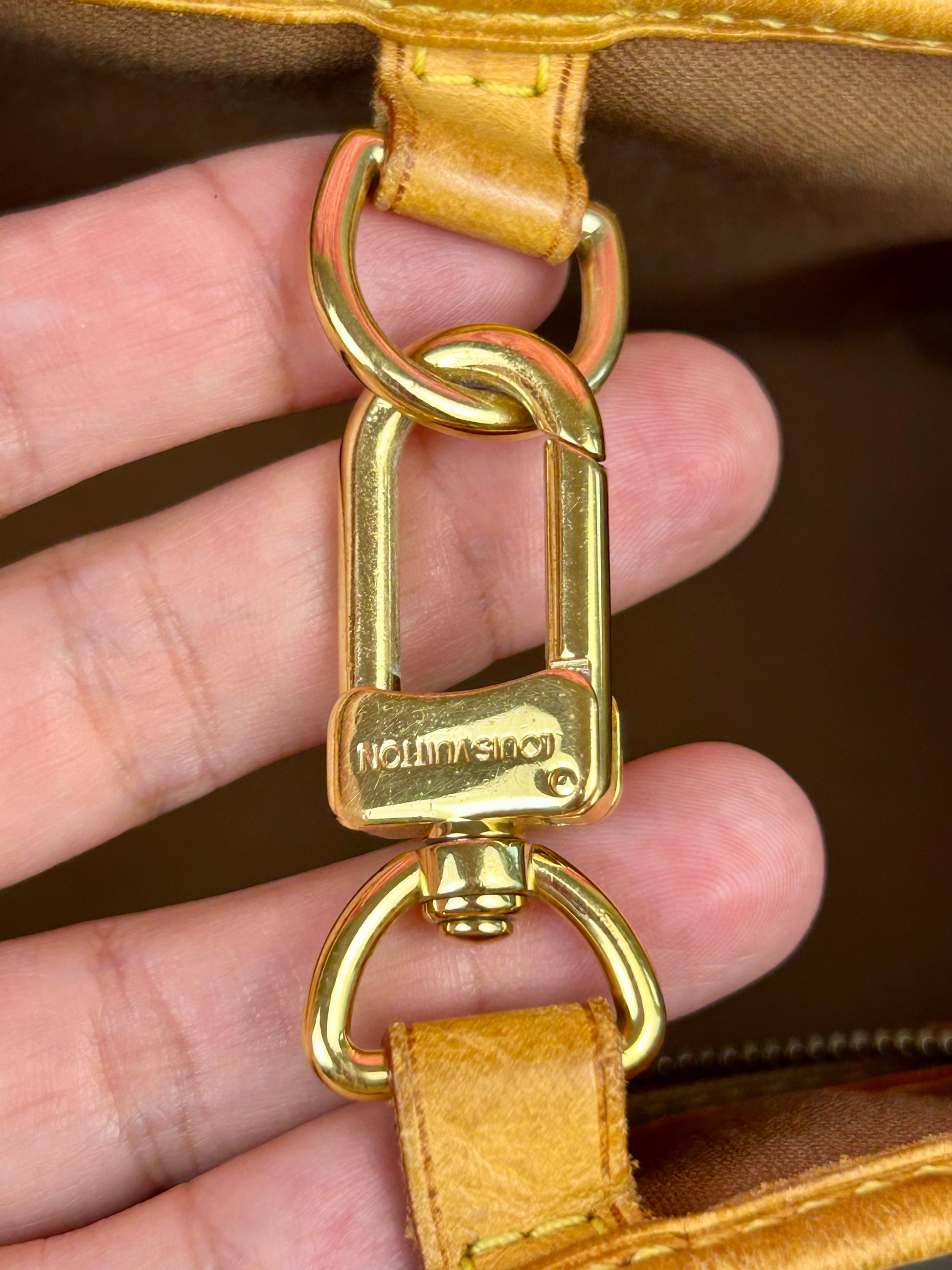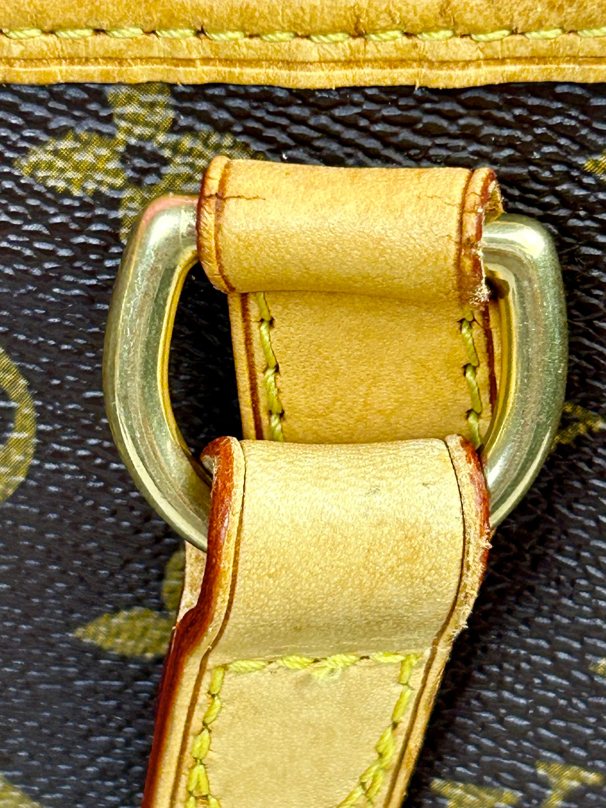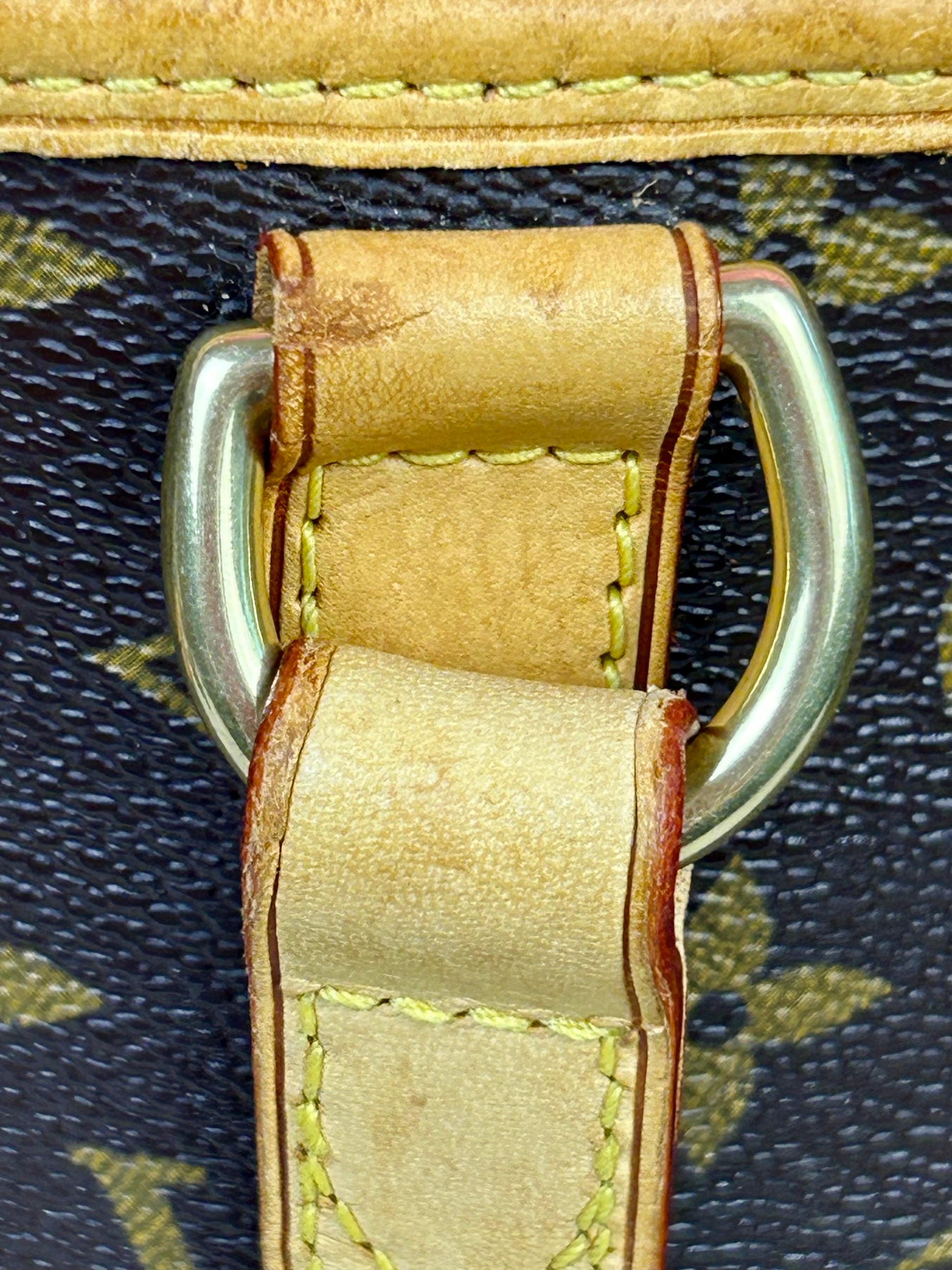 💜 Description: Canvas is in excellent condition—this bag is absolutely gorgeous! Chapes are strong and secure. Leather handles are in excellent condition, sturdy and comfortable for everyday use. Top leather trim has some wearing consistent with normal usage. Side leather straps are dry and have cracks. Four bottom corners have exposed piping, very common for this model. Interior has small spot on the bottom but is otherwise very clean. A spacious and elegant tote, perfect for daily essentials!