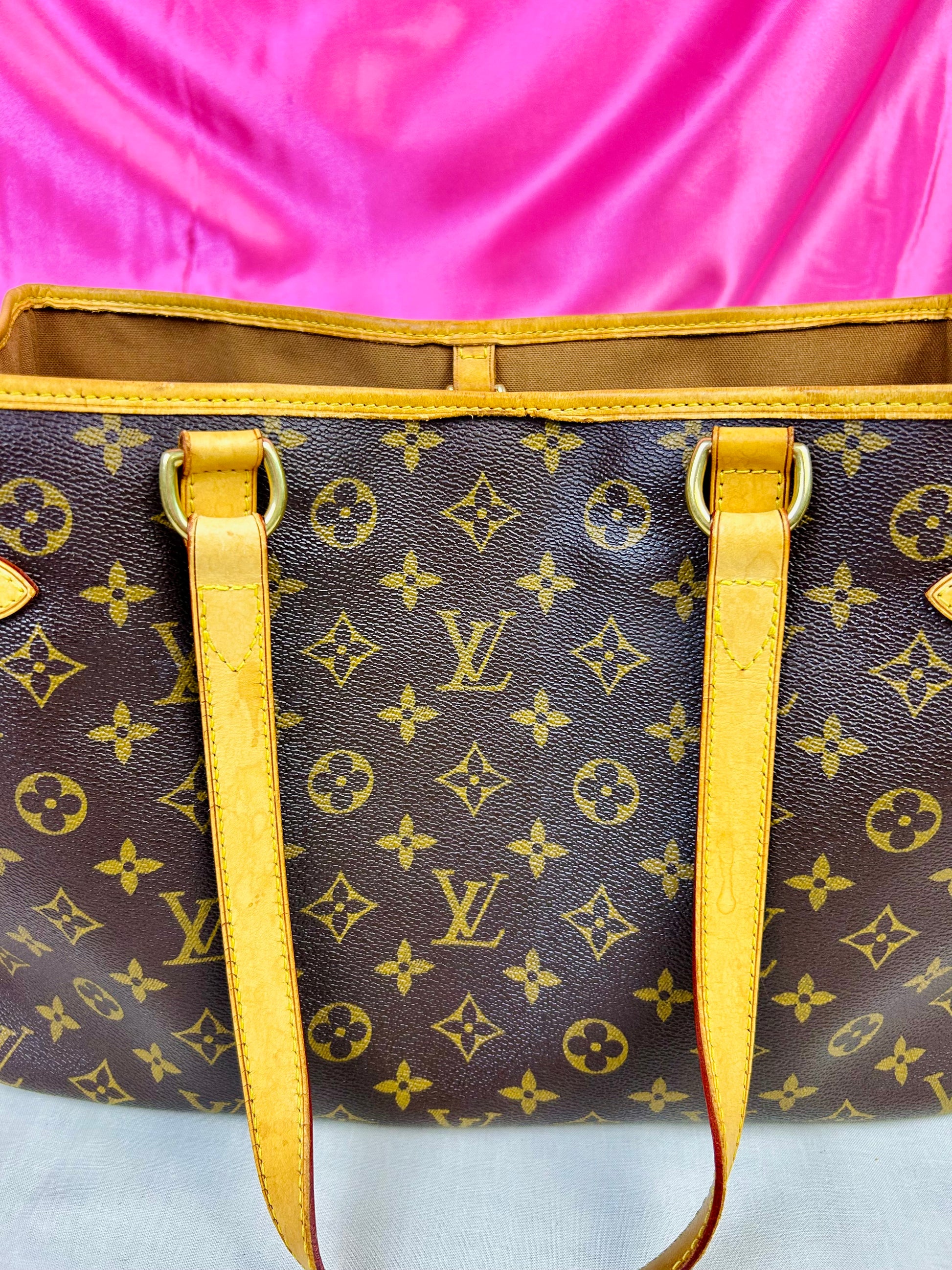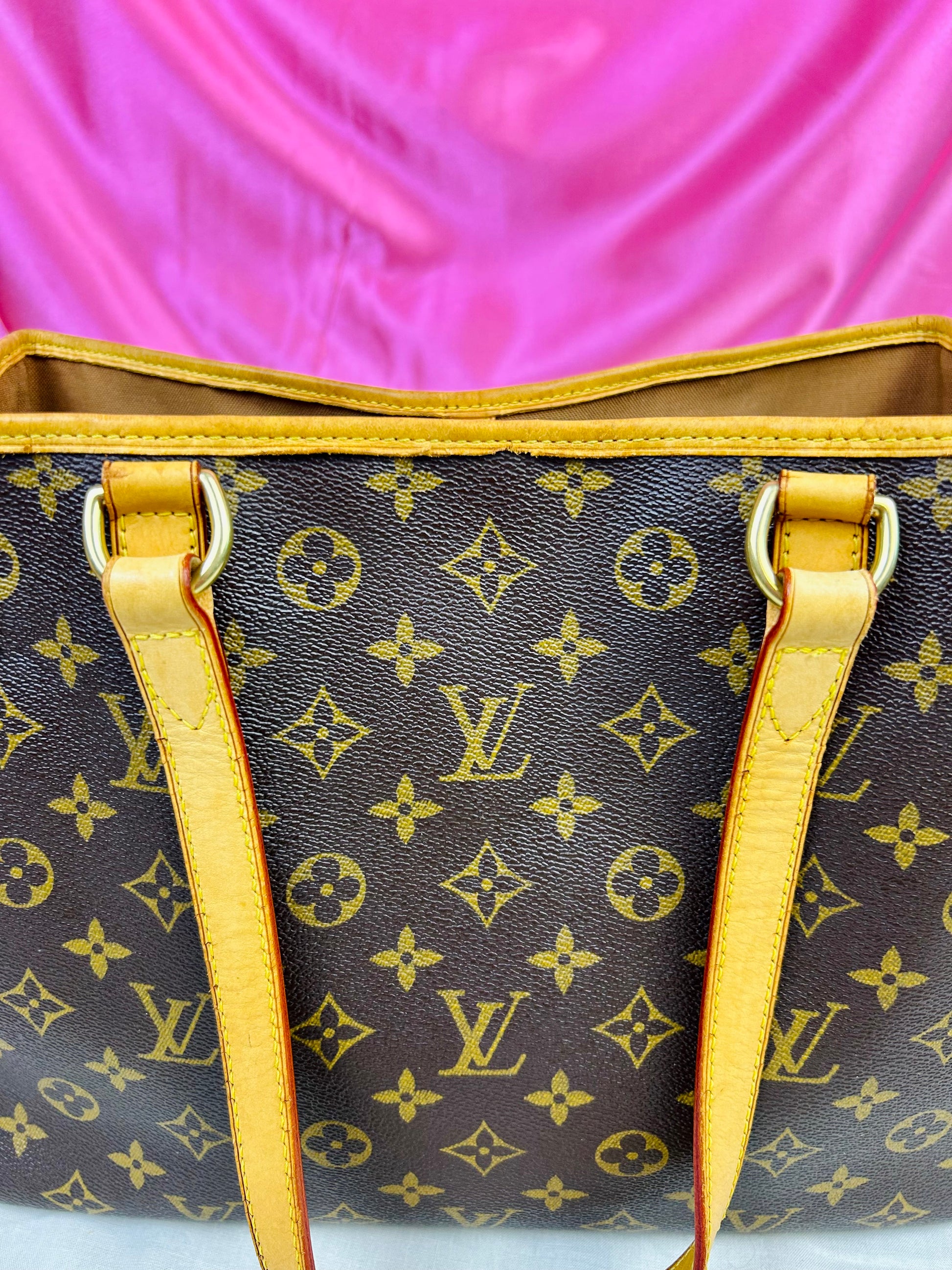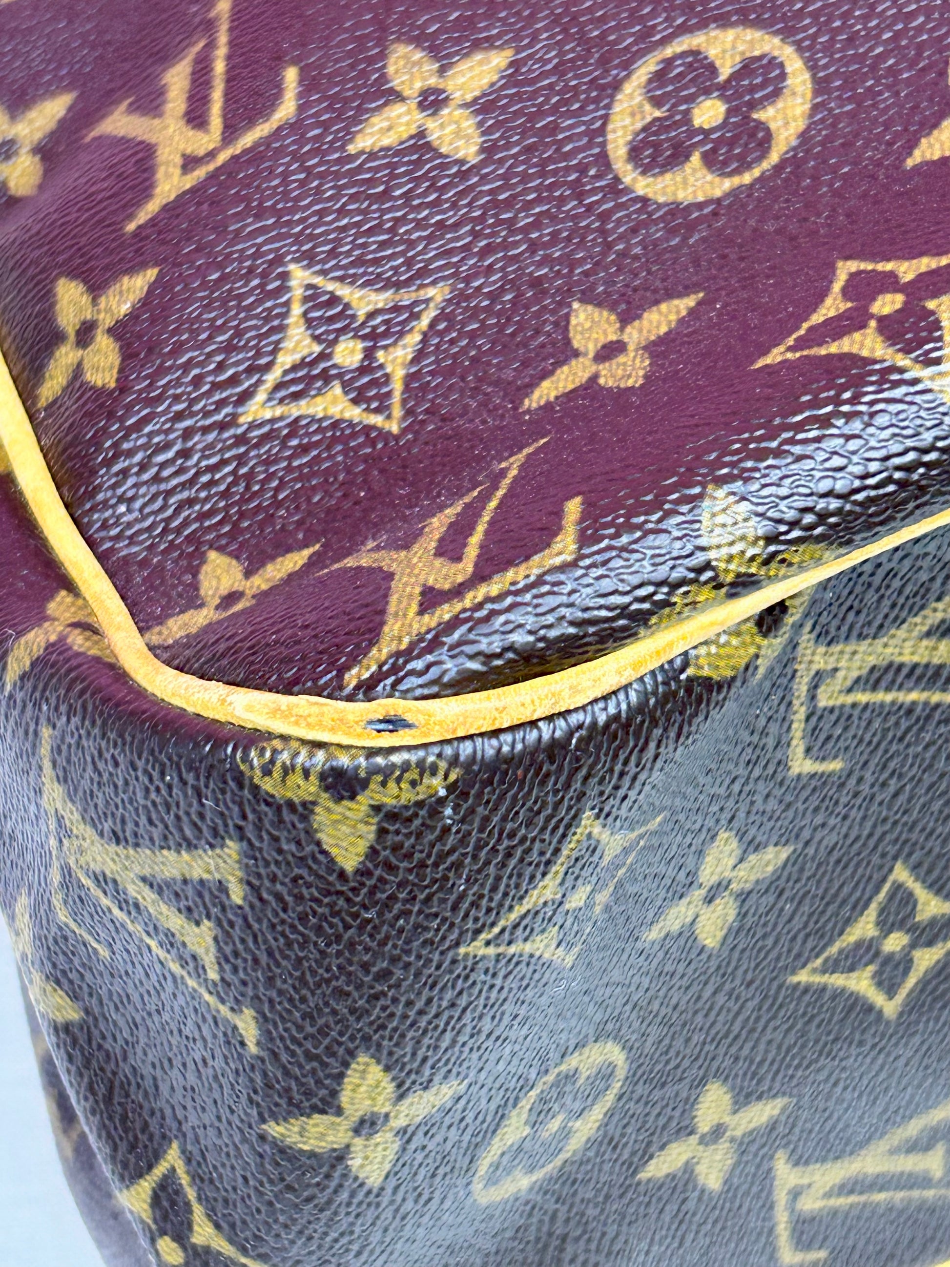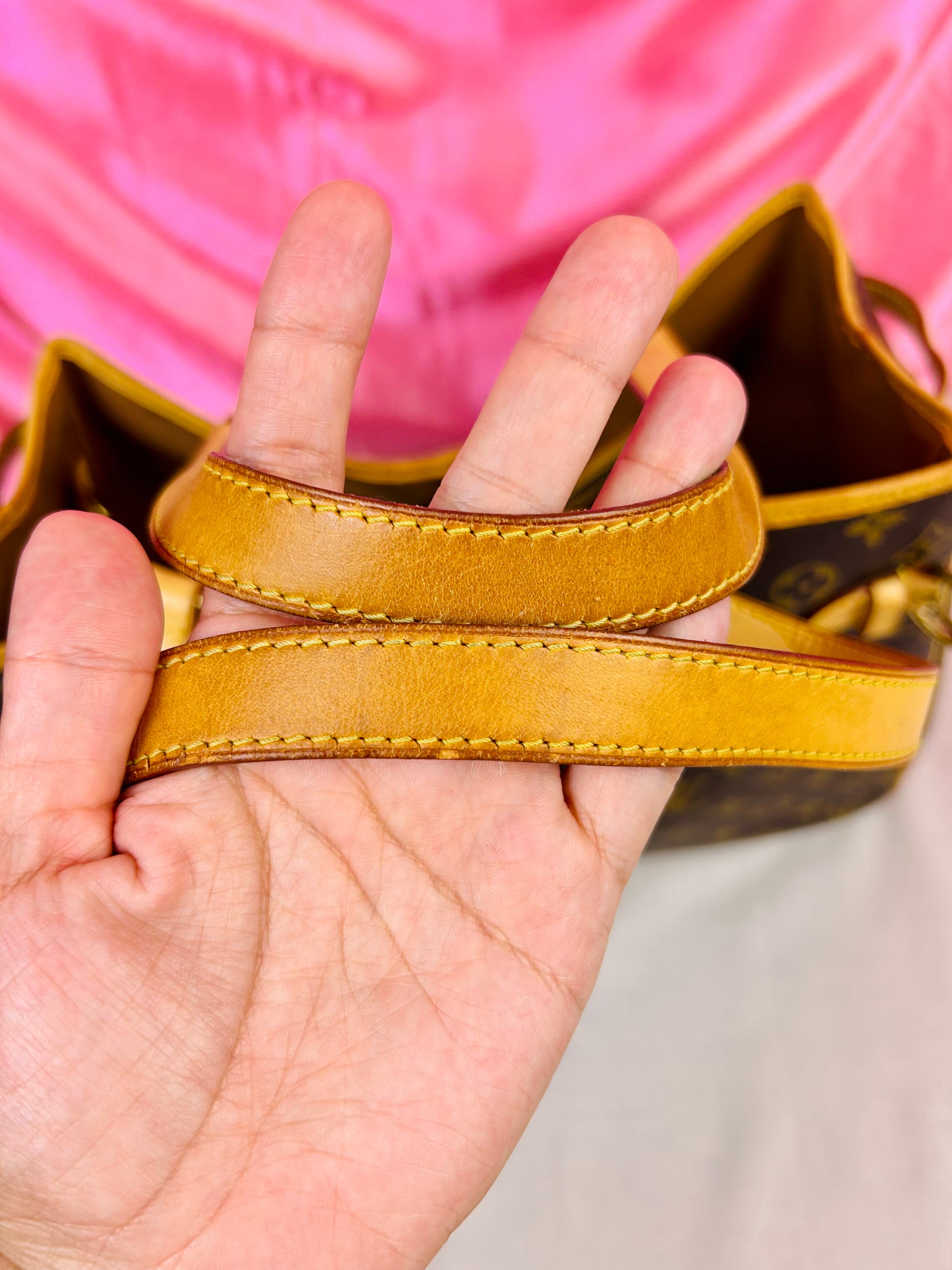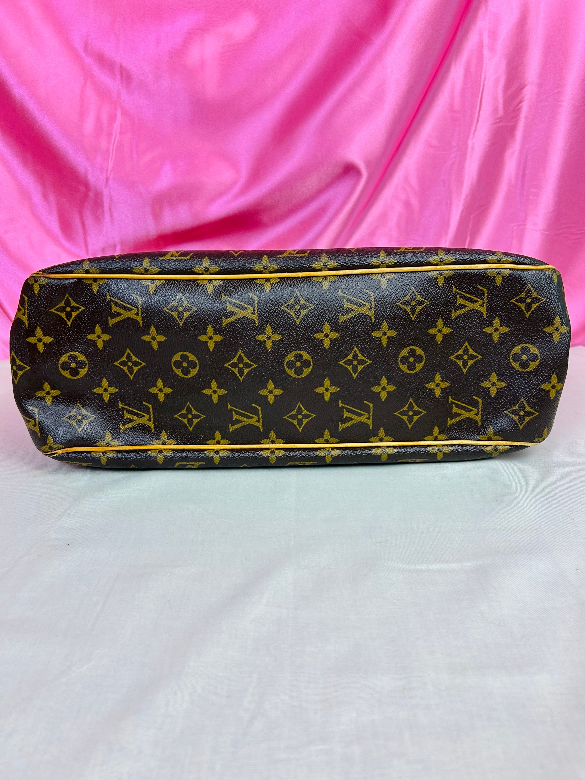💜 Description: Canvas is in excellent condition—this bag is absolutely gorgeous! Chapes are strong and secure. Leather handles are in excellent condition, sturdy and comfortable for everyday use. Top leather trim has some wearing consistent with normal usage. Side leather straps are dry and have cracks. Four bottom corners have exposed piping, very common for this model. Interior has small spot on the bottom but is otherwise very clean. A spacious and elegant tote, perfect for daily essentials!
