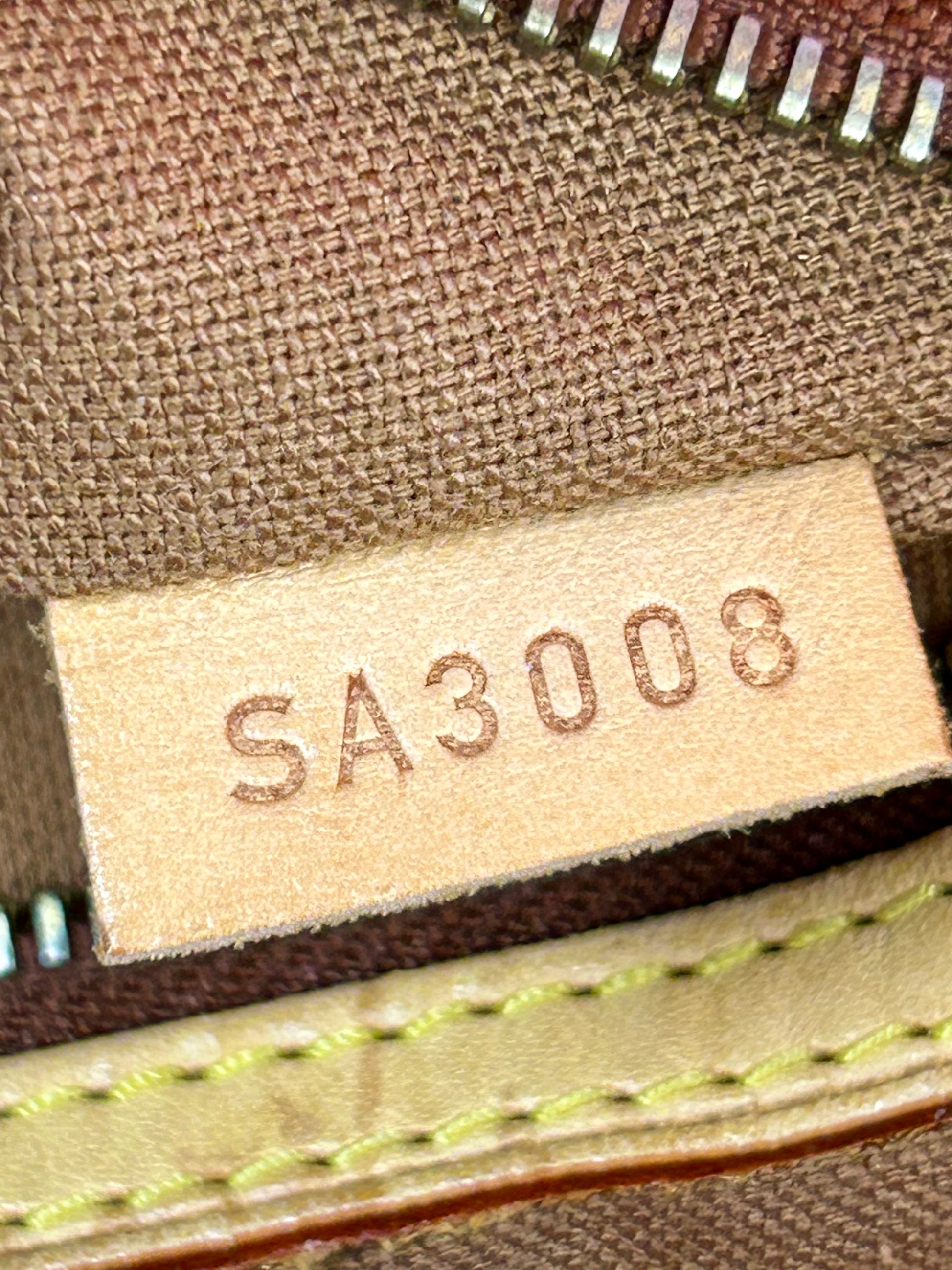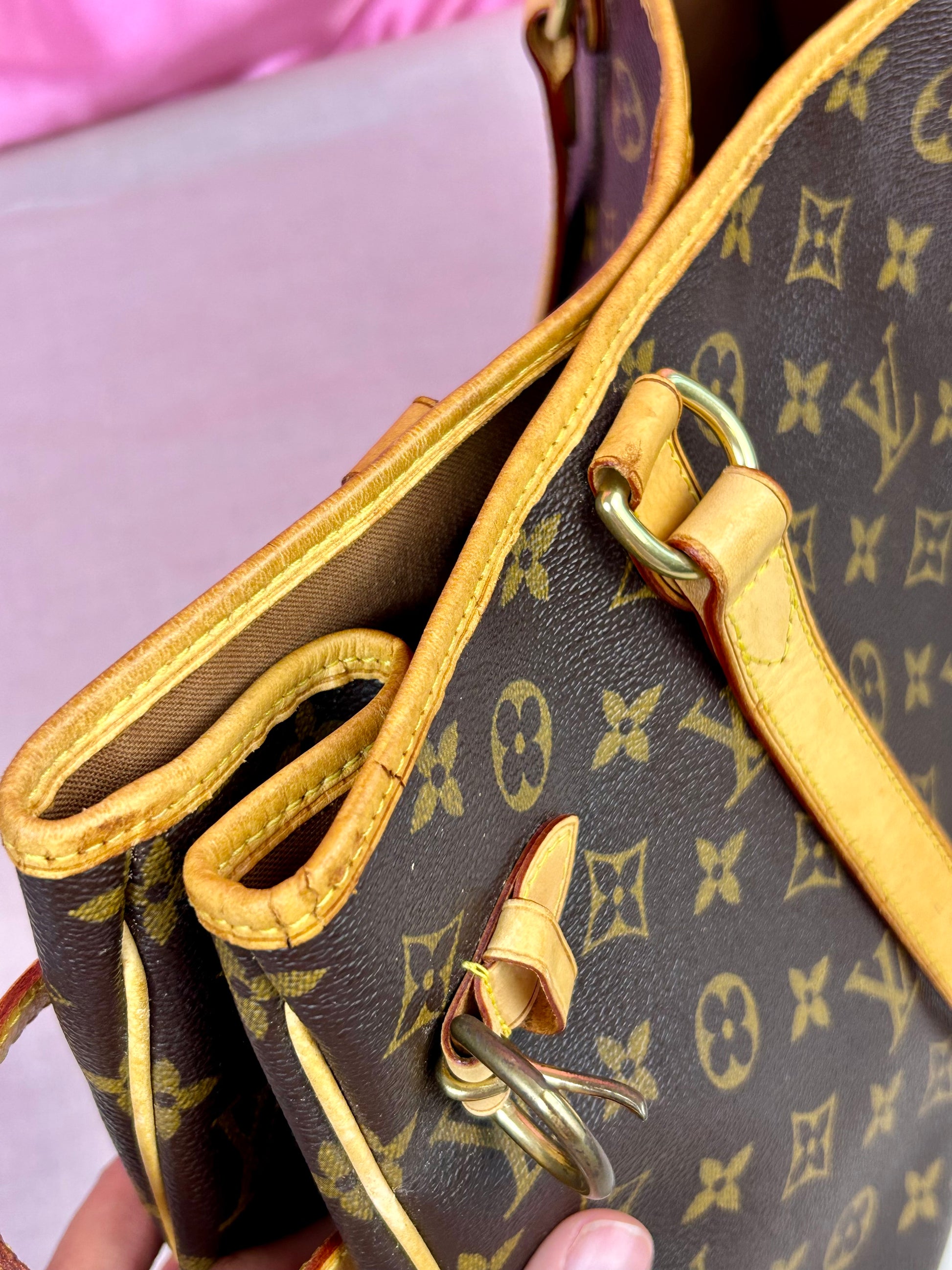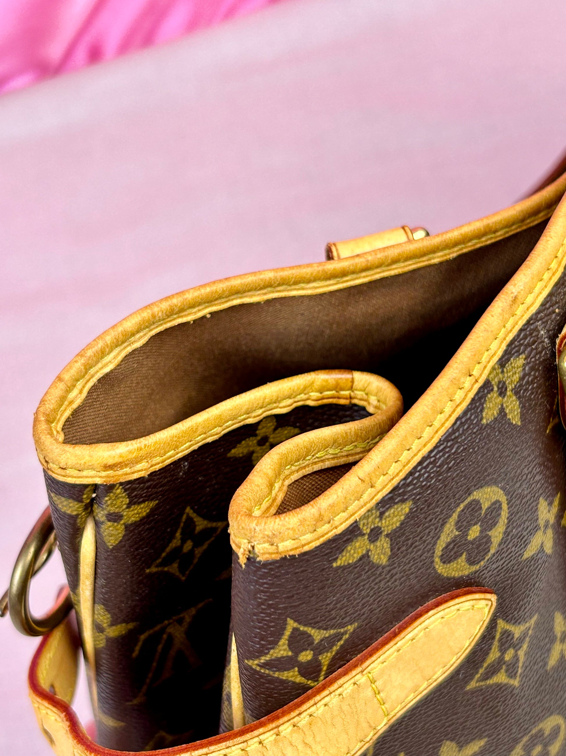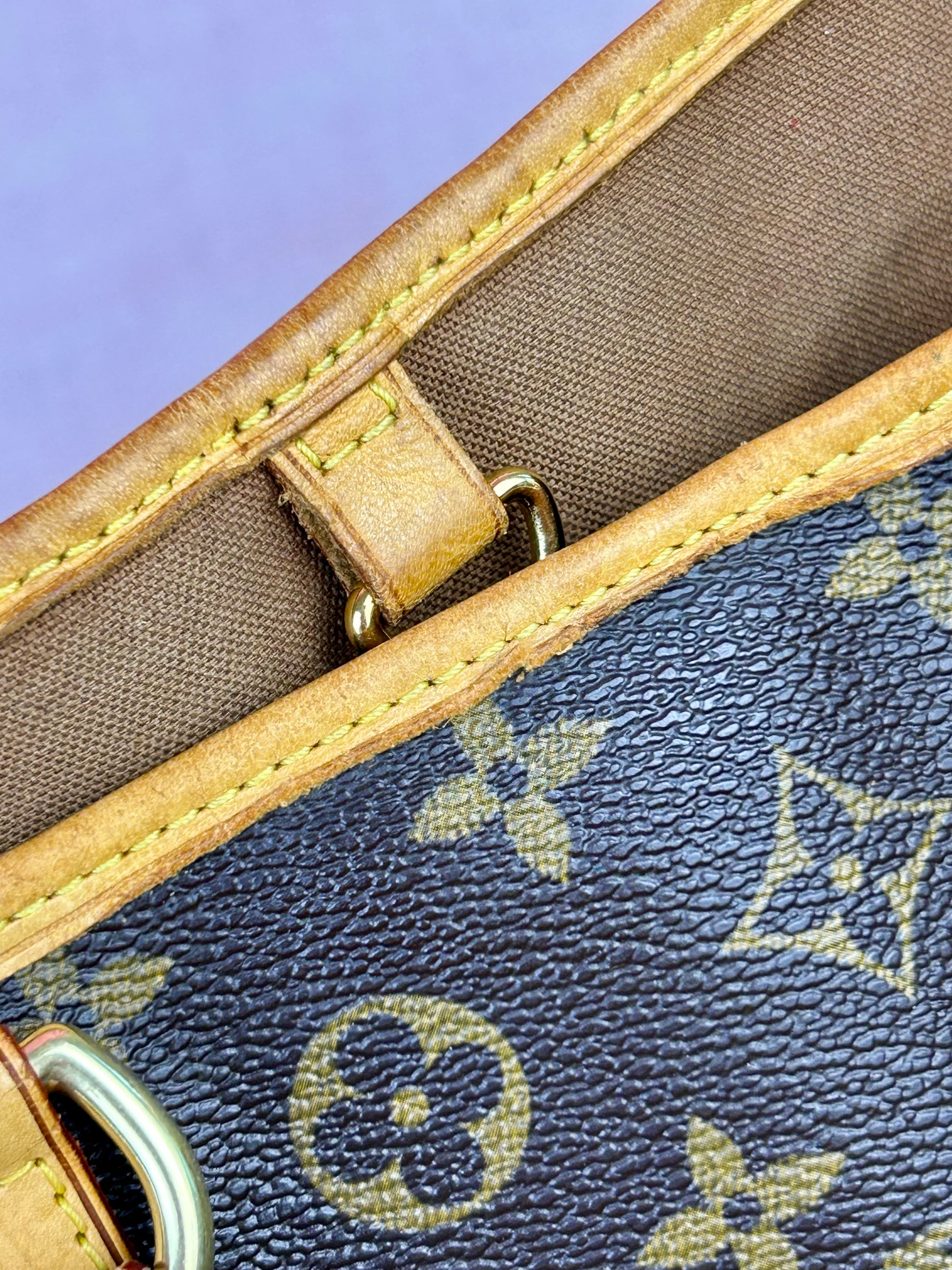 💜 Description: Canvas is in excellent condition—this bag is absolutely gorgeous! Chapes are strong and secure. Leather handles are in excellent condition, sturdy and comfortable for everyday use. Top leather trim has some wearing consistent with normal usage. Side leather straps are dry and have cracks. Four bottom corners have exposed piping, very common for this model. Interior has small spot on the bottom but is otherwise very clean. A spacious and elegant tote, perfect for daily essentials!