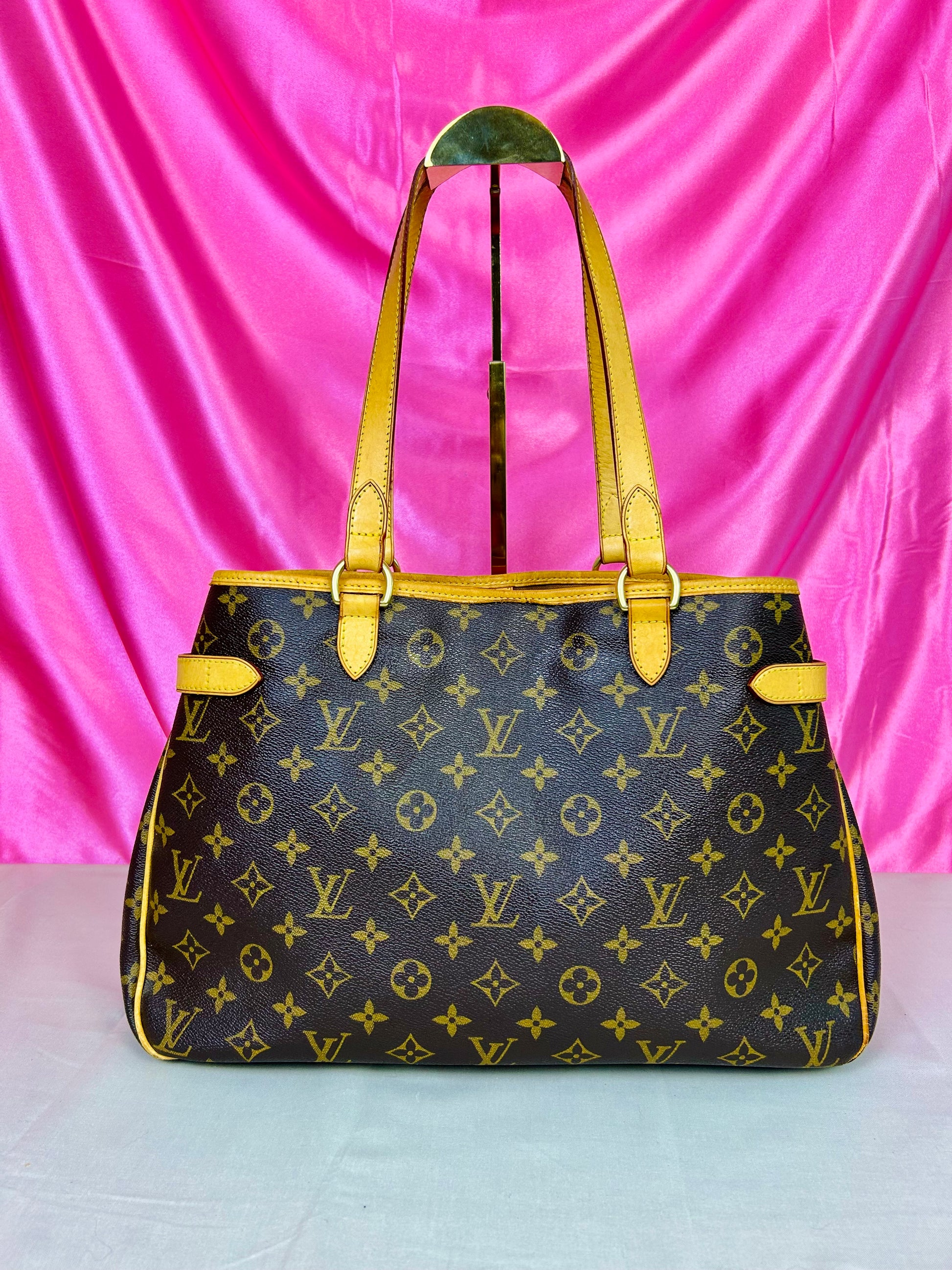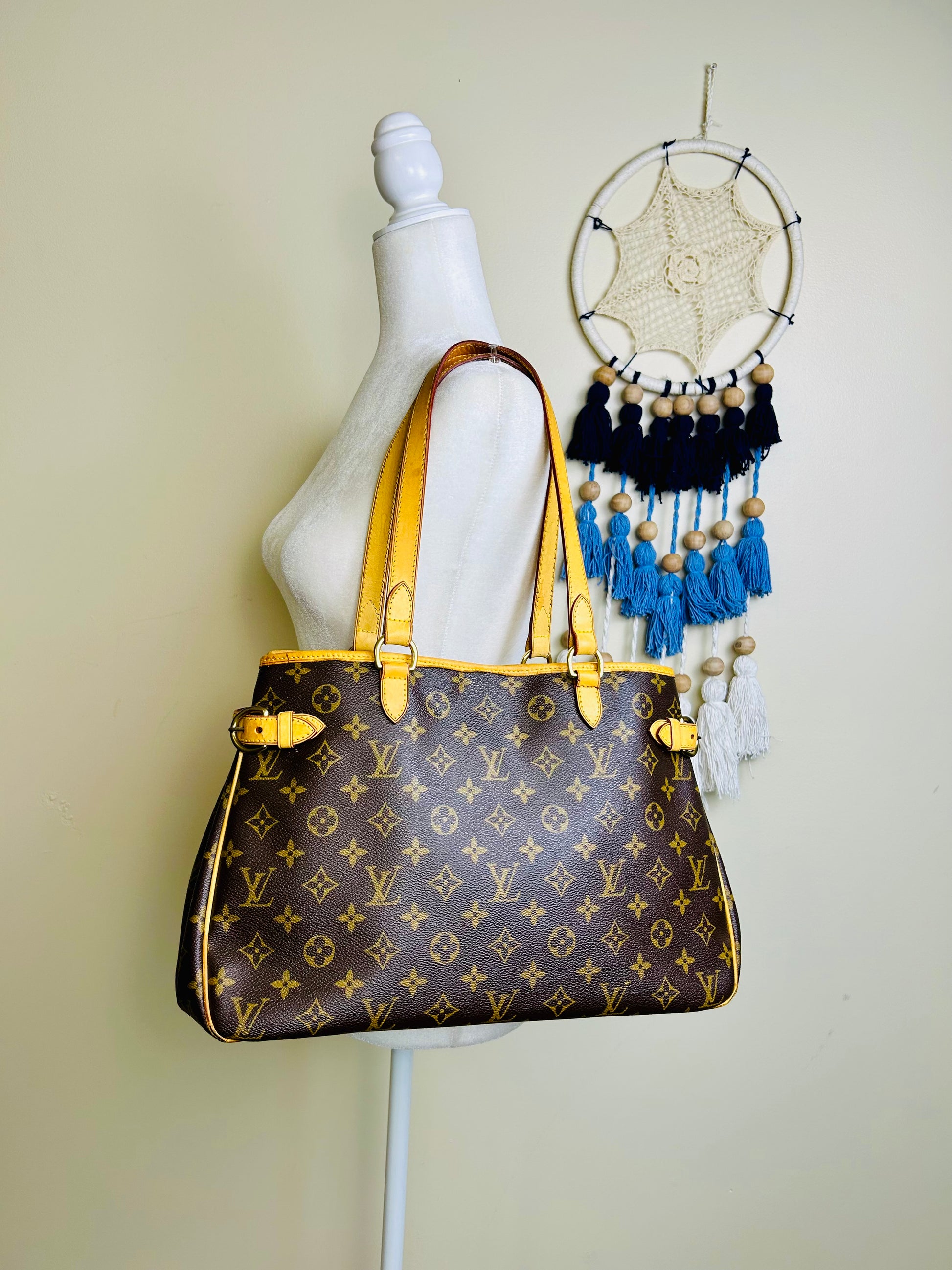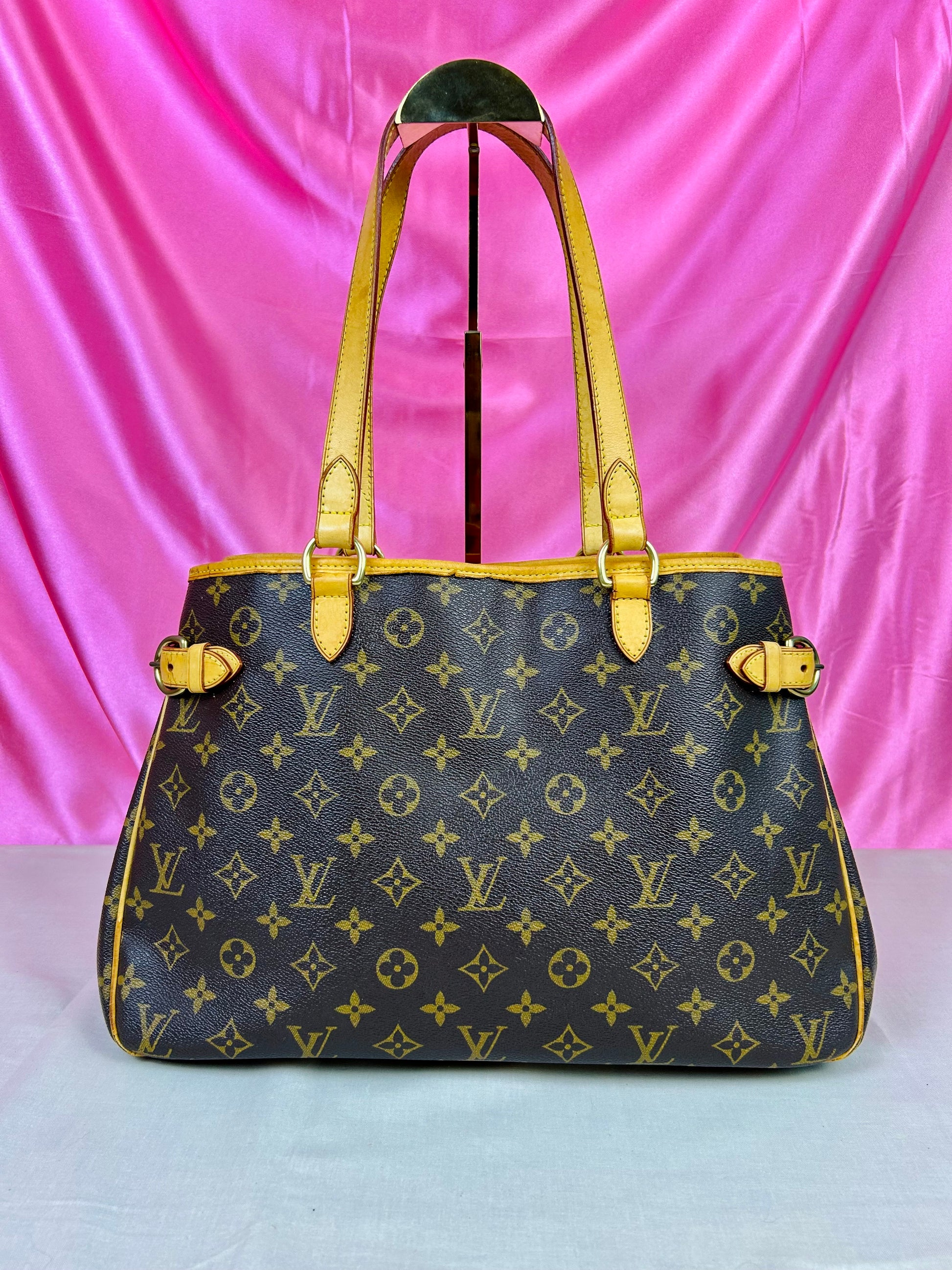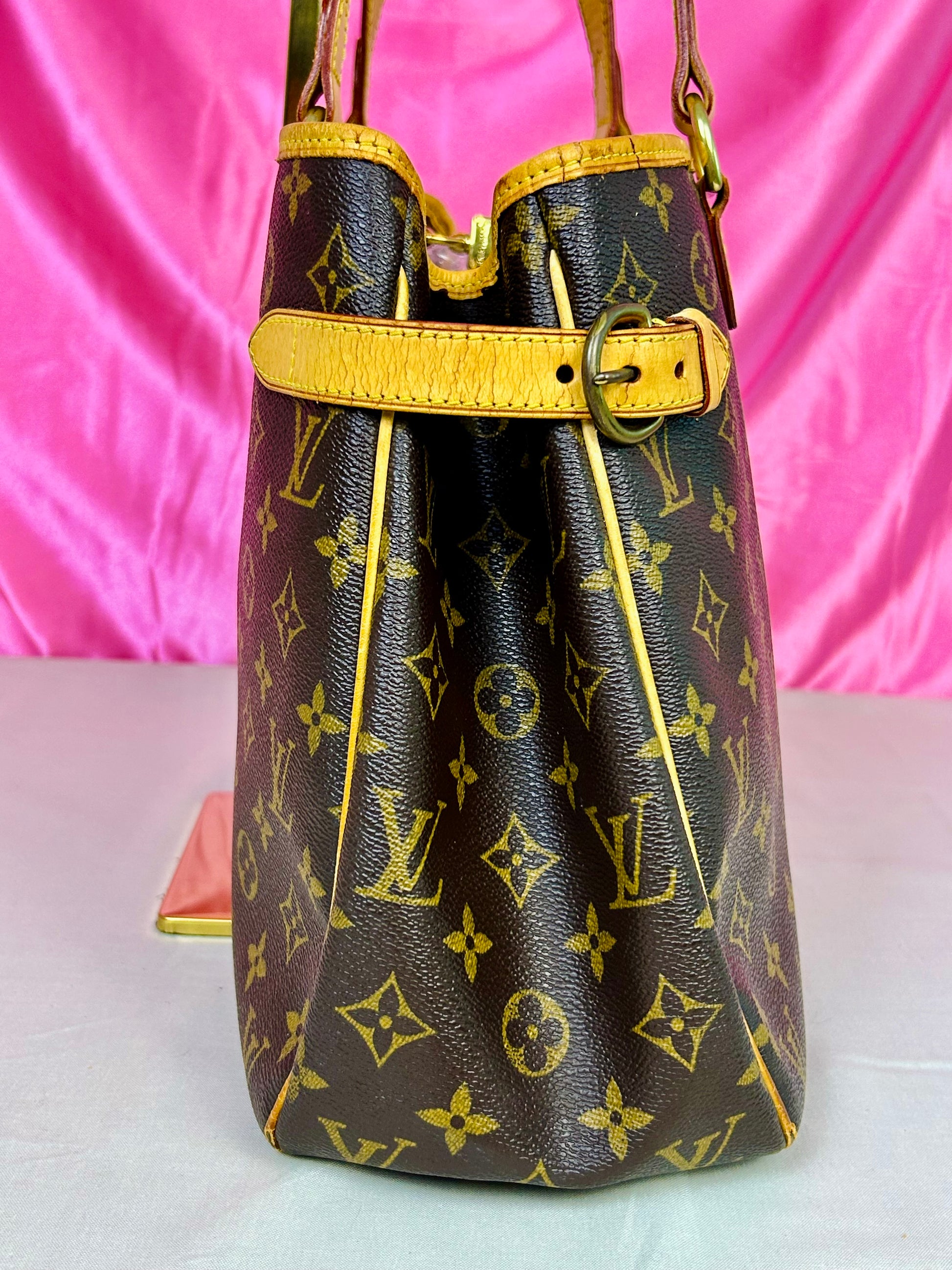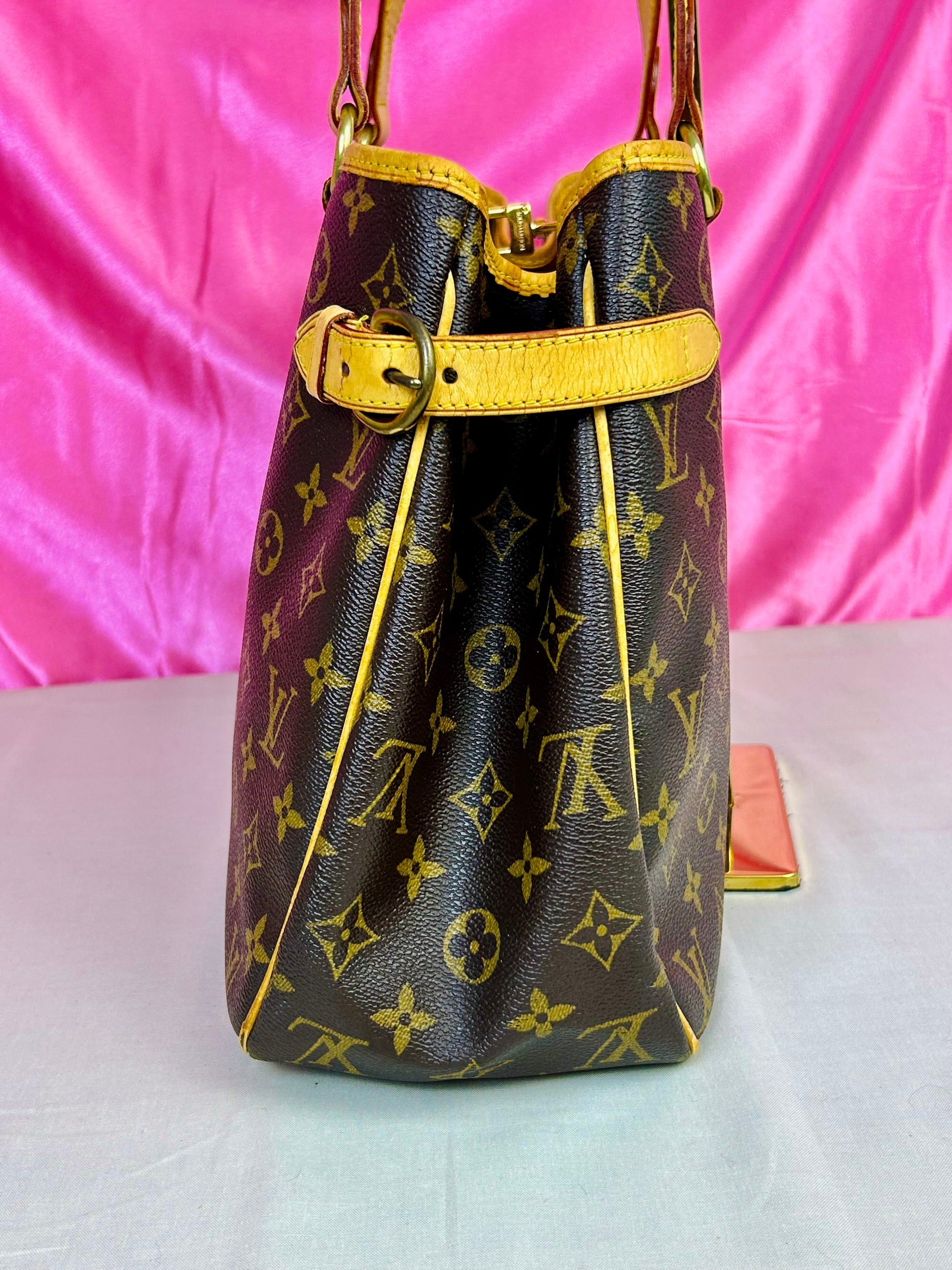 💜 Description: Canvas is in excellent condition—this bag is absolutely gorgeous! Chapes are strong and secure. Leather handles are in excellent condition, sturdy and comfortable for everyday use. Top leather trim has some wearing consistent with normal usage. Side leather straps are dry and have cracks. Four bottom corners have exposed piping, very common for this model. Interior has small spot on the bottom but is otherwise very clean. A spacious and elegant tote, perfect for daily essentials!