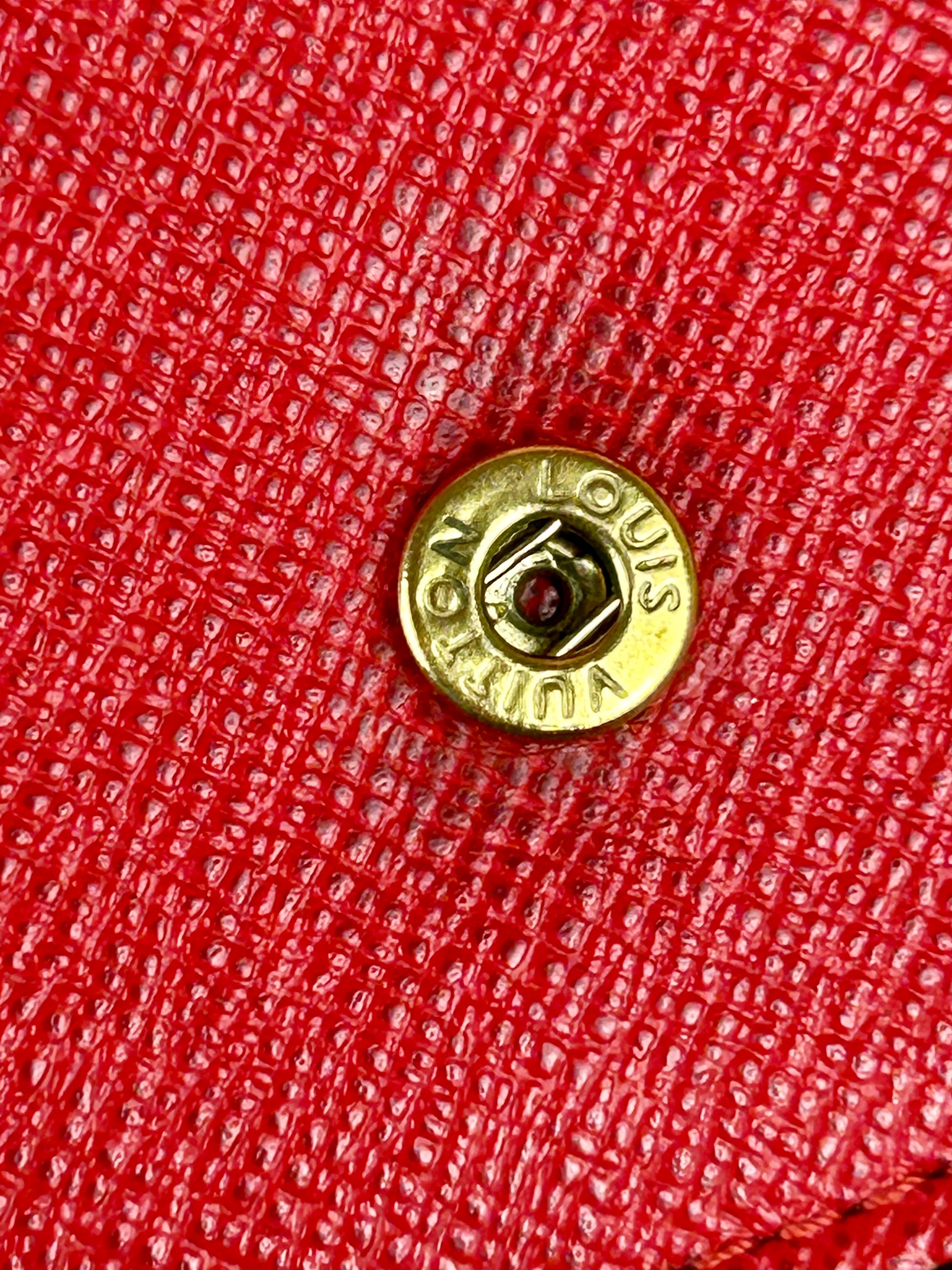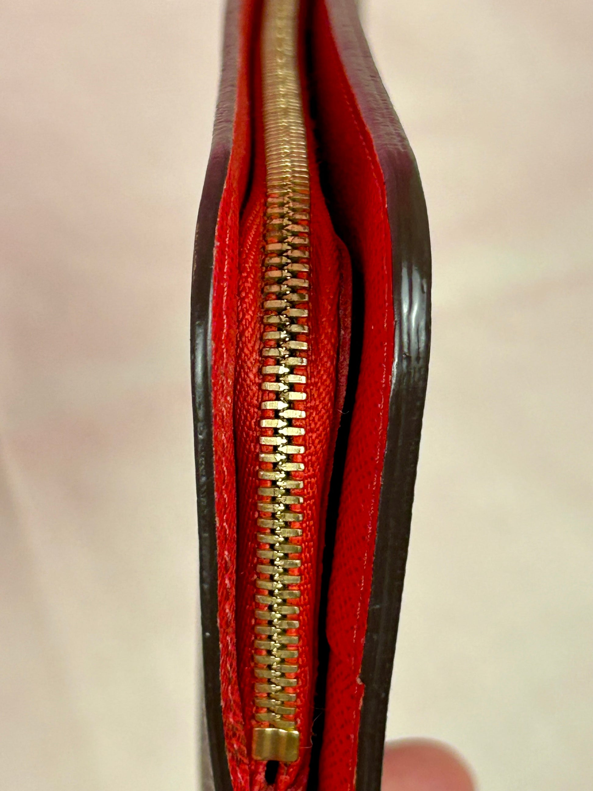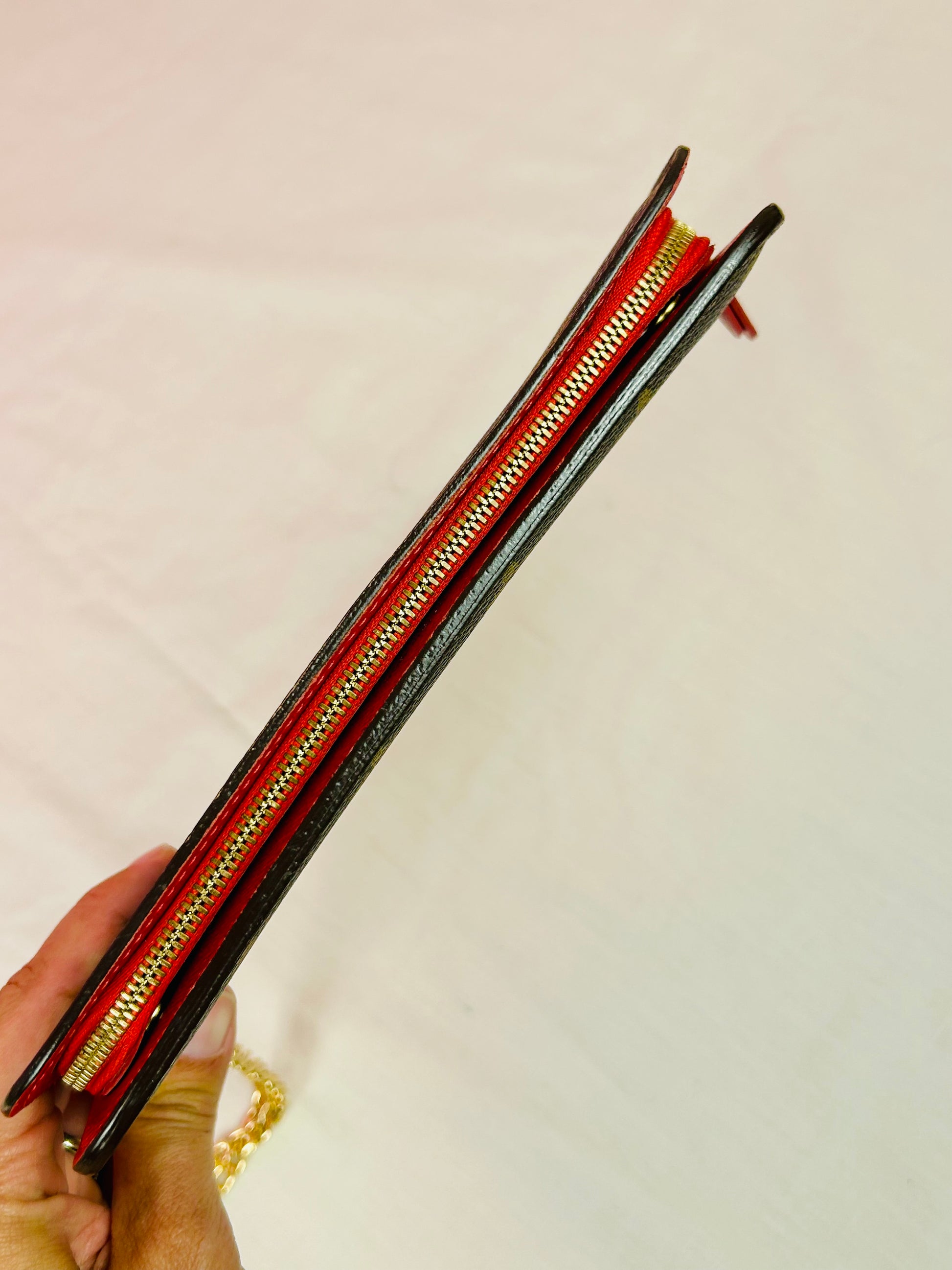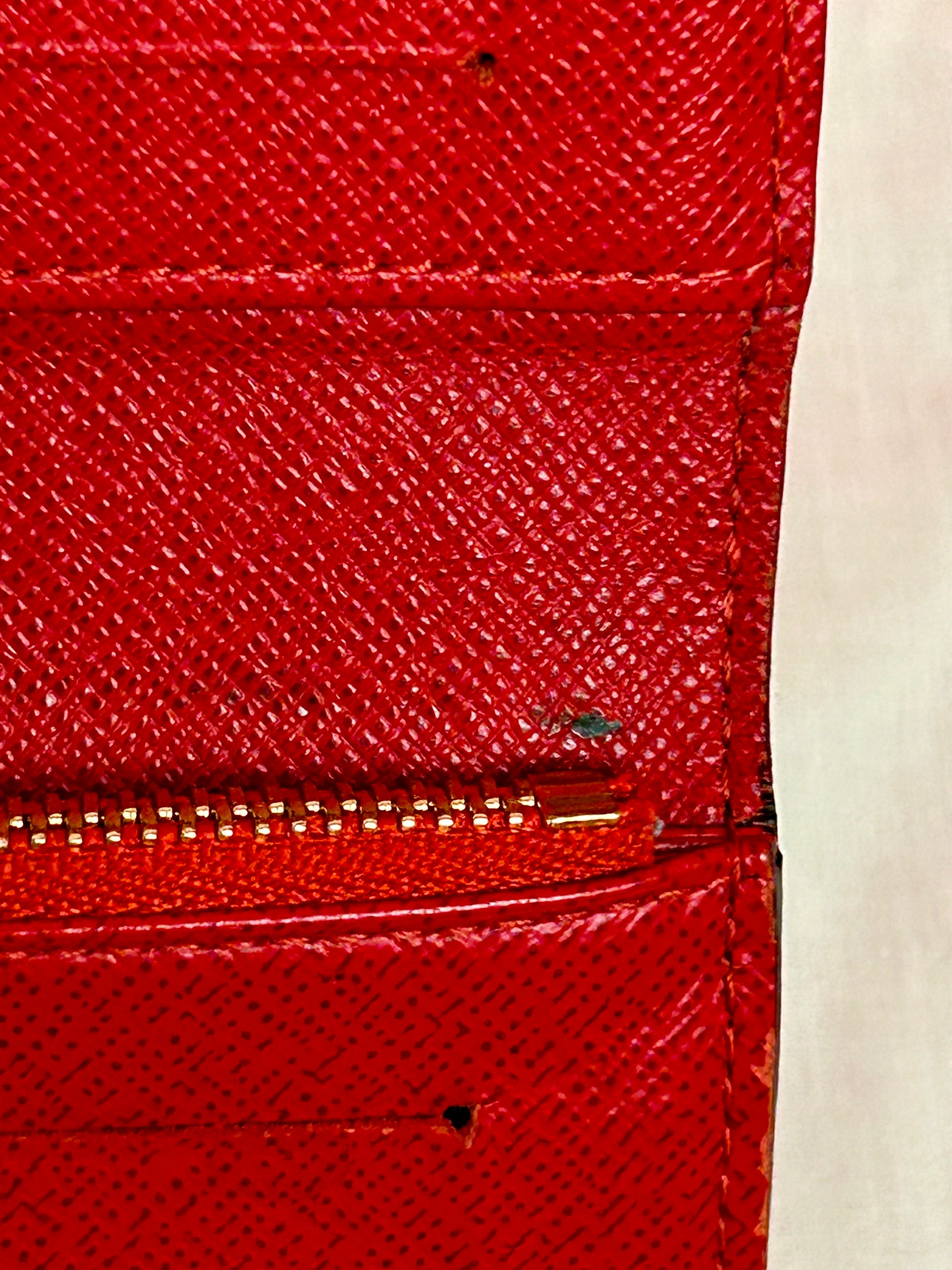 š Description: Canvas is bright and vibrant, small hairline cracks on the bottom corners by the folds. Some indention on the canvas in the bottom corners. Glazing is intact. Interior is clean, with some small rubbings. Interior features 12 card slots, 2 slip compartments, and two zippered coin pouches. Zippers work smoothly and hardware is shiny. can be used as a wristlet with generic chain.Ā