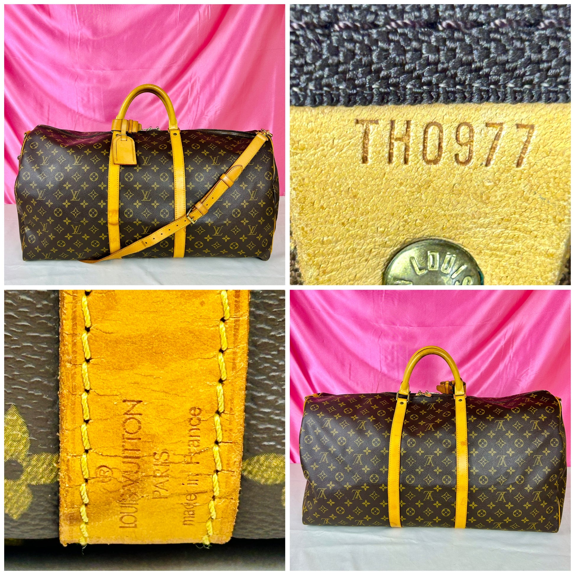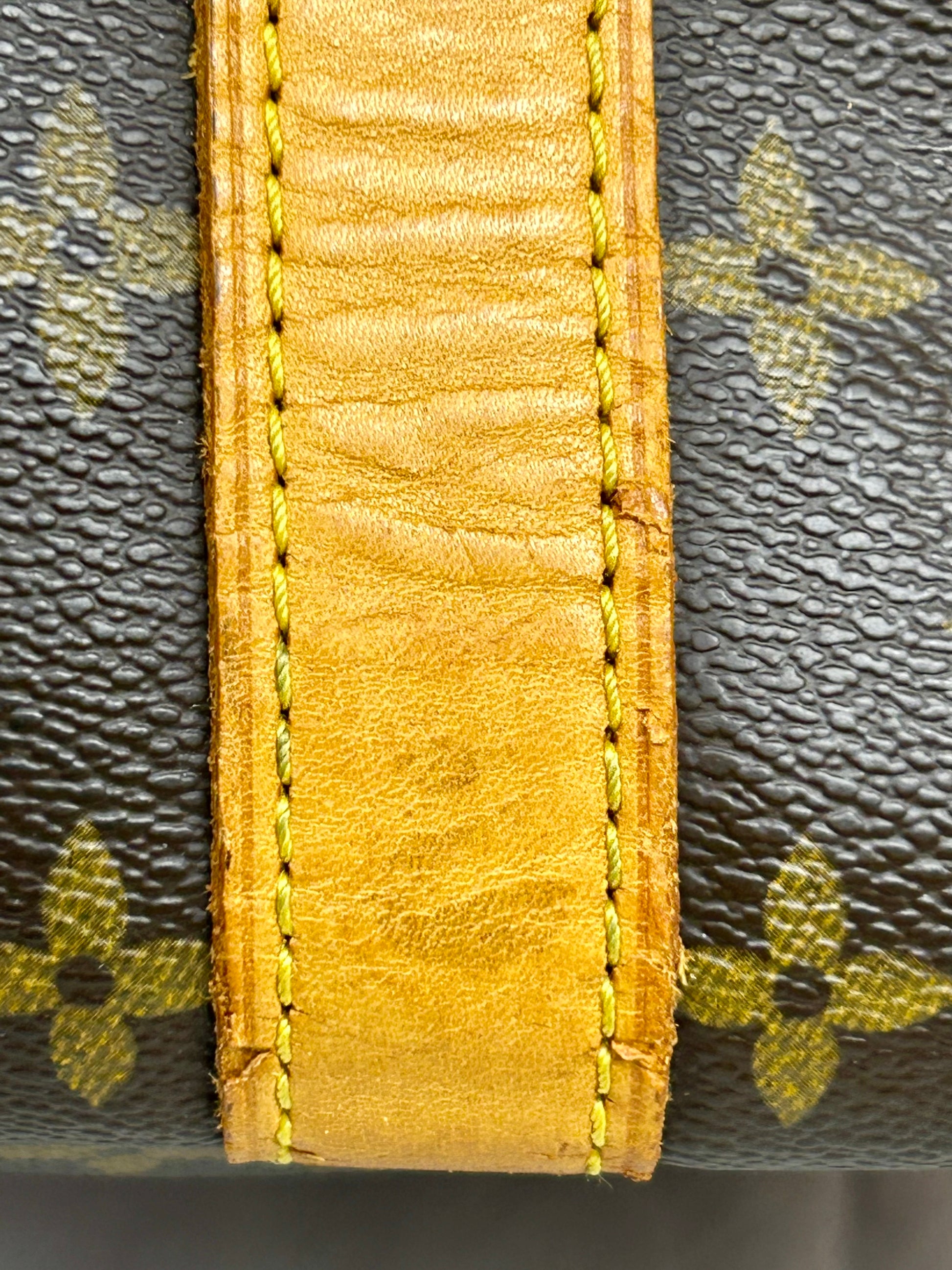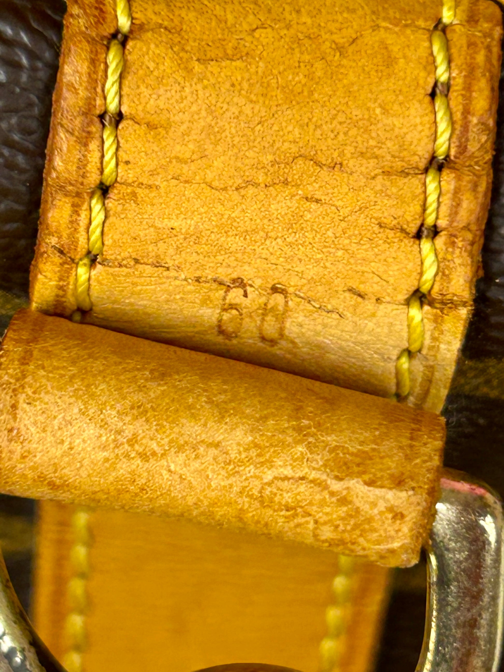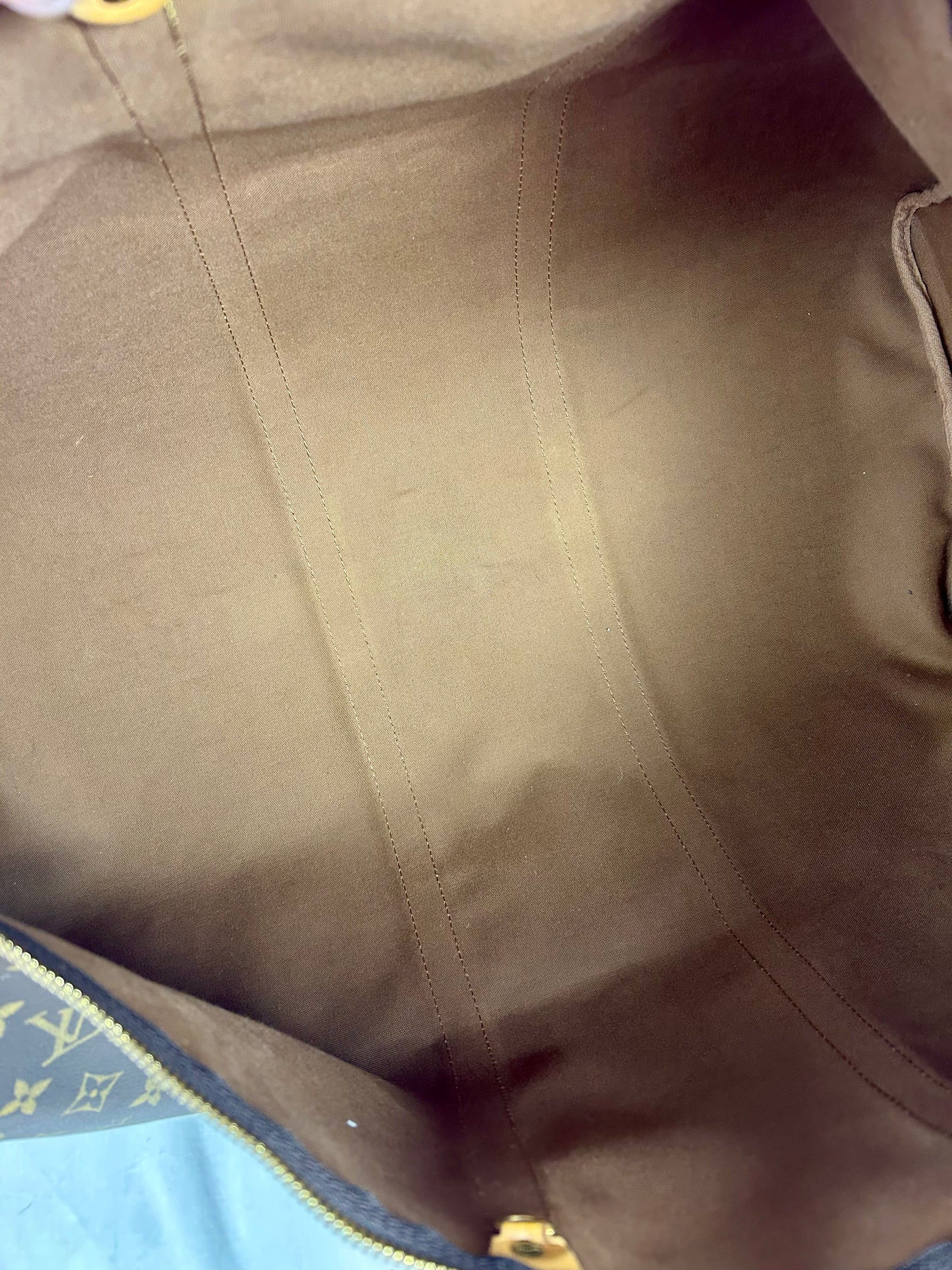 💜 Description: Keepall Bandoulière 60 is the largest size of this model. Monogram canvas is in beautiful condition with no cracks or peeling. The leather is a light patina overall is in good condition with some water marking and wrinkling thoughout. Some wrinkling is found on the leather trim on the side and bottom from being folded in storage. Wear on the bottom consistent with normal usage. Handles have some darkening and marks consistent with normal usage but no tears or cracks. Piping has light wear, and some darkening throughout. Leather bandoulière strap has some marking but is in great condition overall. Chapes are strong and intact. Interior is clean and in excellent condition, making this the perfect travel companion for a stylish getaway. Hardware is fully functional. Zipper pulls well. Will be shipped folded flat. Includes authentic LV name tag, LV poignette (with some cracking) and LV leather strap at no additional charge.