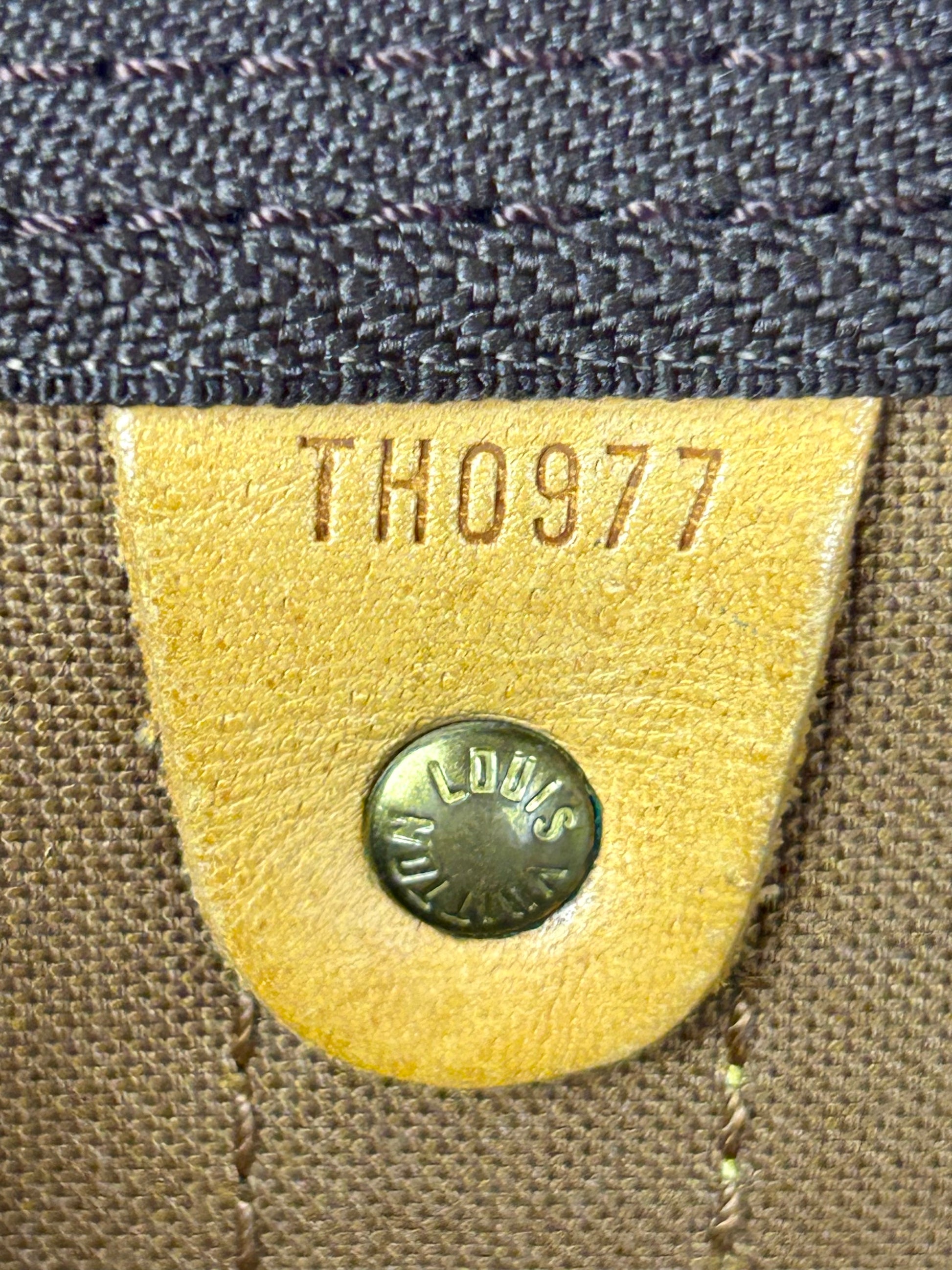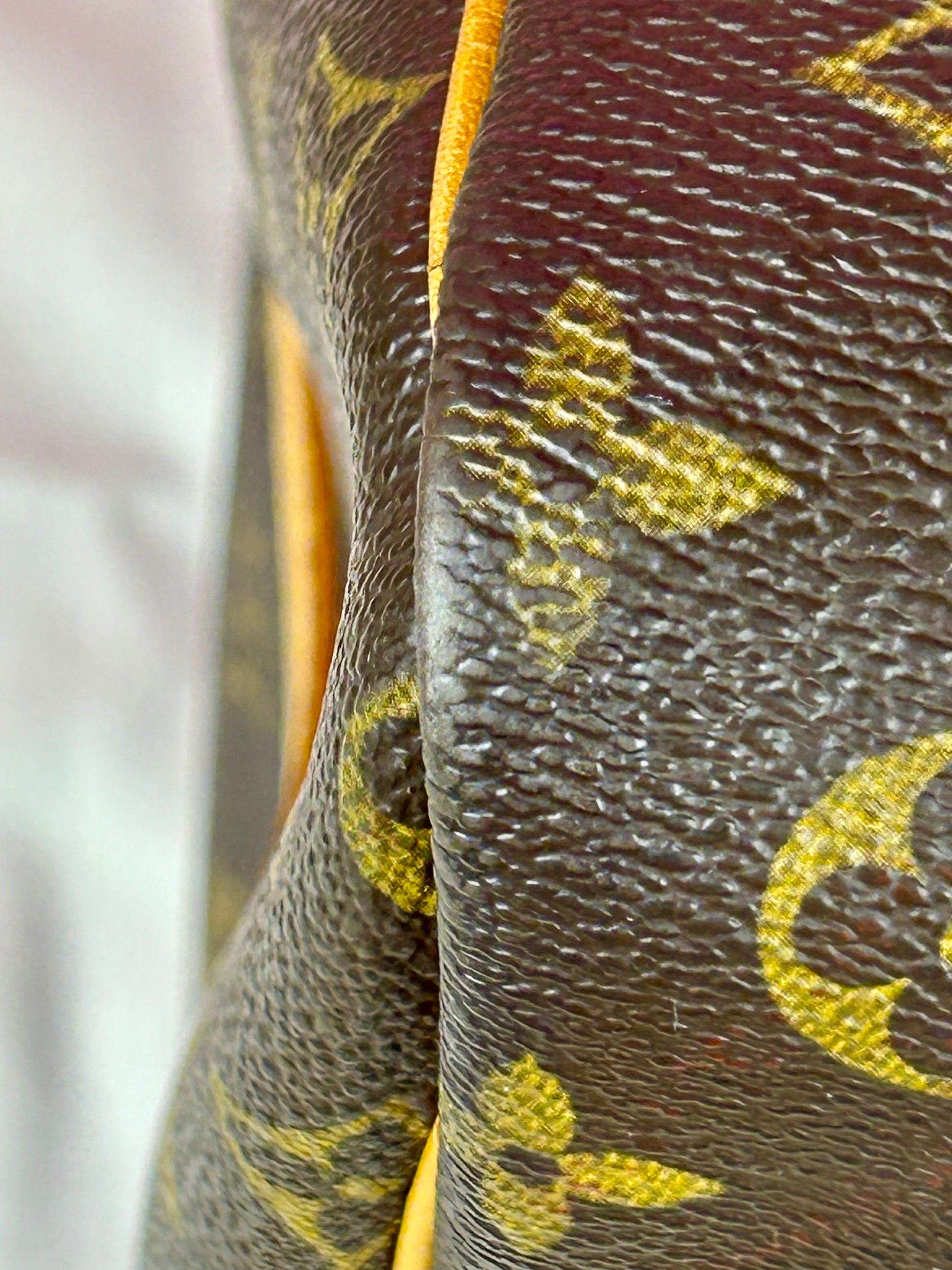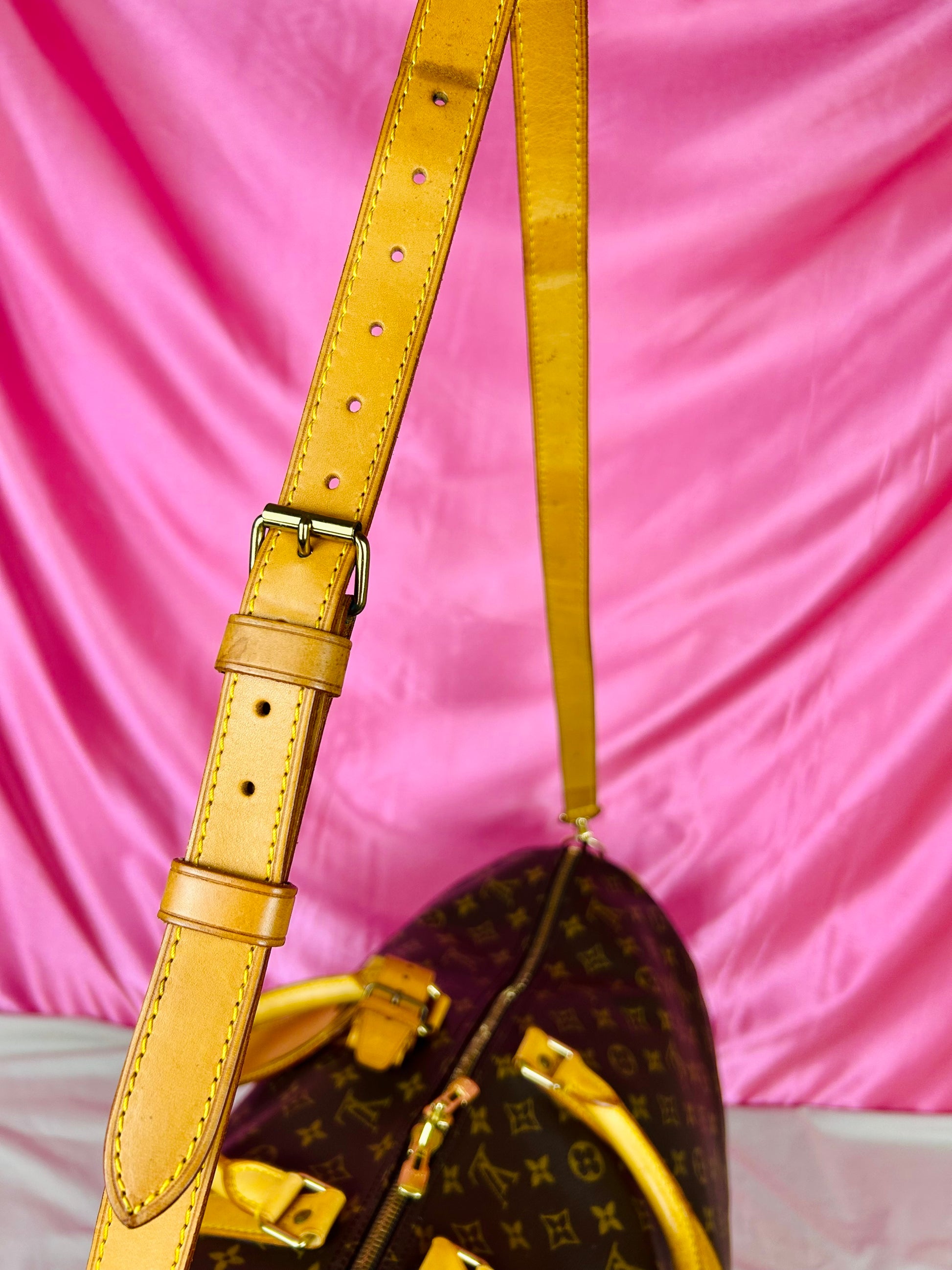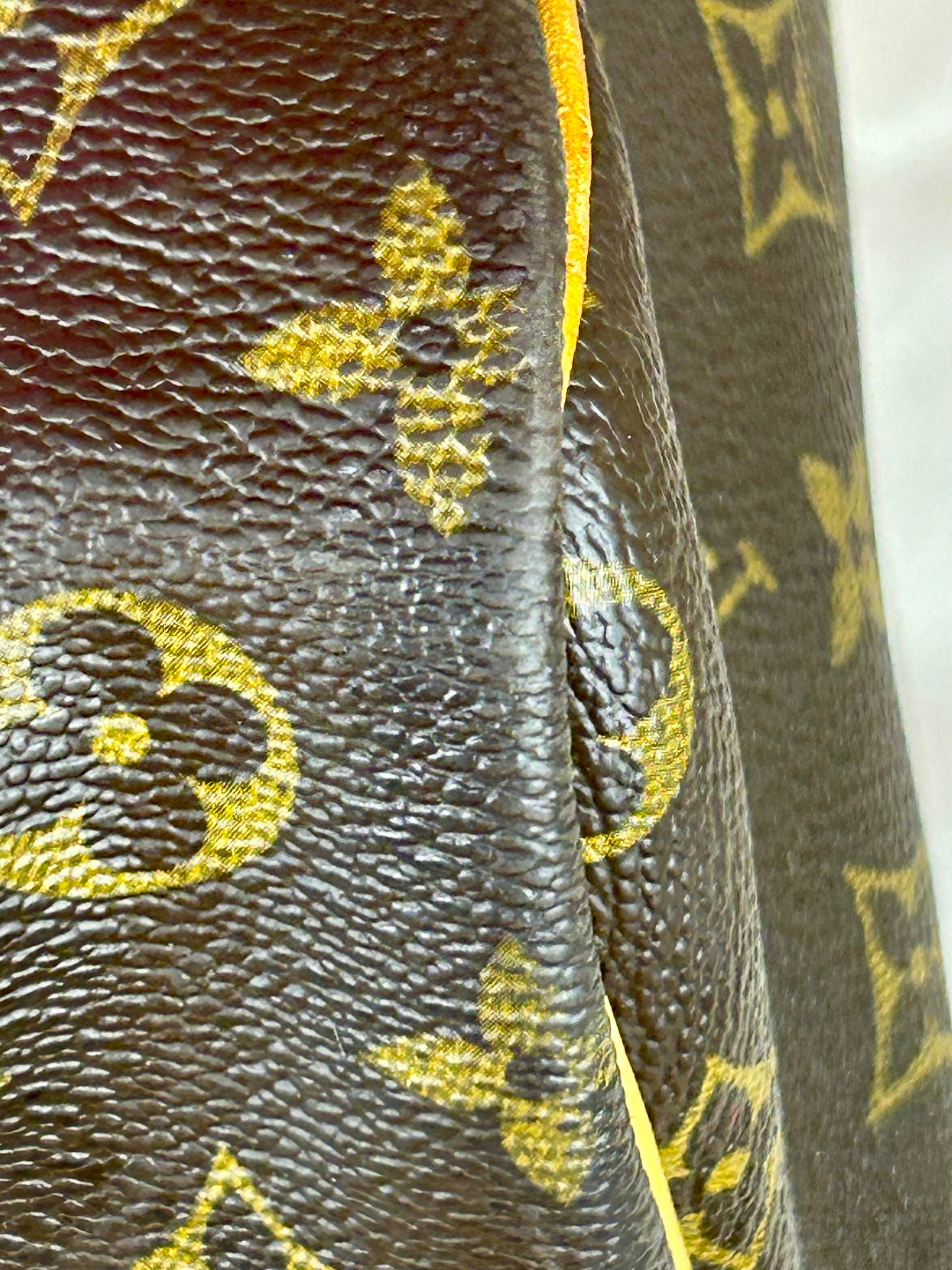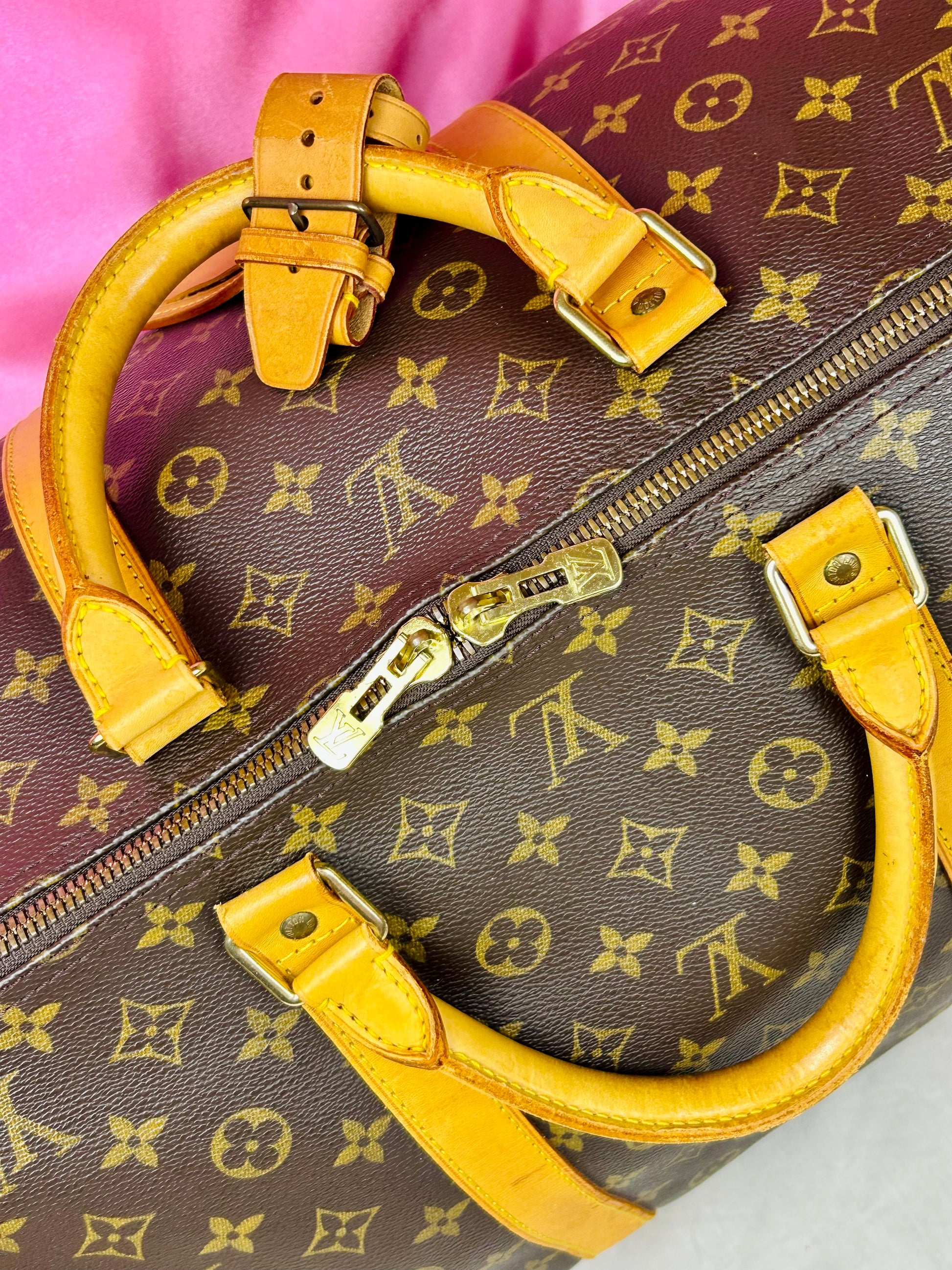 💜 Description: Keepall Bandoulière 60 is the largest size of this model. Monogram canvas is in beautiful condition with no cracks or peeling. The leather is a light patina overall is in good condition with some water marking and wrinkling thoughout. Some wrinkling is found on the leather trim on the side and bottom from being folded in storage. Wear on the bottom consistent with normal usage. Handles have some darkening and marks consistent with normal usage but no tears or cracks. Piping has light wear, and some darkening throughout. Leather bandoulière strap has some marking but is in great condition overall. Chapes are strong and intact. Interior is clean and in excellent condition, making this the perfect travel companion for a stylish getaway. Hardware is fully functional. Zipper pulls well. Will be shipped folded flat. Includes authentic LV name tag, LV poignette (with some cracking) and LV leather strap at no additional charge.