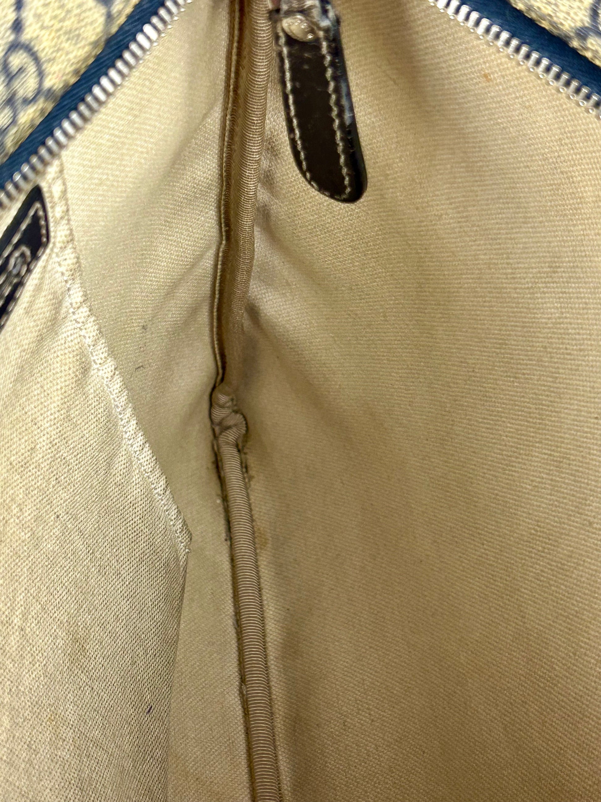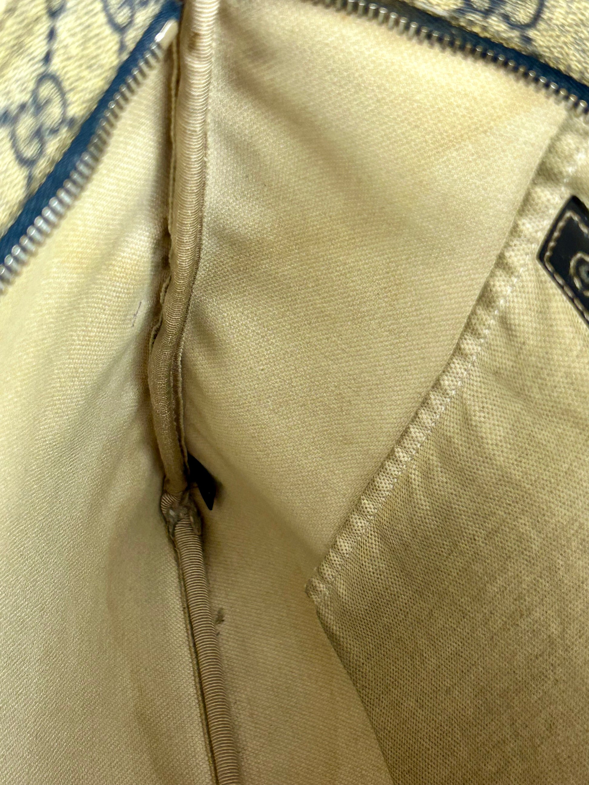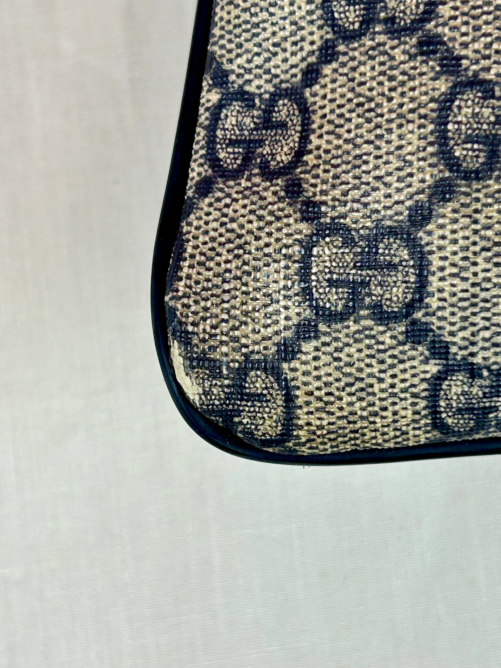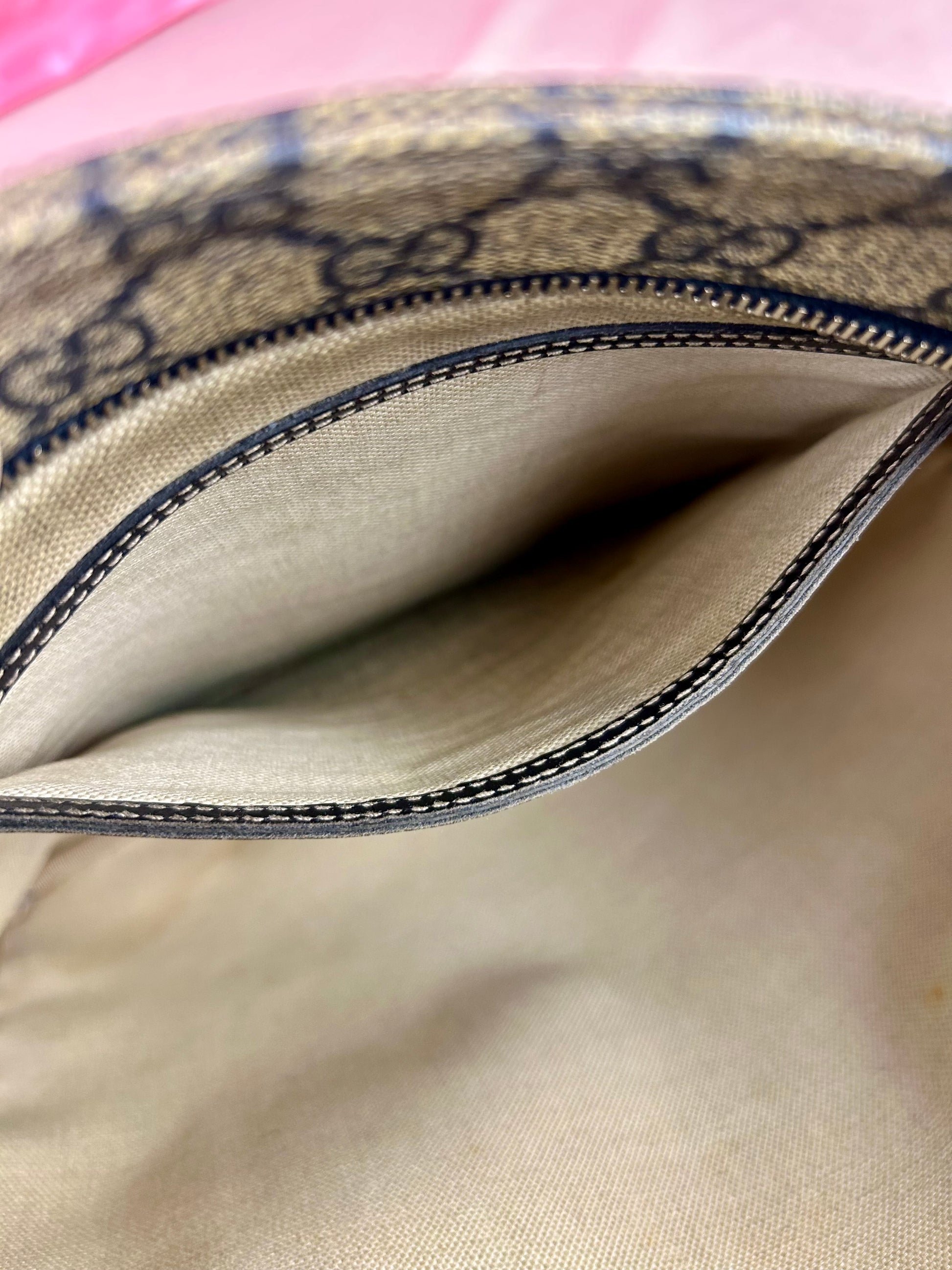 💜 Description: GG canvas is in beautiful condition with some small wear on the bottom corners. Piping is in excellent condition. Strap shows some light pilling but remains sturdy. Interior and interior pocket have markings and staining throughout. Hardware remains shiny, and zipper pulls smoothly. Leather zipper puller feels stretched at the chape.