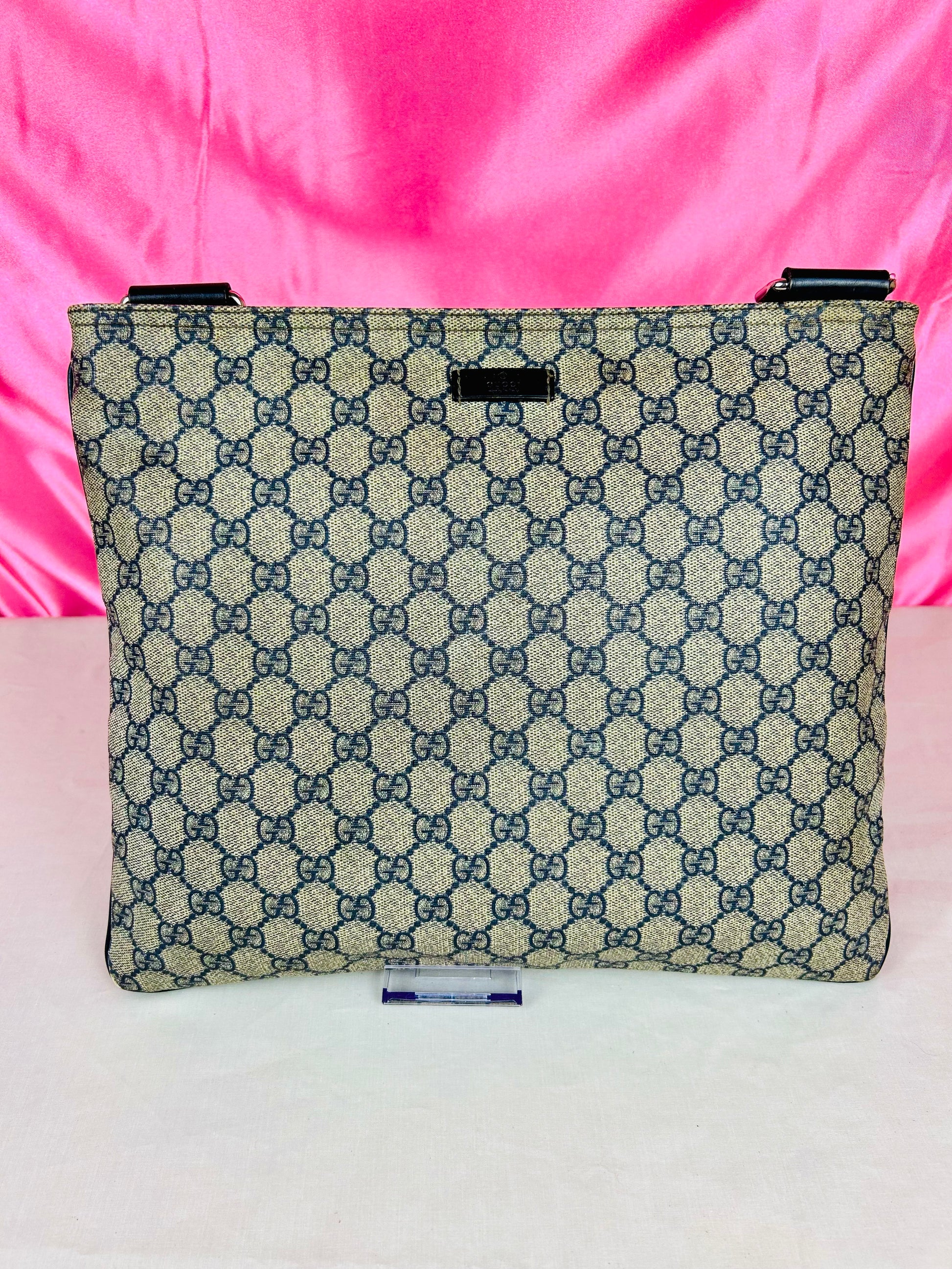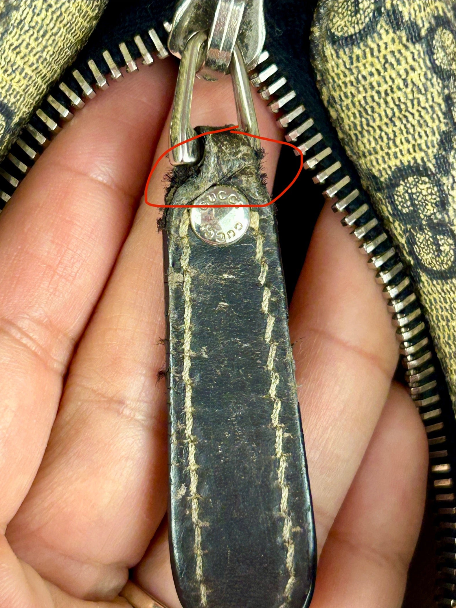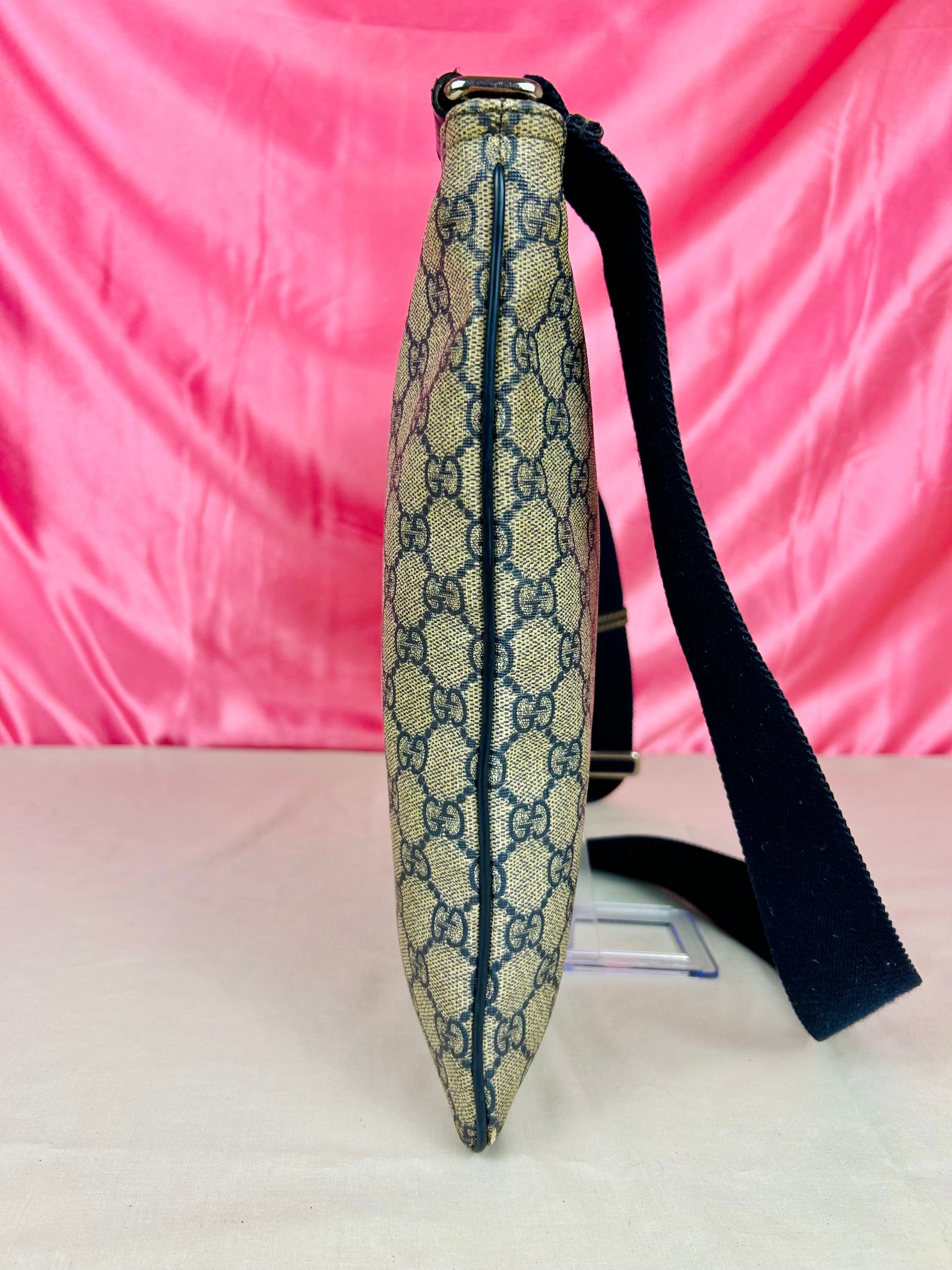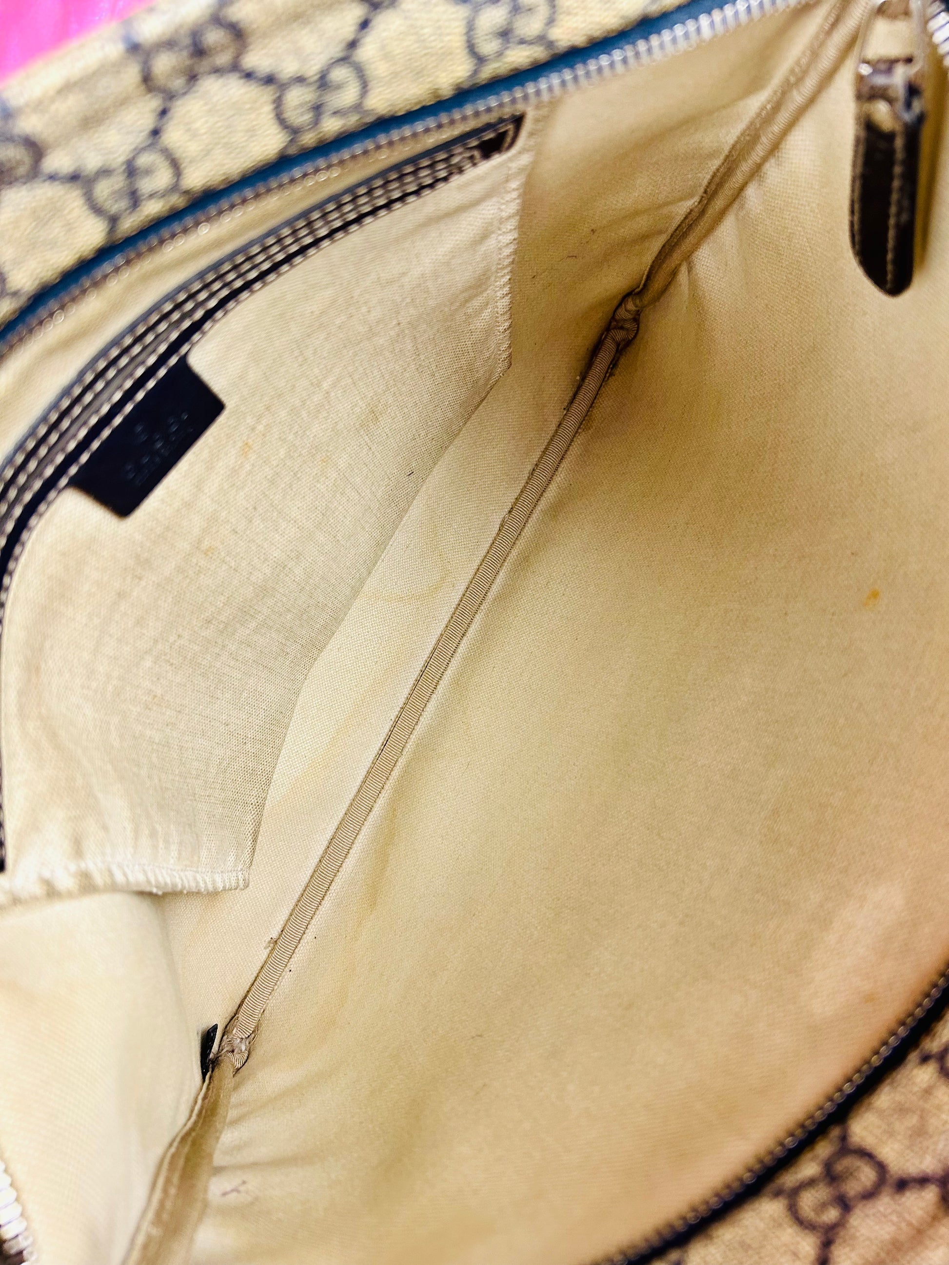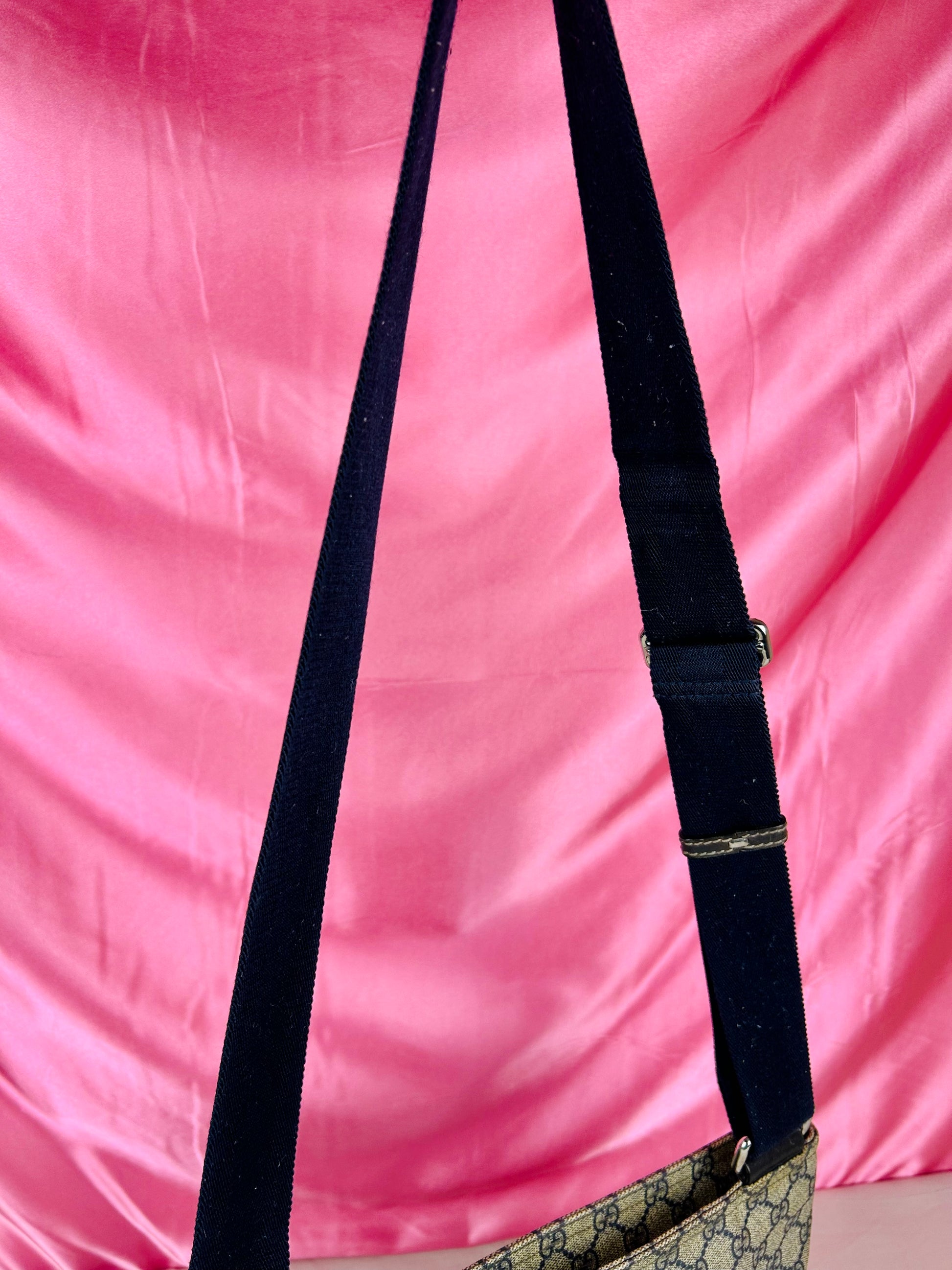 💜 Description: GG canvas is in beautiful condition with some small wear on the bottom corners. Piping is in excellent condition. Strap shows some light pilling but remains sturdy. Interior and interior pocket have markings and staining throughout. Hardware remains shiny, and zipper pulls smoothly. Leather zipper puller feels stretched at the chape.