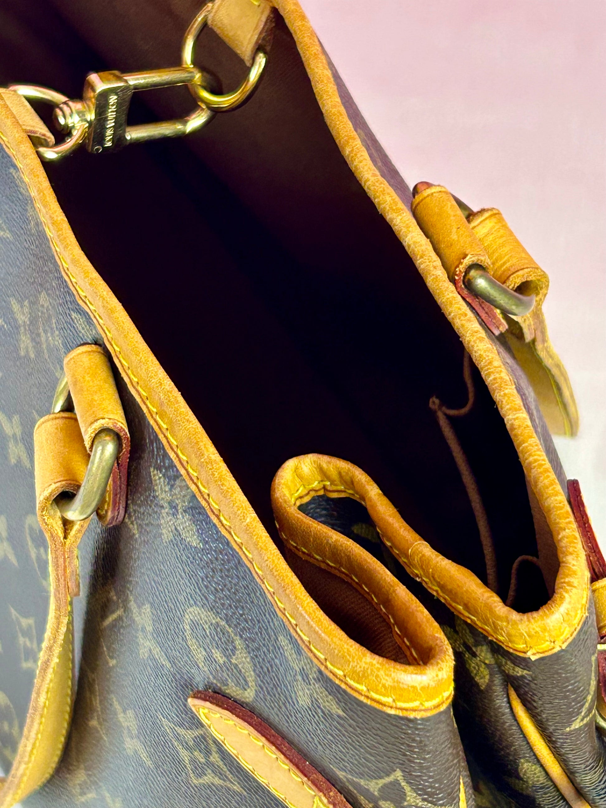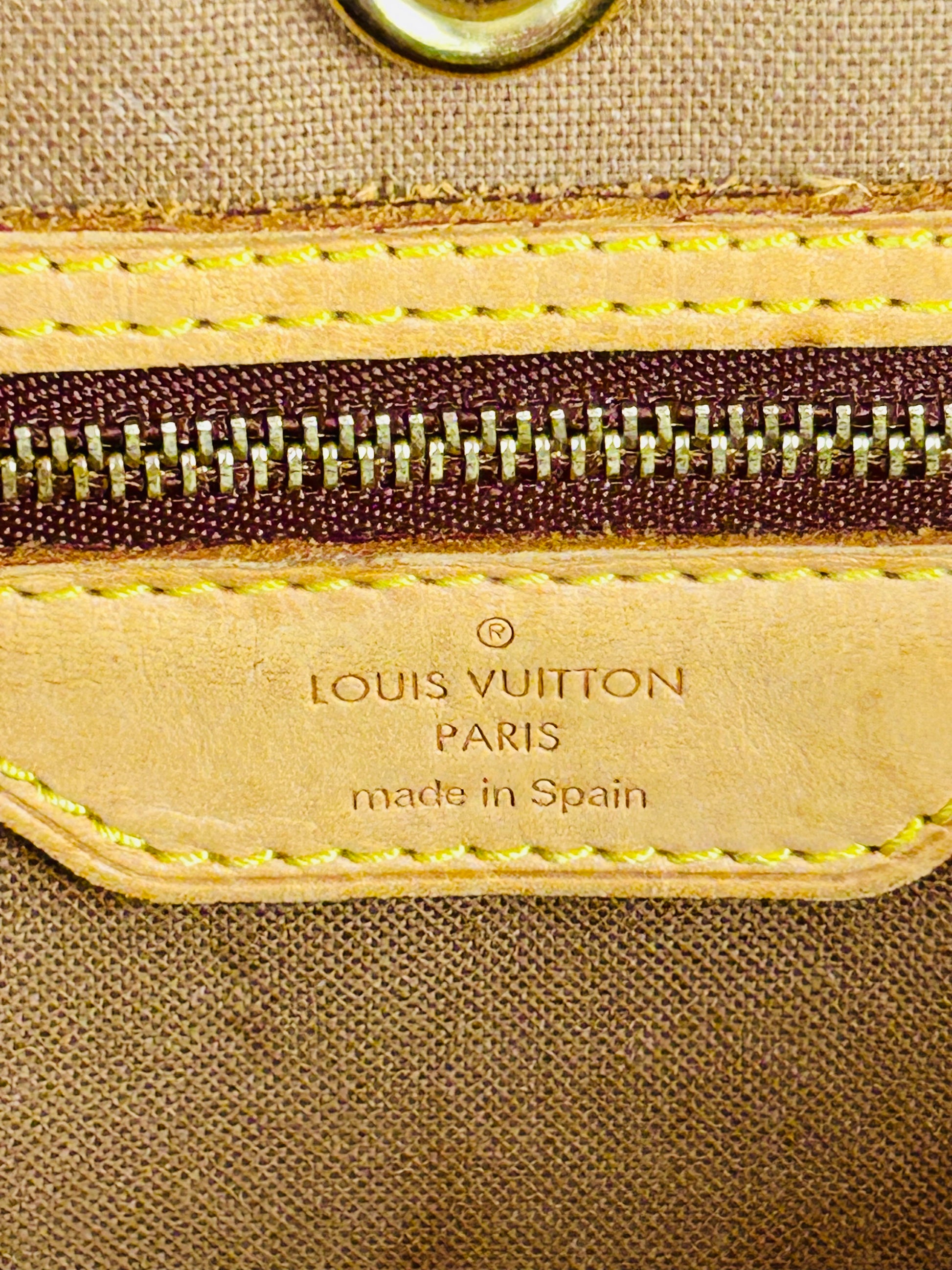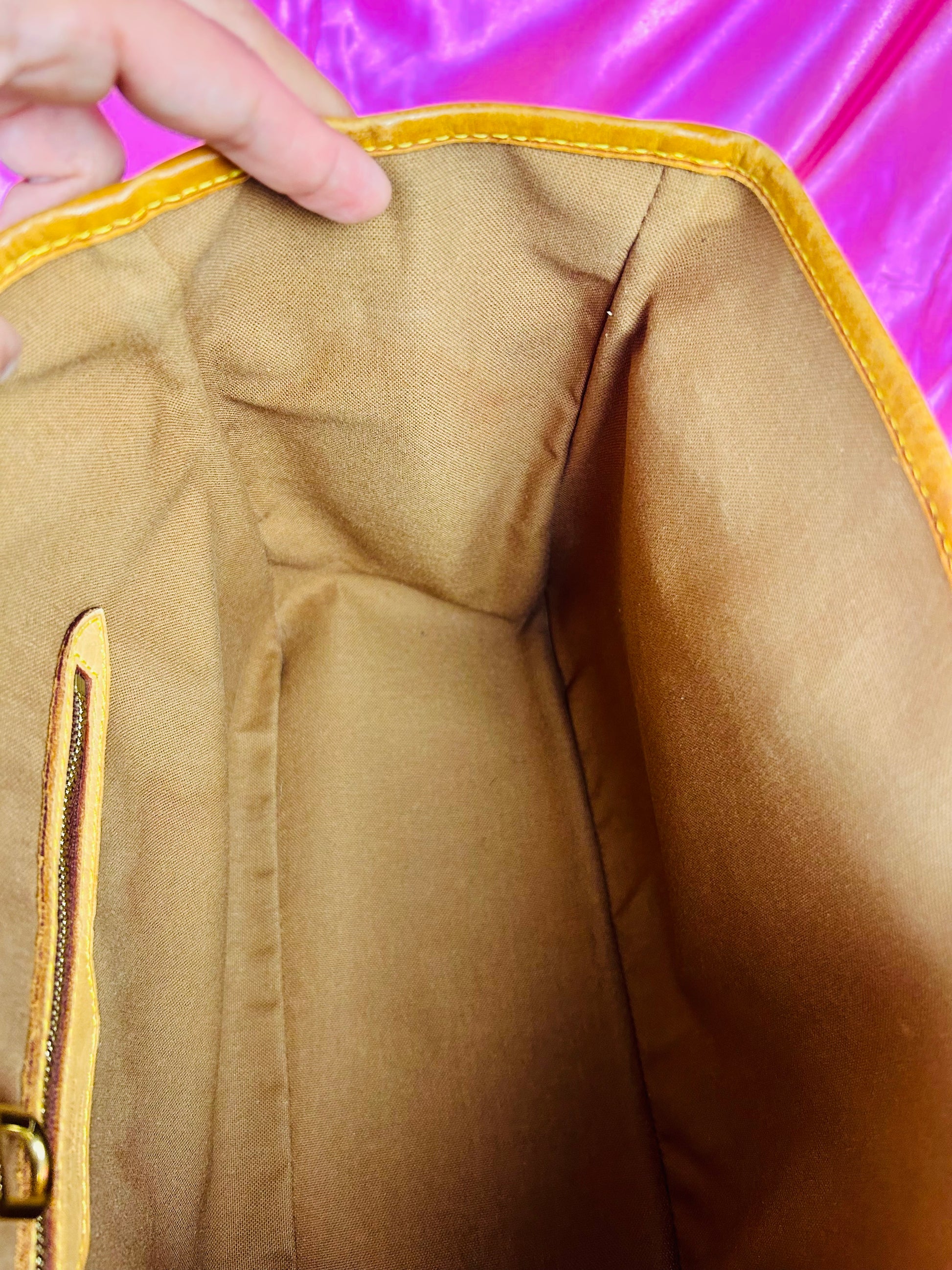 💜 Description: A classic, structured shoulder tote that balances style and function. Canvas is vibrant and in excellent condition. Piping shows signs of normal wear, with small areas of exposed piping on three bottom corners—typical for this model and consistent with normal use. Top leather trim has some small water markings, but no tears or cracks. Interior has a slight discoloration and only a small marking inside the pocket. Zipper pull functions smoothly, and hardware remains shiny and vibrant. Leather side straps are in excellent condition. Handles are strong and in great shape with no cracks or tears; underside of handles shows minor wear from regular handling. All four chapes are in excellent condition.