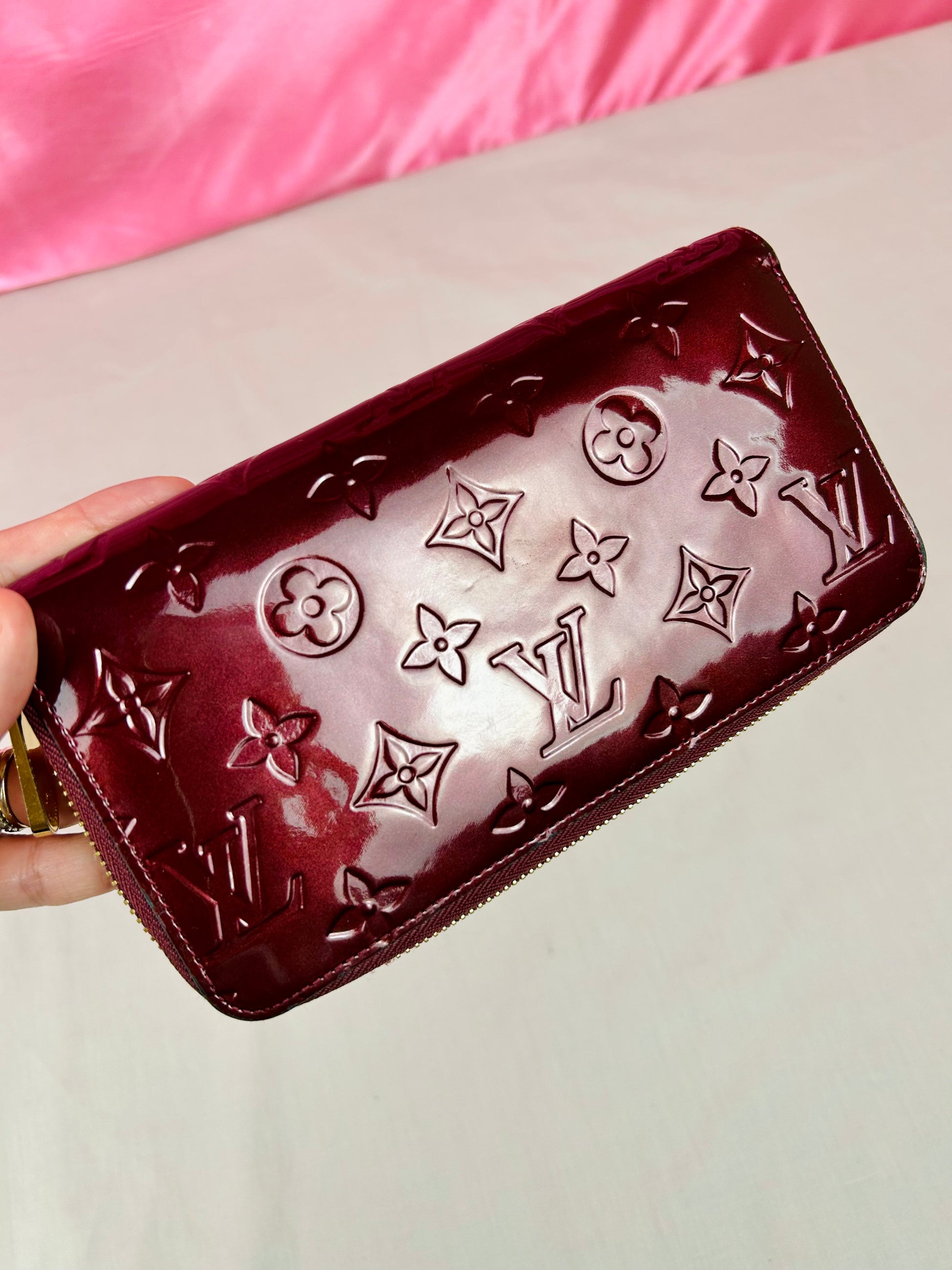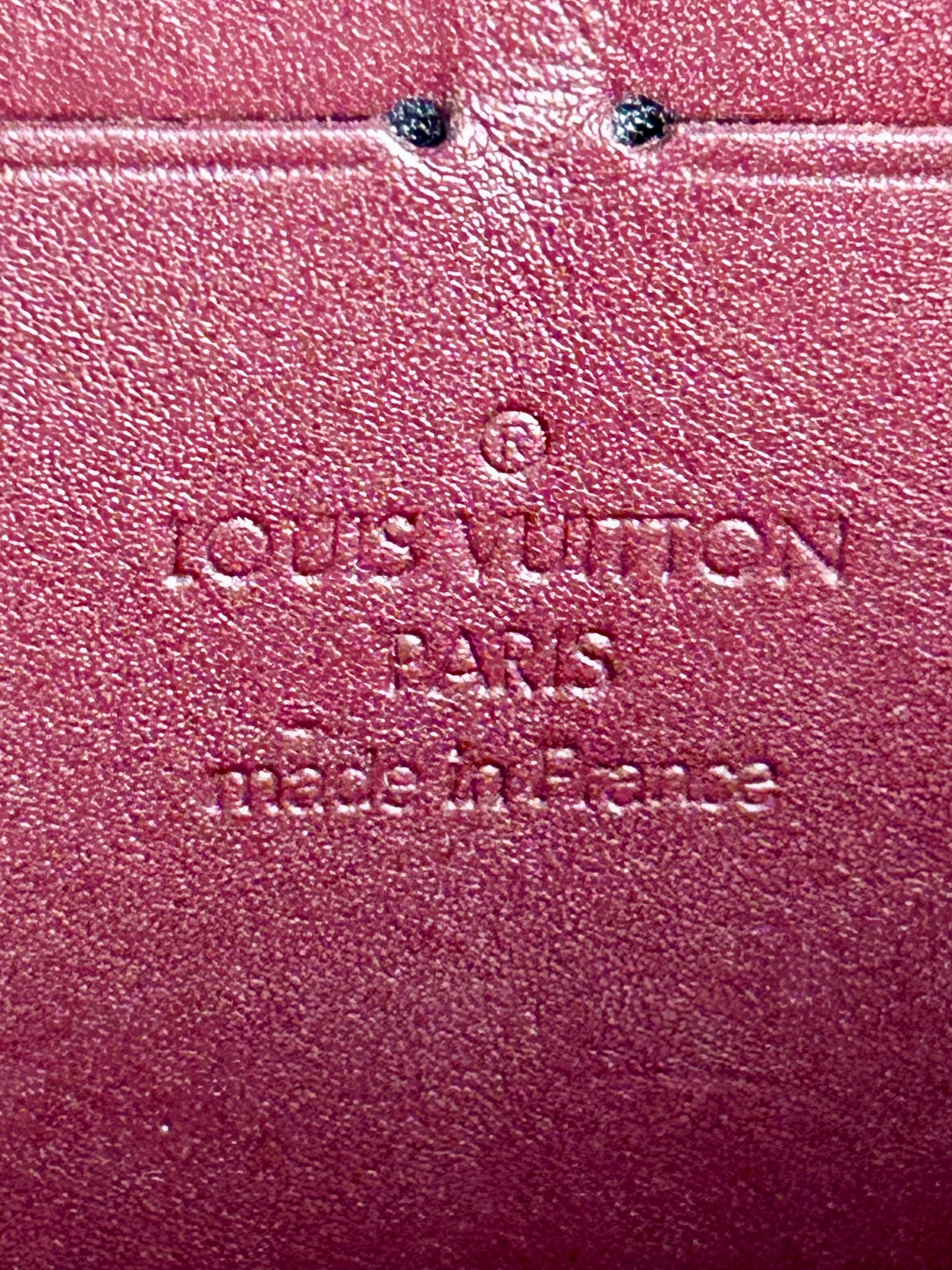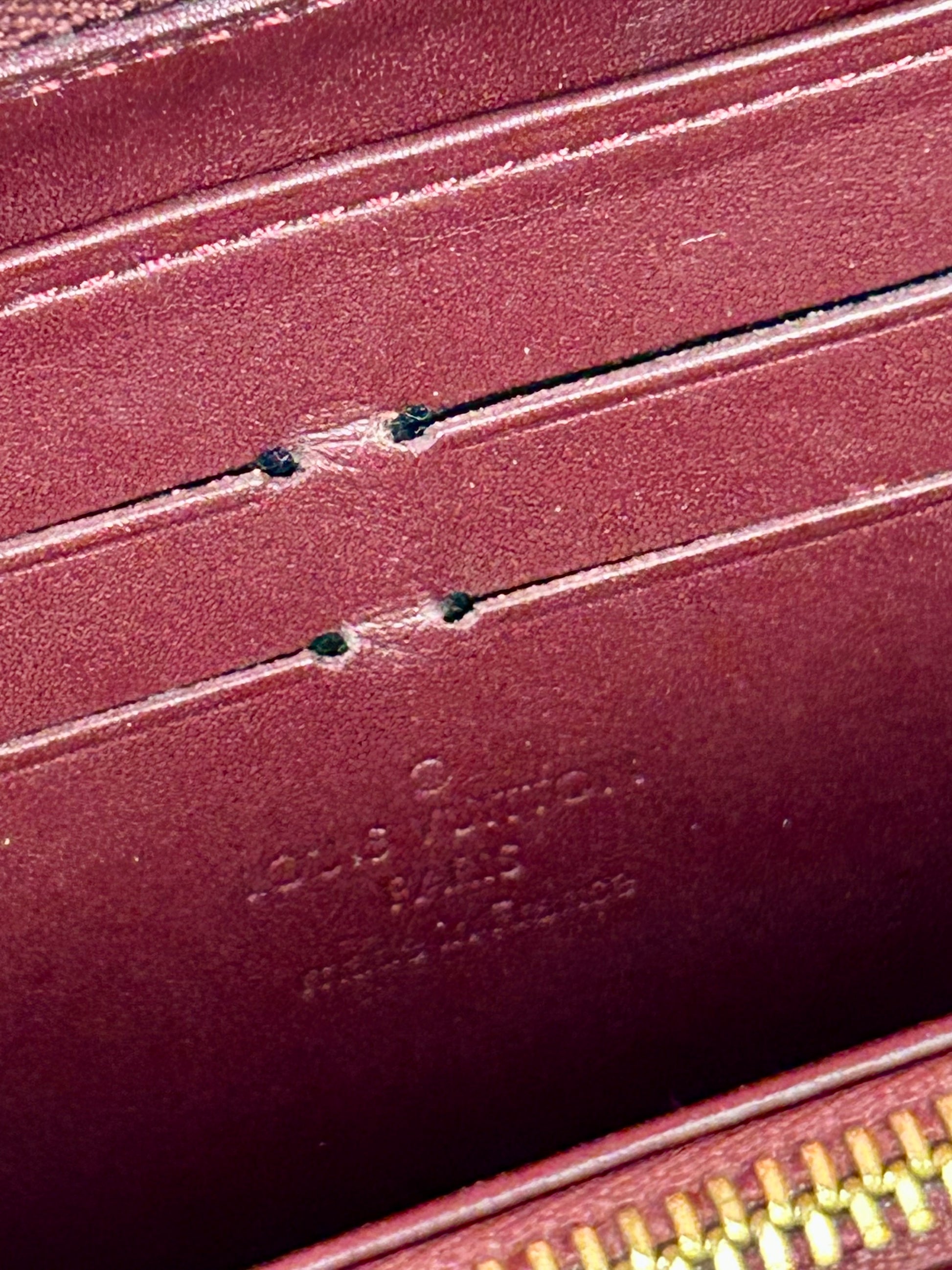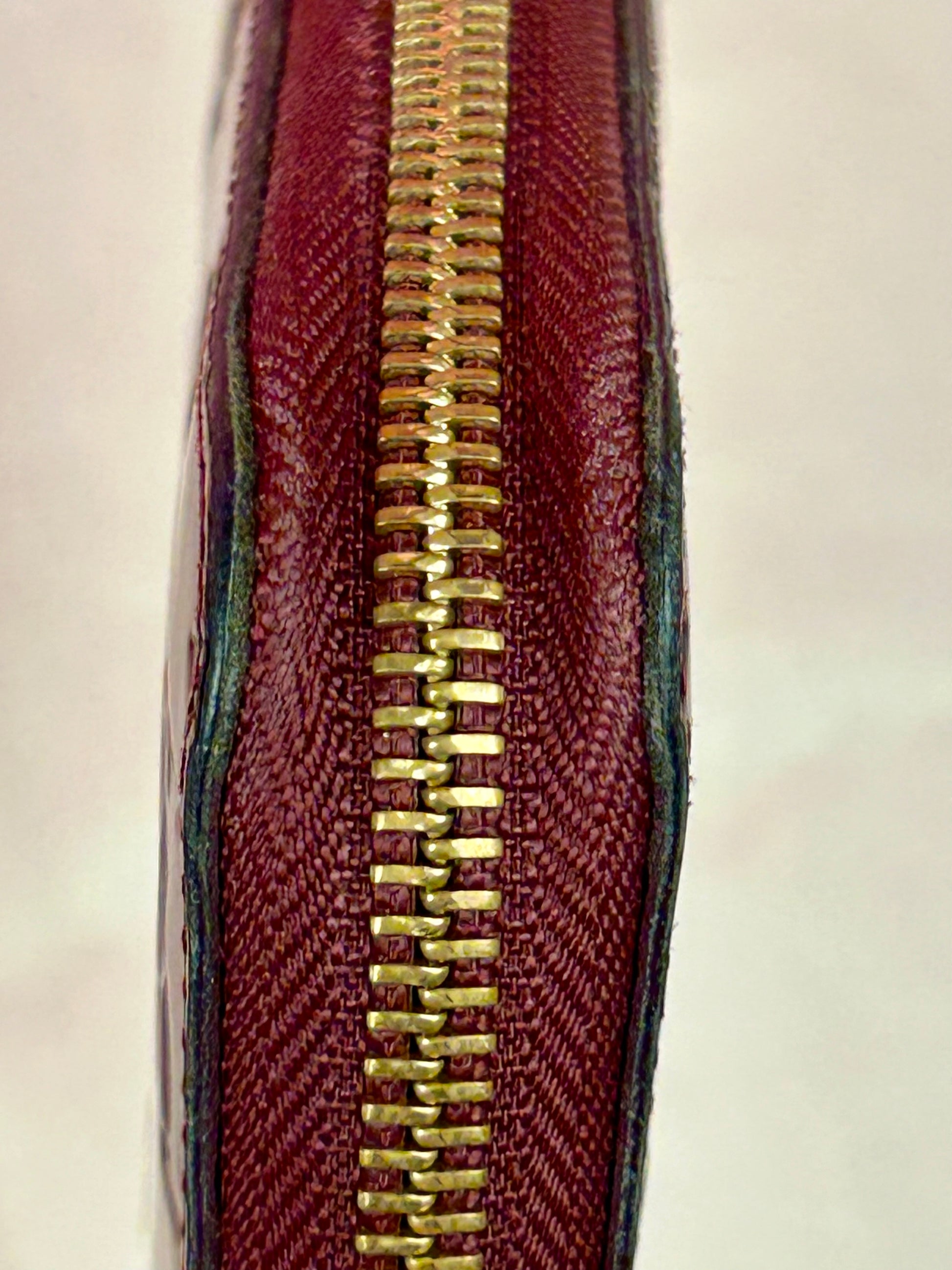 š Description: The purple/red colored Vernis leather is in beautiful condition, no staining. Some rubbings on the bottom corners. Glazing is intact. Interior is very clean, some peeling on bottom portion of the zippered pouch. Zipper and puller are gold and runs smoothly. Interior is clean with no stains or peeling. Inside has 3 compartments, 1 coin compartment, 1 cash slot, and 8 CC slots. A stylish and functional wallet, perfect for everyday use!